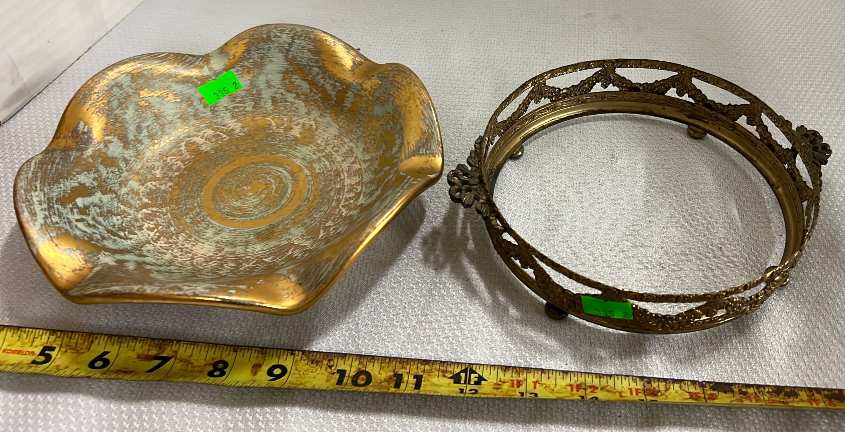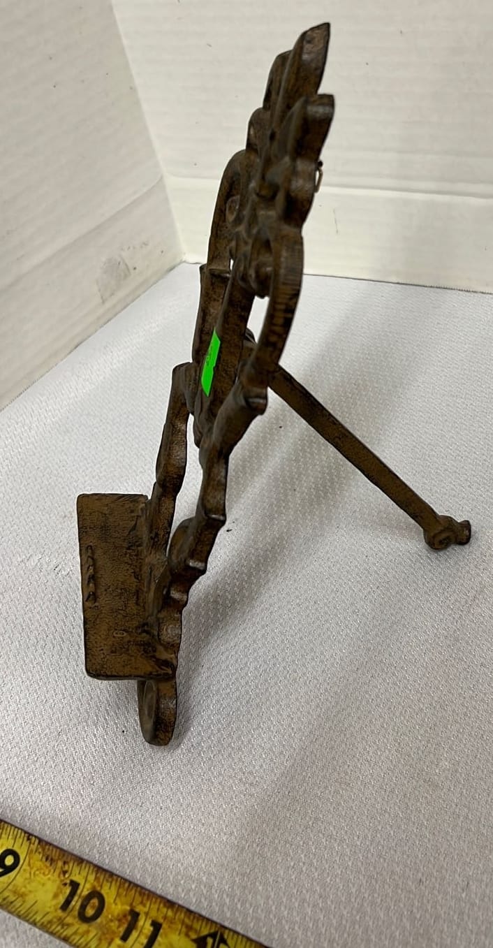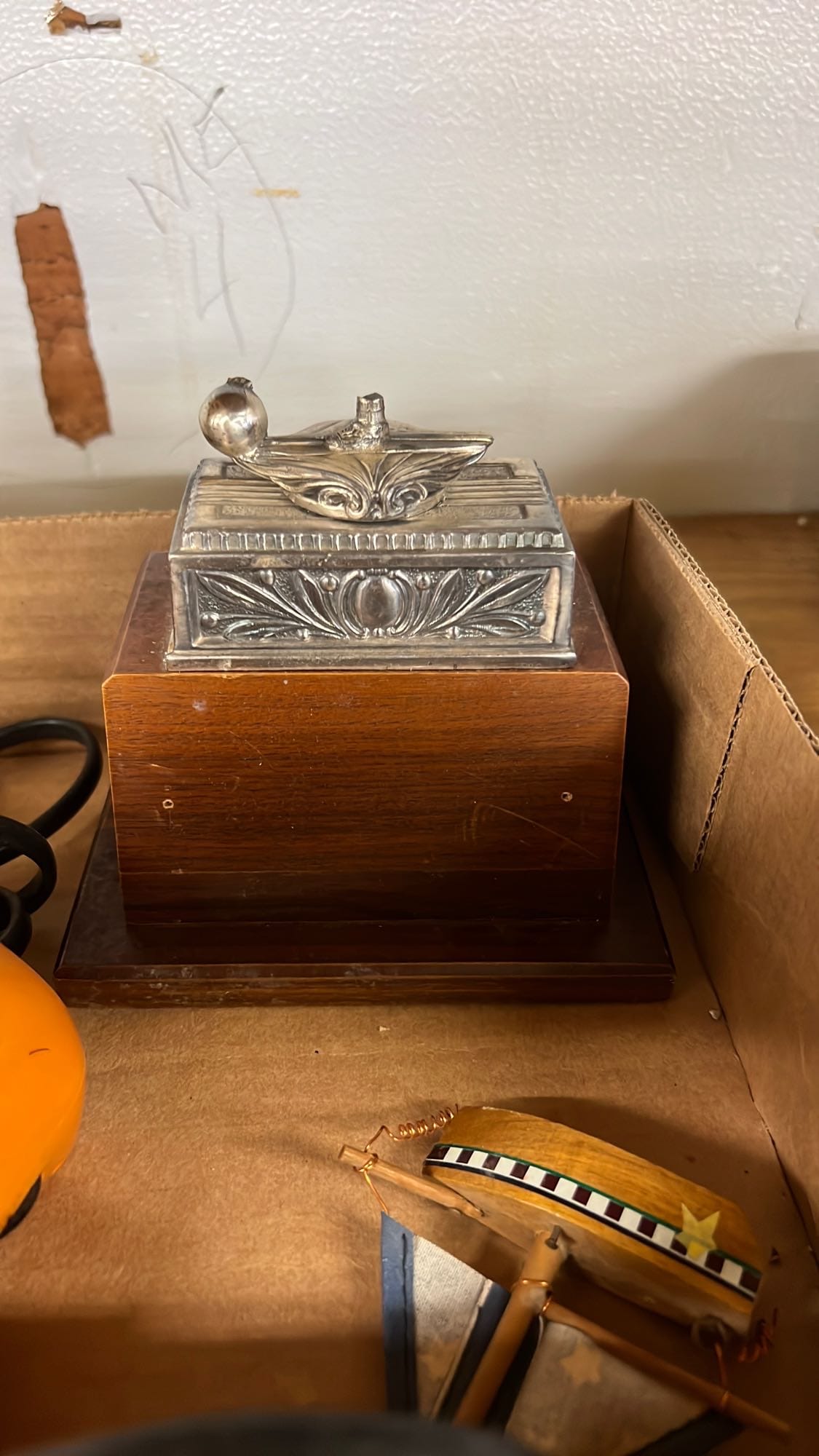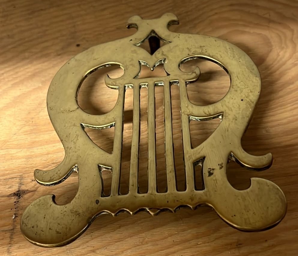 307 Vintage Pyrex dish warmer, Roman numeral, Vintage Brass Music Stand Ornate Lyre Harp, Nails, misc