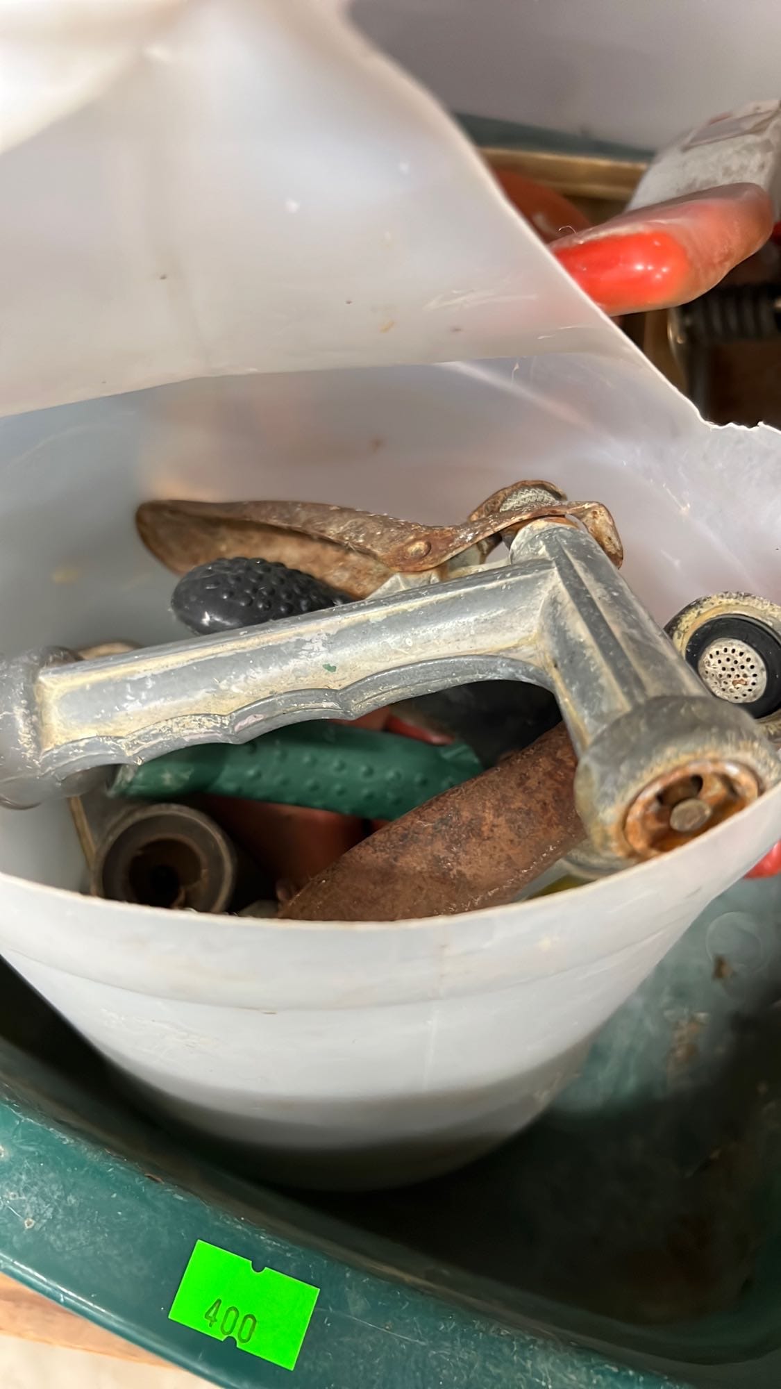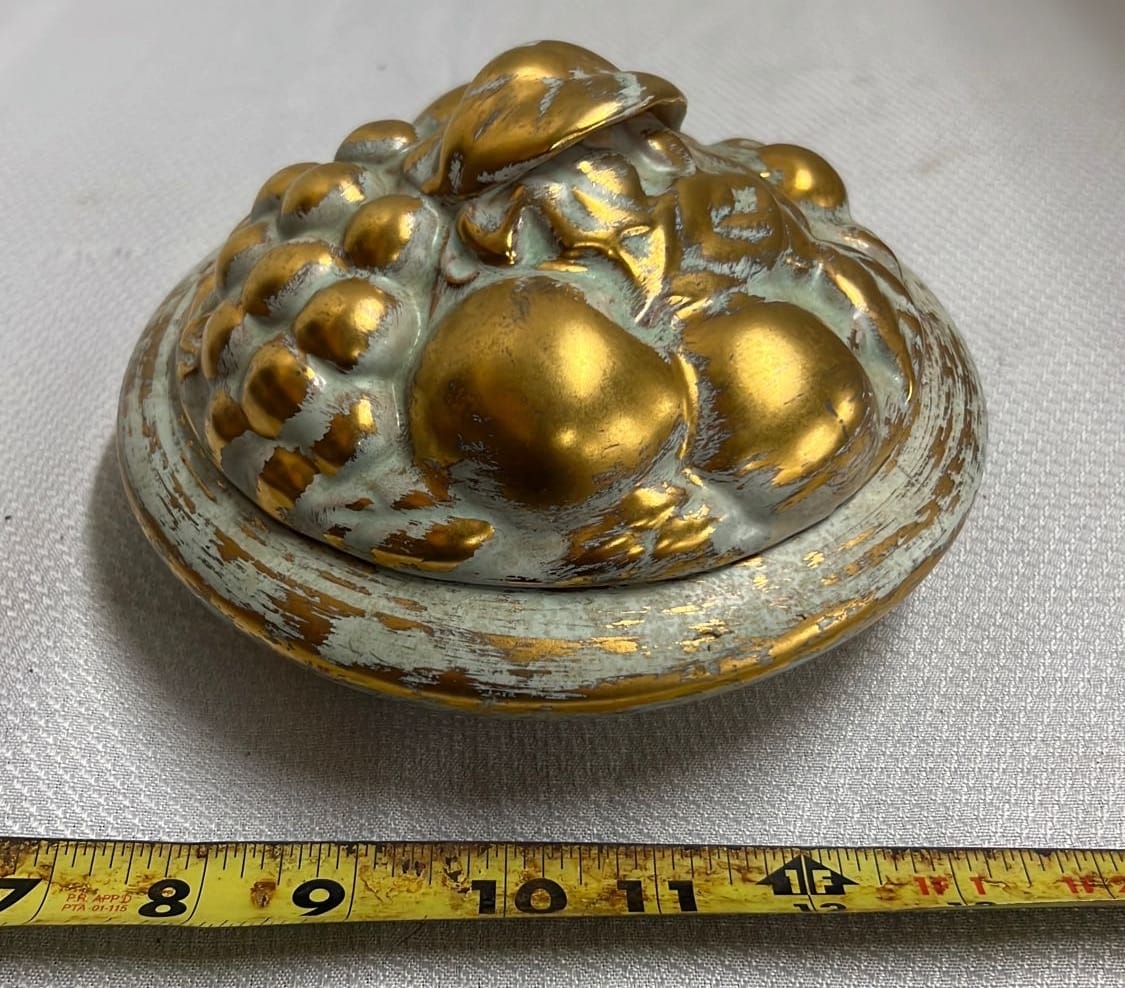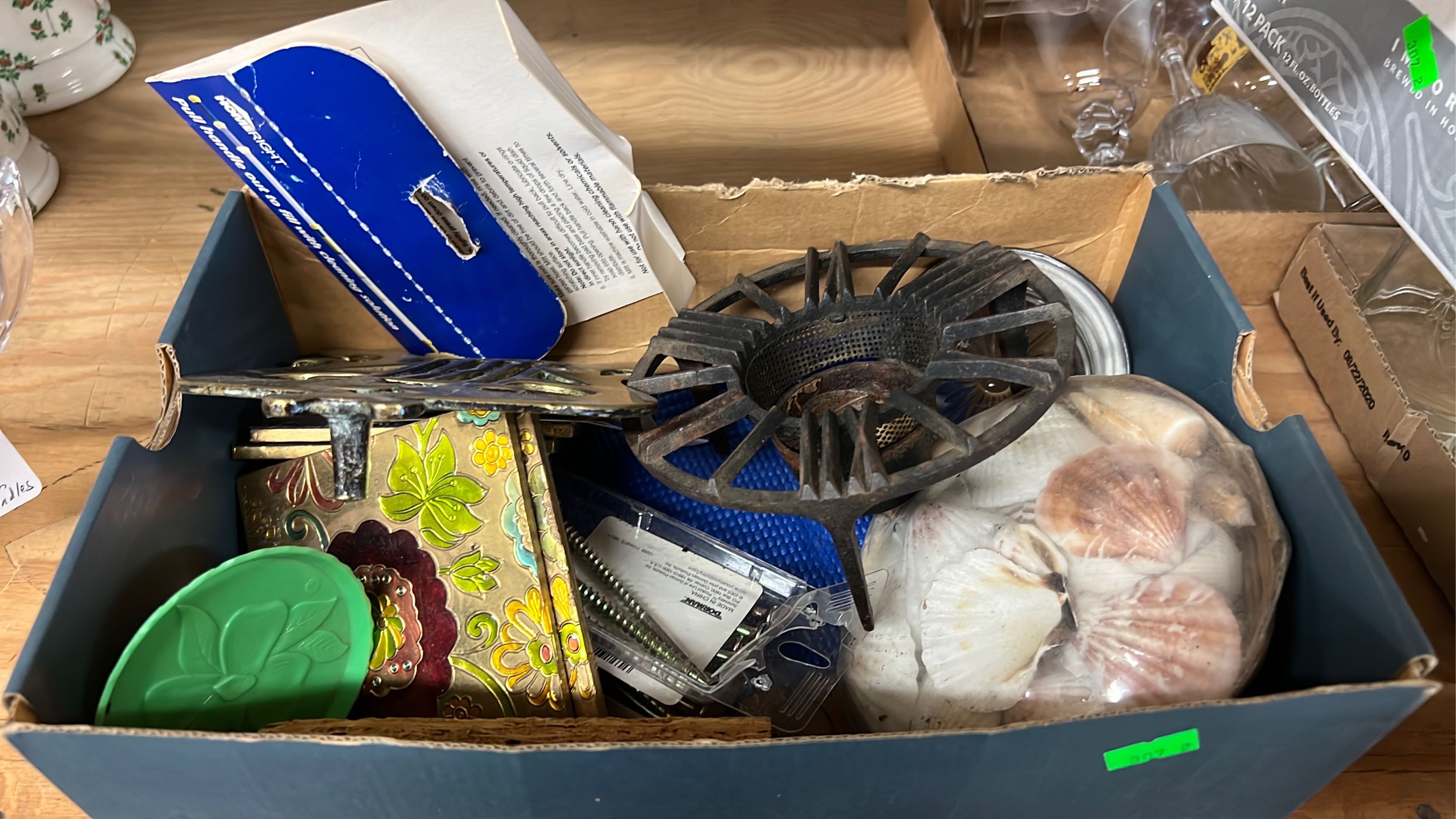 307 Vintage Pyrex dish warmer, Roman numeral, Vintage Brass Music Stand Ornate Lyre Harp, Nails, misc