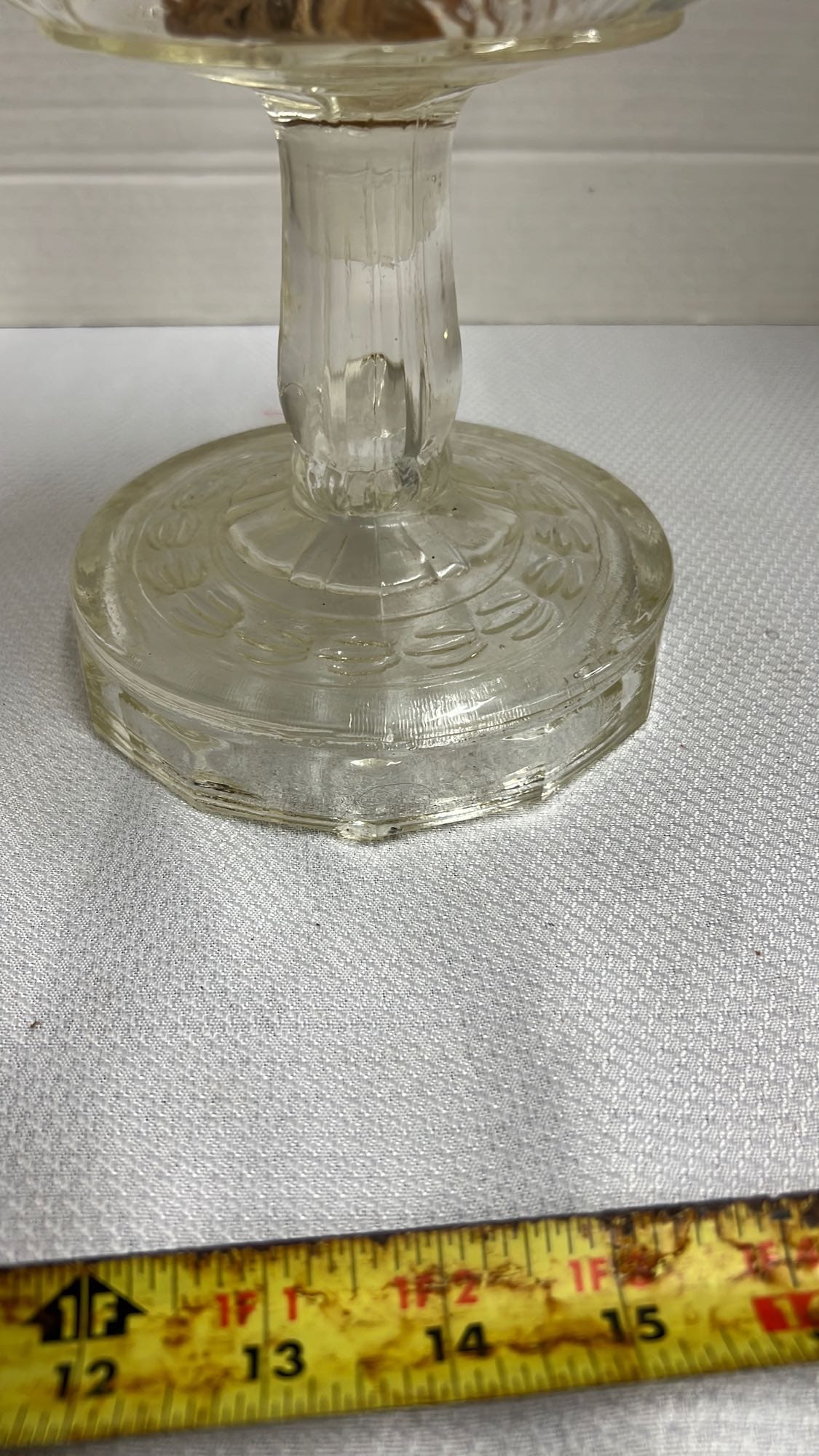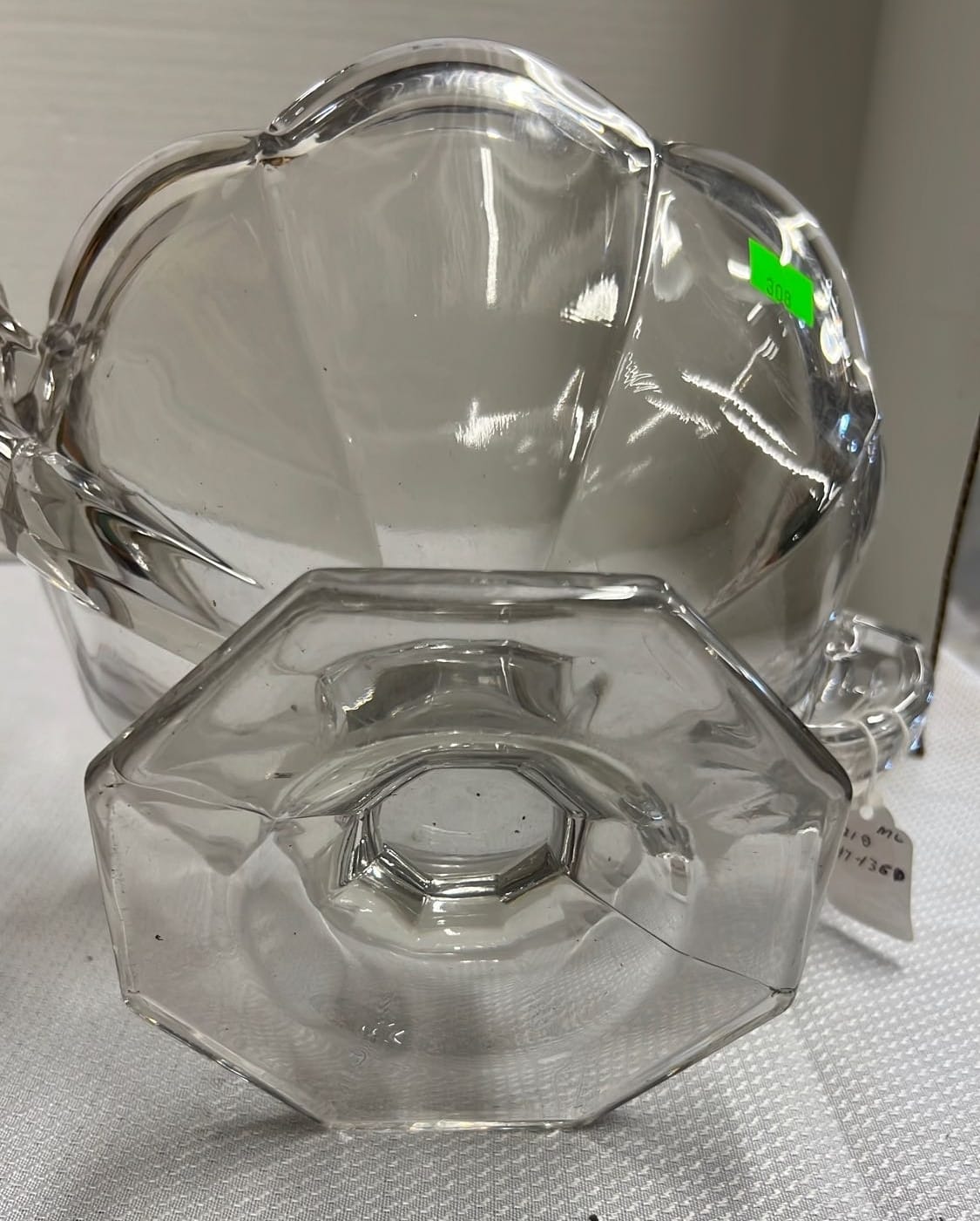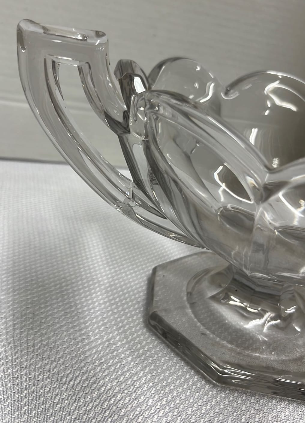 308 Glass Pedestal Dish w/ Handle , 12” x 8 1/2” x 6 1/2” tall