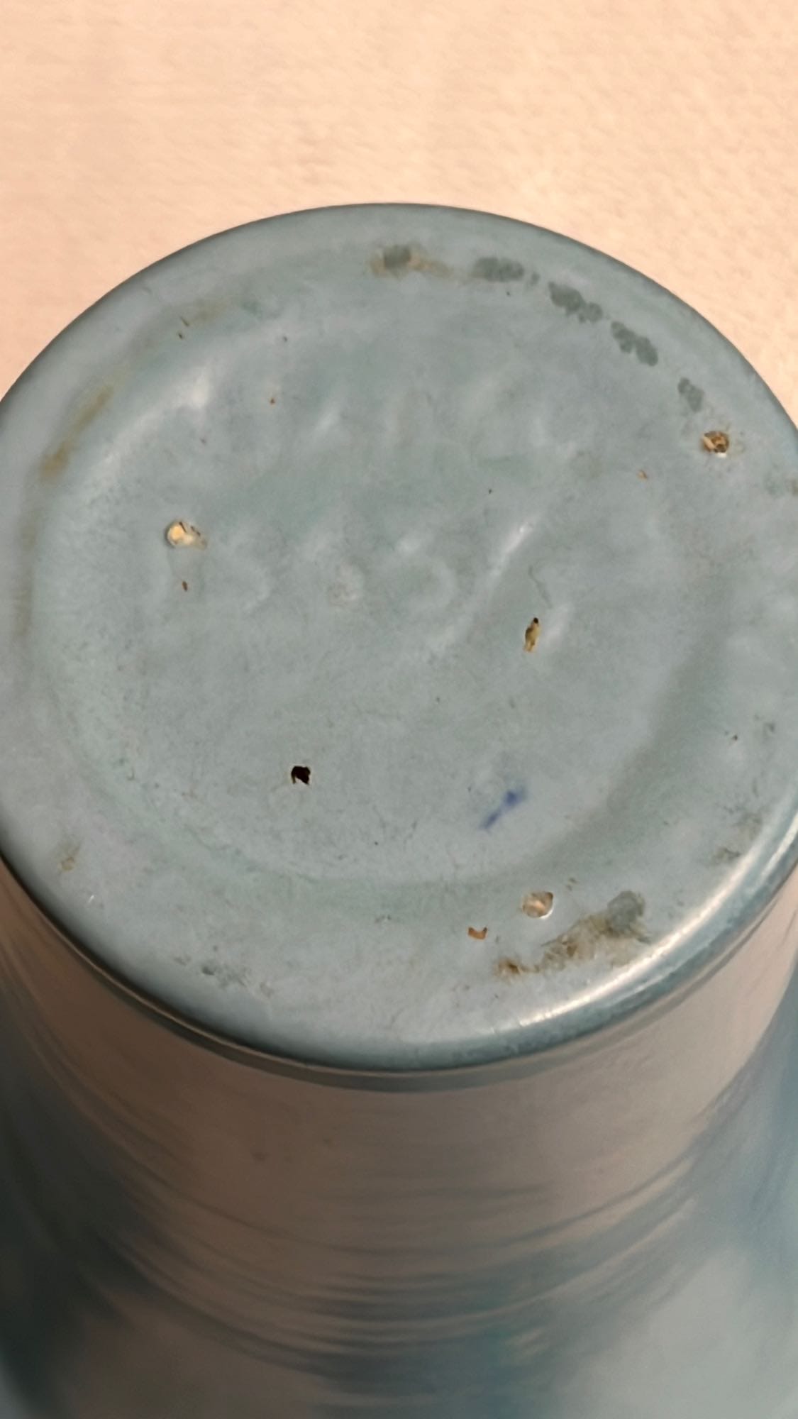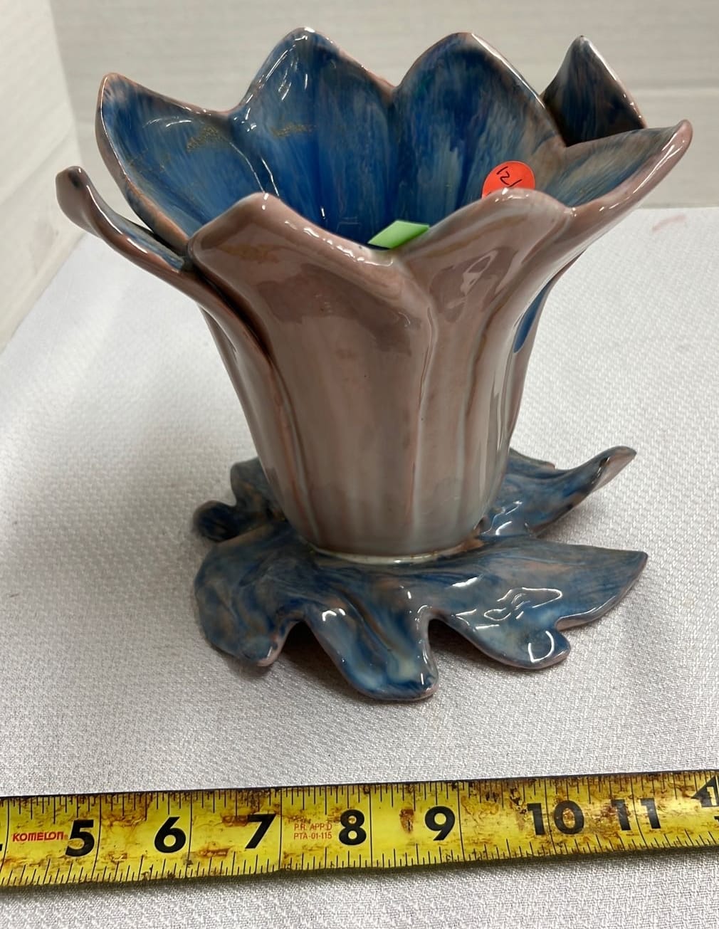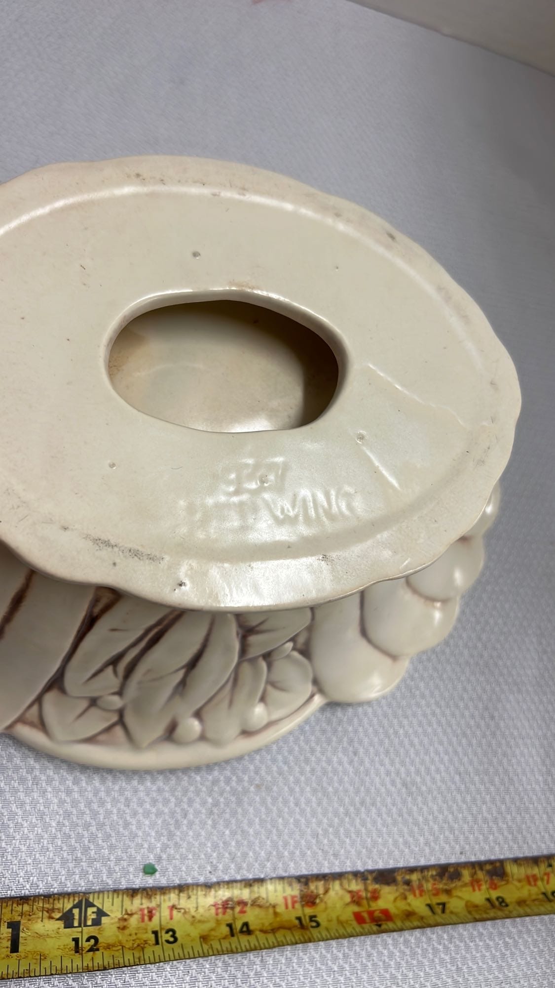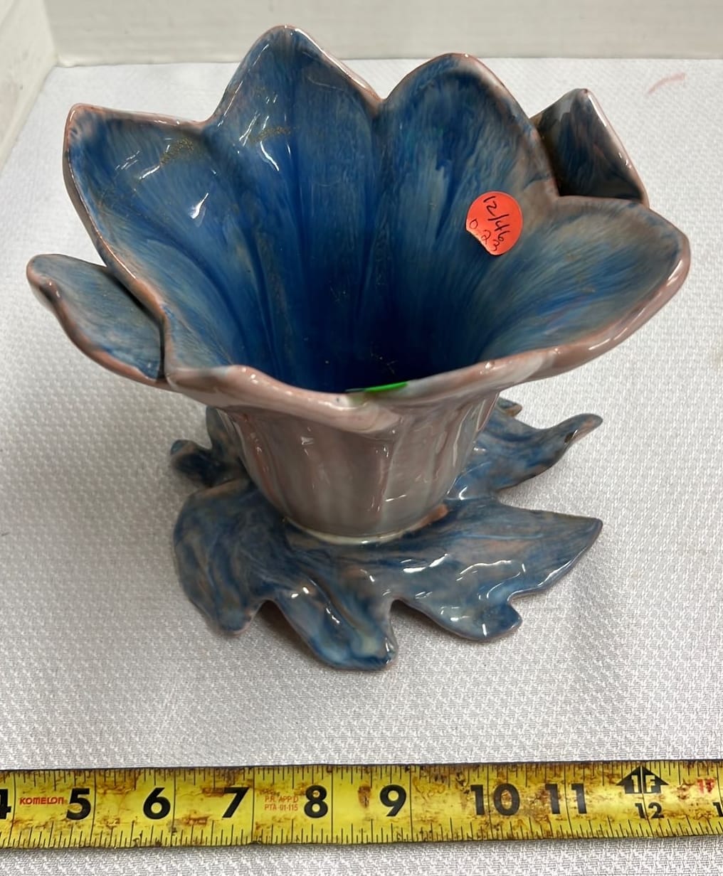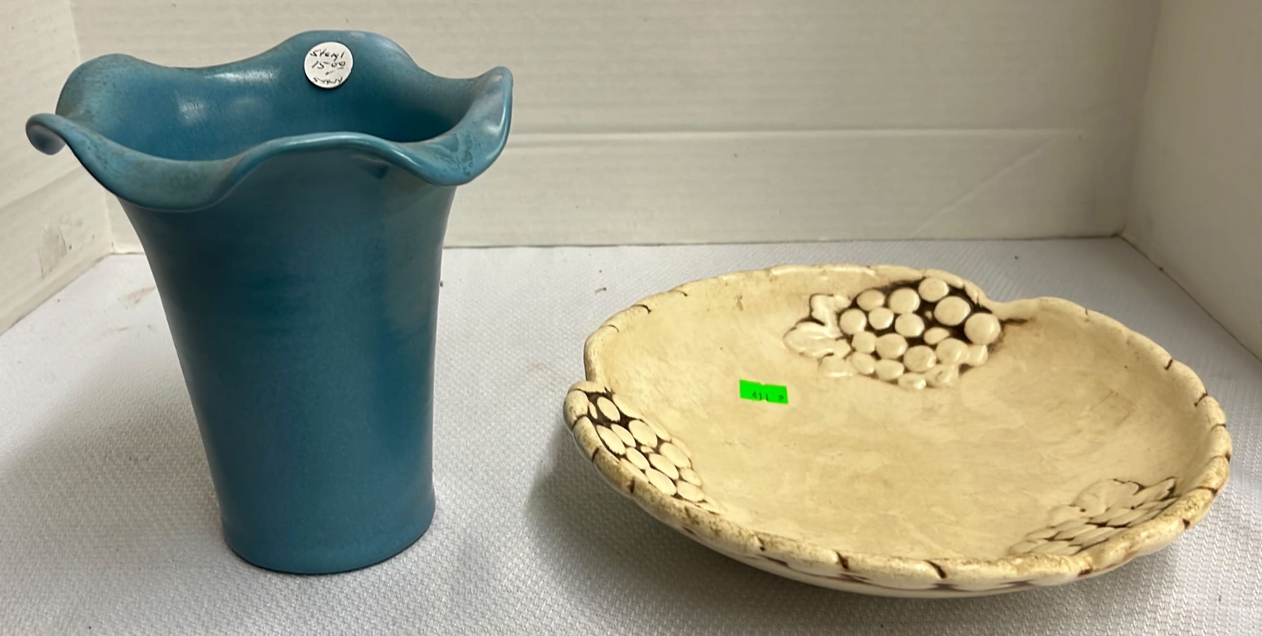 411 Stangl Ruffled Edged Blue Vase 6.25”, RedWing Pottery Pie Bowl with Grape Clusters 10”, has hair line crack