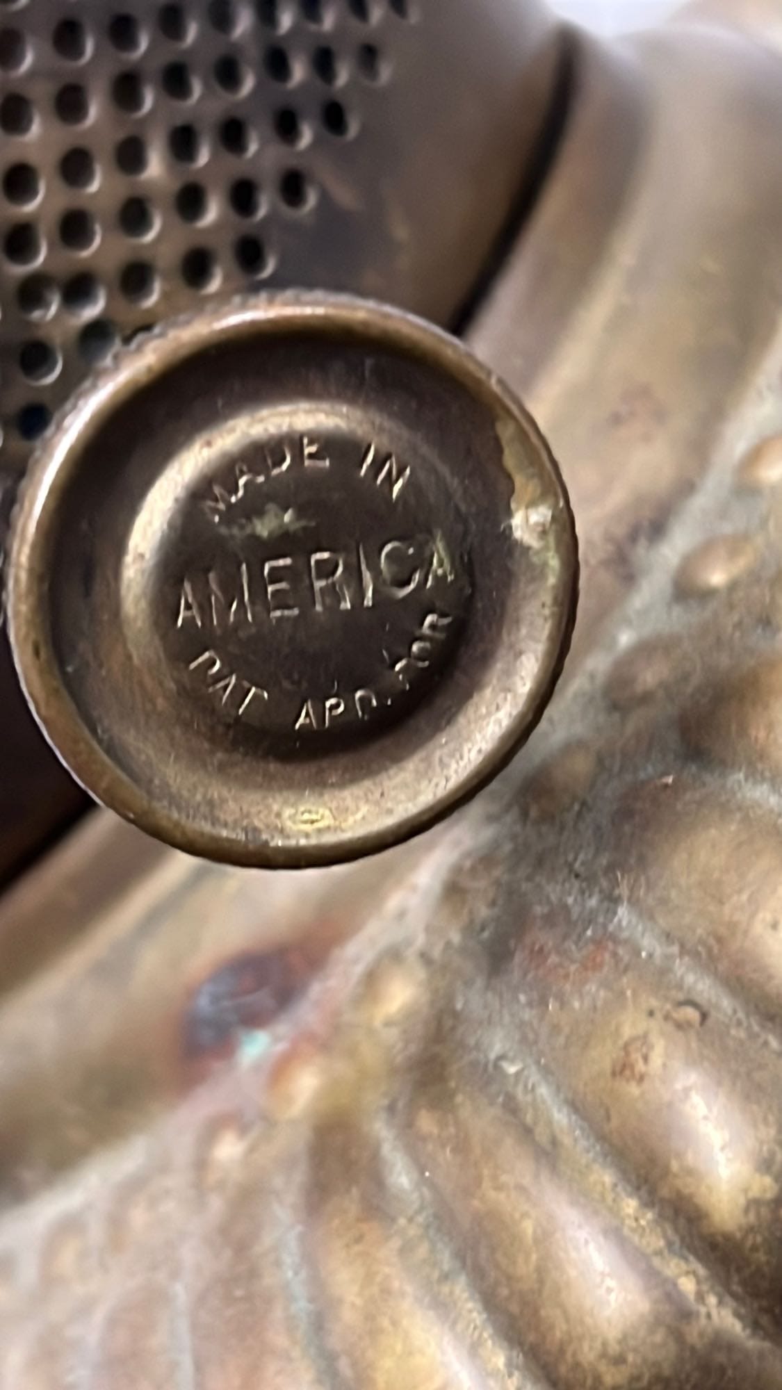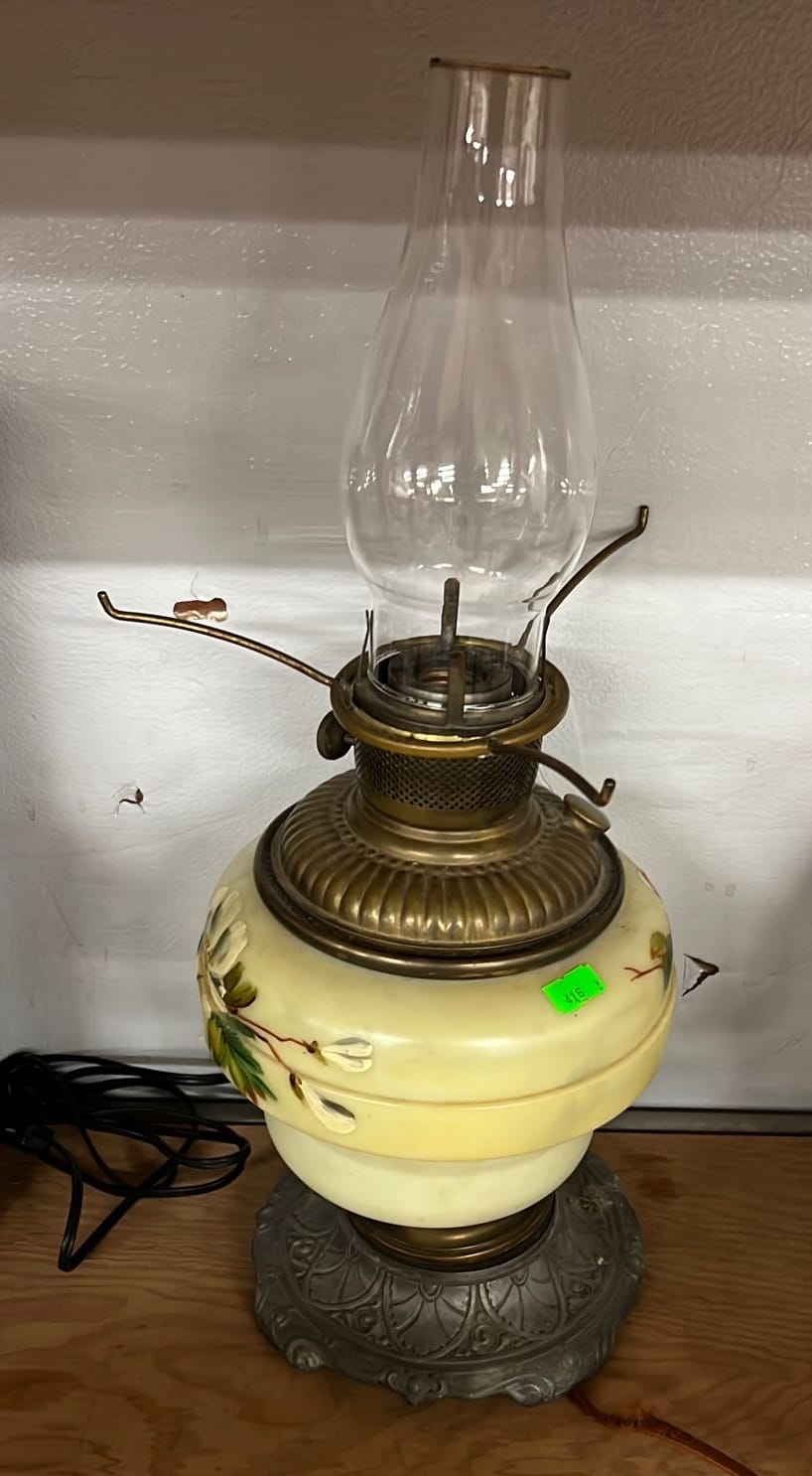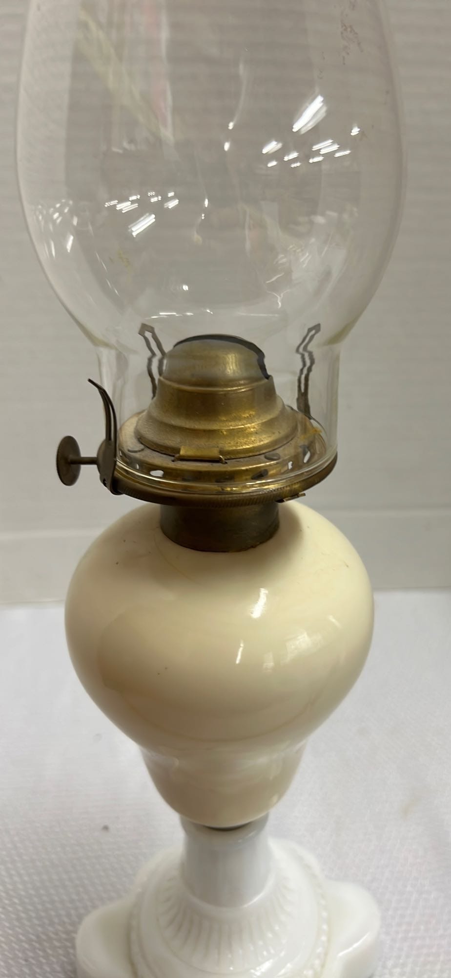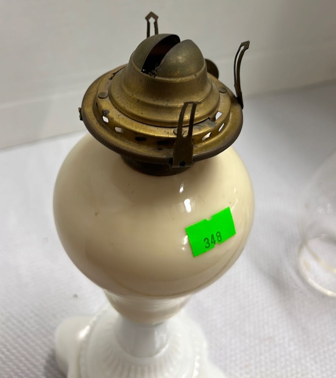 348 Vintage Oil Lamp w/ Chimney 17”, one chimney prong is broke off