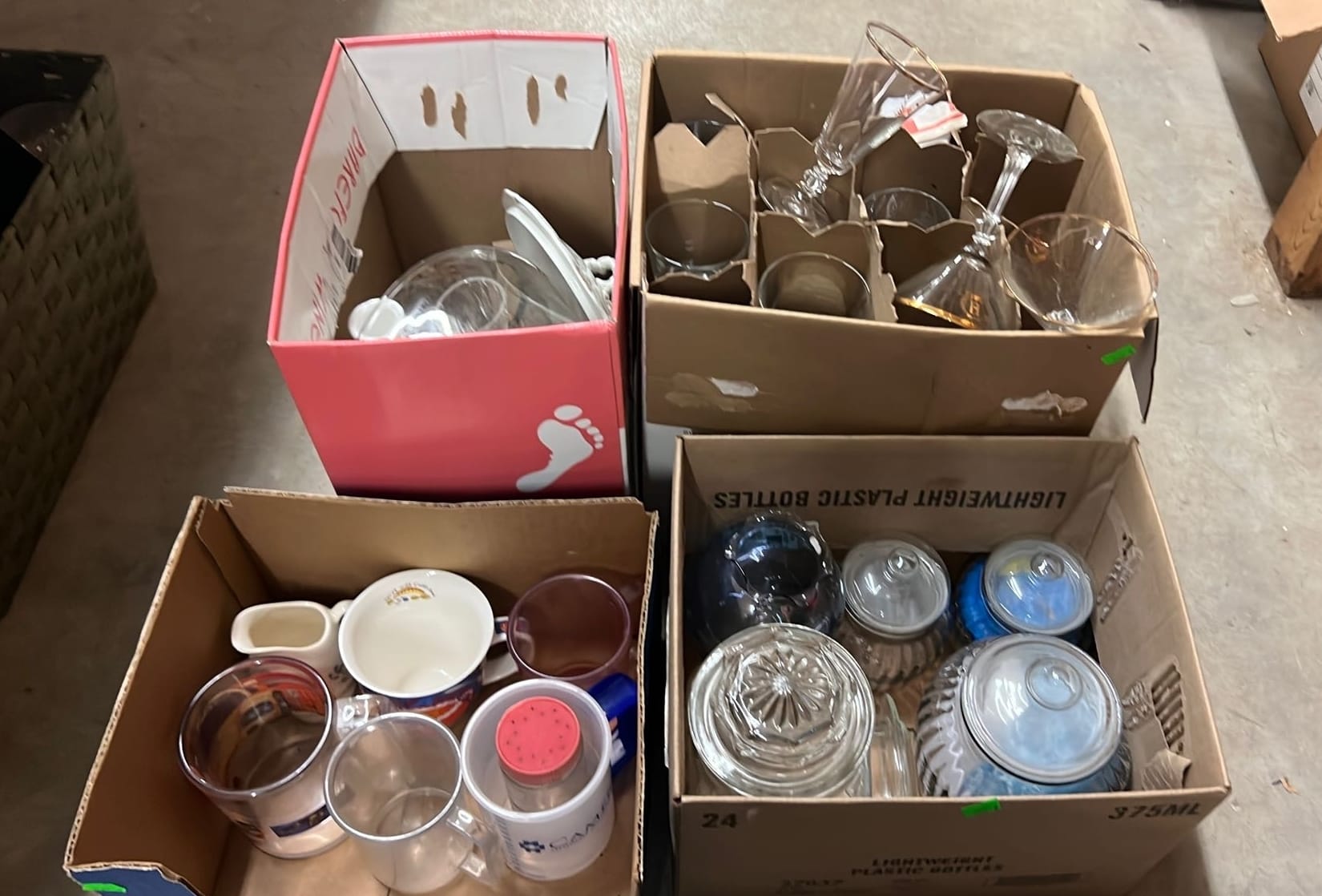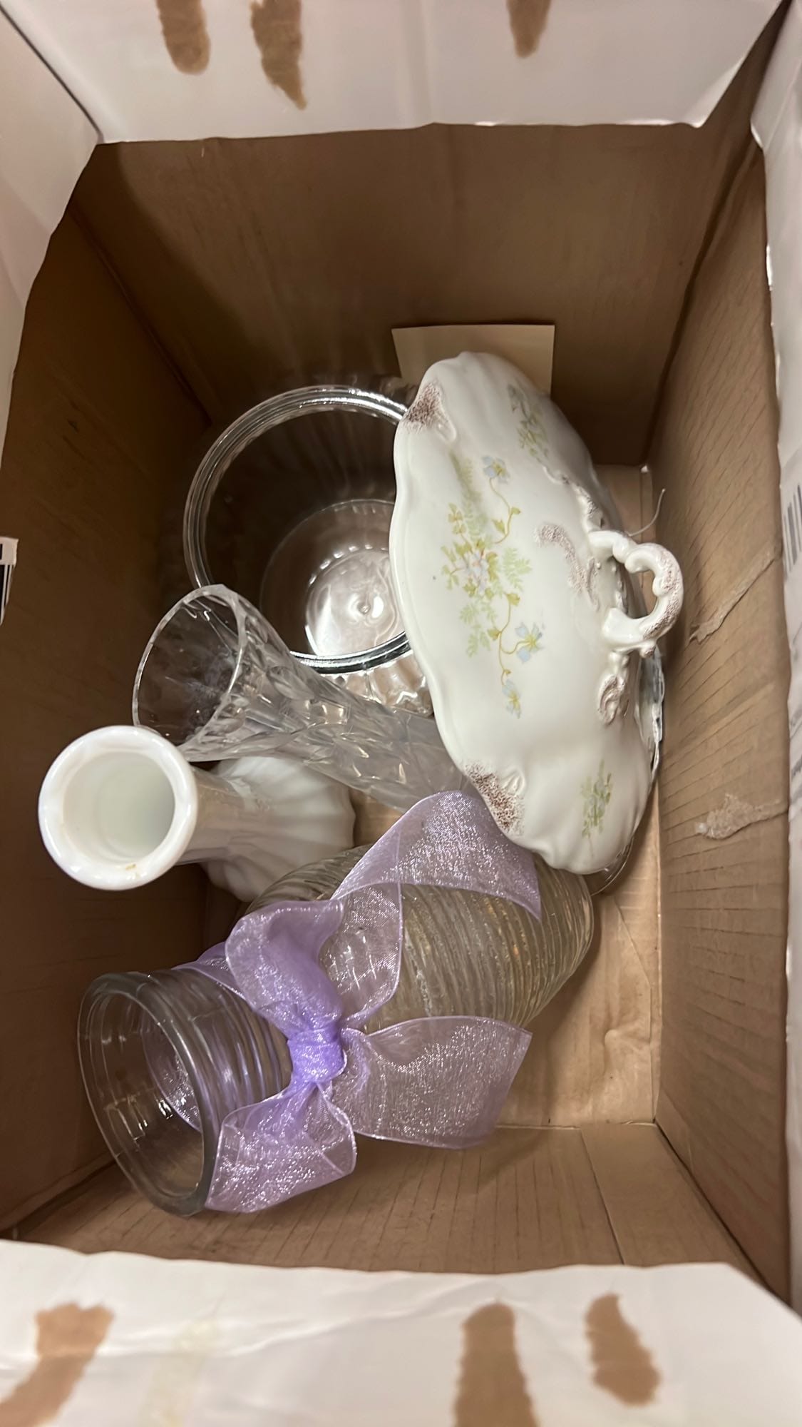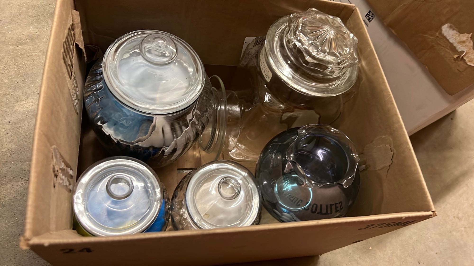 407 Glass ware assortment, Covered Candy Dish assortment, Blue Etched Rose Bowl, Plastic Camel Mug, Bowl, Vase assortment, misc