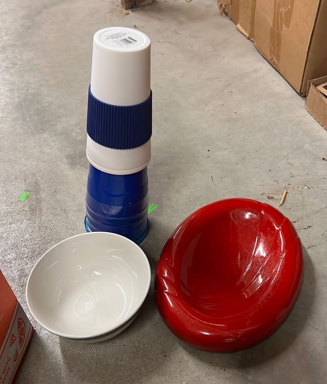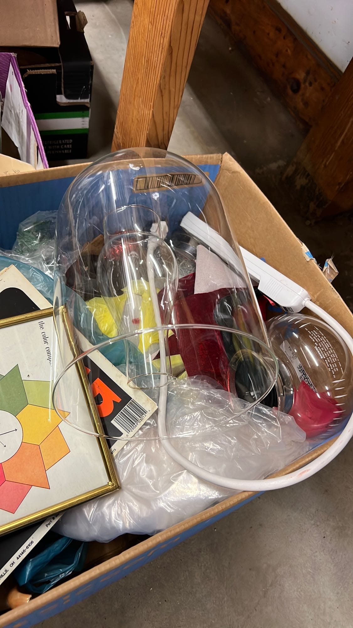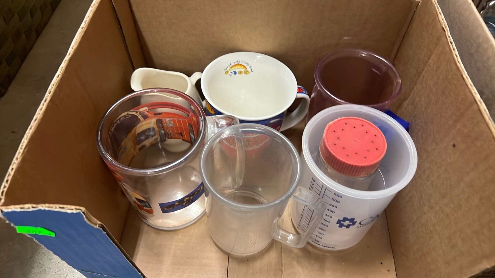 407 Glass ware assortment, Covered Candy Dish assortment, Blue Etched Rose Bowl, Plastic Camel Mug, Bowl, Vase assortment, misc