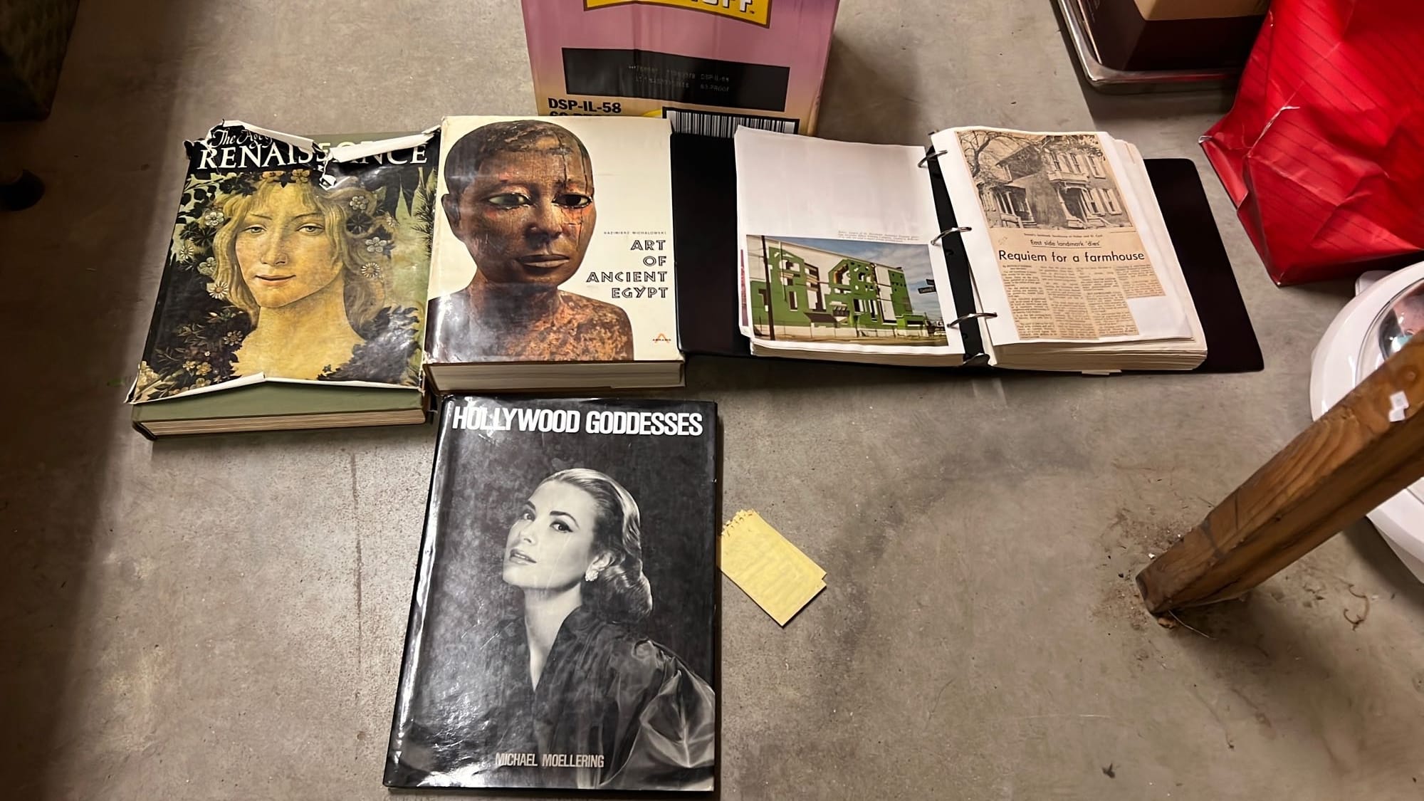 406 Metal chaffer 11.5”, Vases, Binder, Hollywood Goddesses, Art of ancient Egypt book and more
