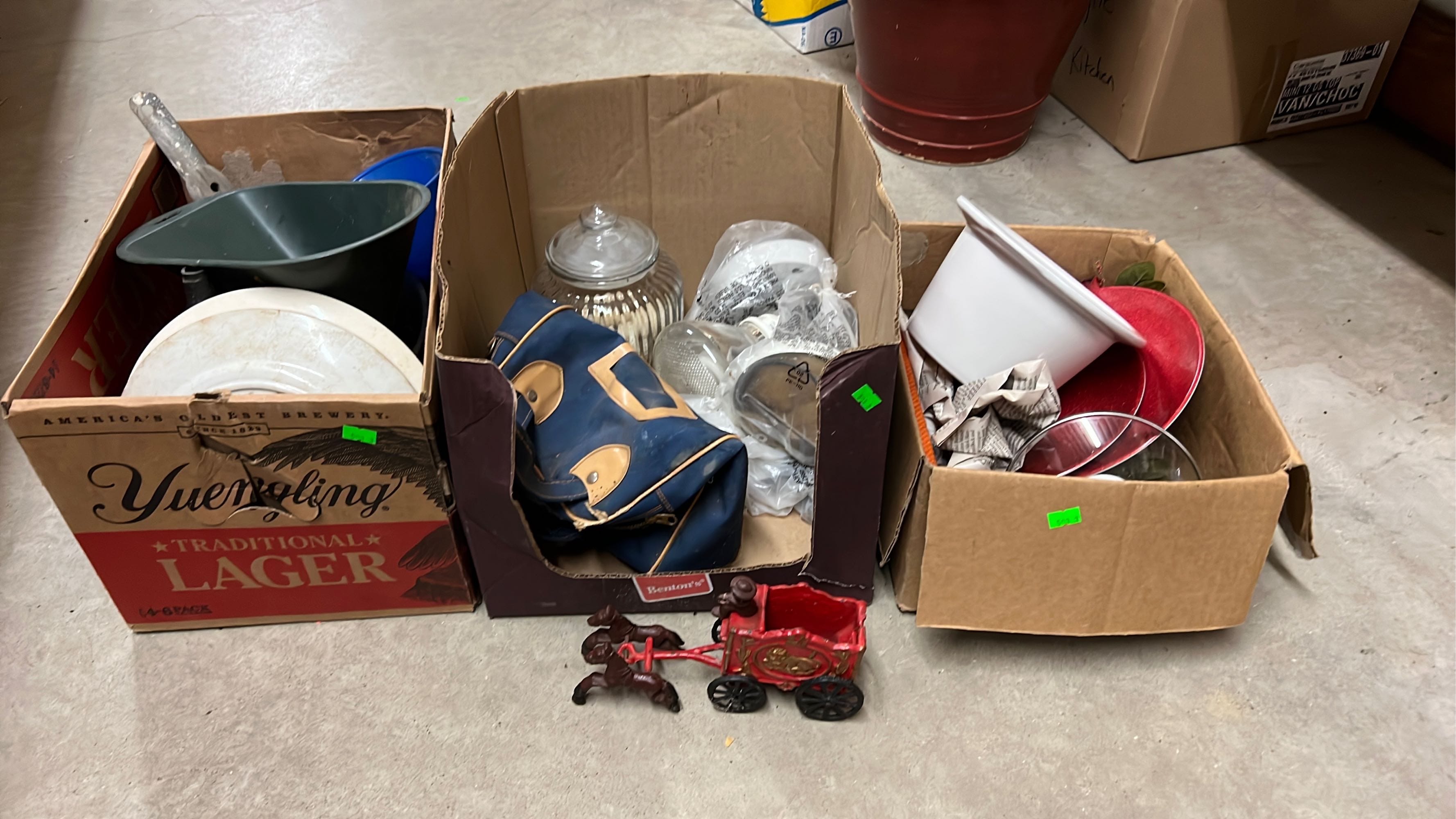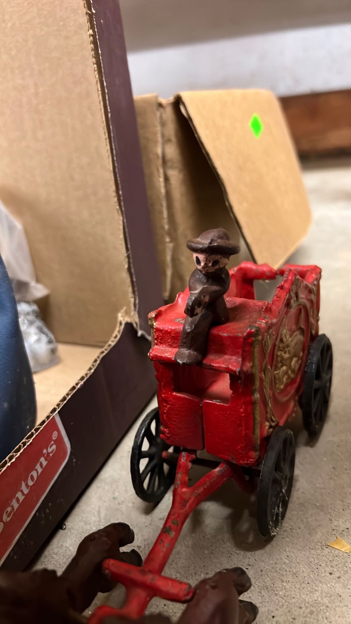 503 Cast iron wagon and horse team, with driver, 9 inch long by 5 inch tall, plates, light fixtures, funnels, miscellaneous