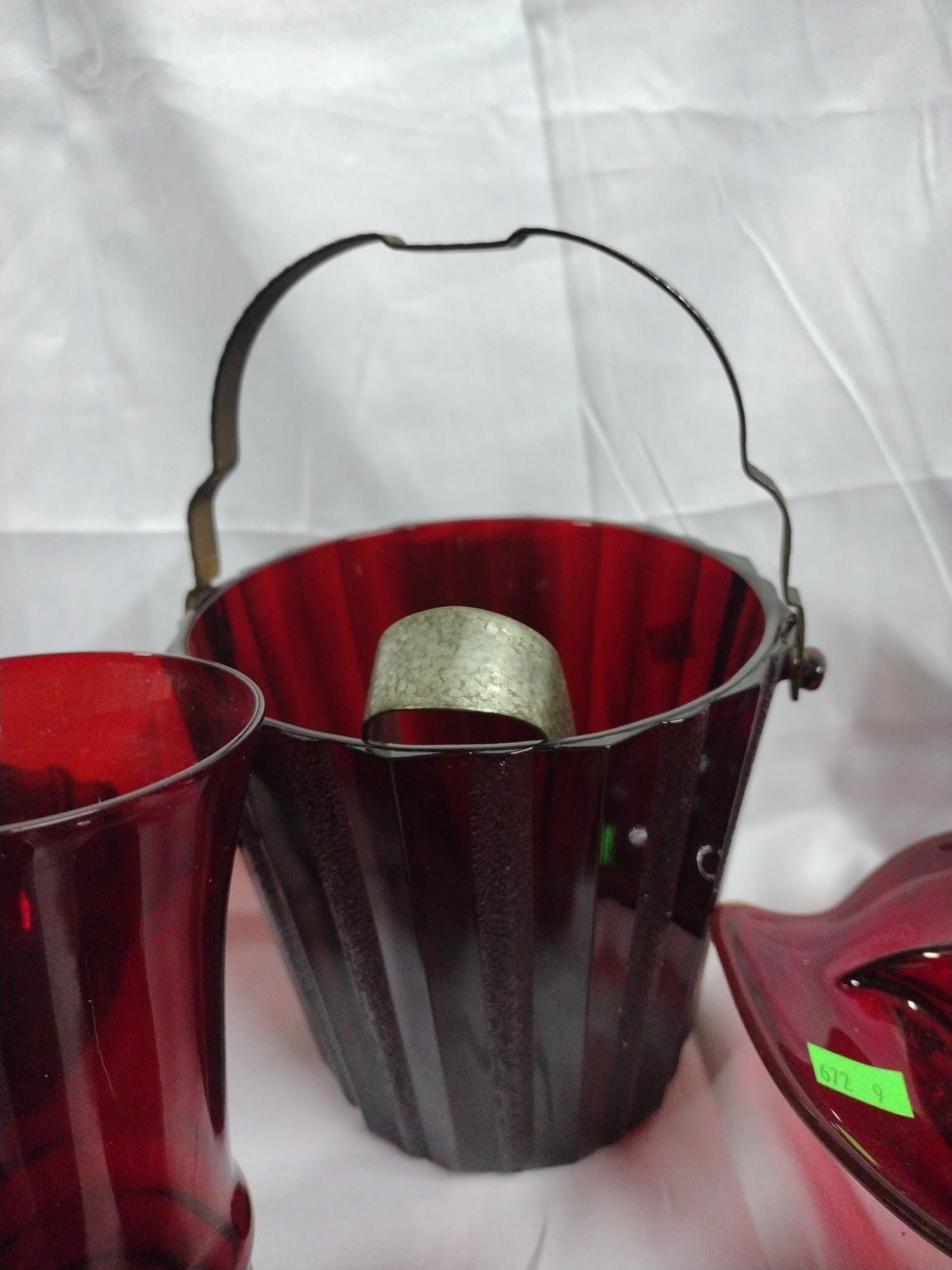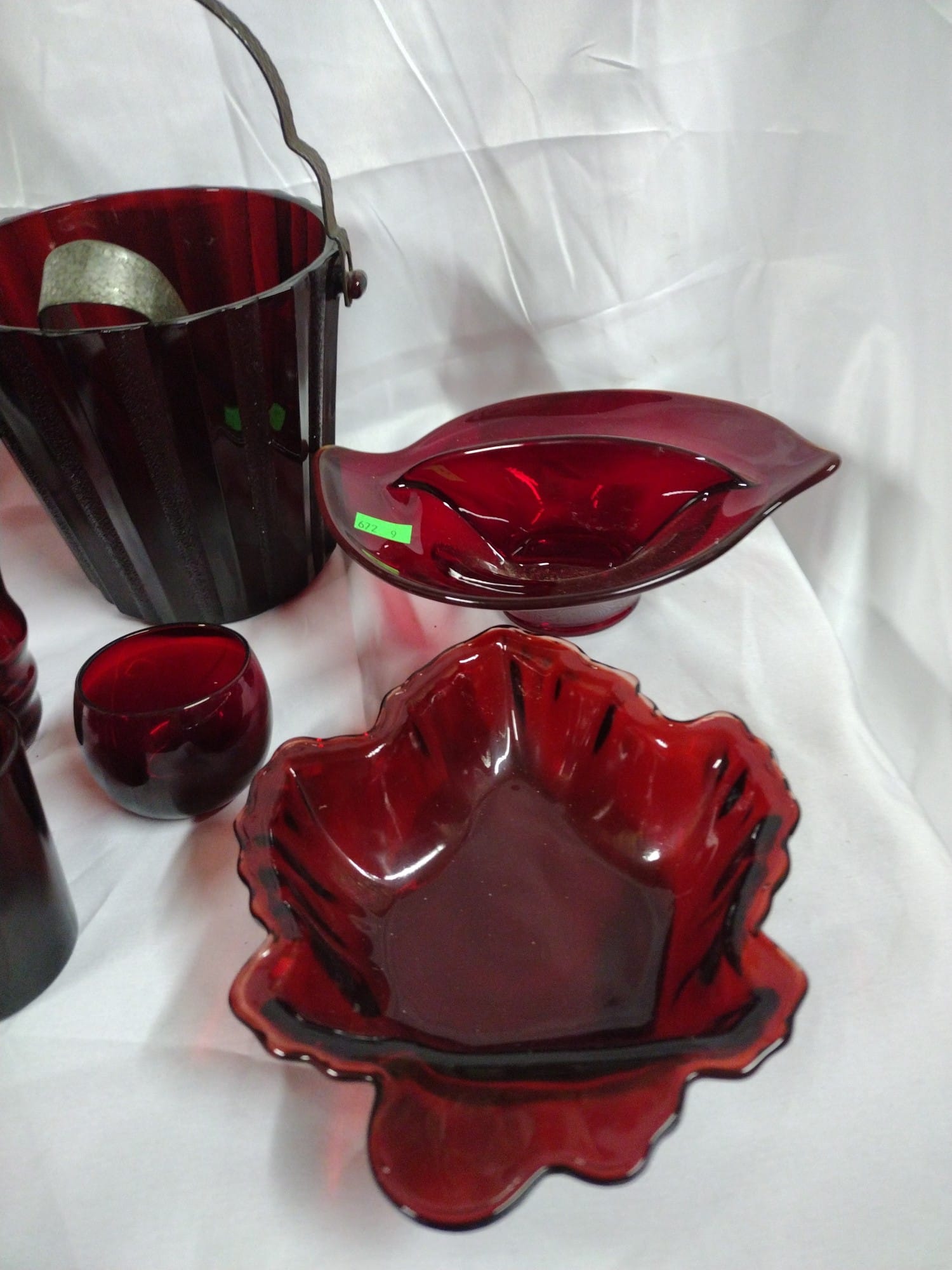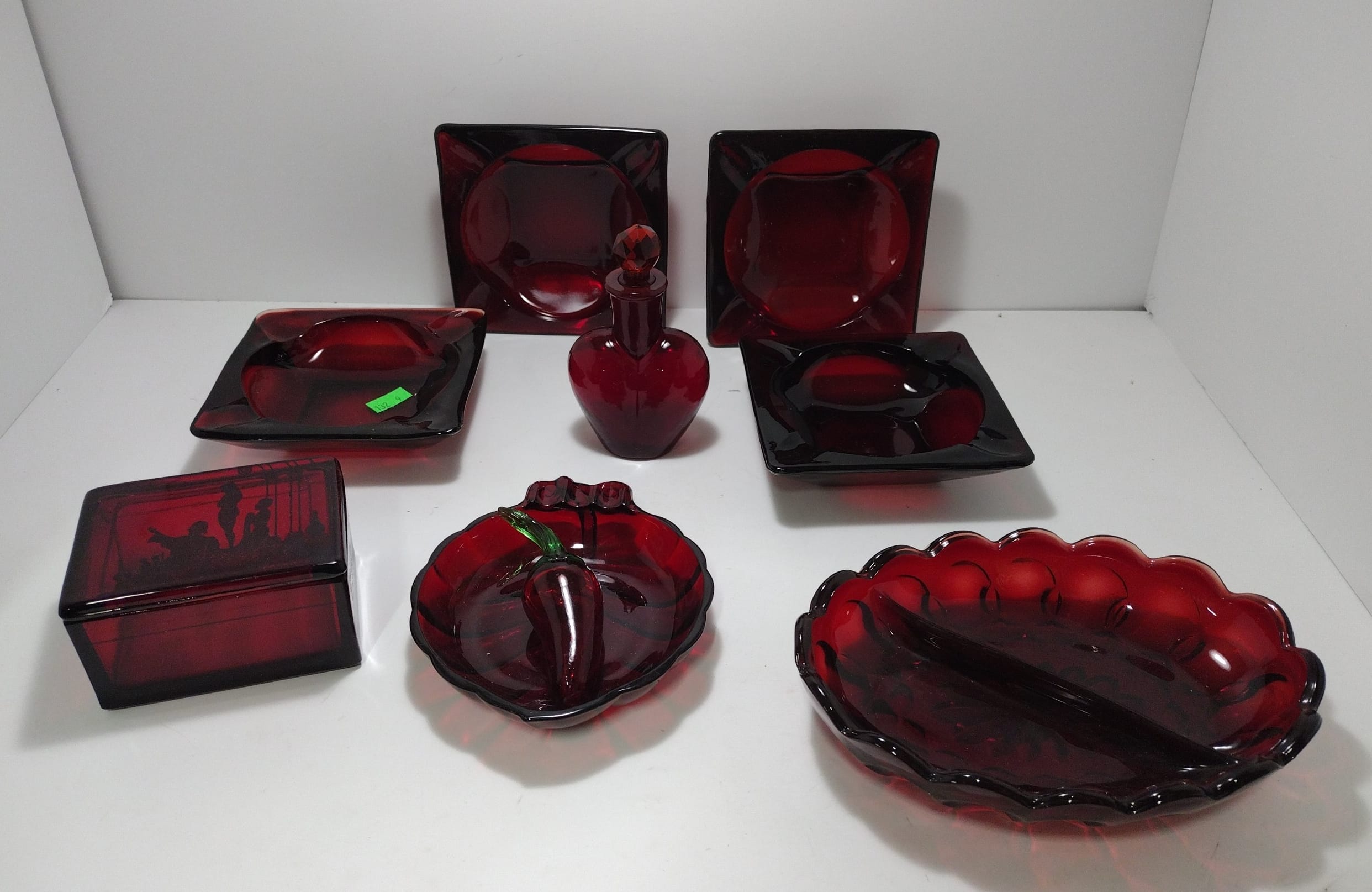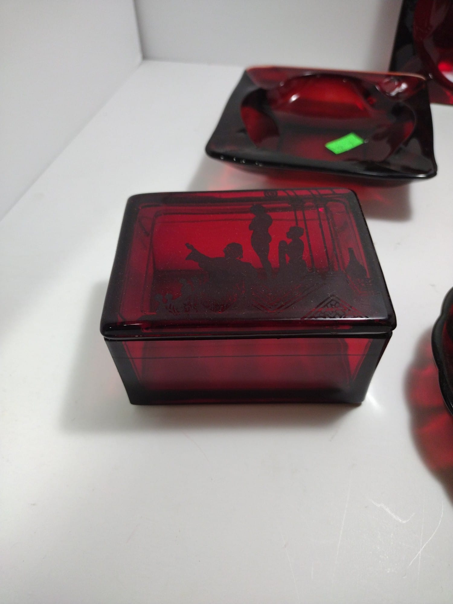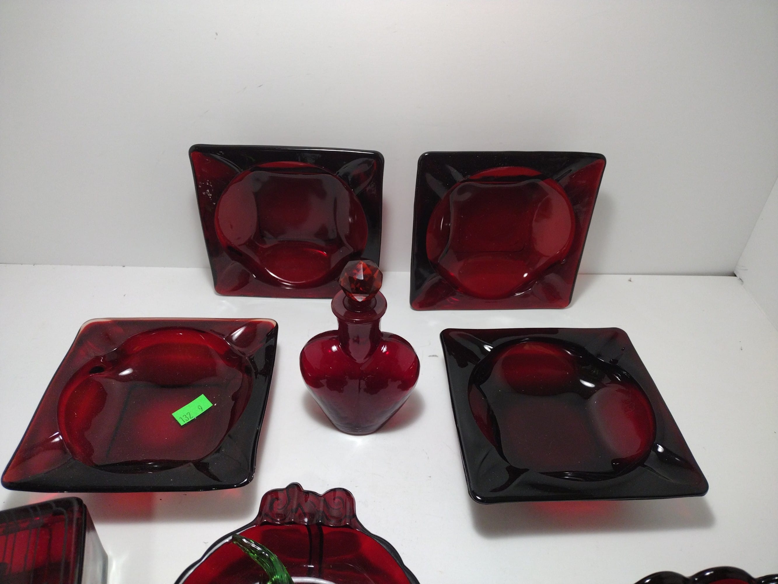 132 Ruby glass assortment-ash trays, trinket box, etc