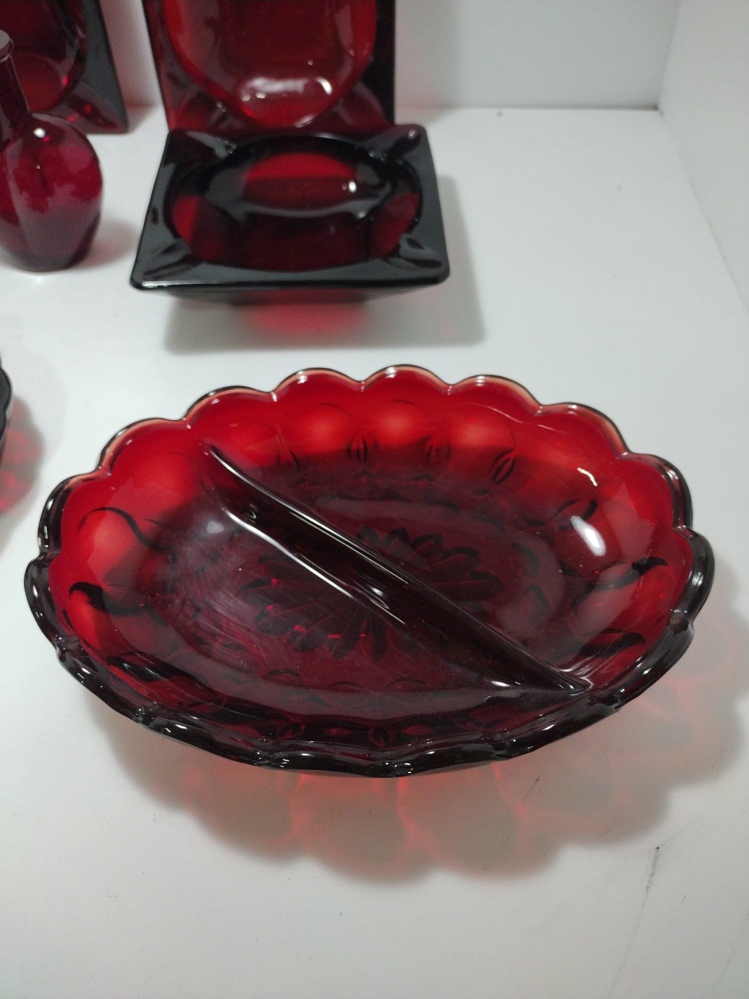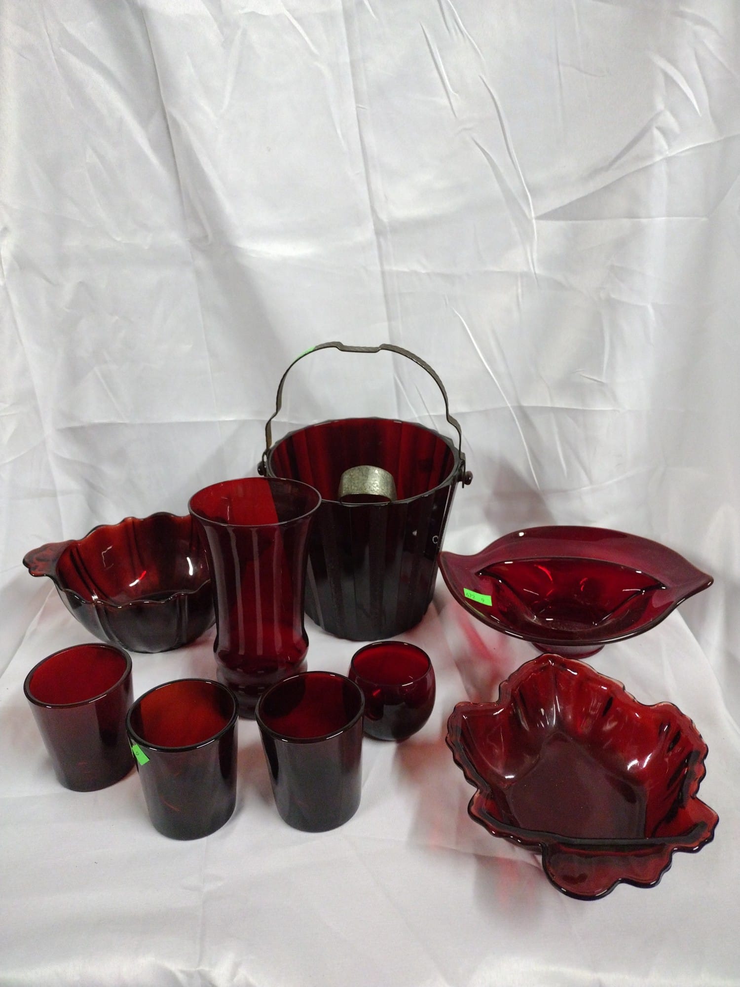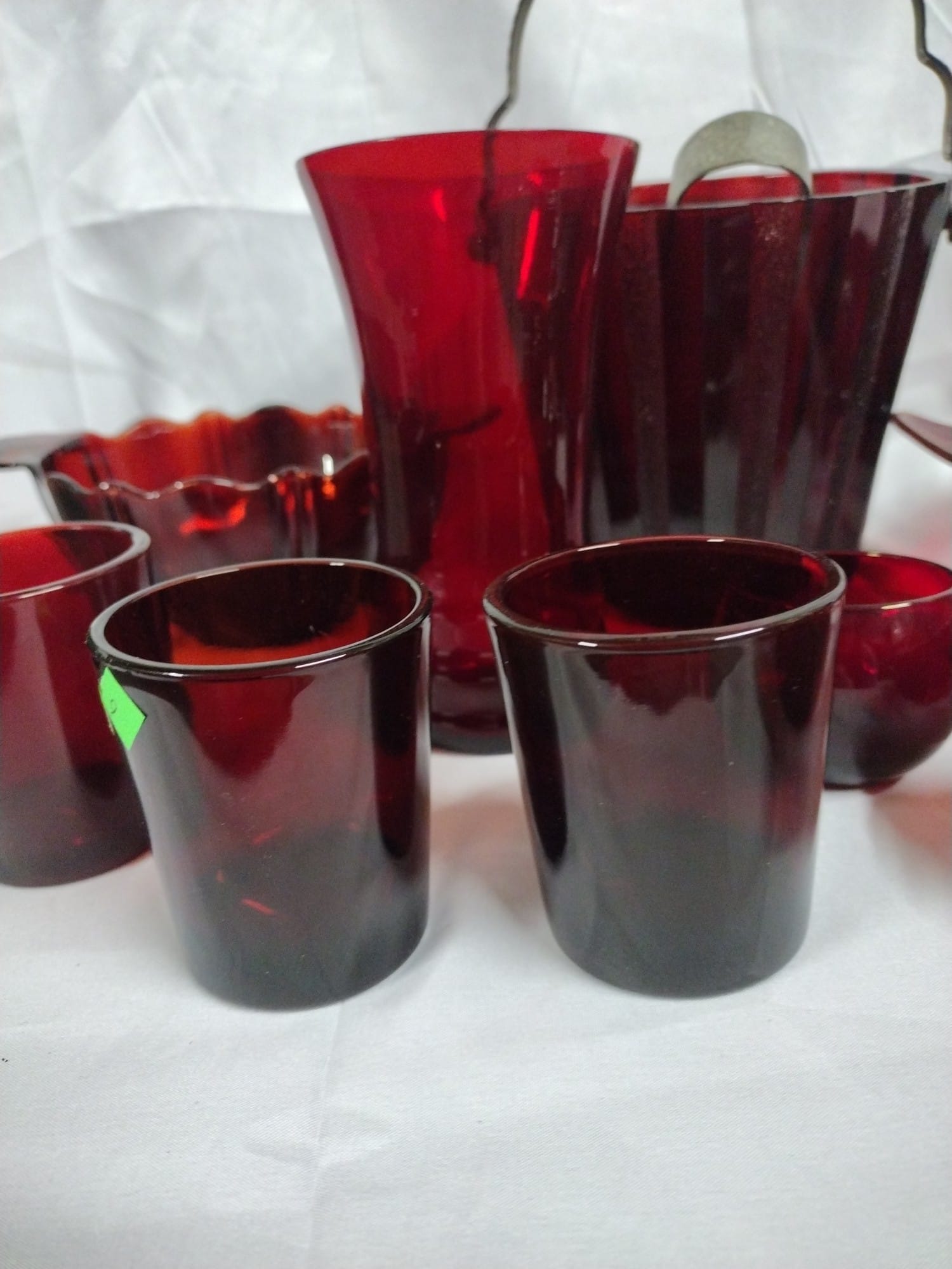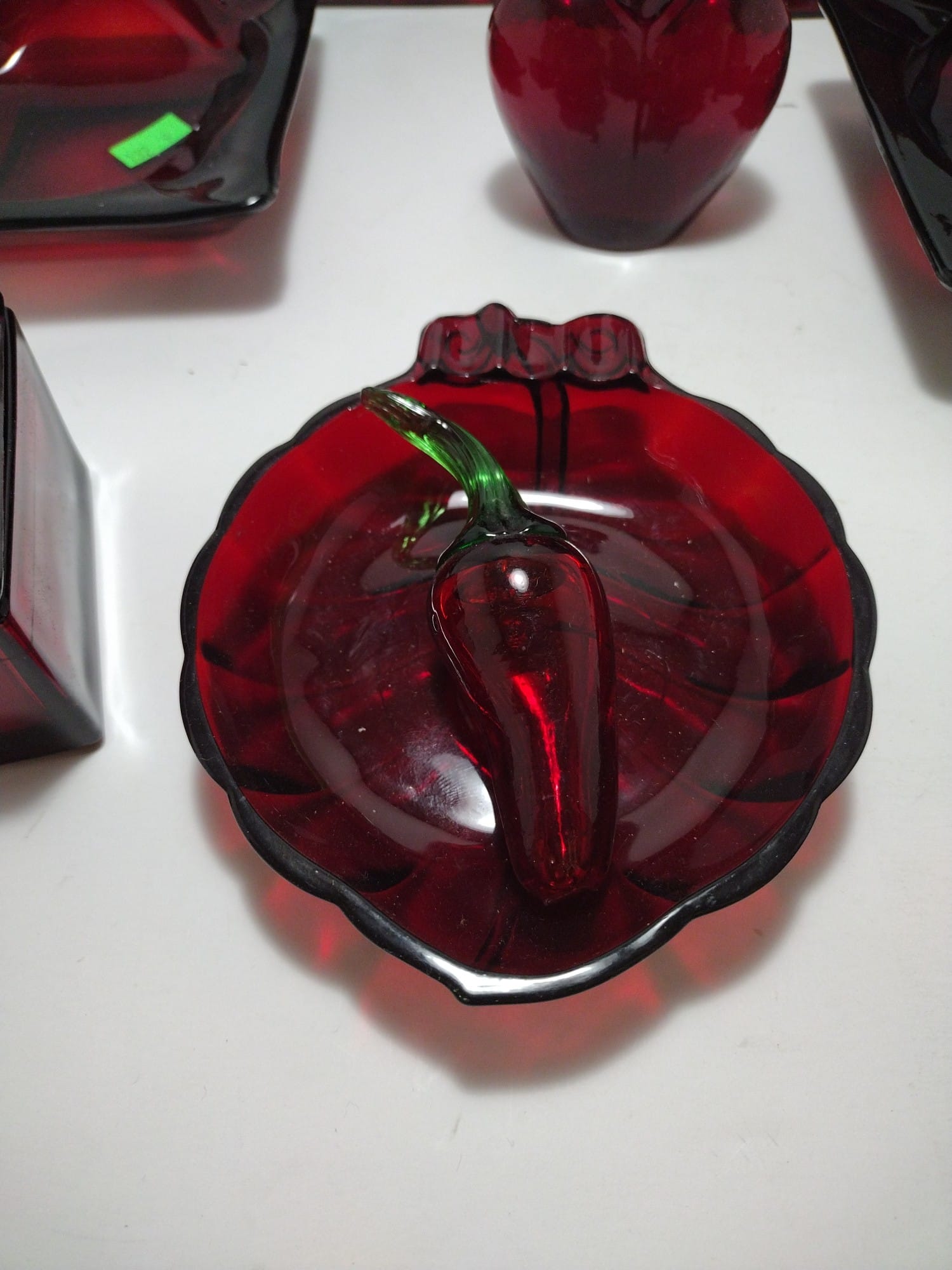132 Ruby glass assortment-ash trays, trinket box, etc