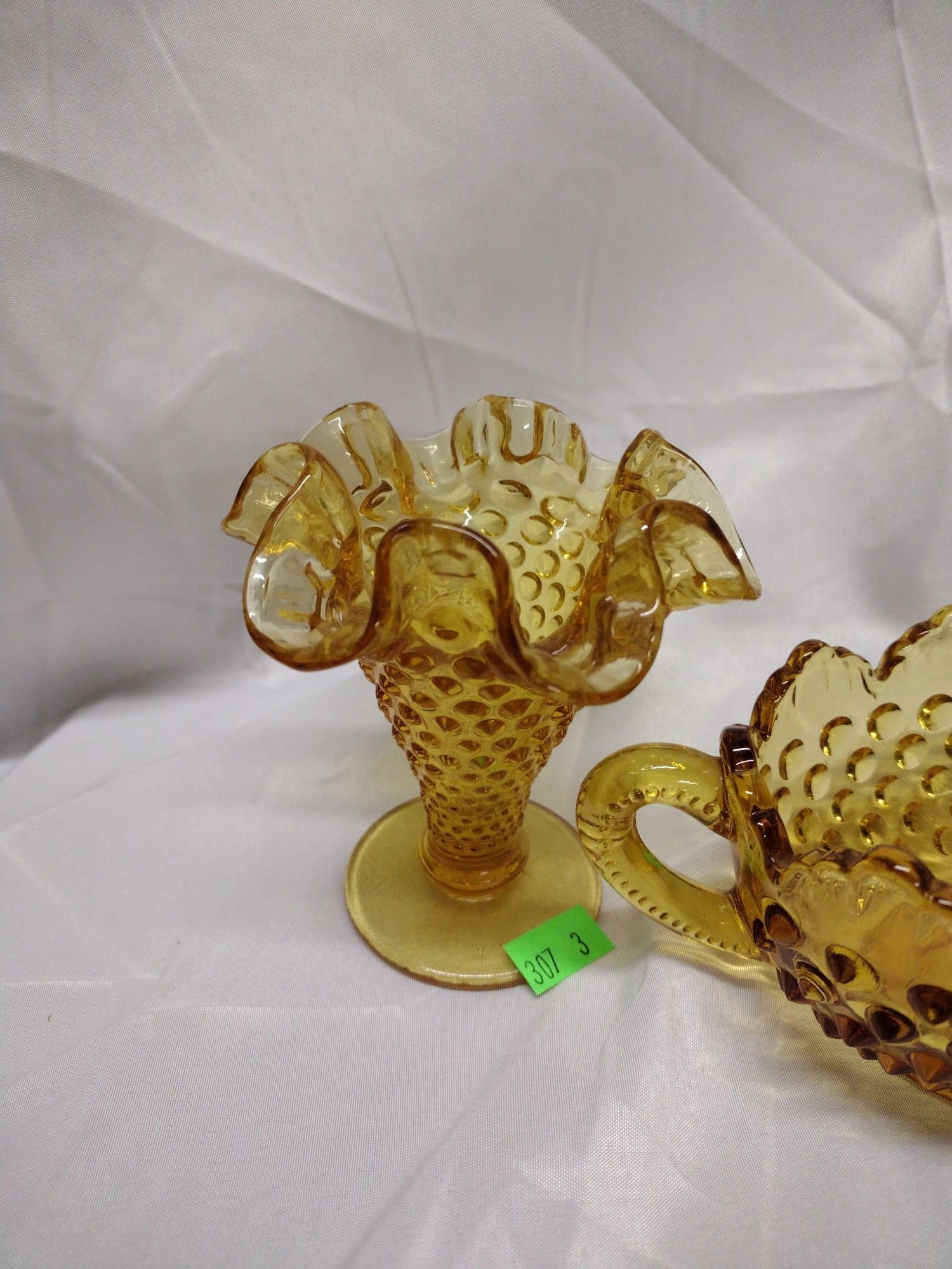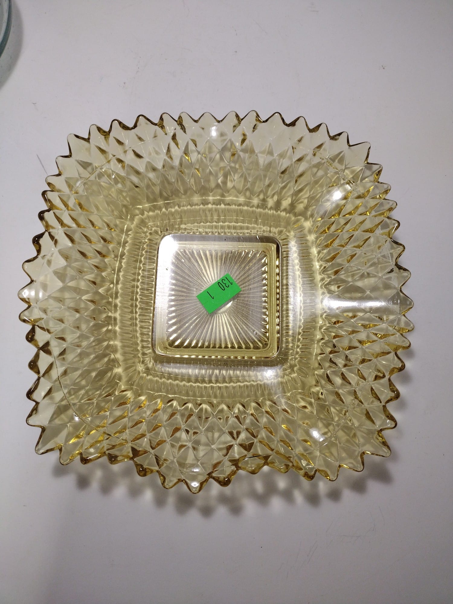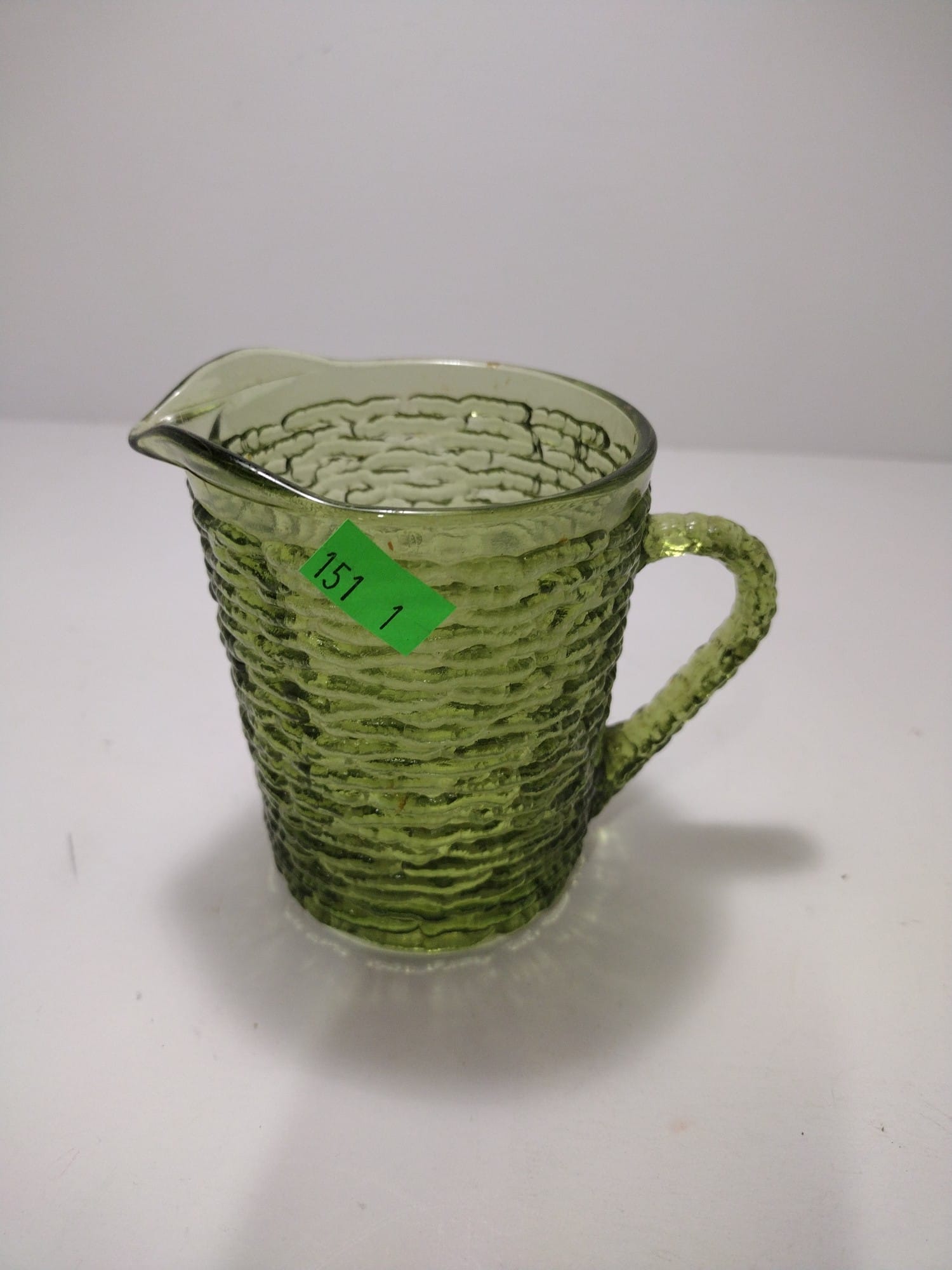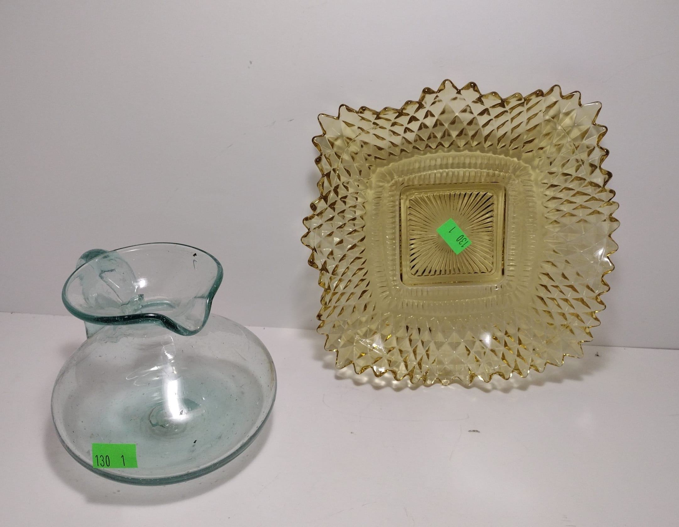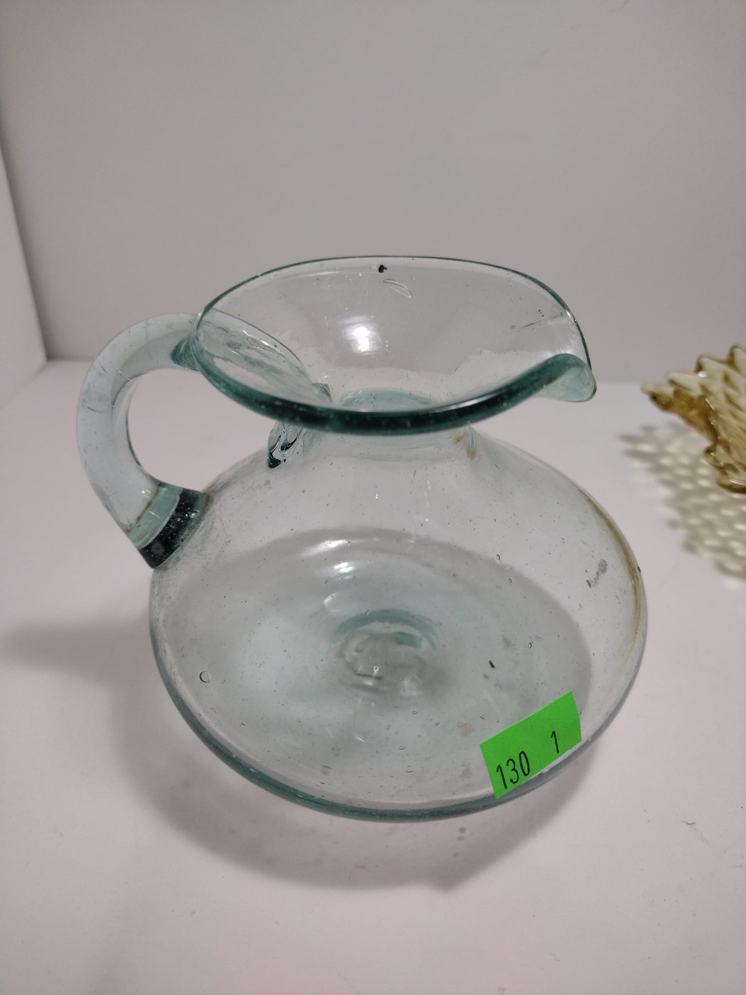 130 Small glass pitcher 4", diamond pattern dish 7"