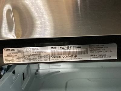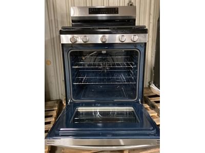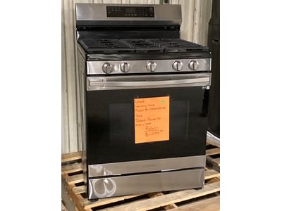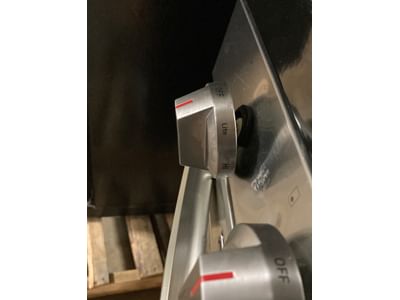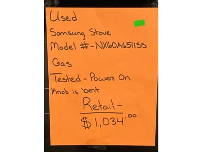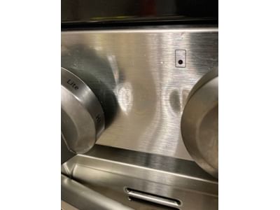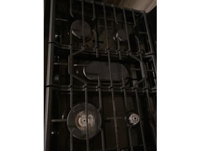 7 Samsung Gas Stove model #NX60A6511SS,knob is bent,dents on front,two burner caps missing on right side
