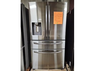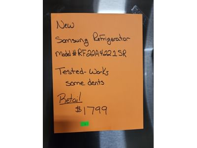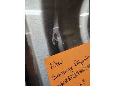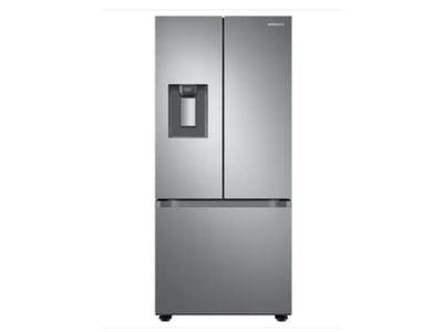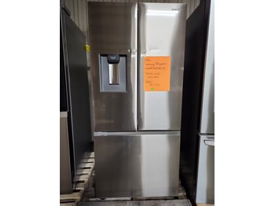 16 NEW Samsung 22 cu. ft. 3-Door French Door Smart Refrigerator with Water Dispenser in Fingerprint Resistant Stainless Steel Has dents on doors model # RF22A4221SR