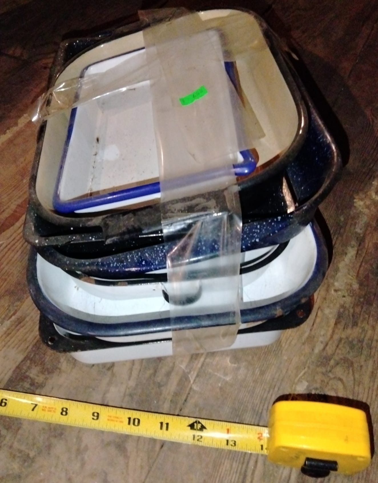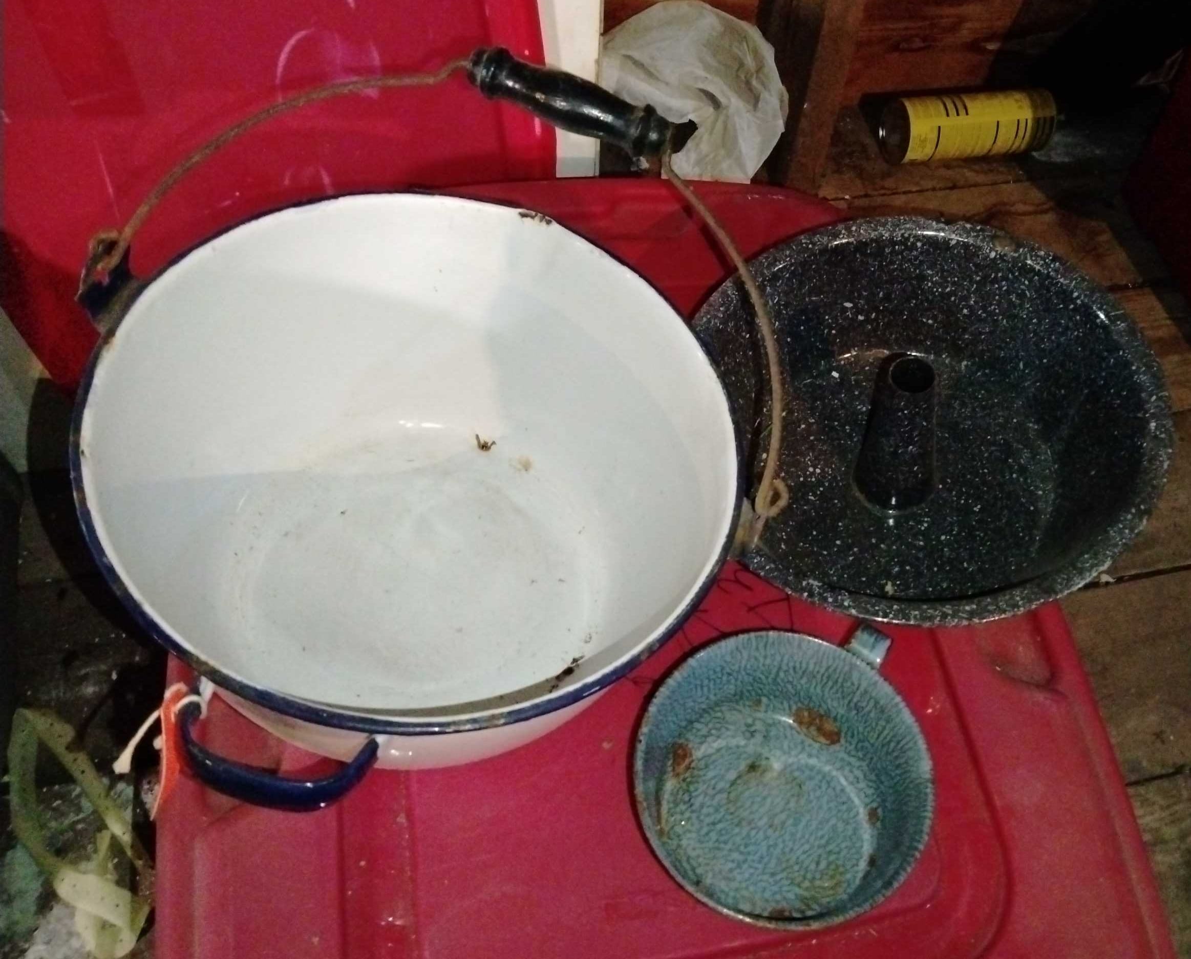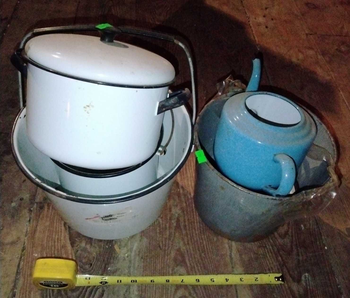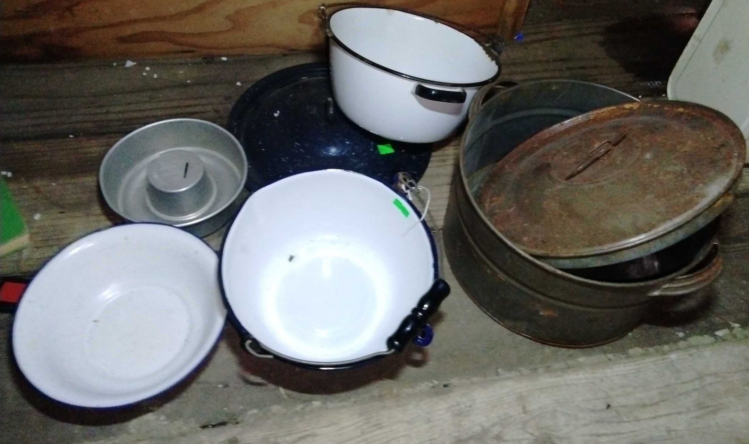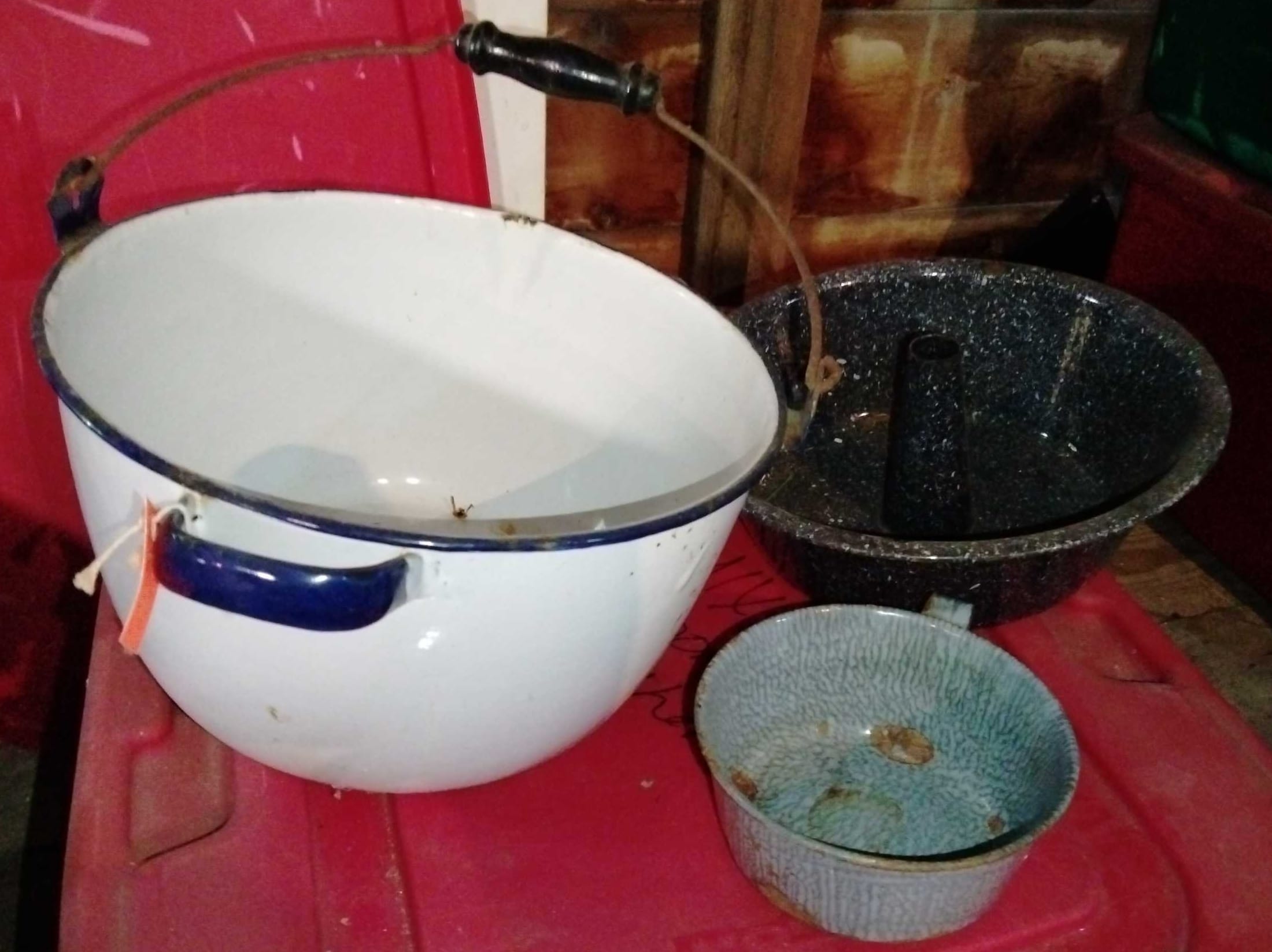 447 Enamel pan, IU Tin, cups, basket, wood basket, miscellaneous