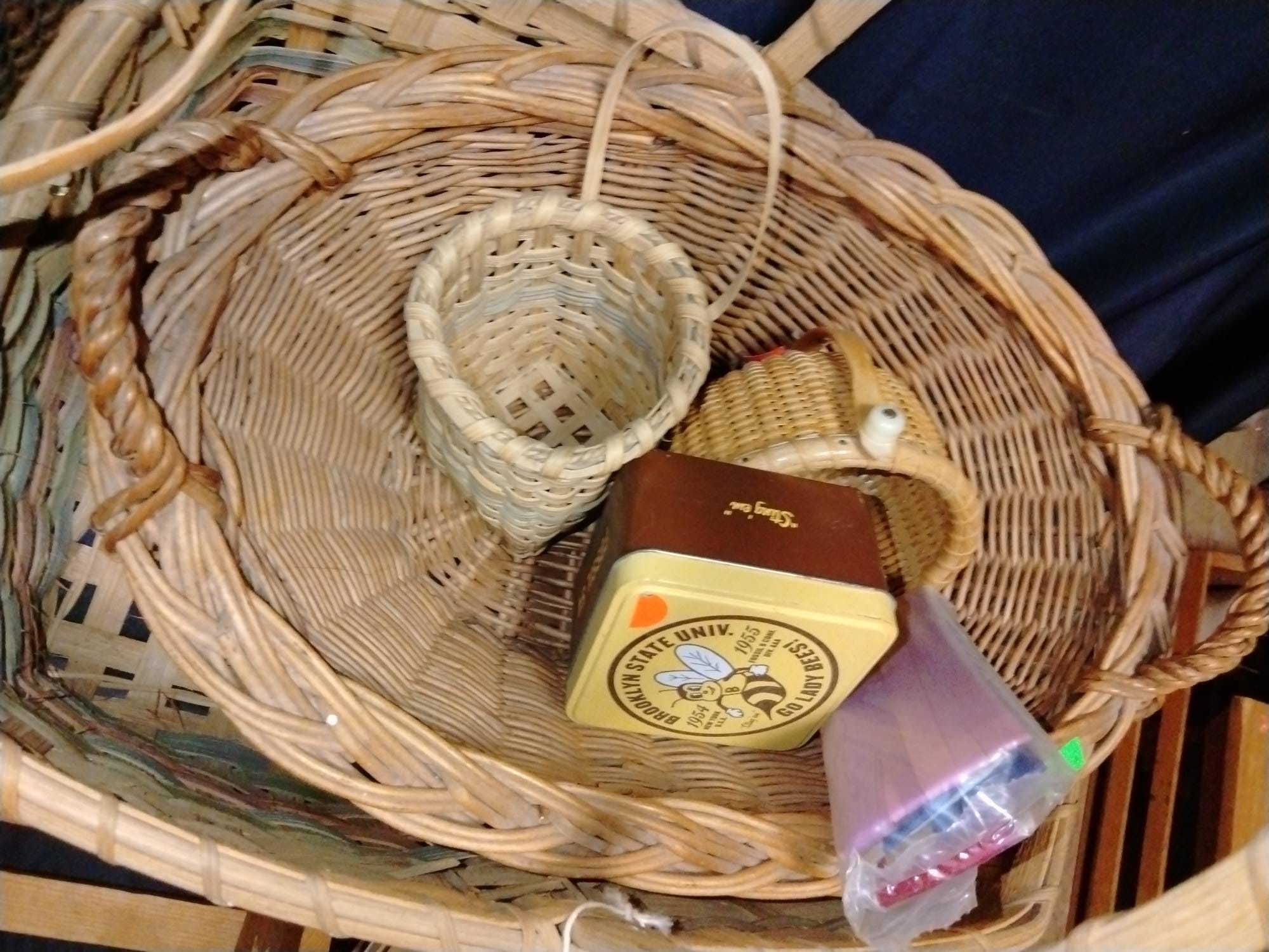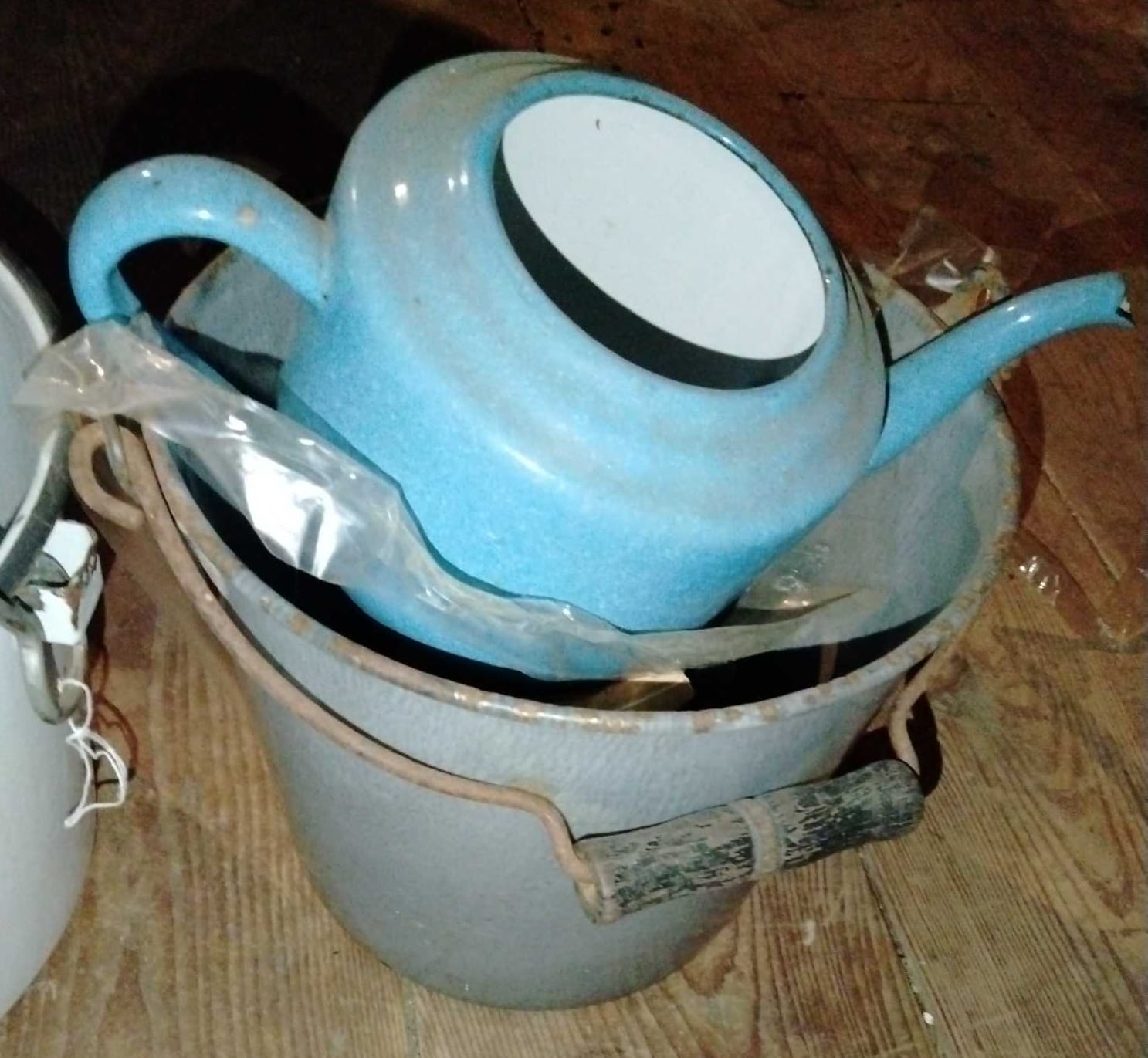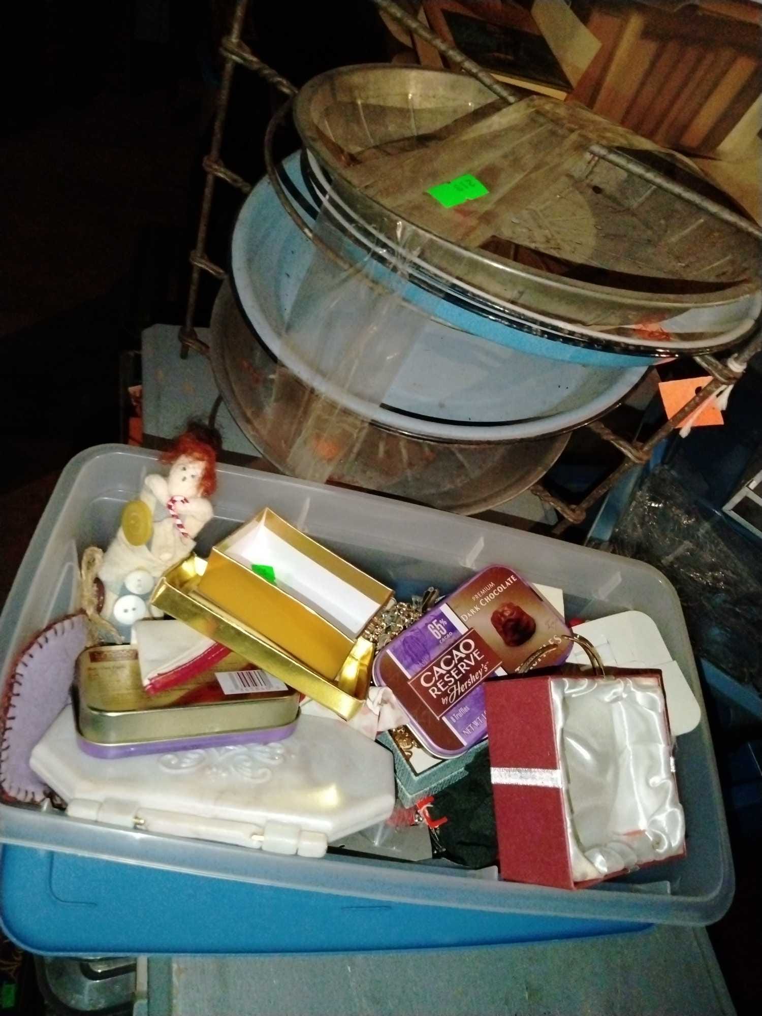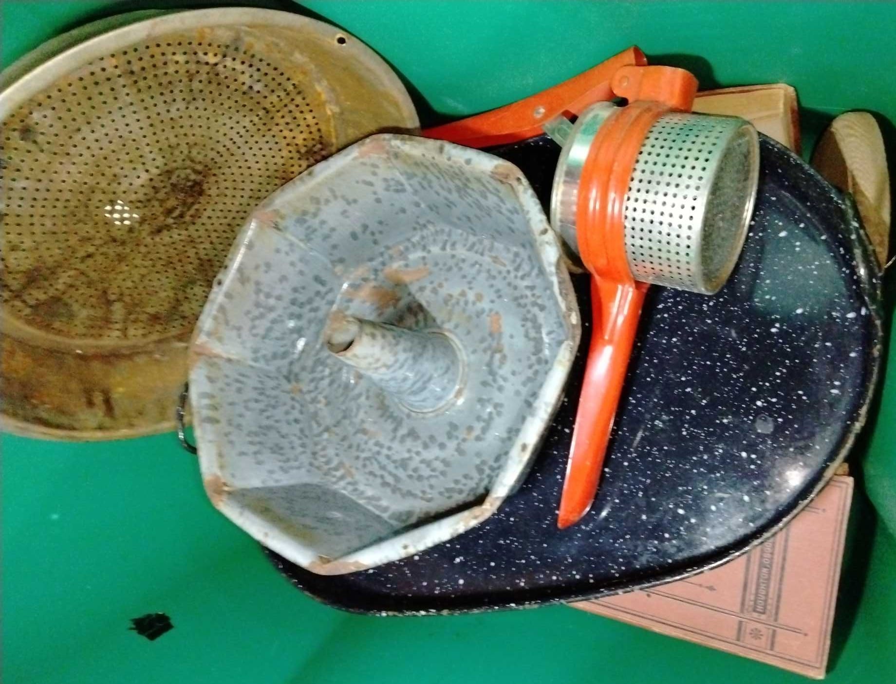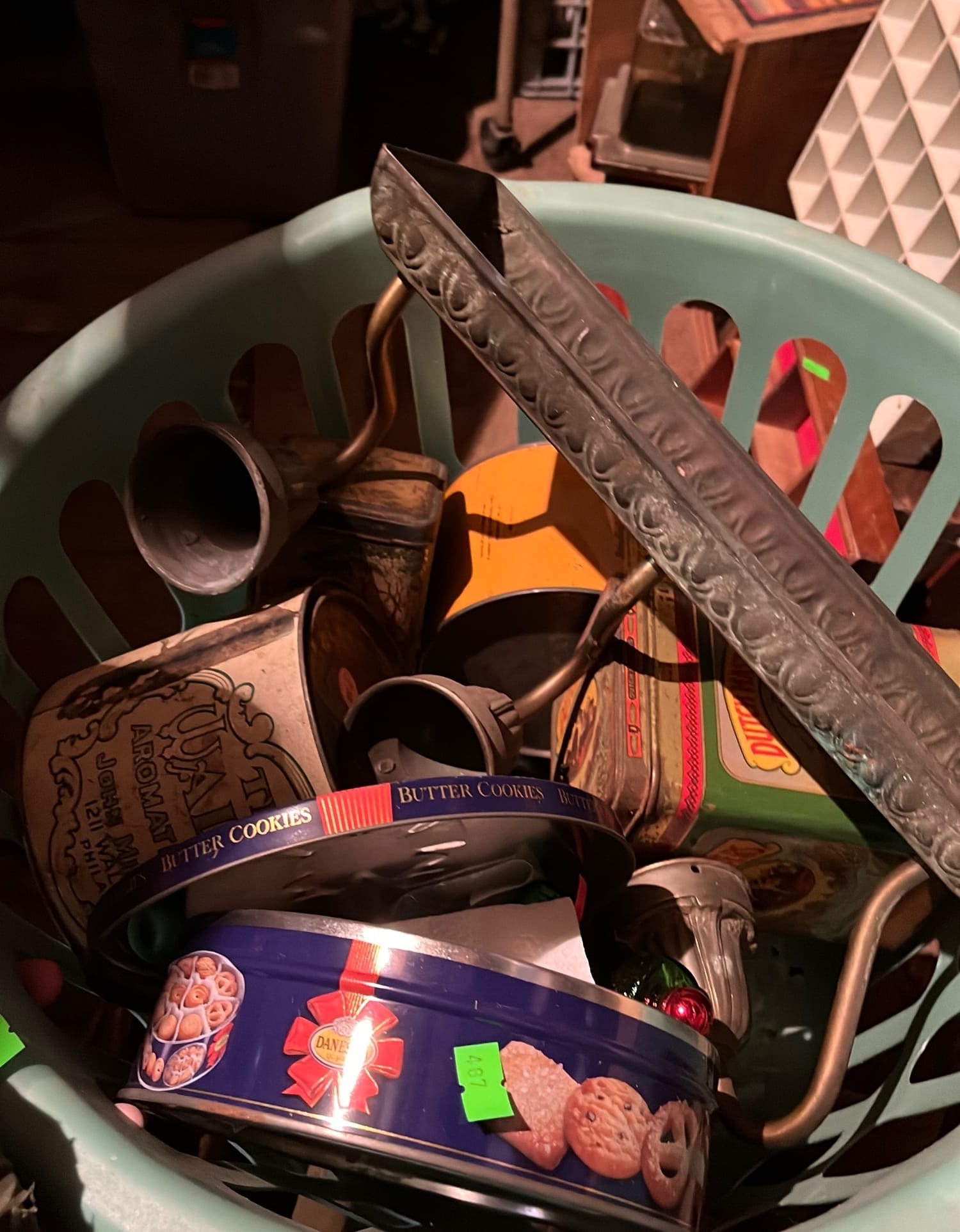 447 Enamel pan, IU Tin, cups, basket, wood basket, miscellaneous