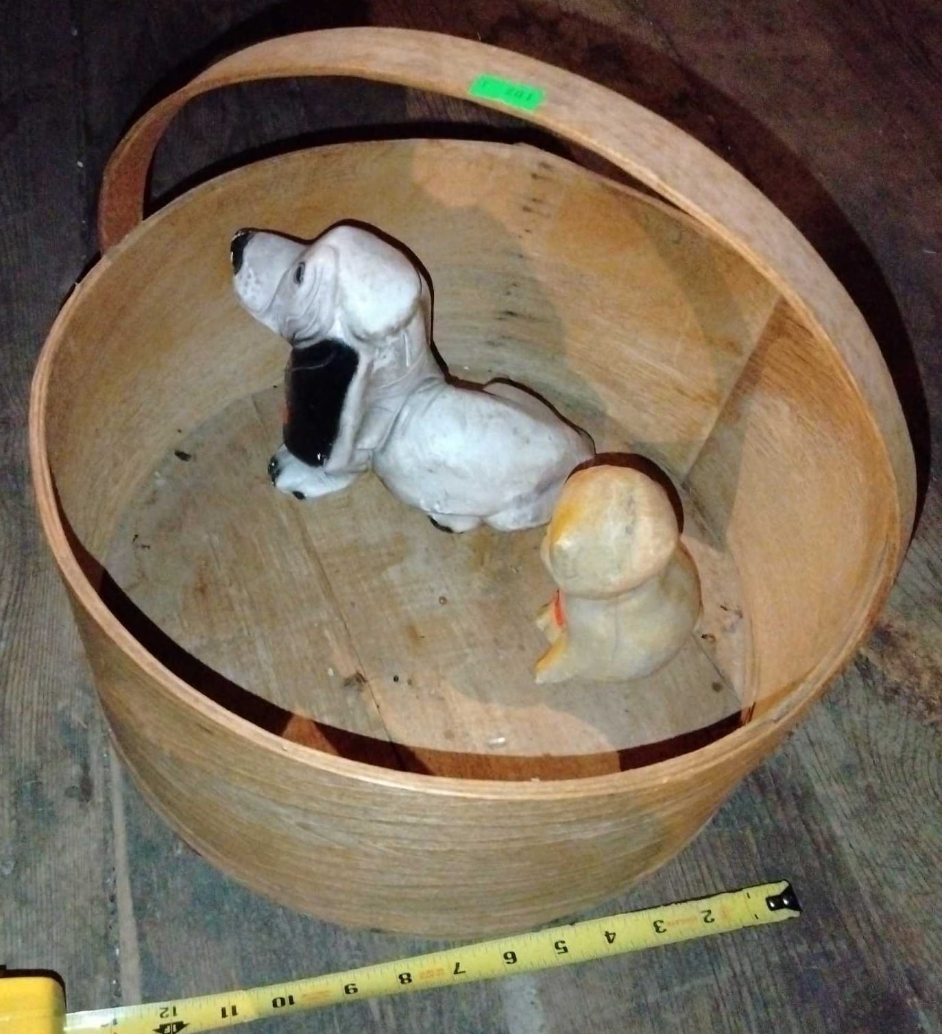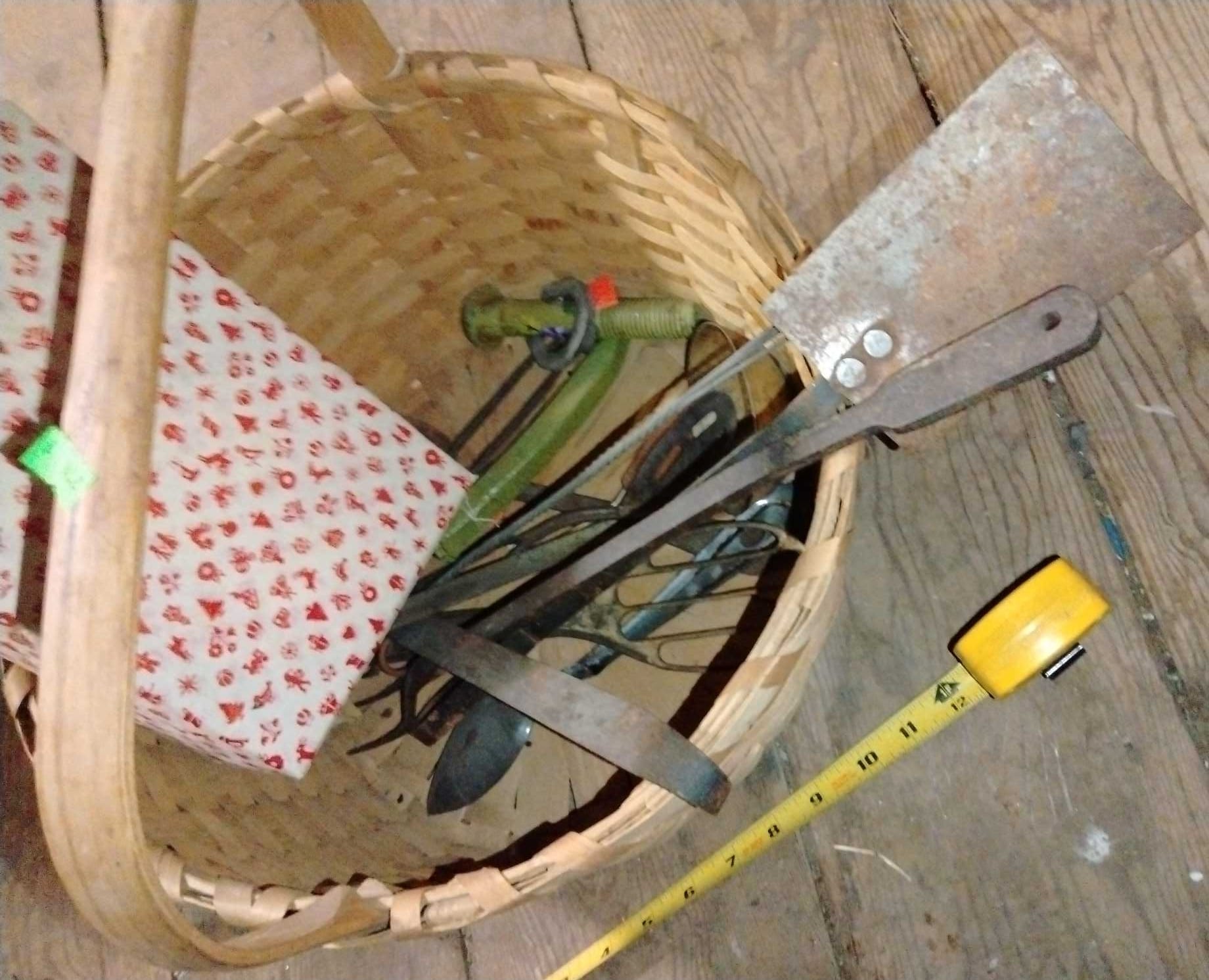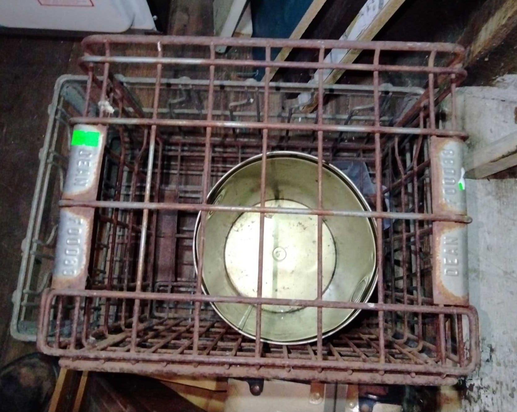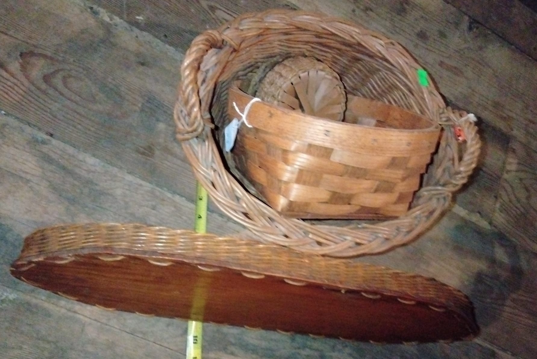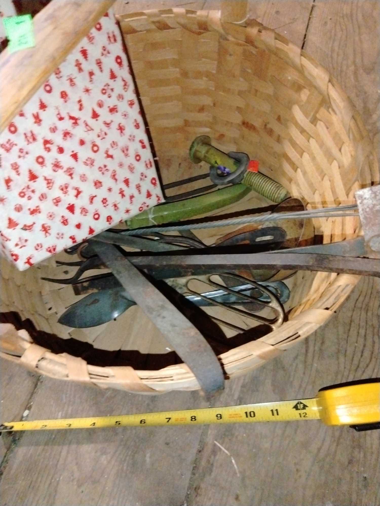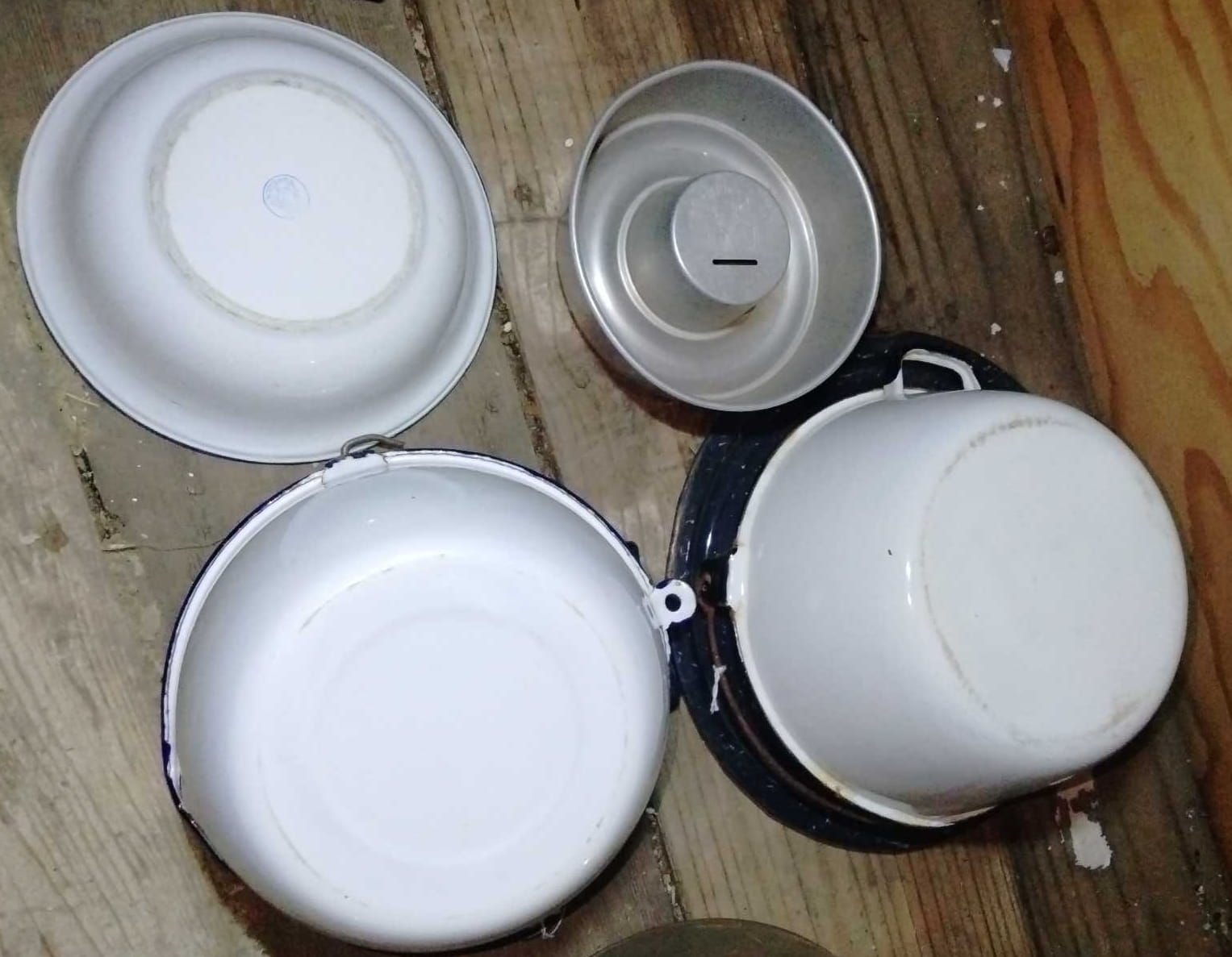 447 Enamel pan, IU Tin, cups, basket, wood basket, miscellaneous