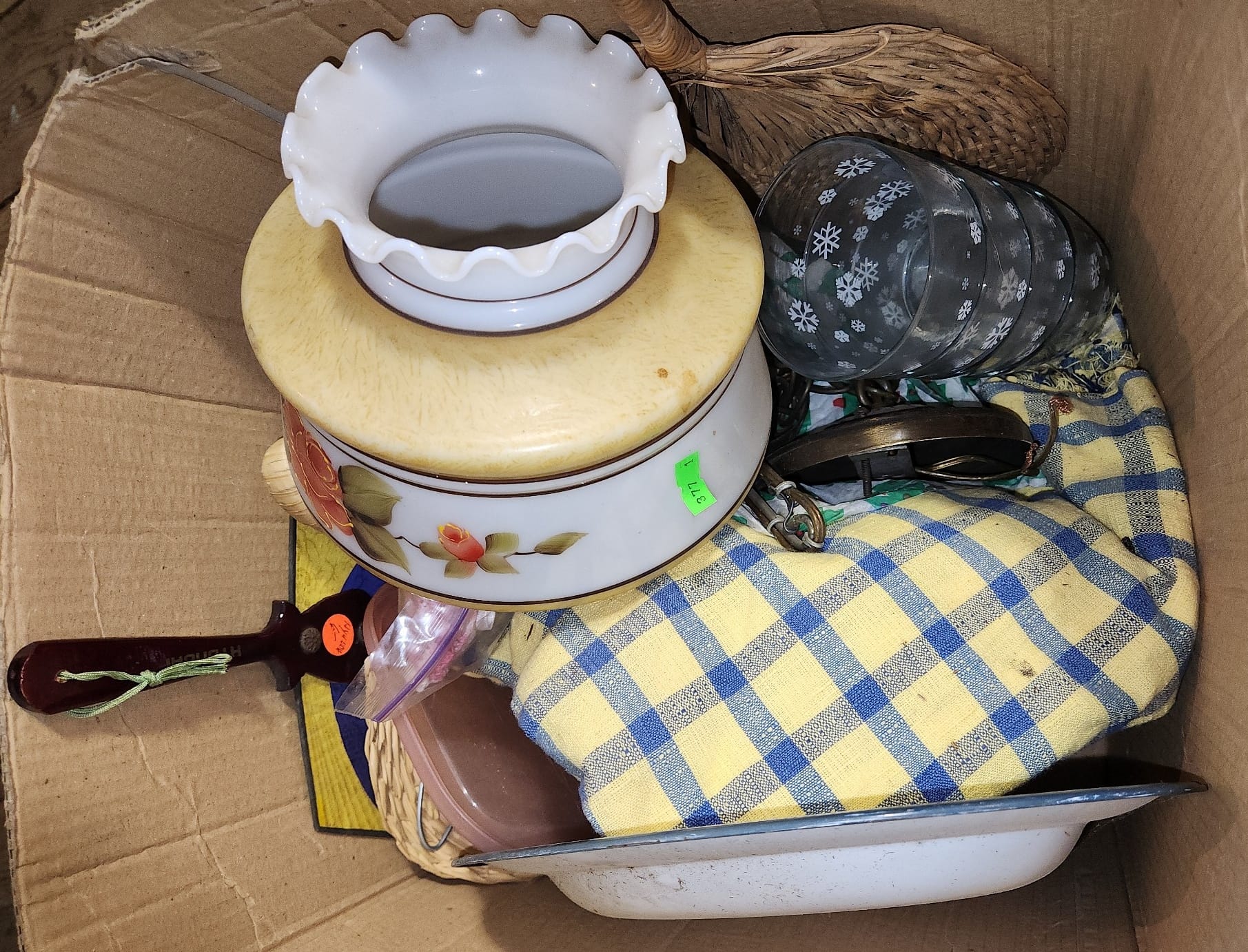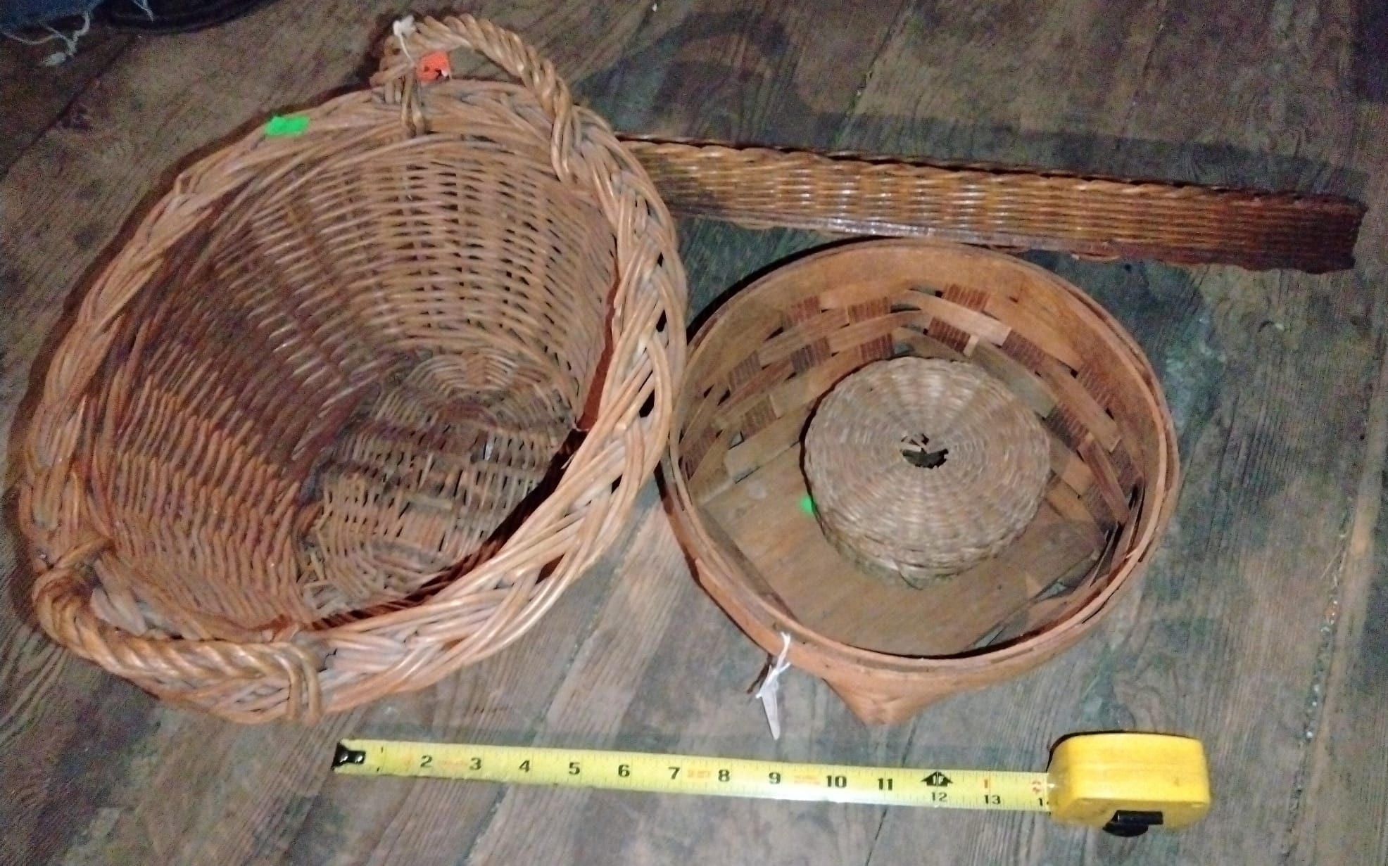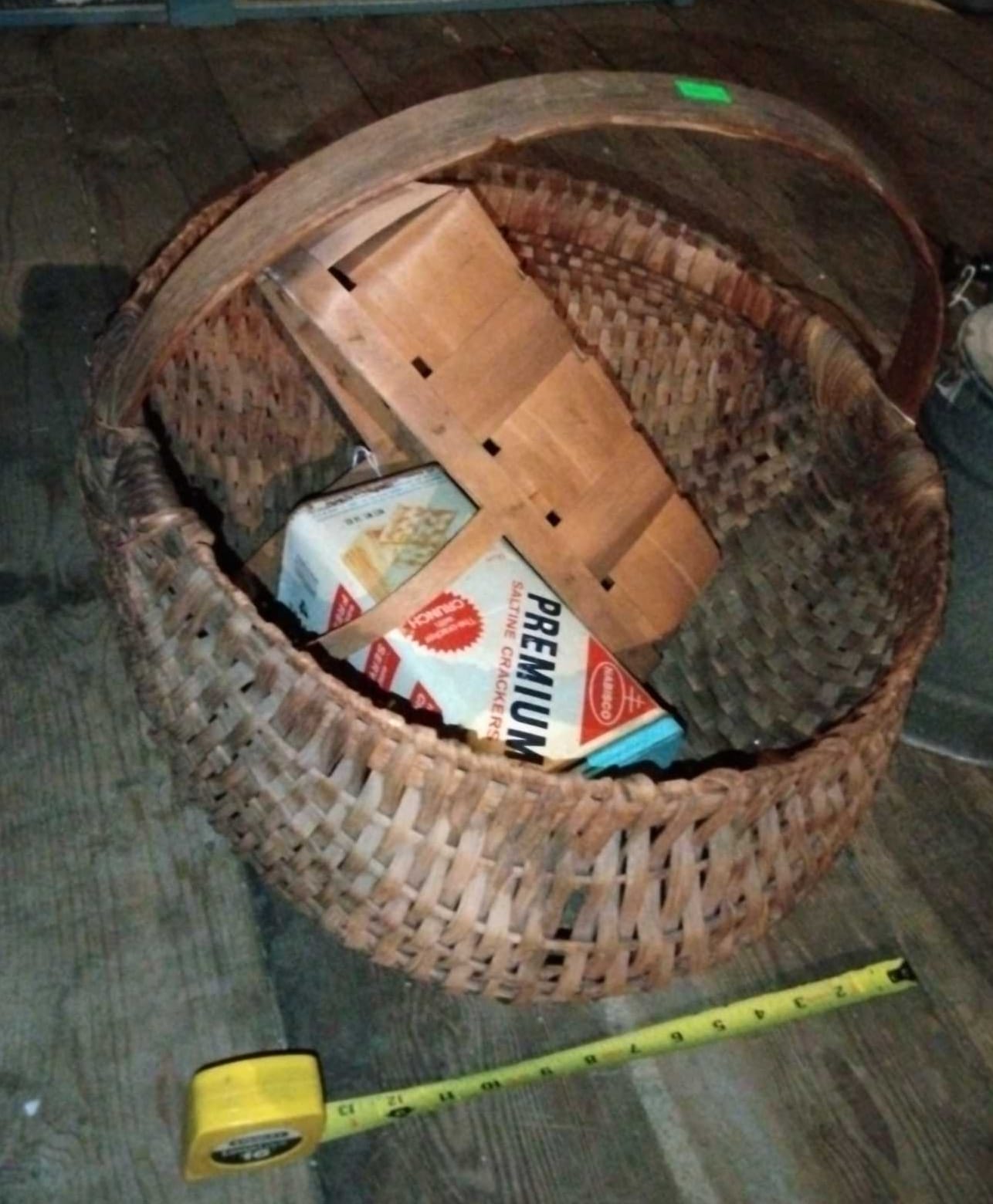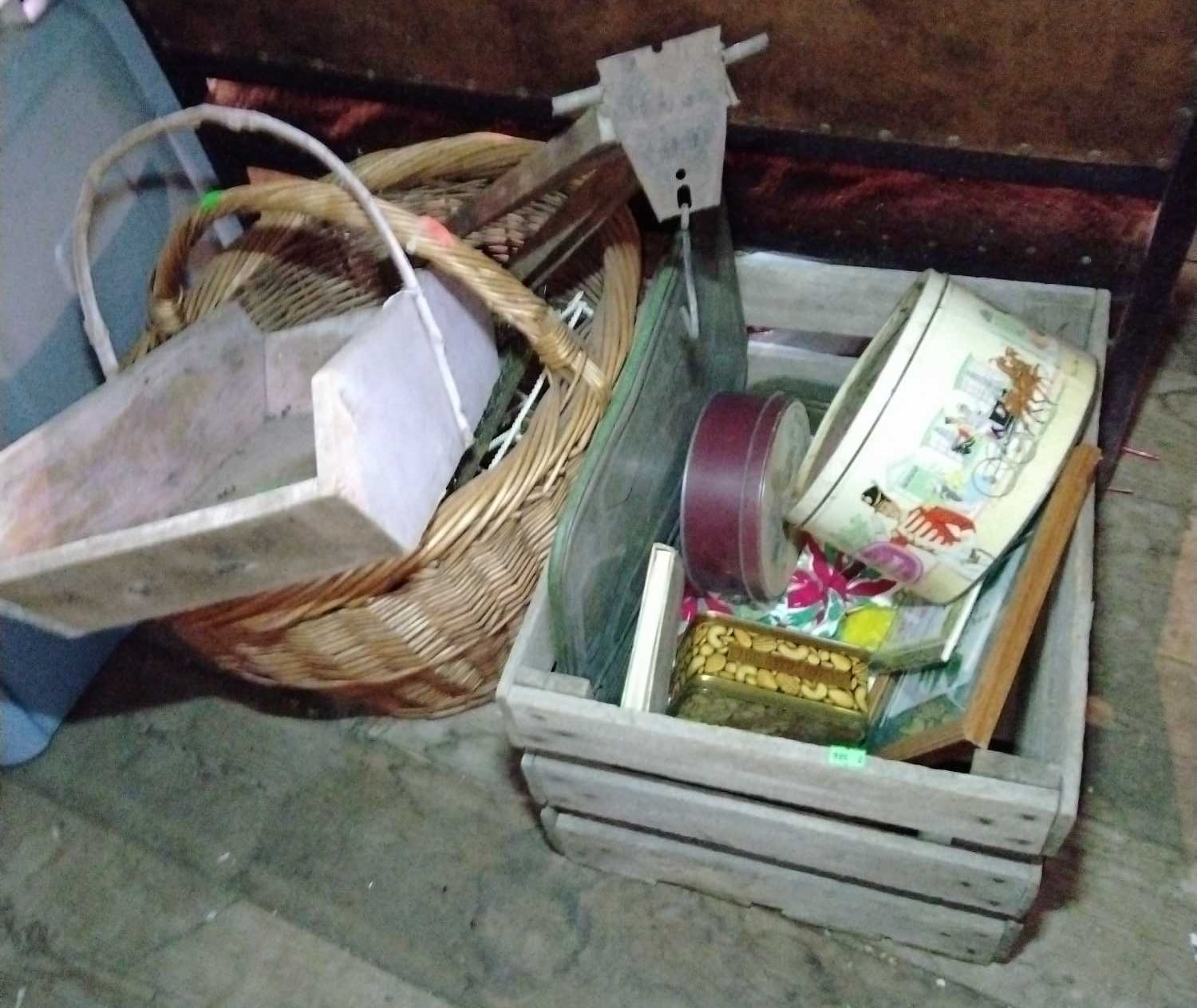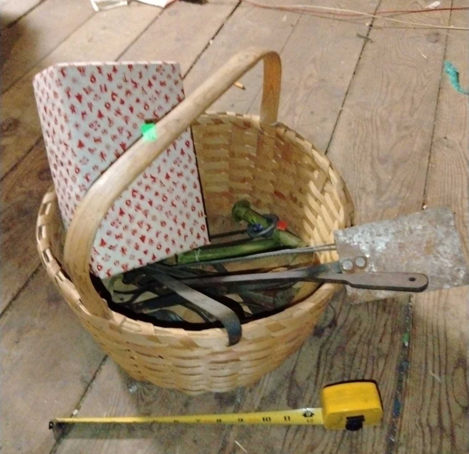 447 Enamel pan, IU Tin, cups, basket, wood basket, miscellaneous