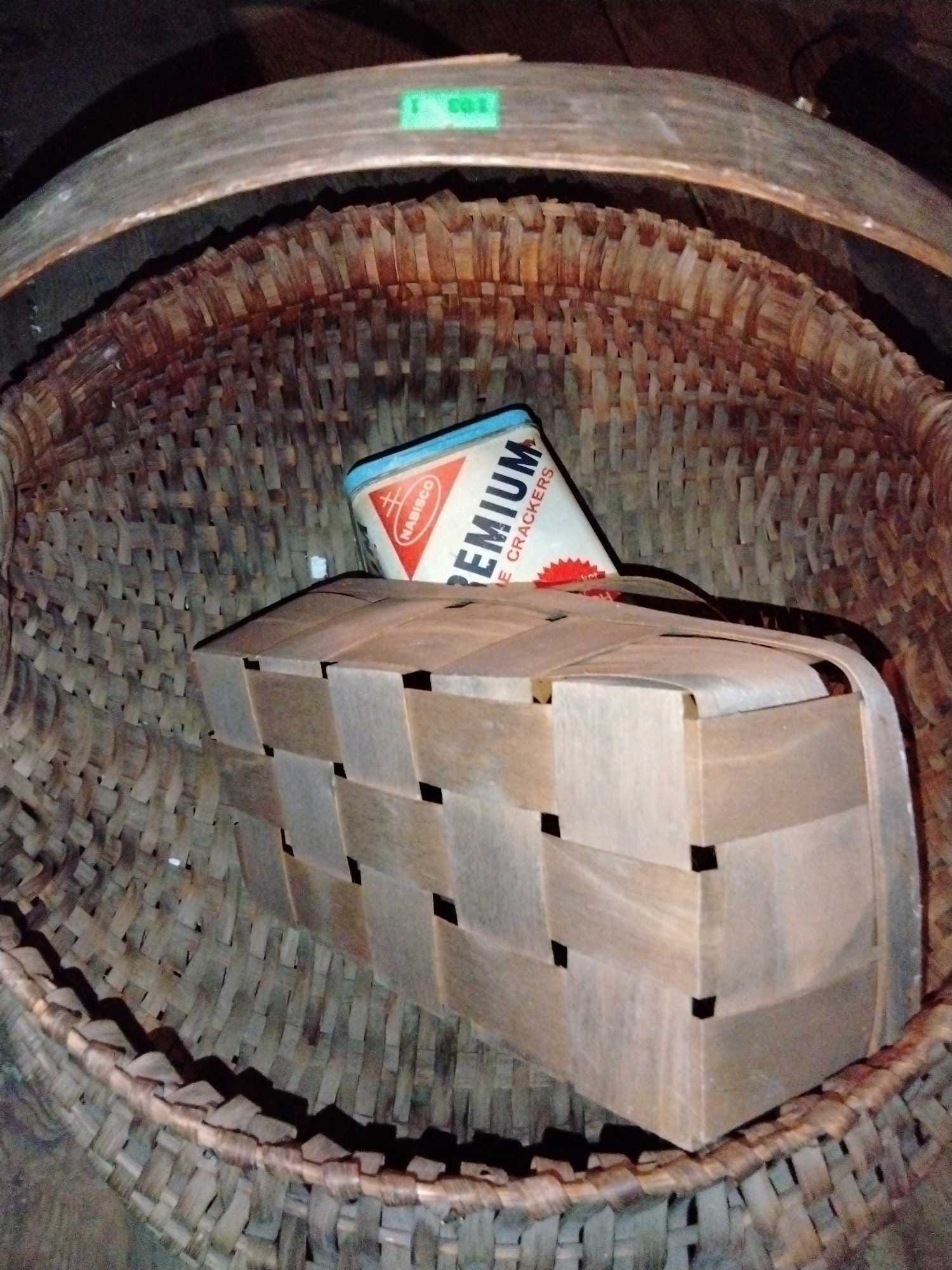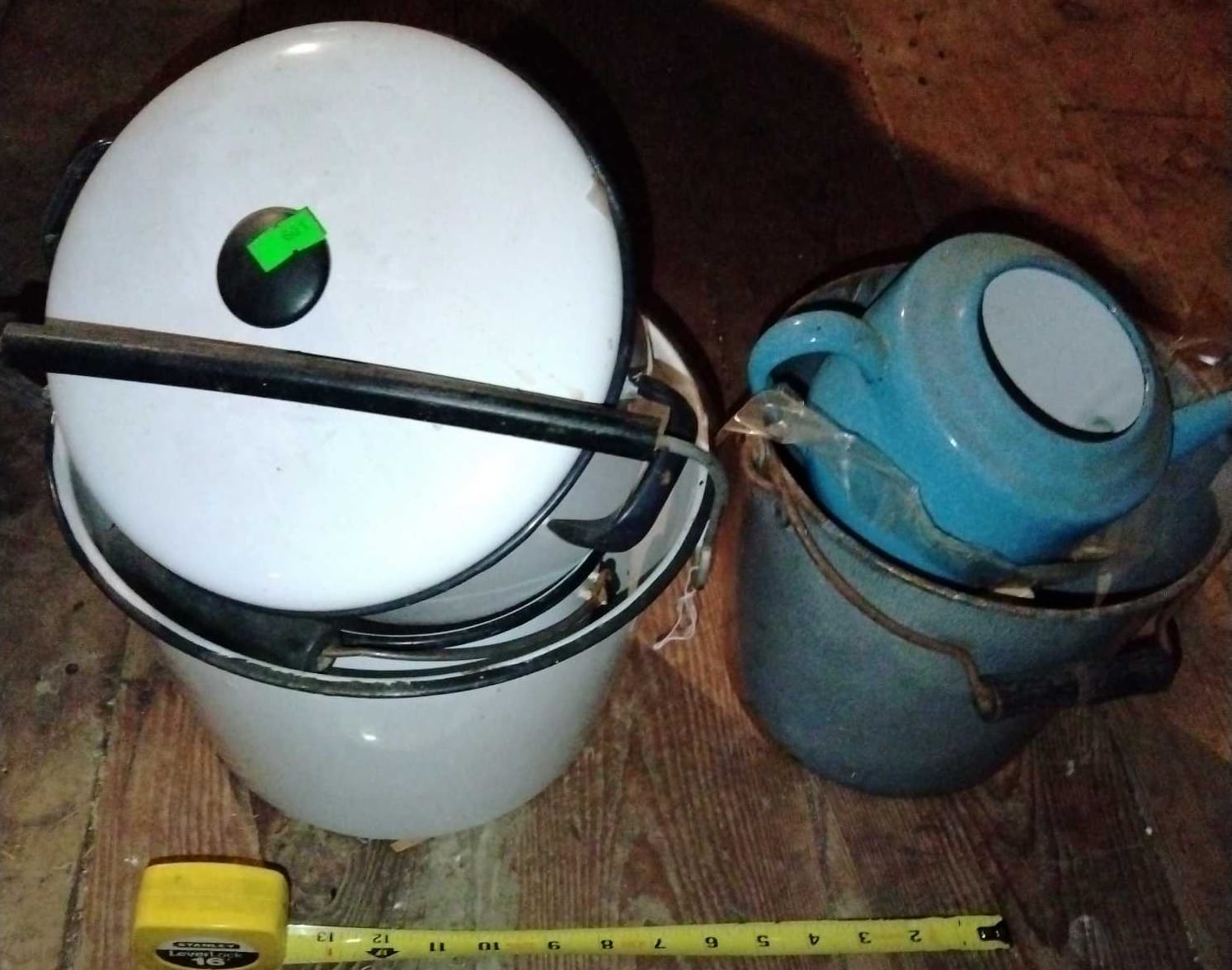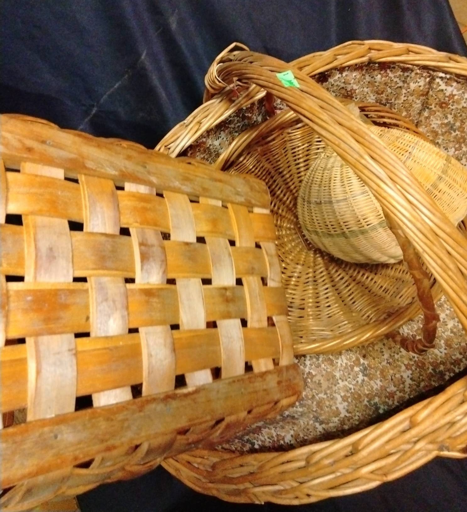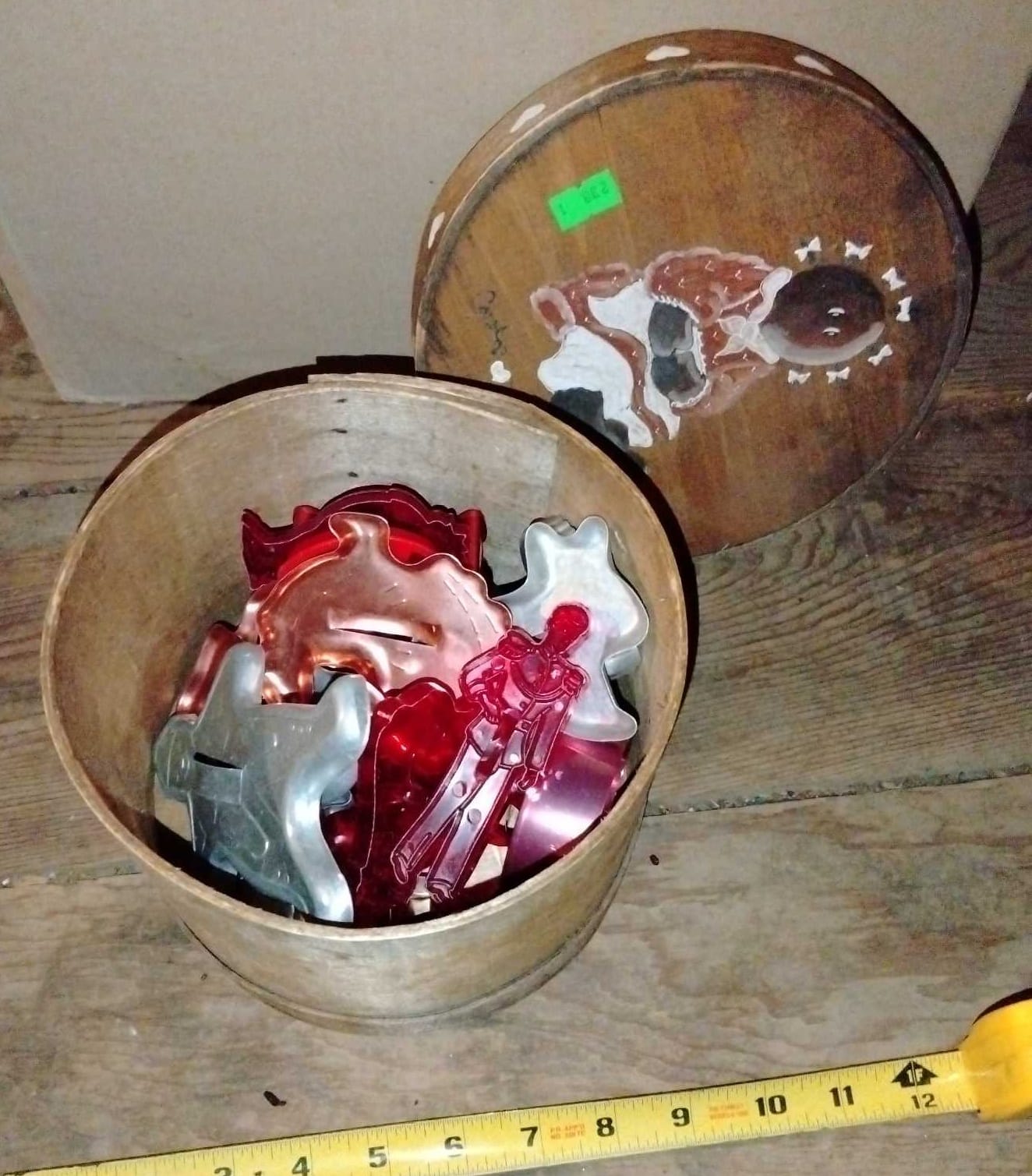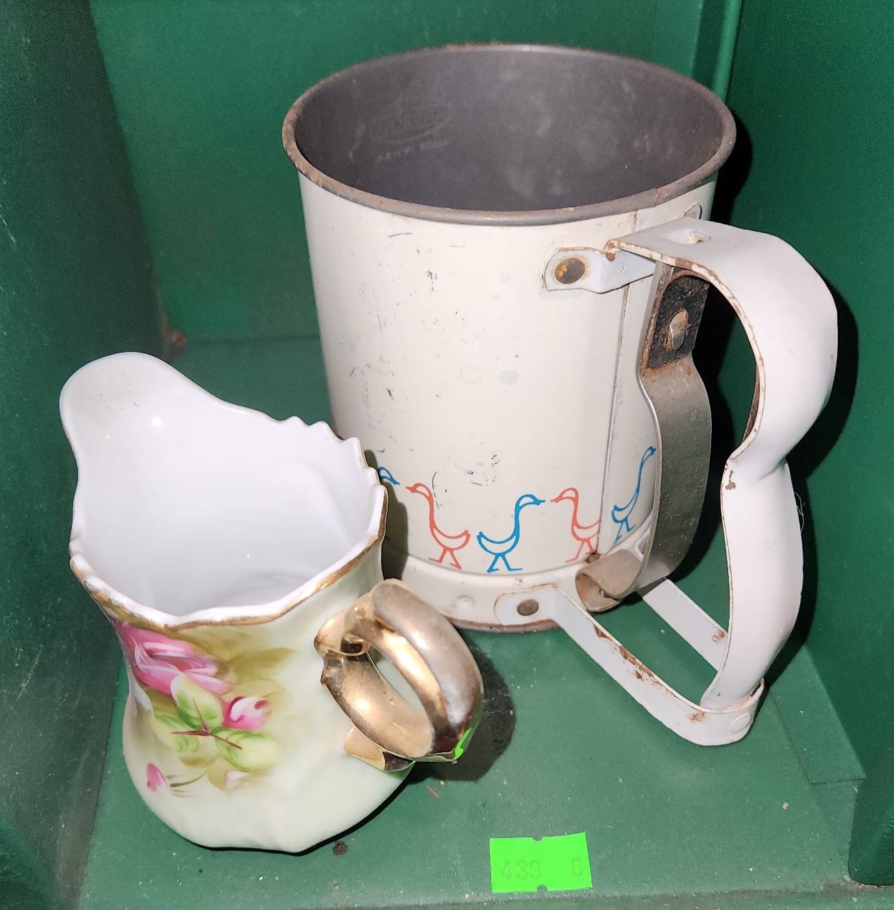 447 Enamel pan, IU Tin, cups, basket, wood basket, miscellaneous