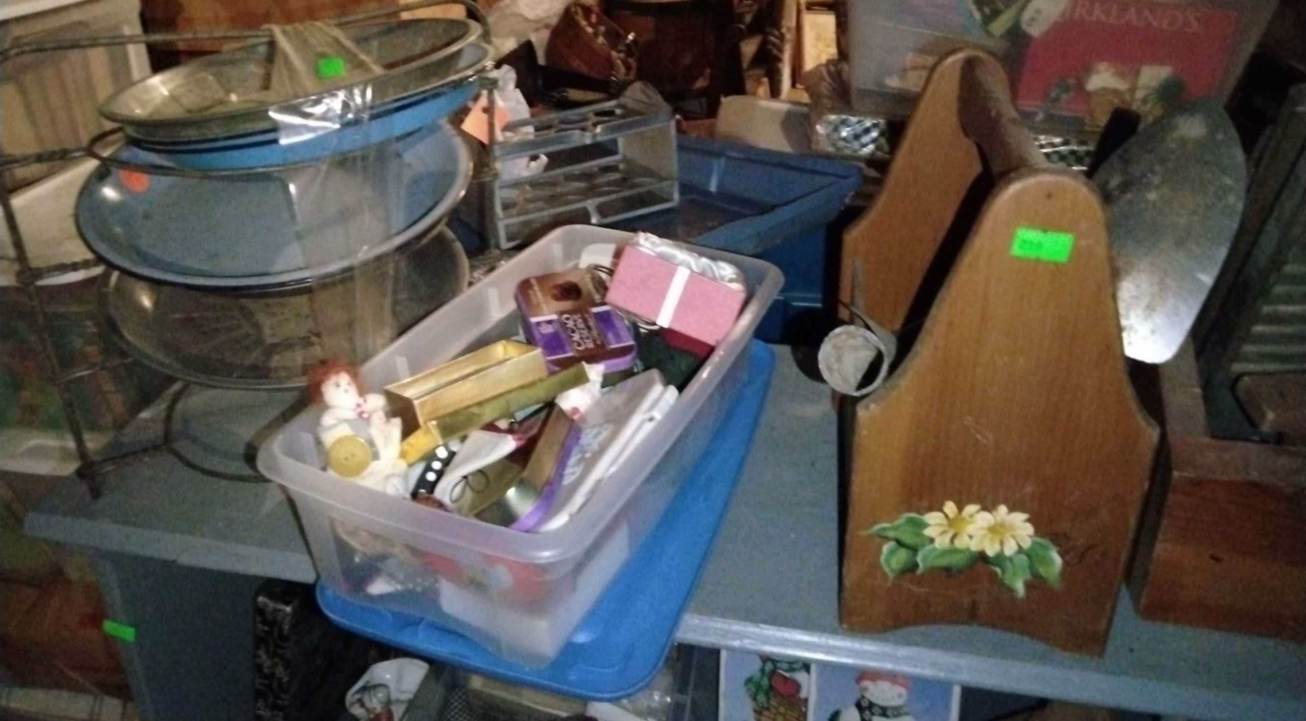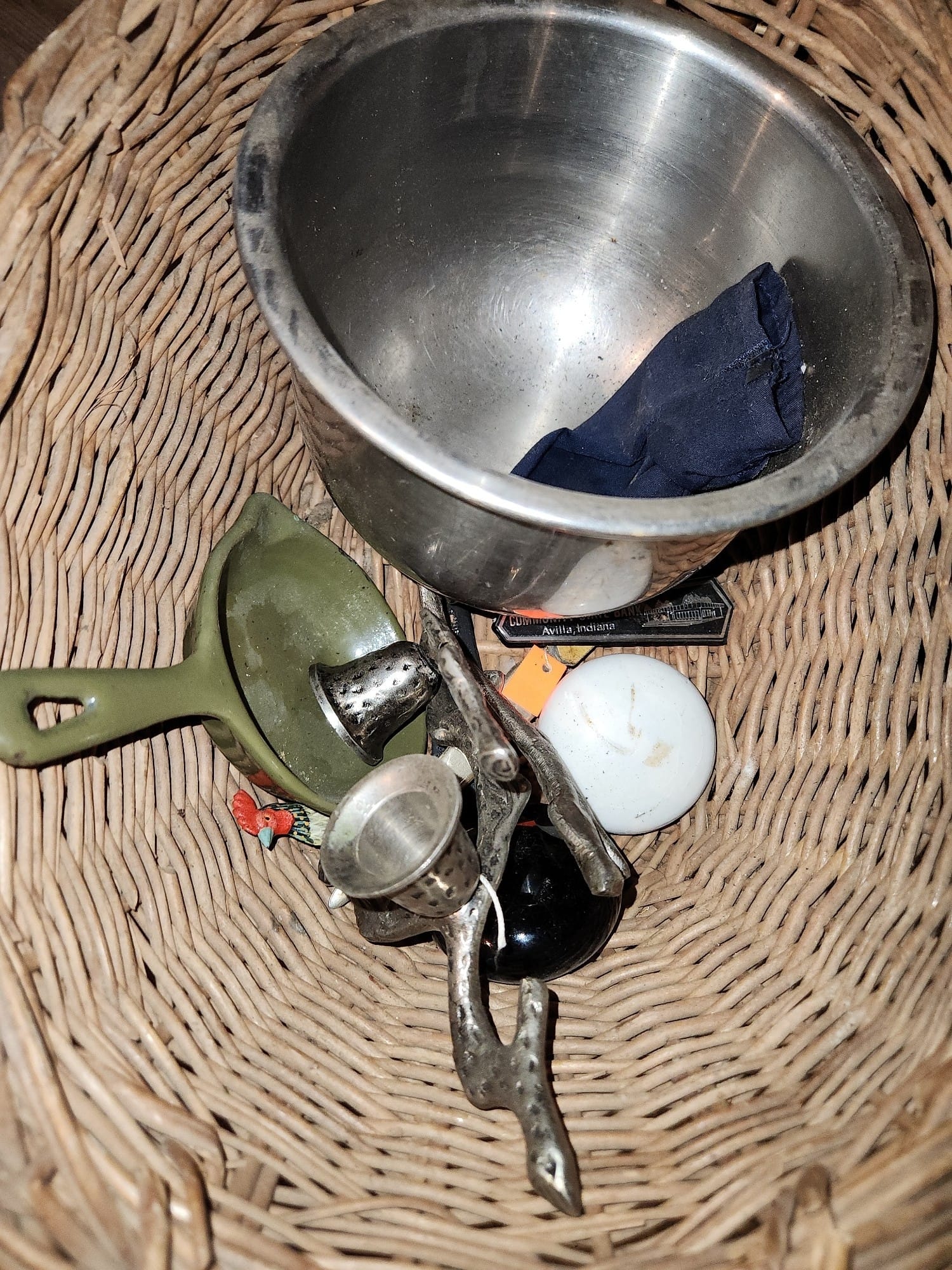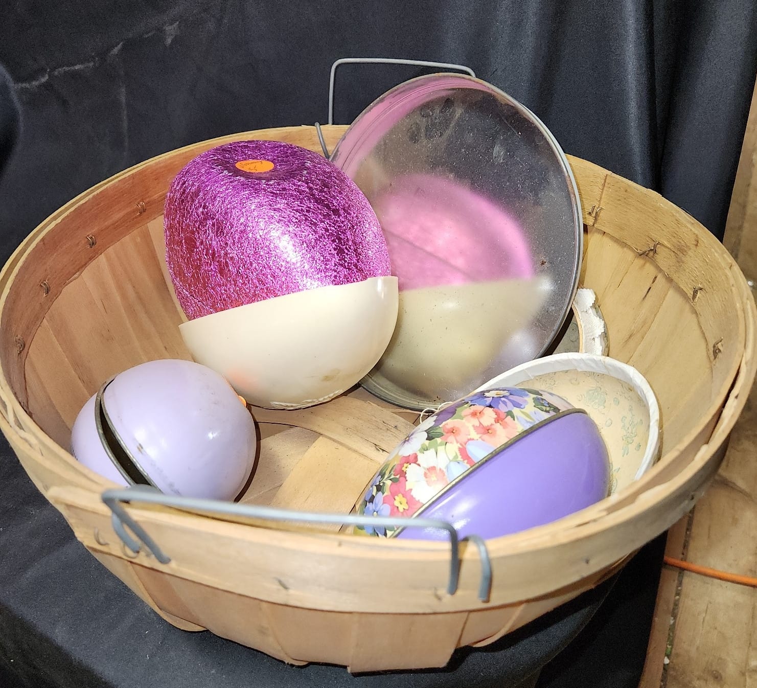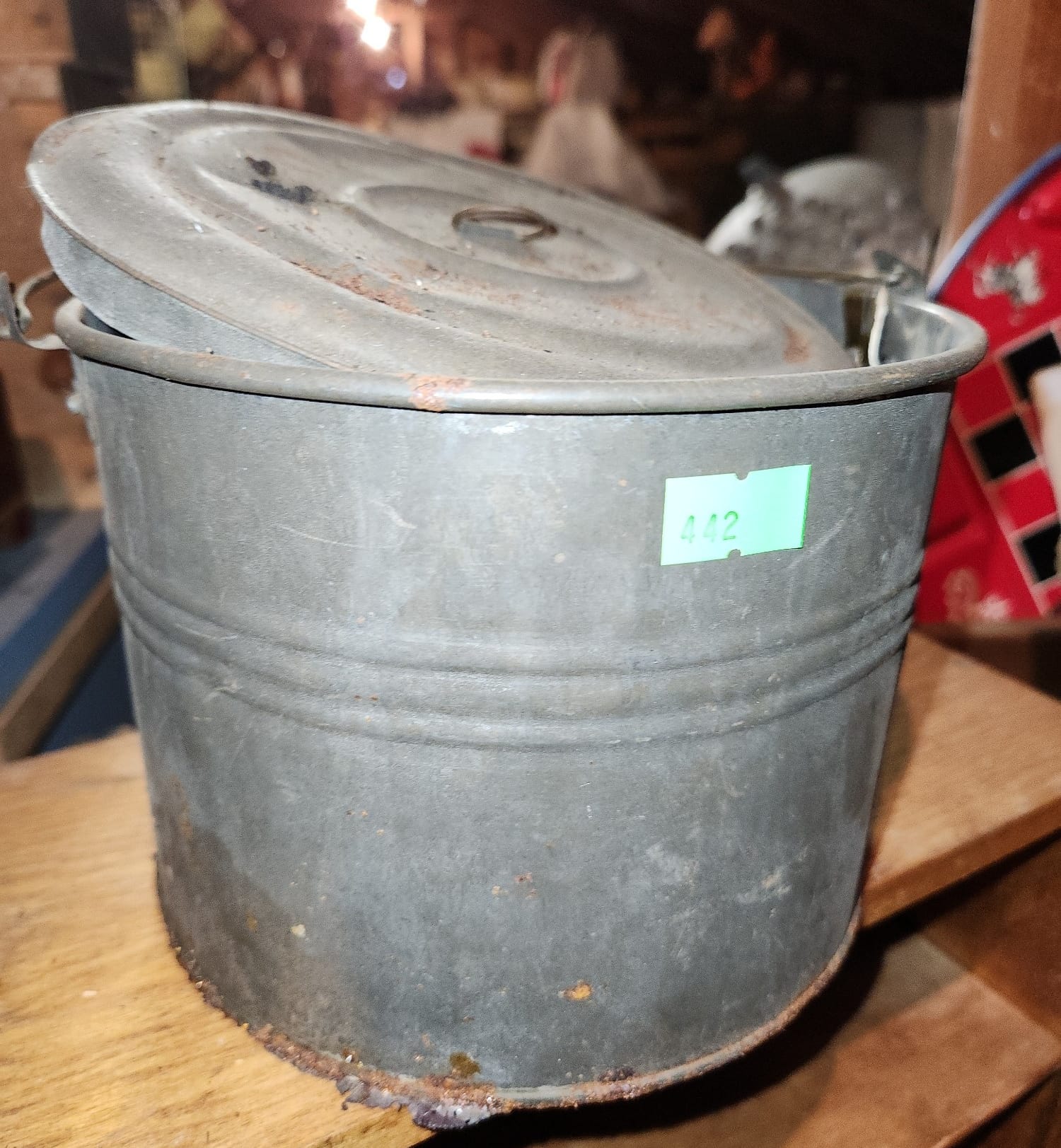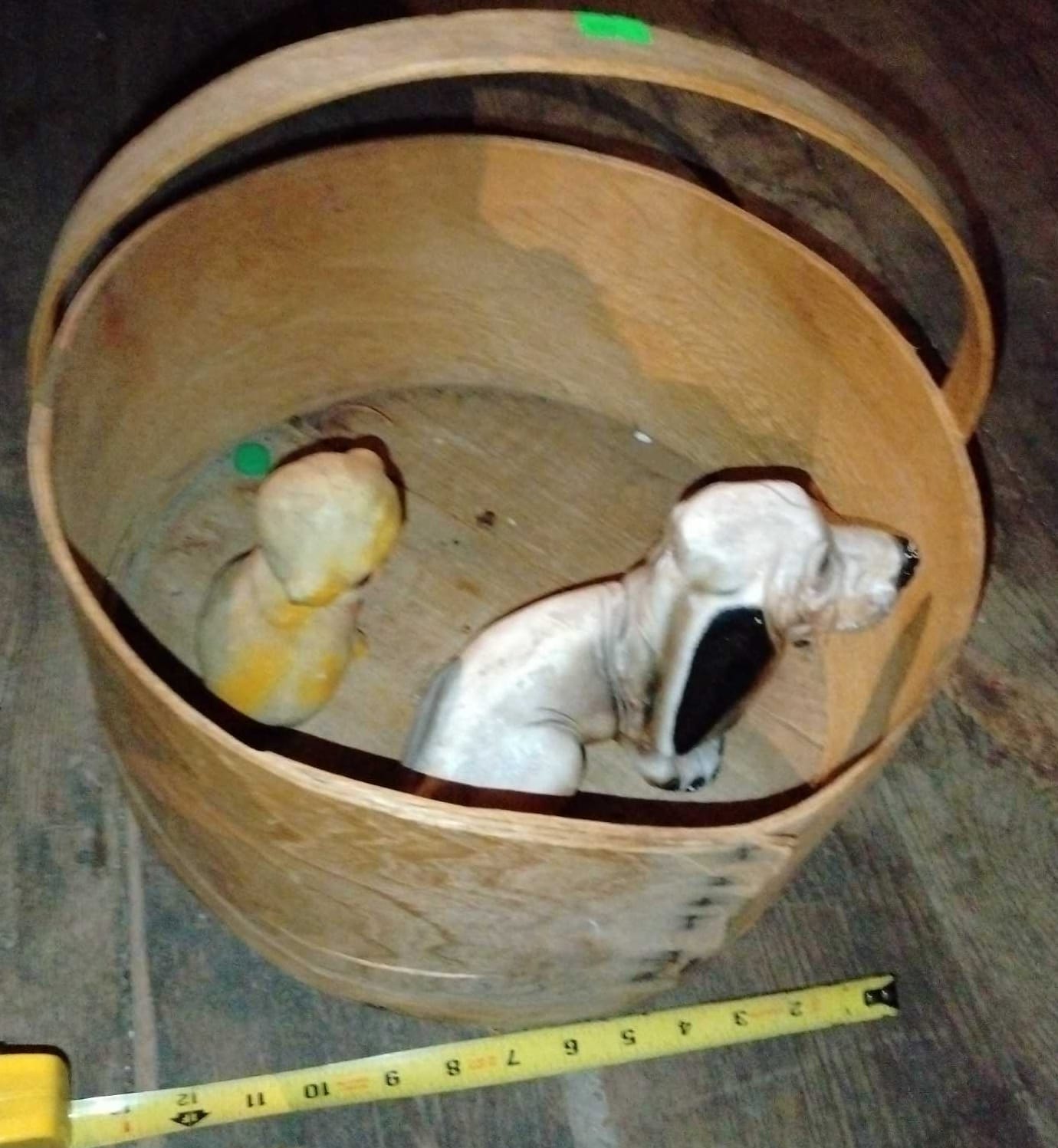 447 Enamel pan, IU Tin, cups, basket, wood basket, miscellaneous