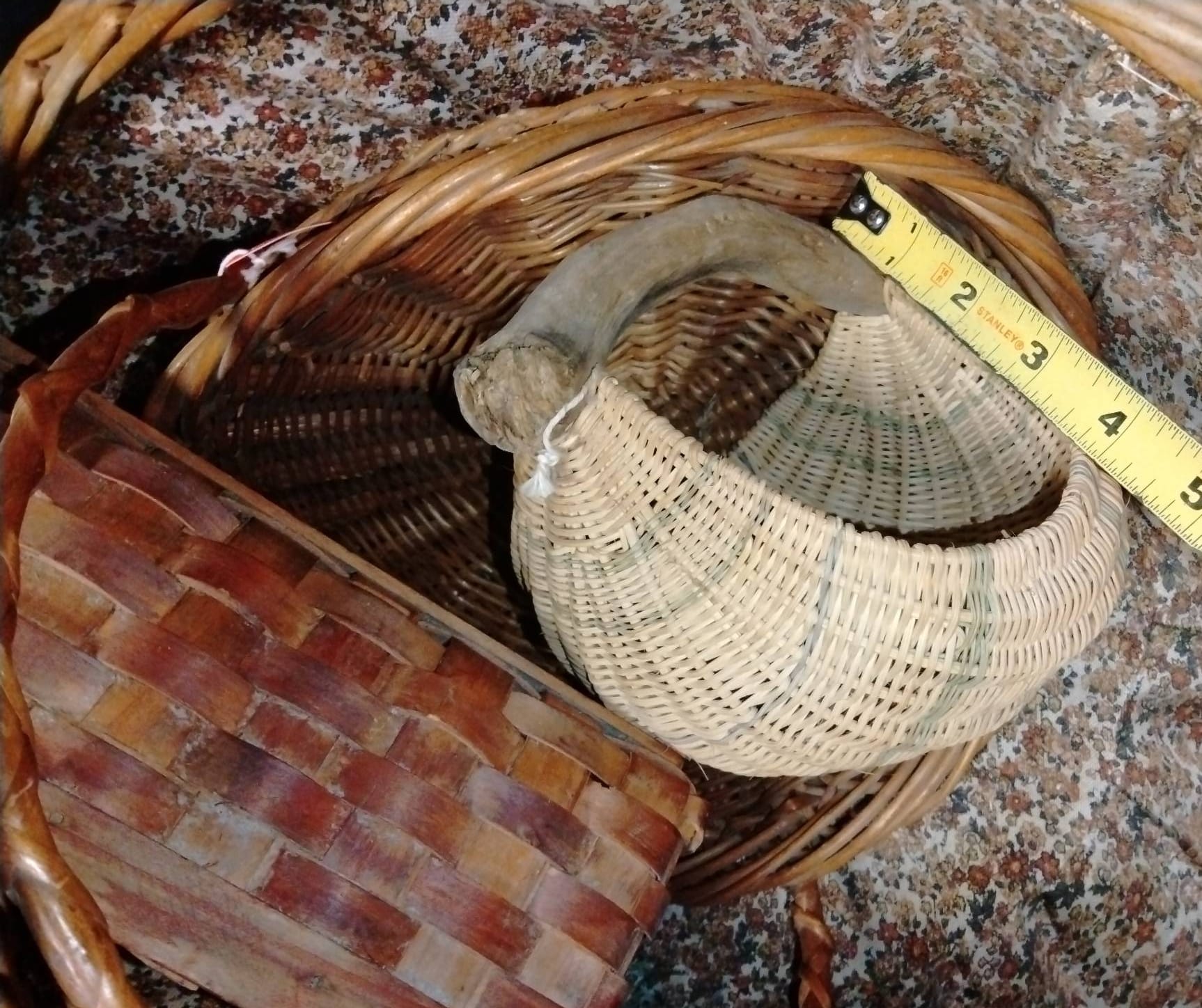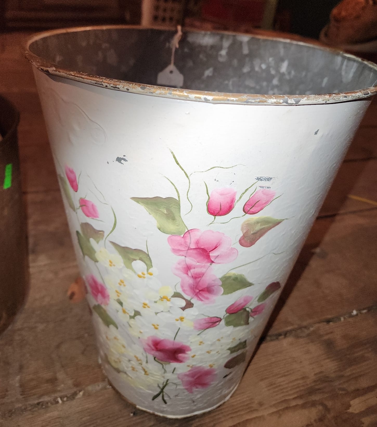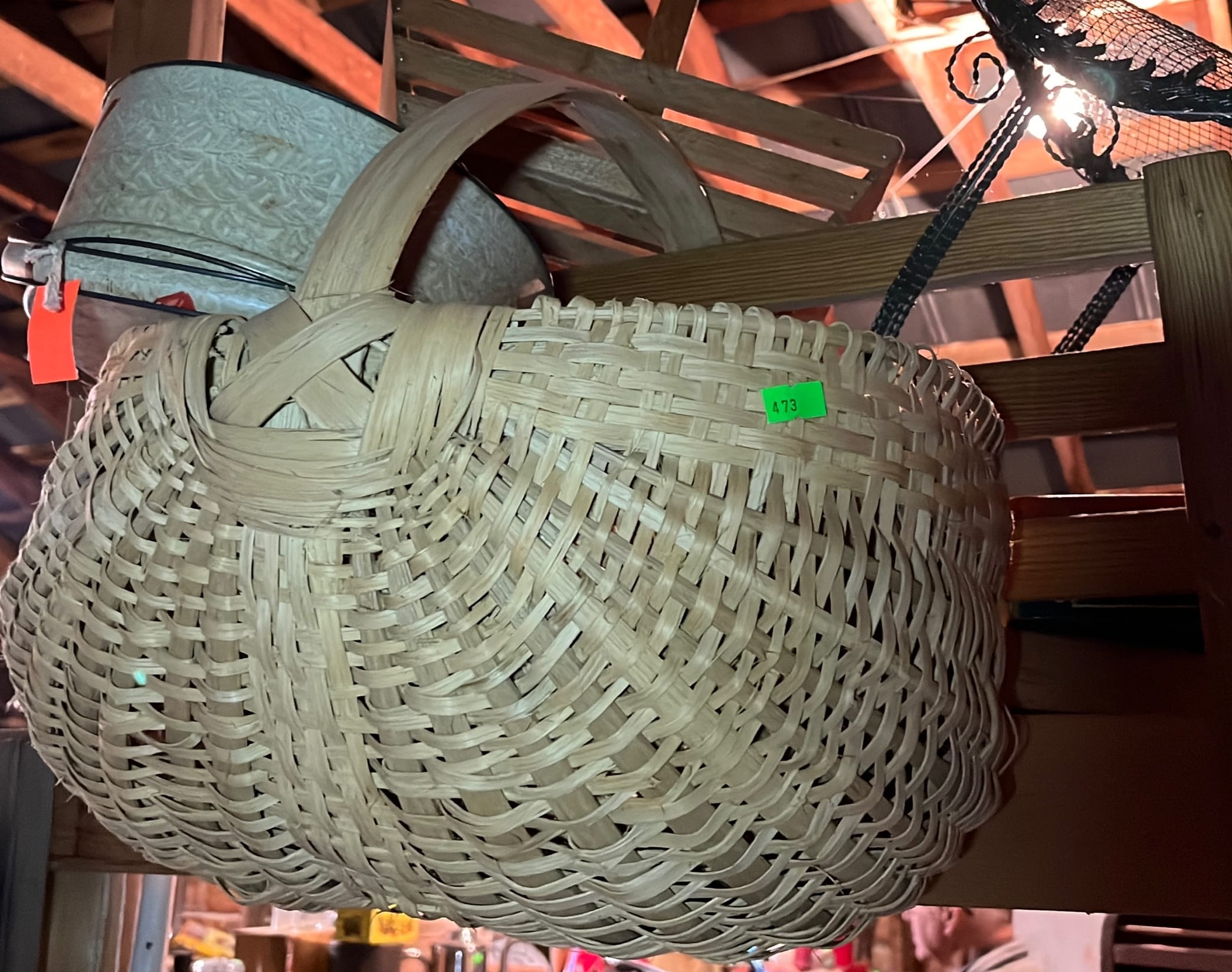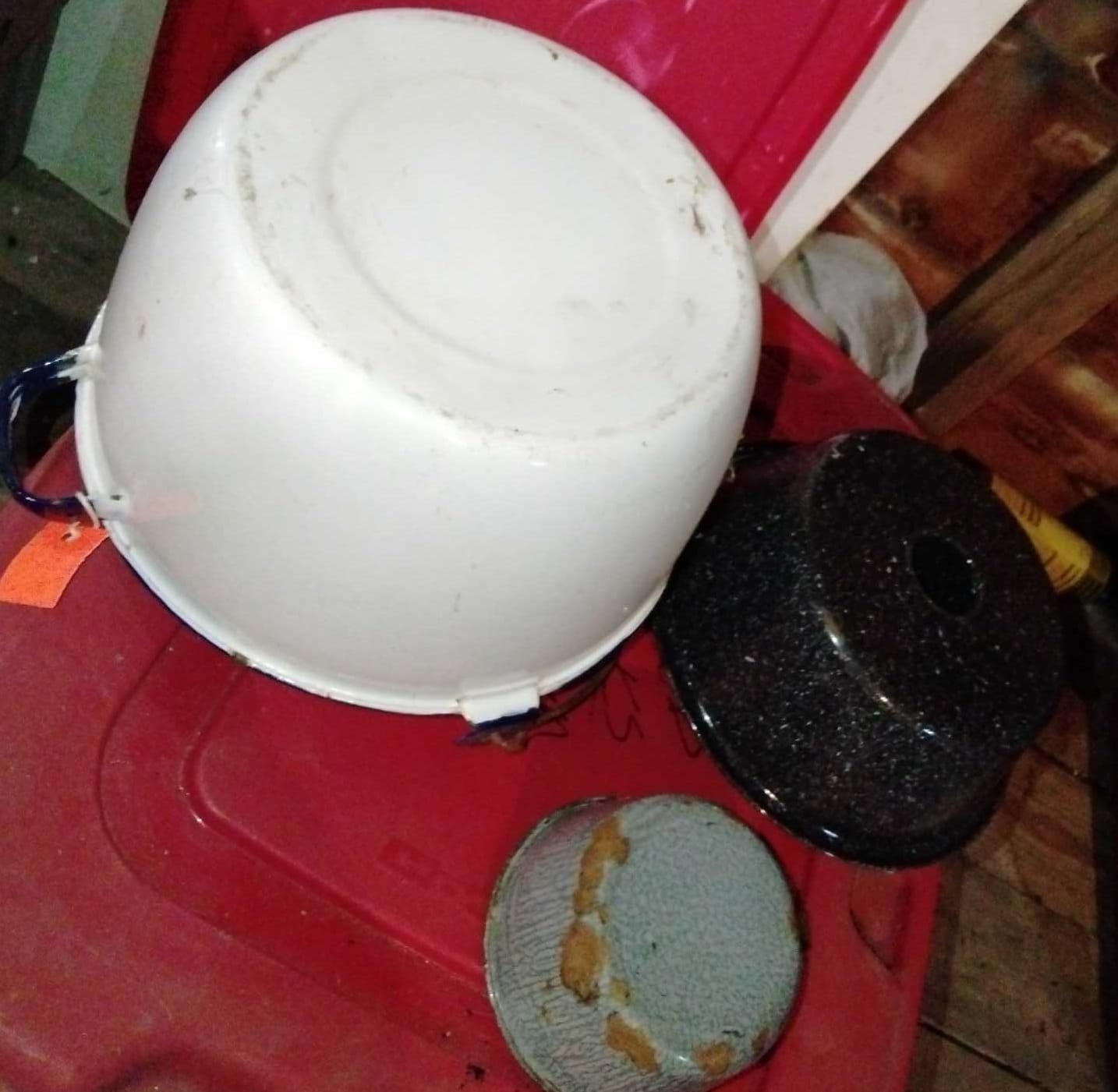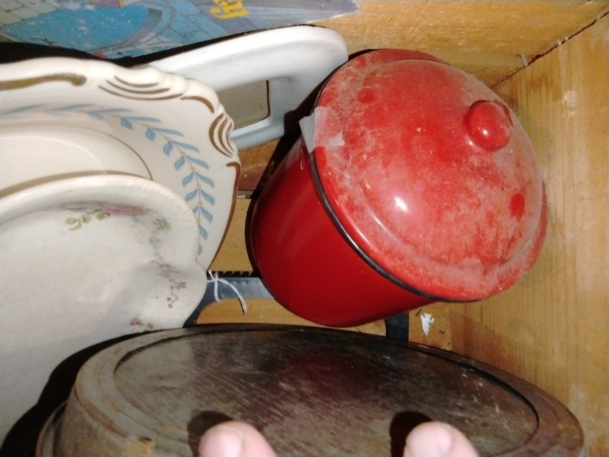 447 Enamel pan, IU Tin, cups, basket, wood basket, miscellaneous
