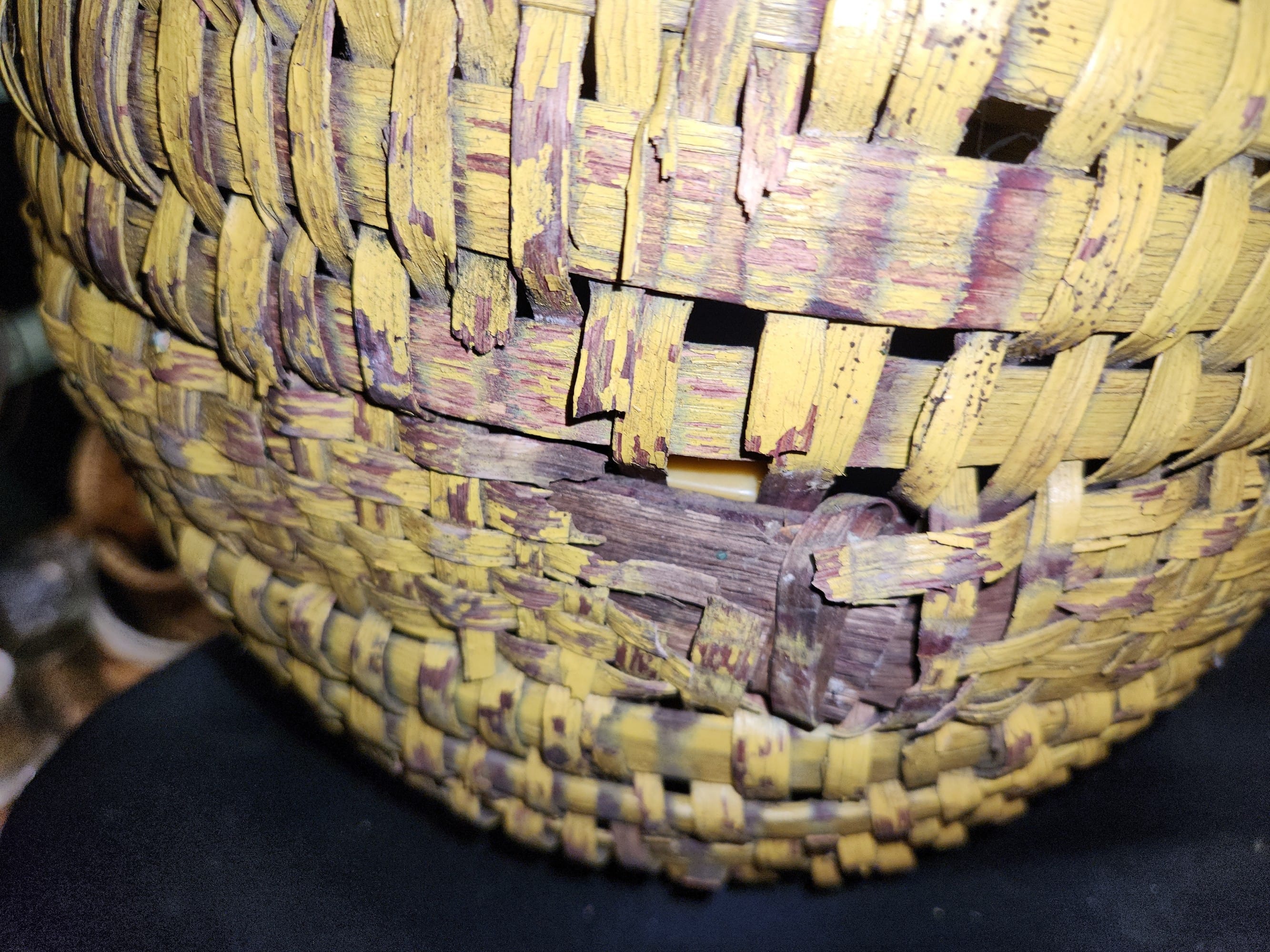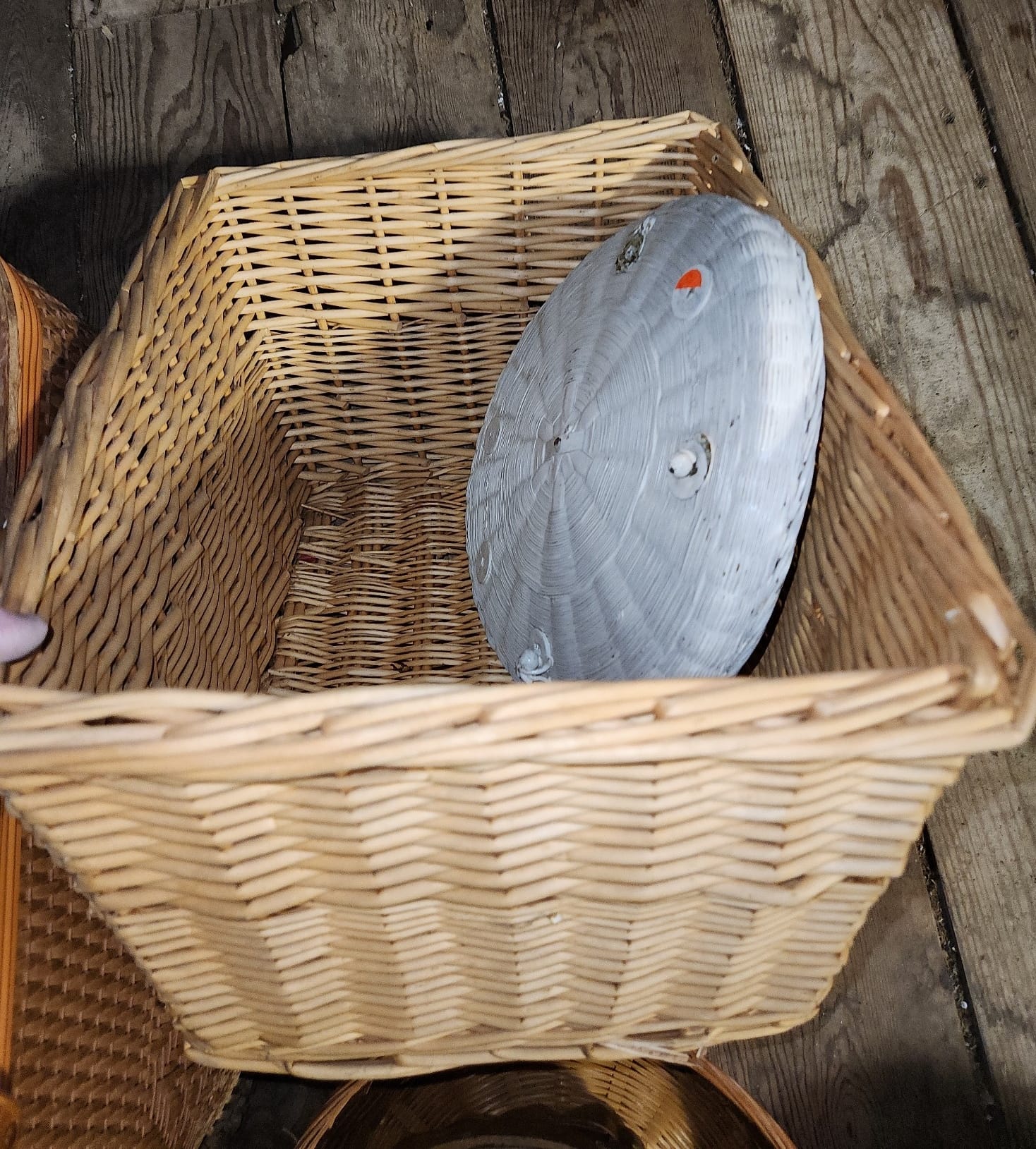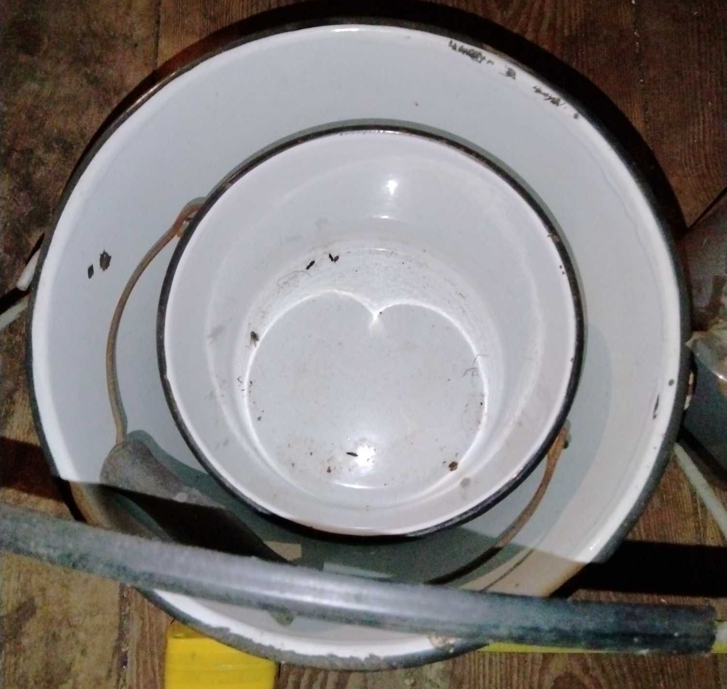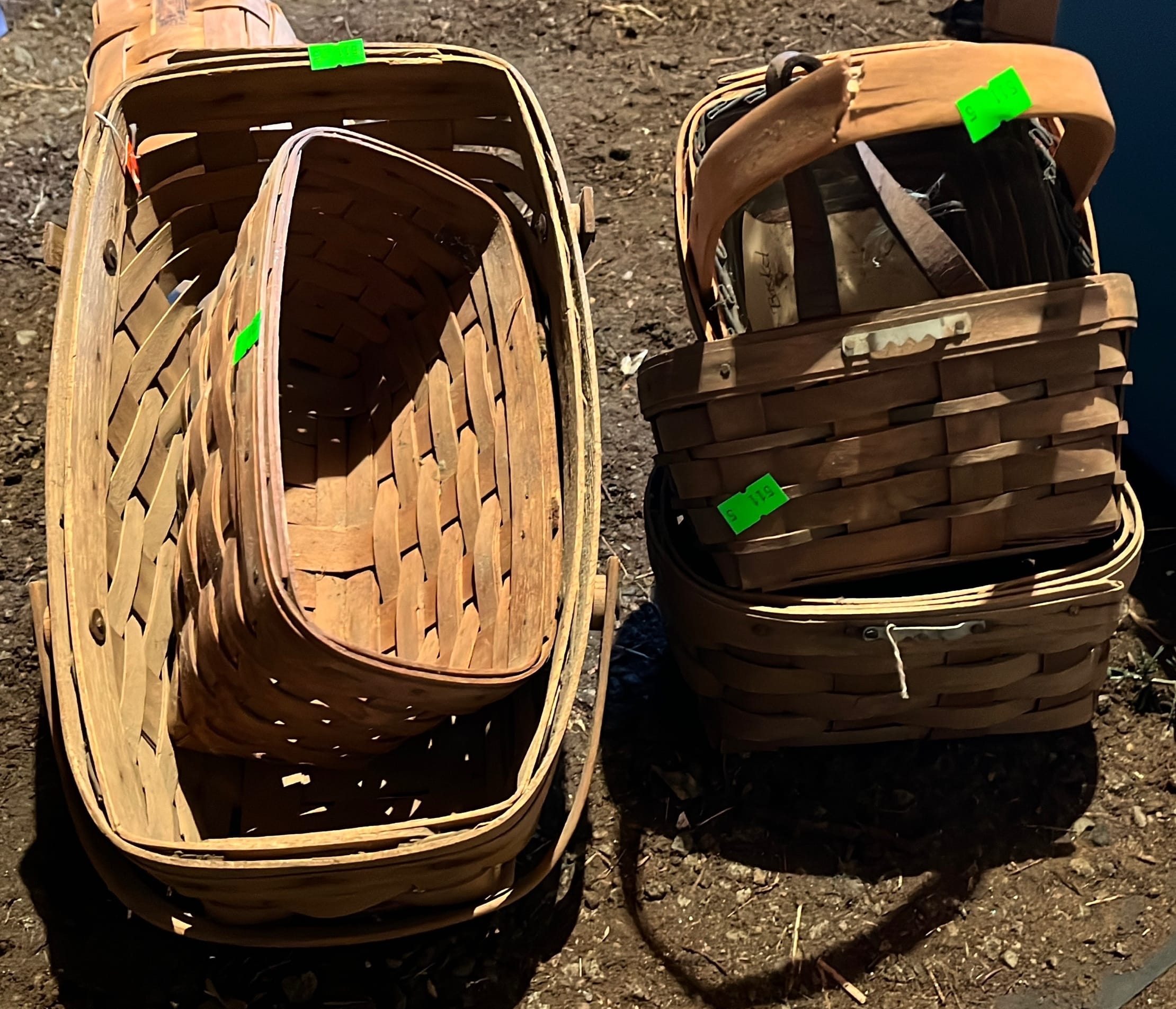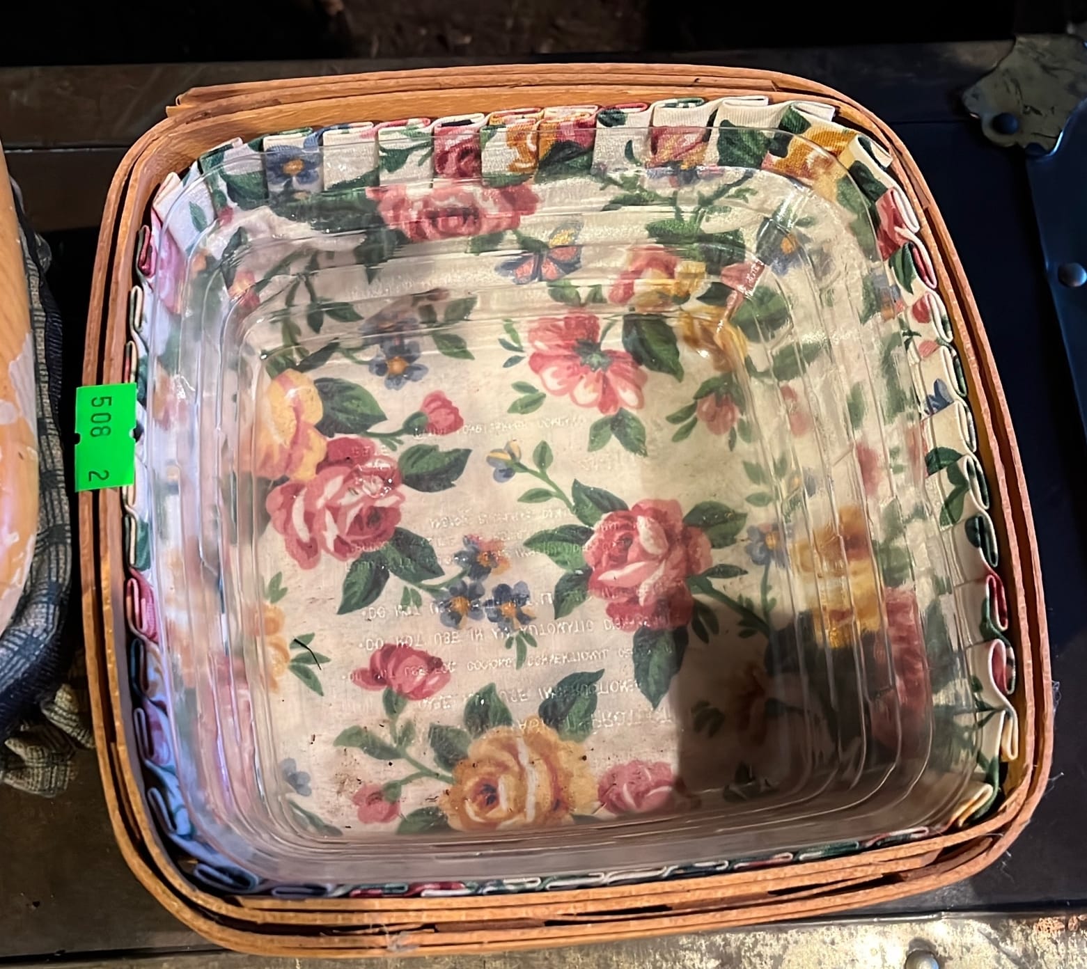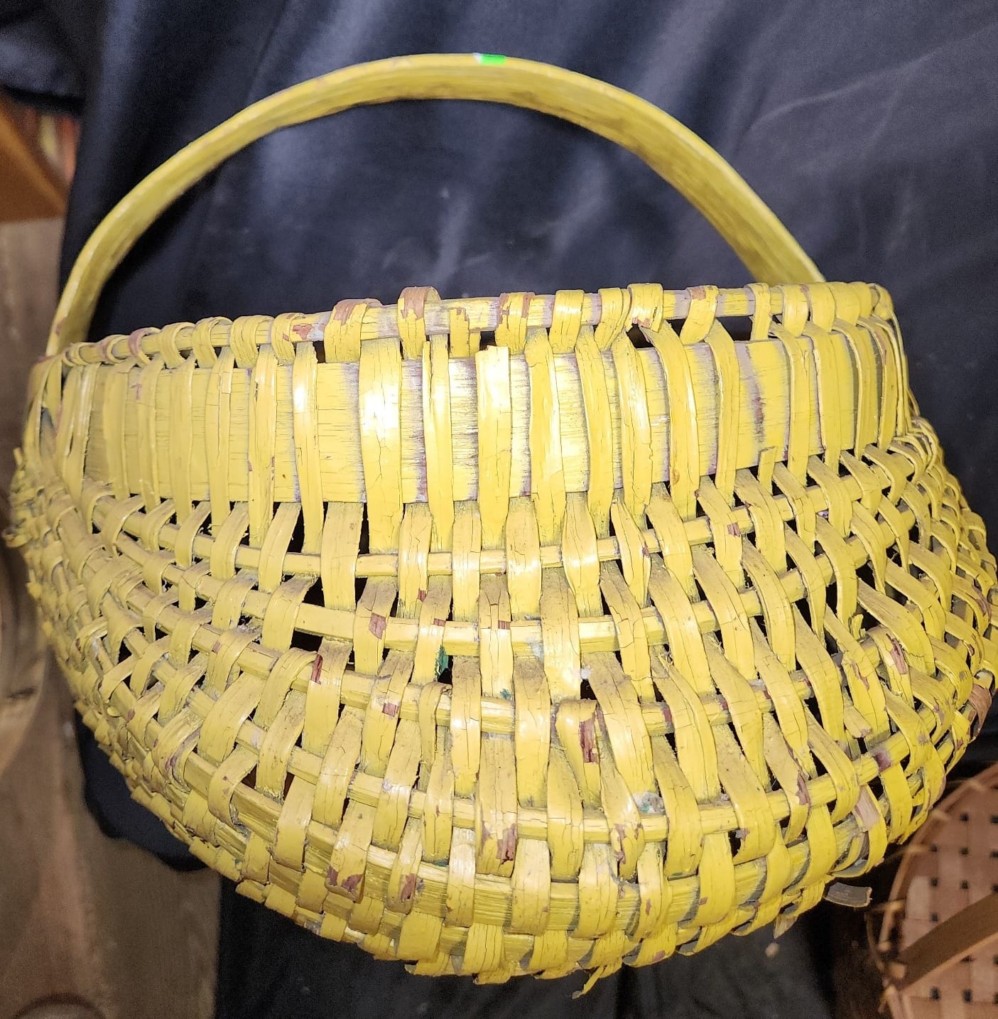 447 Enamel pan, IU Tin, cups, basket, wood basket, miscellaneous