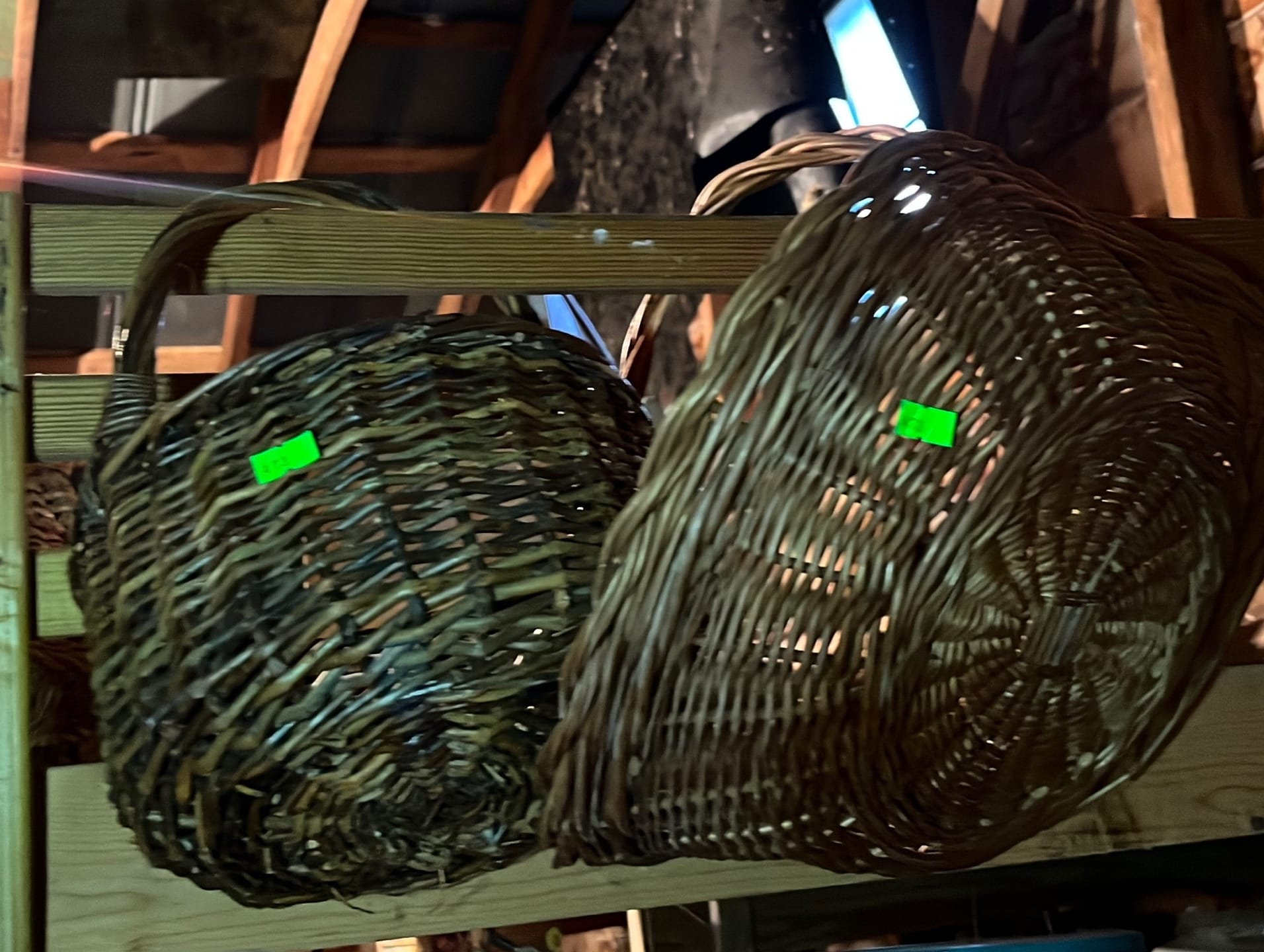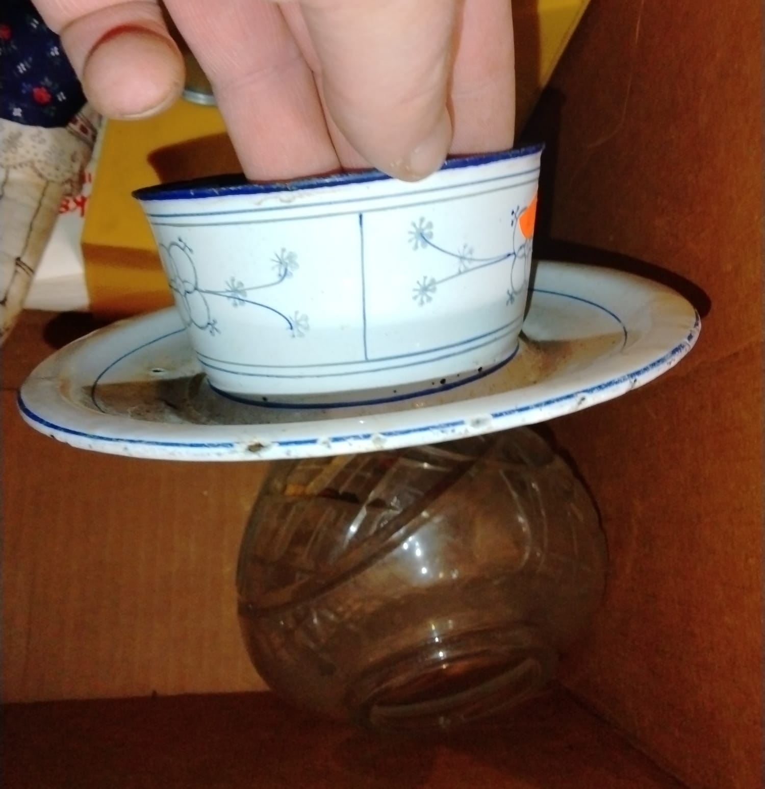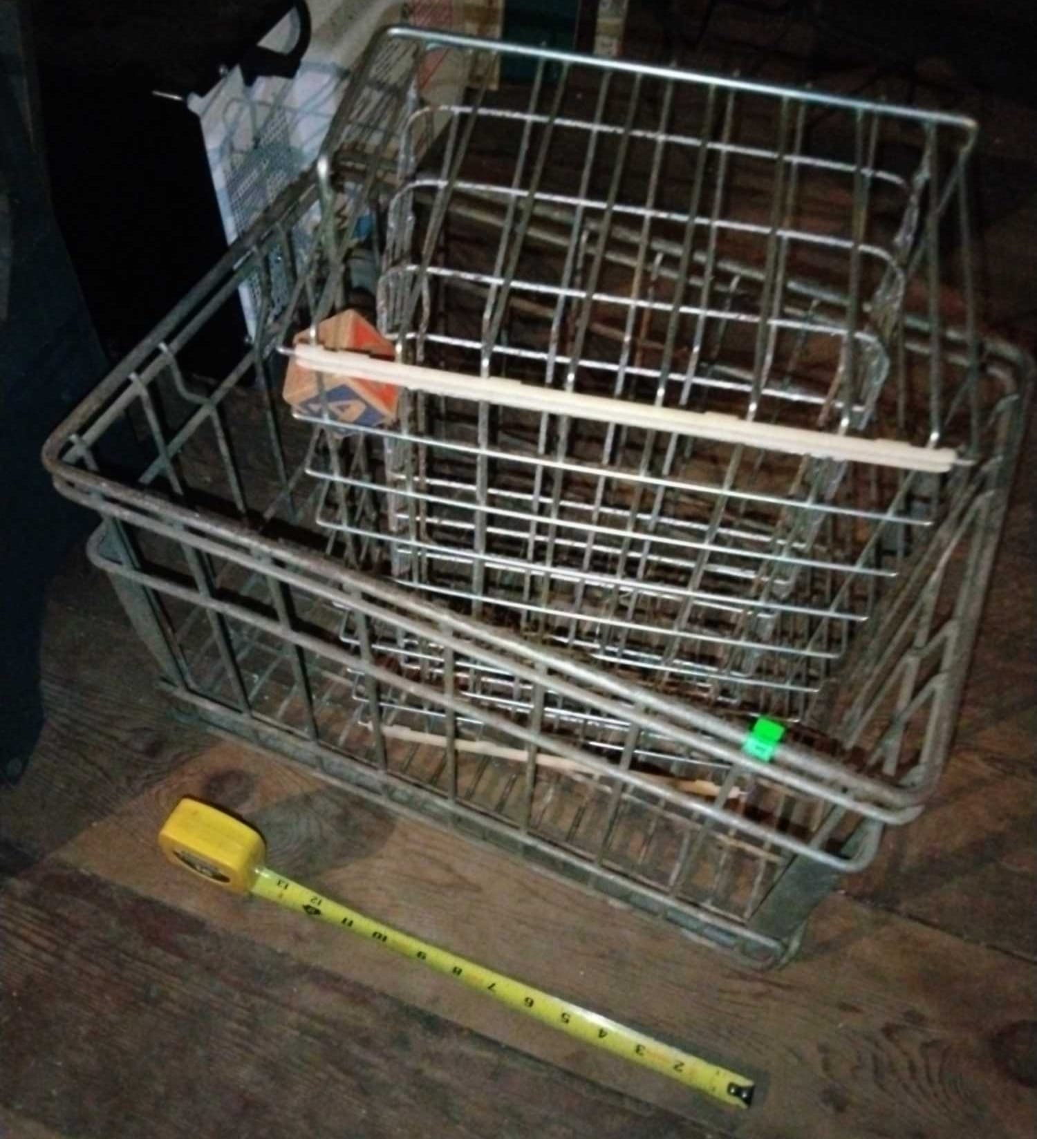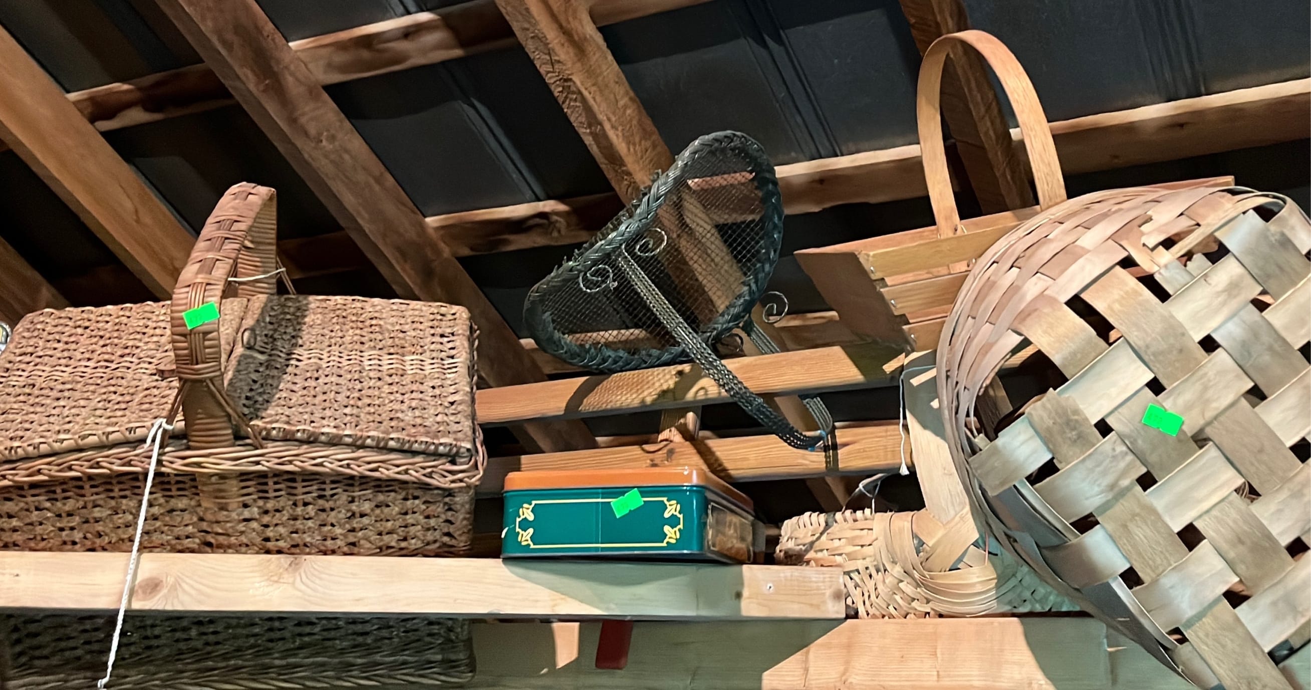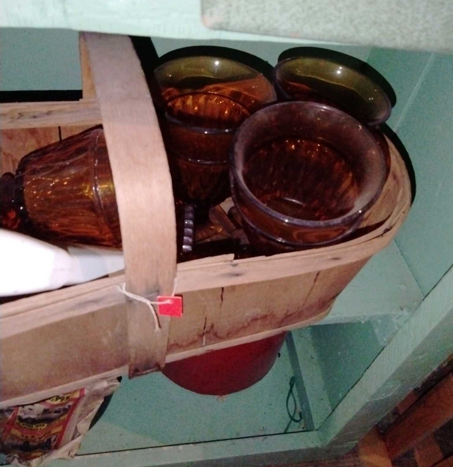 447 Enamel pan, IU Tin, cups, basket, wood basket, miscellaneous