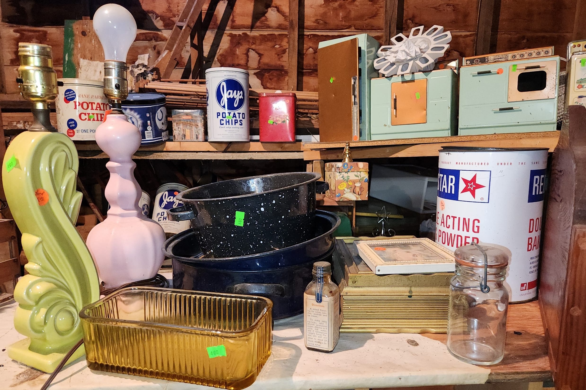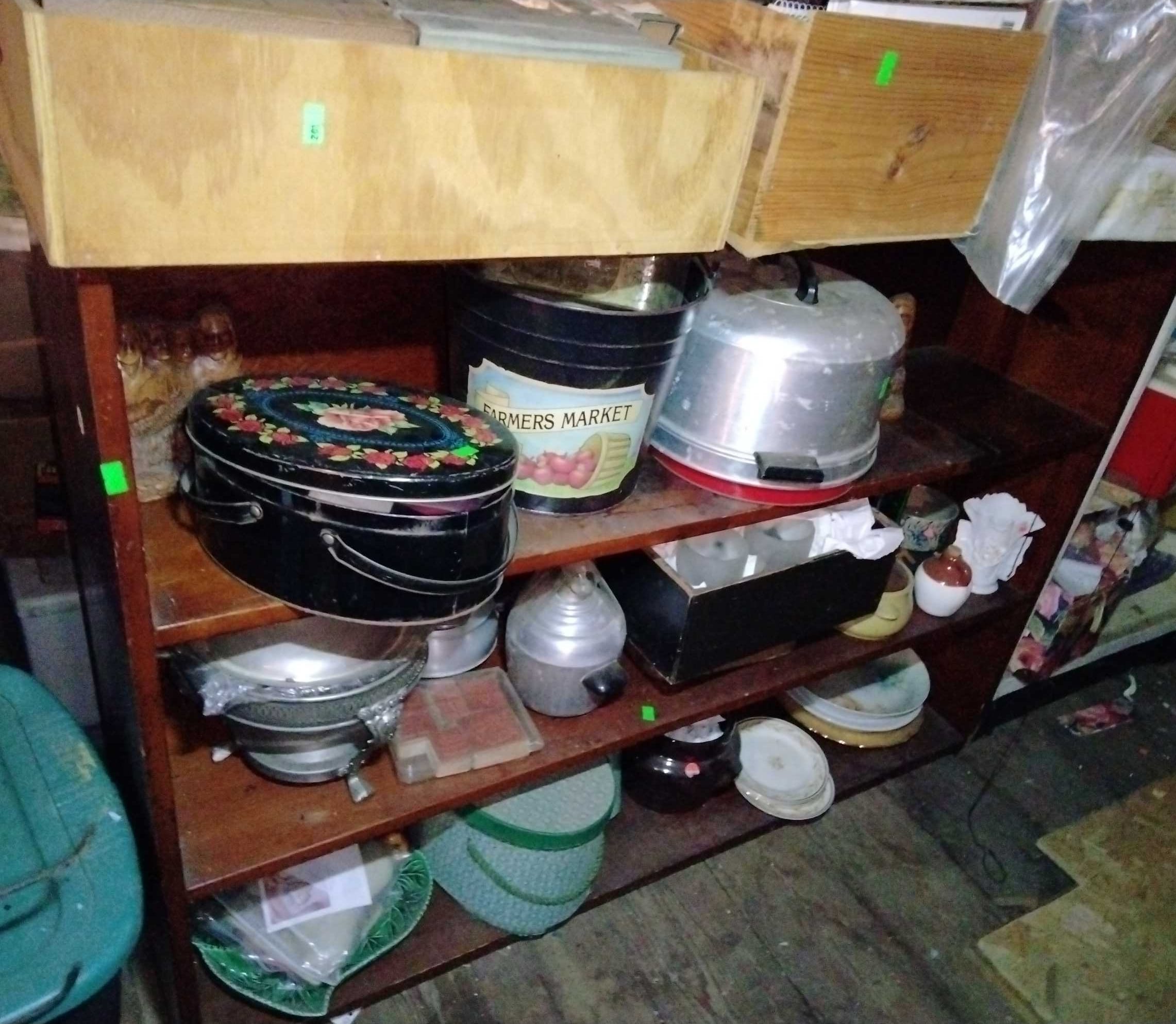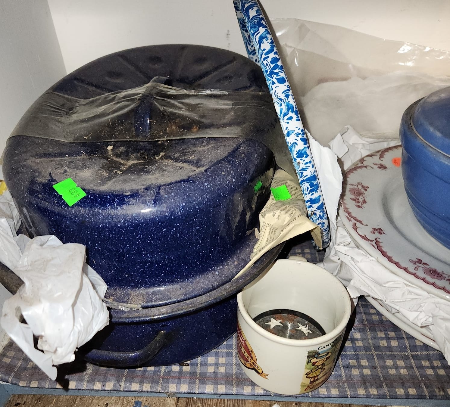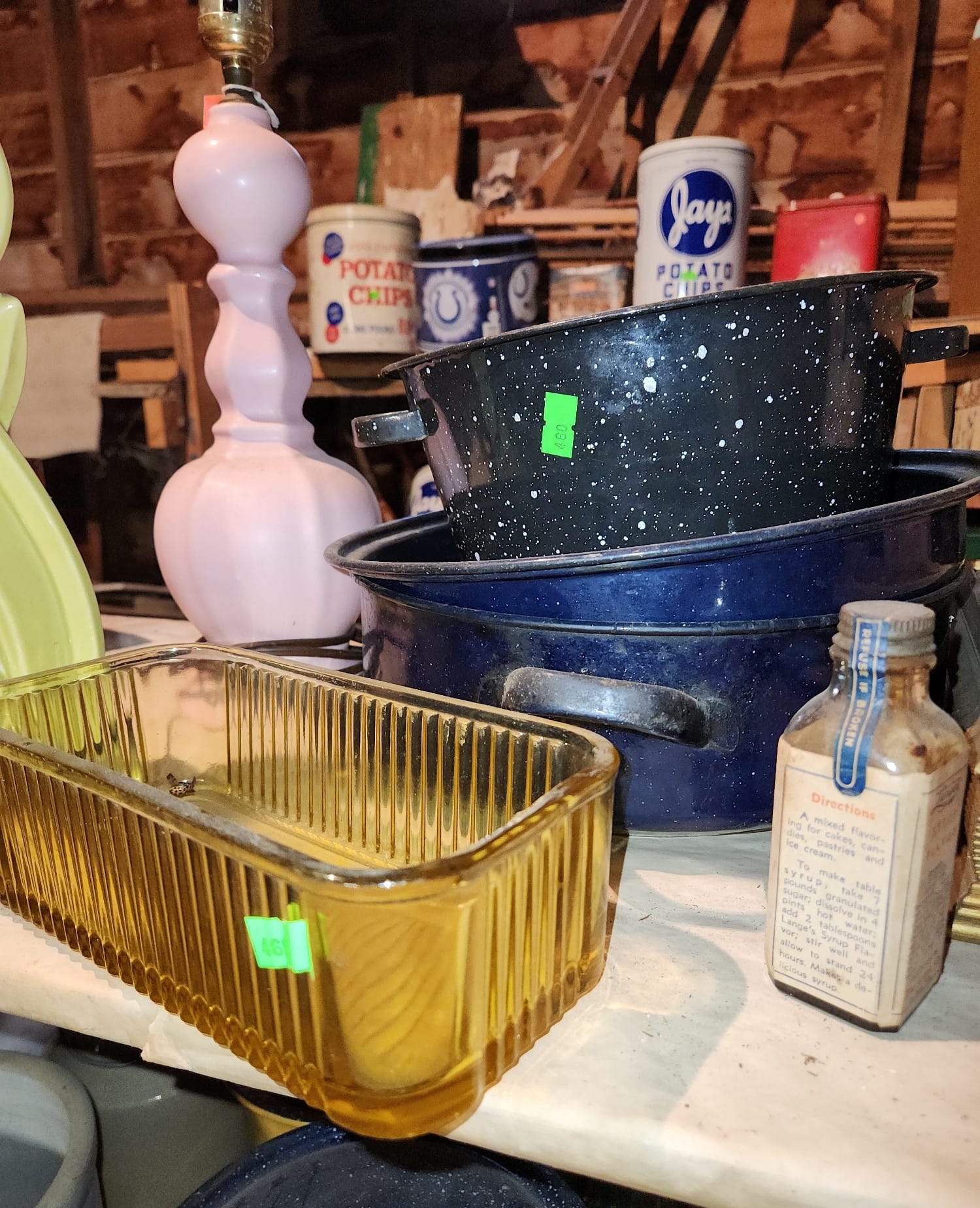460 Enamel pots, refrigerator dish, lamps - no shades, shelf, tin, canning jar, miscellaneous