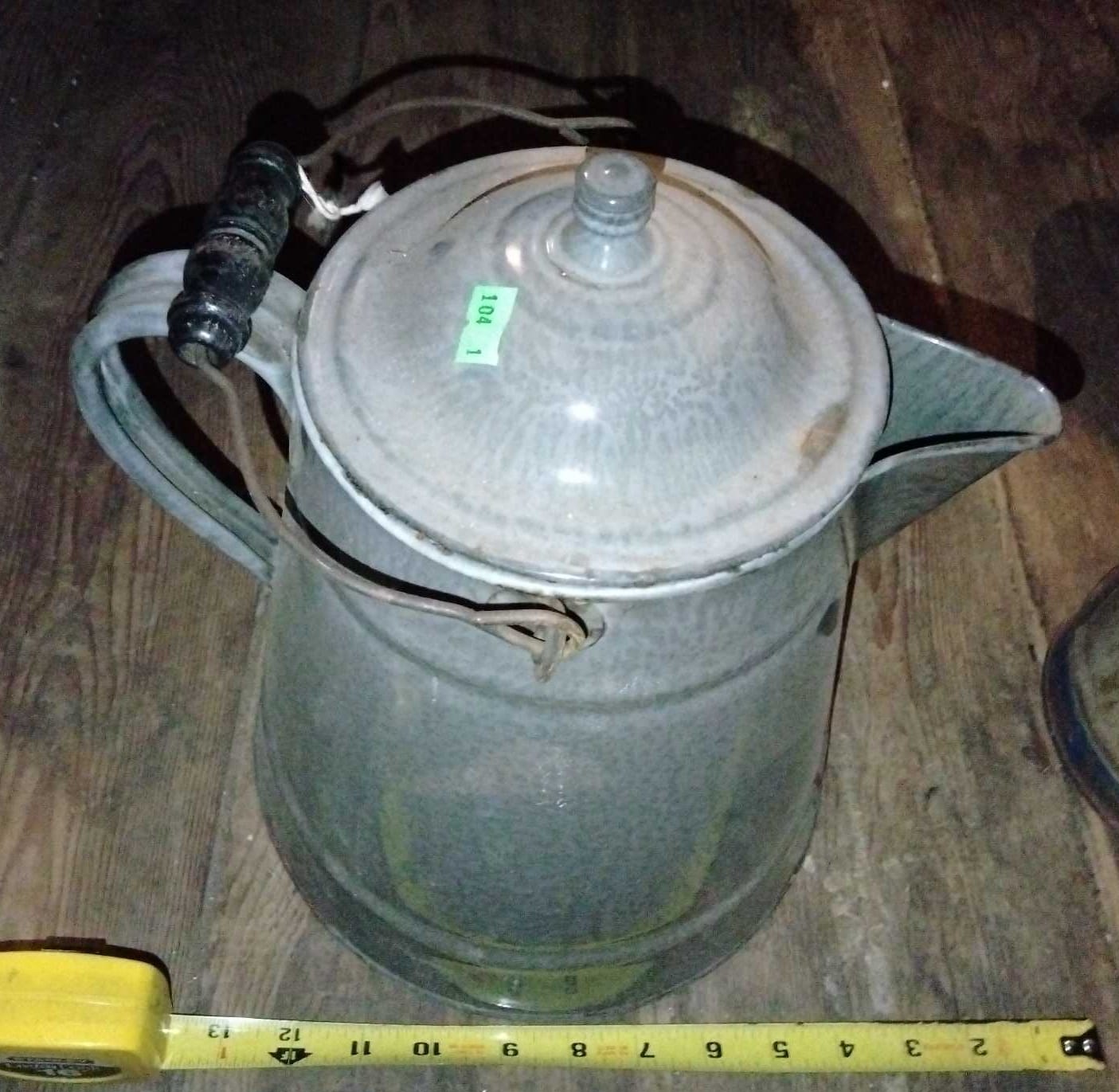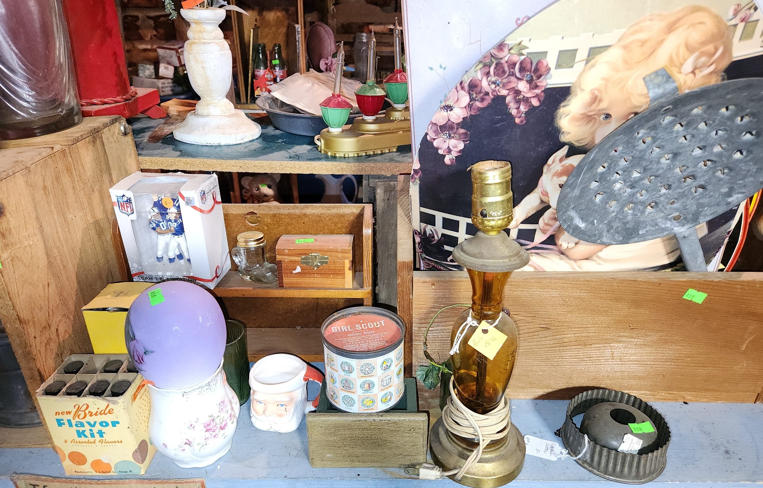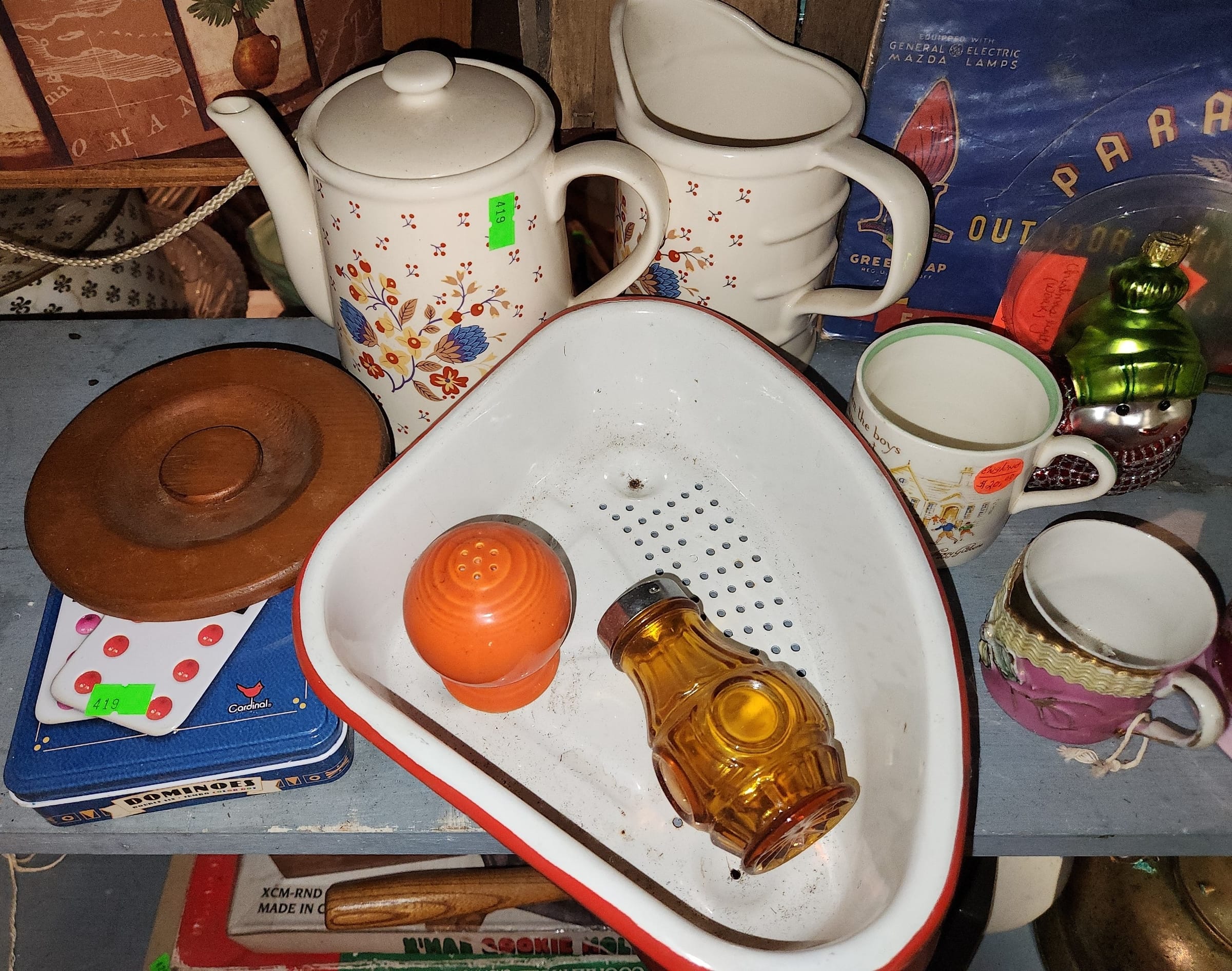 460 Enamel pots, refrigerator dish, lamps - no shades, shelf, tin, canning jar, miscellaneous