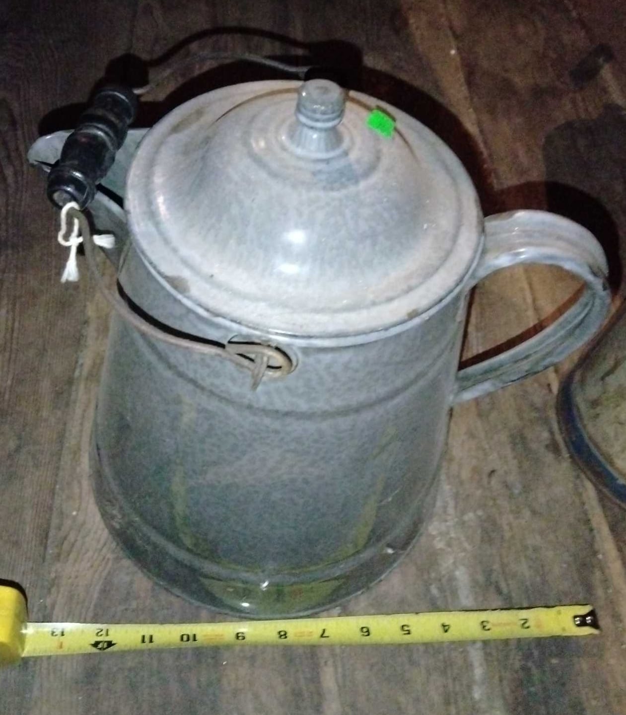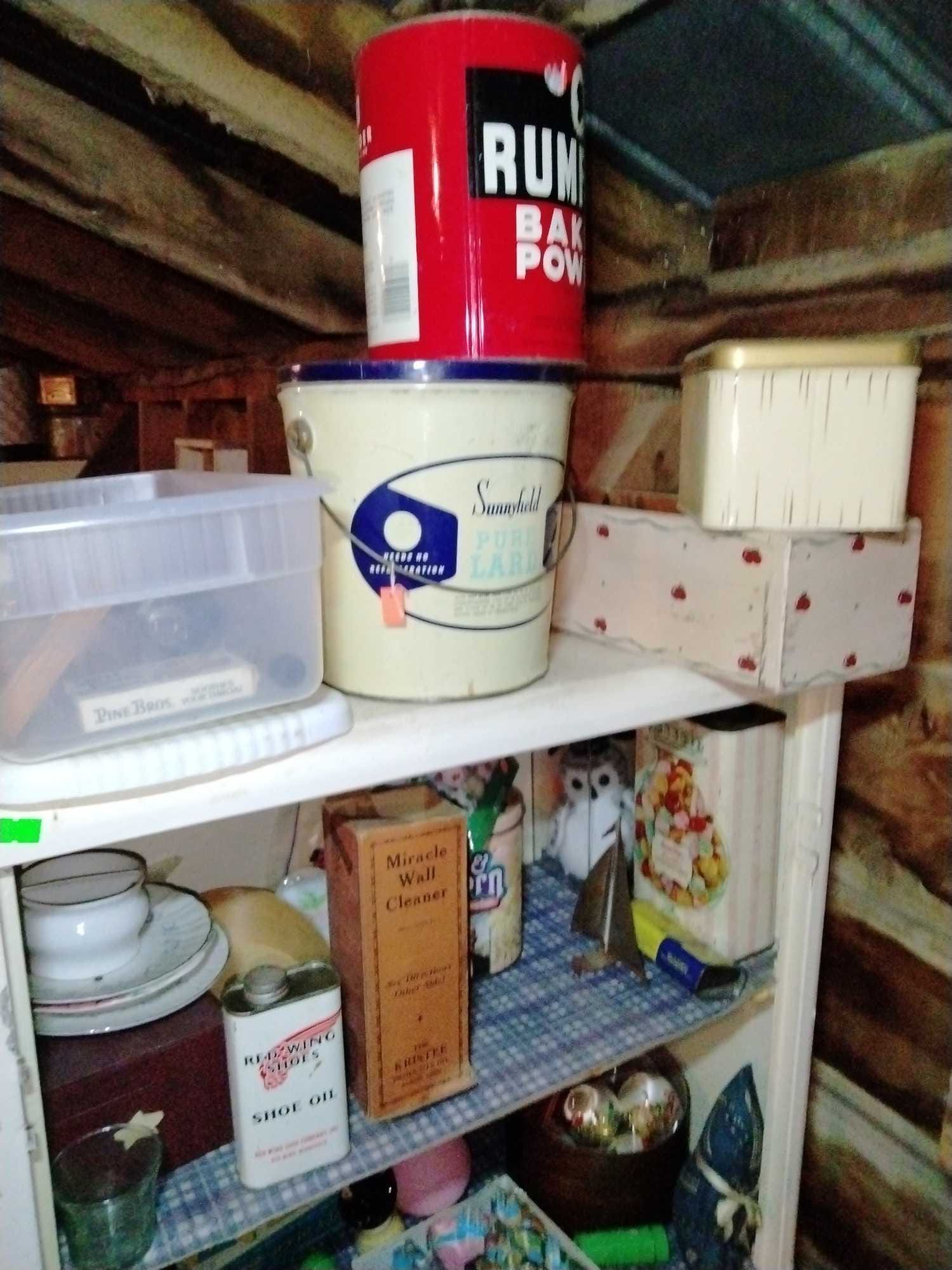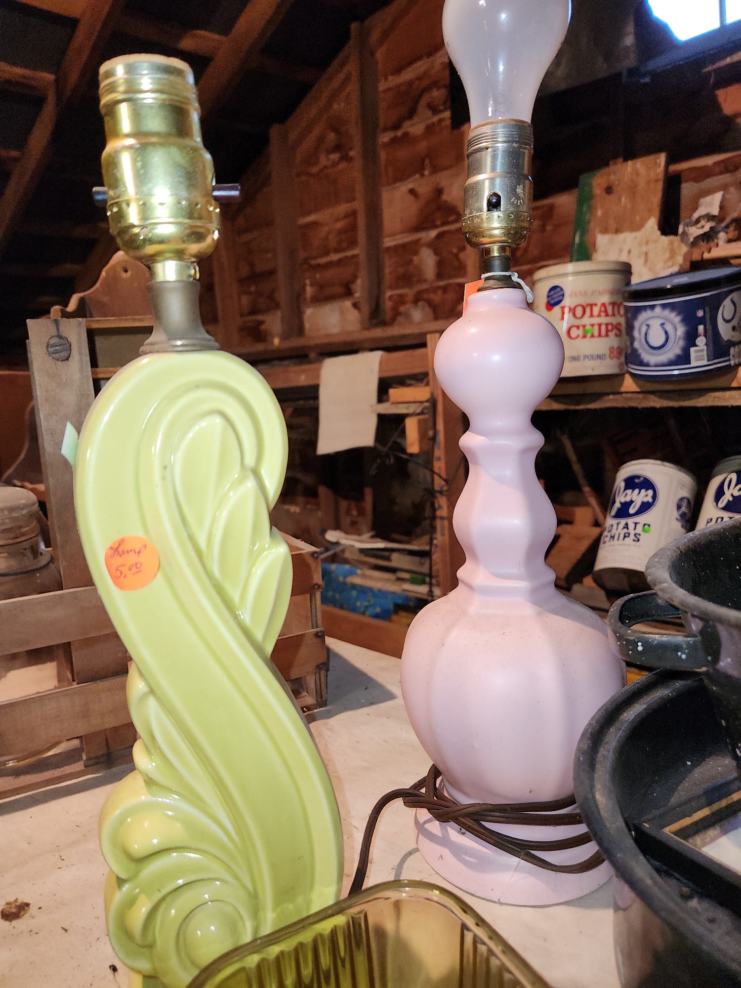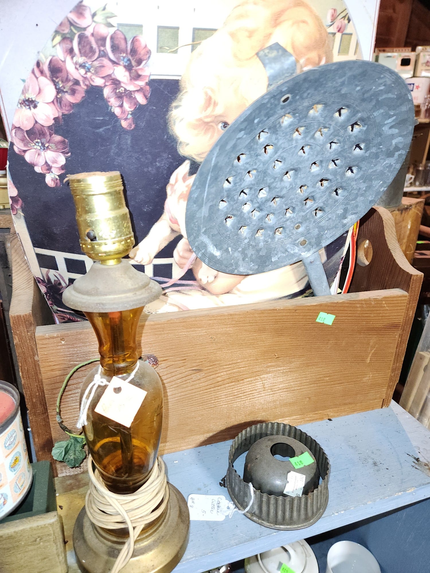 460 Enamel pots, refrigerator dish, lamps - no shades, shelf, tin, canning jar, miscellaneous