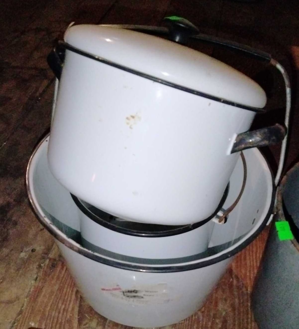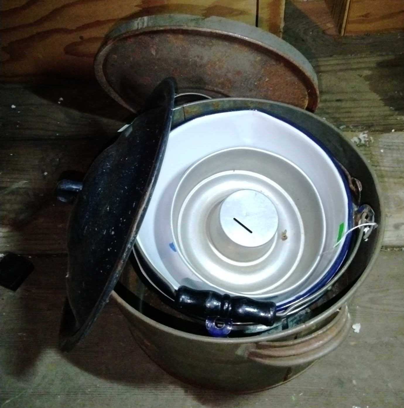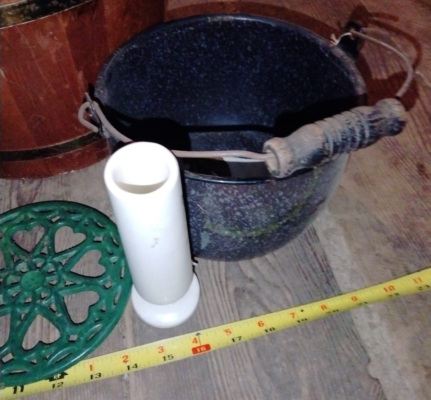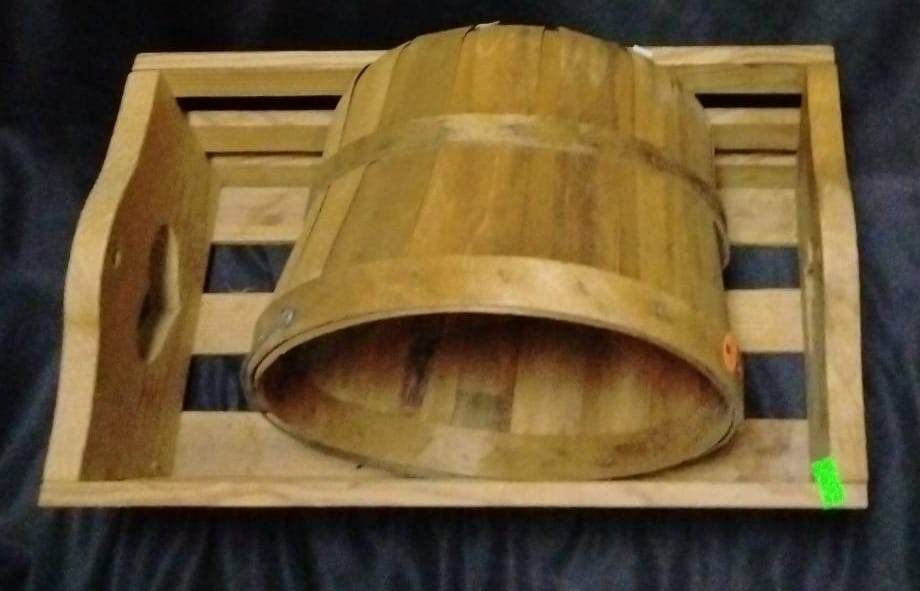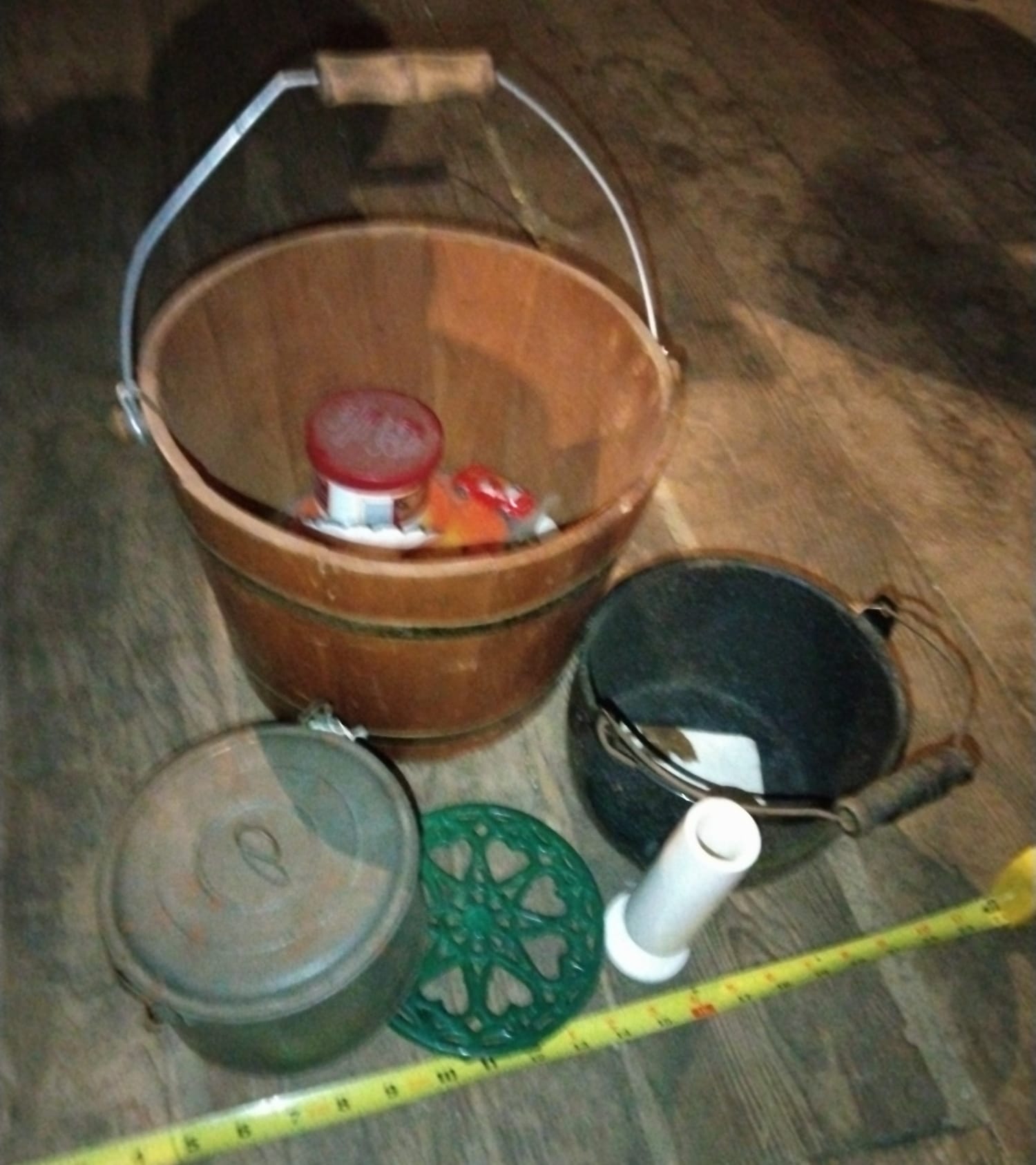 256 Wood bucket, metal lunch pail, trivet, granite pot, miscellaneous