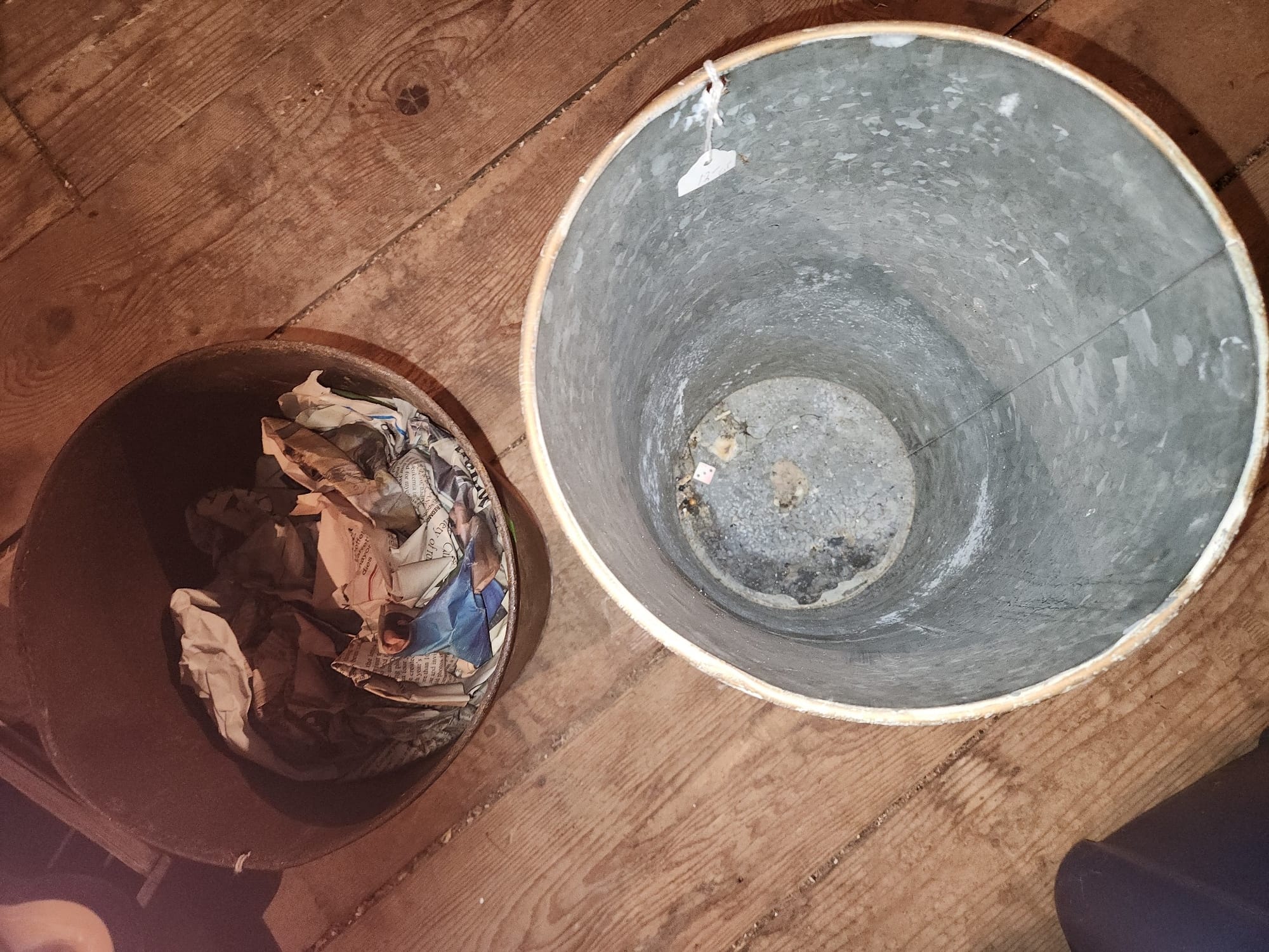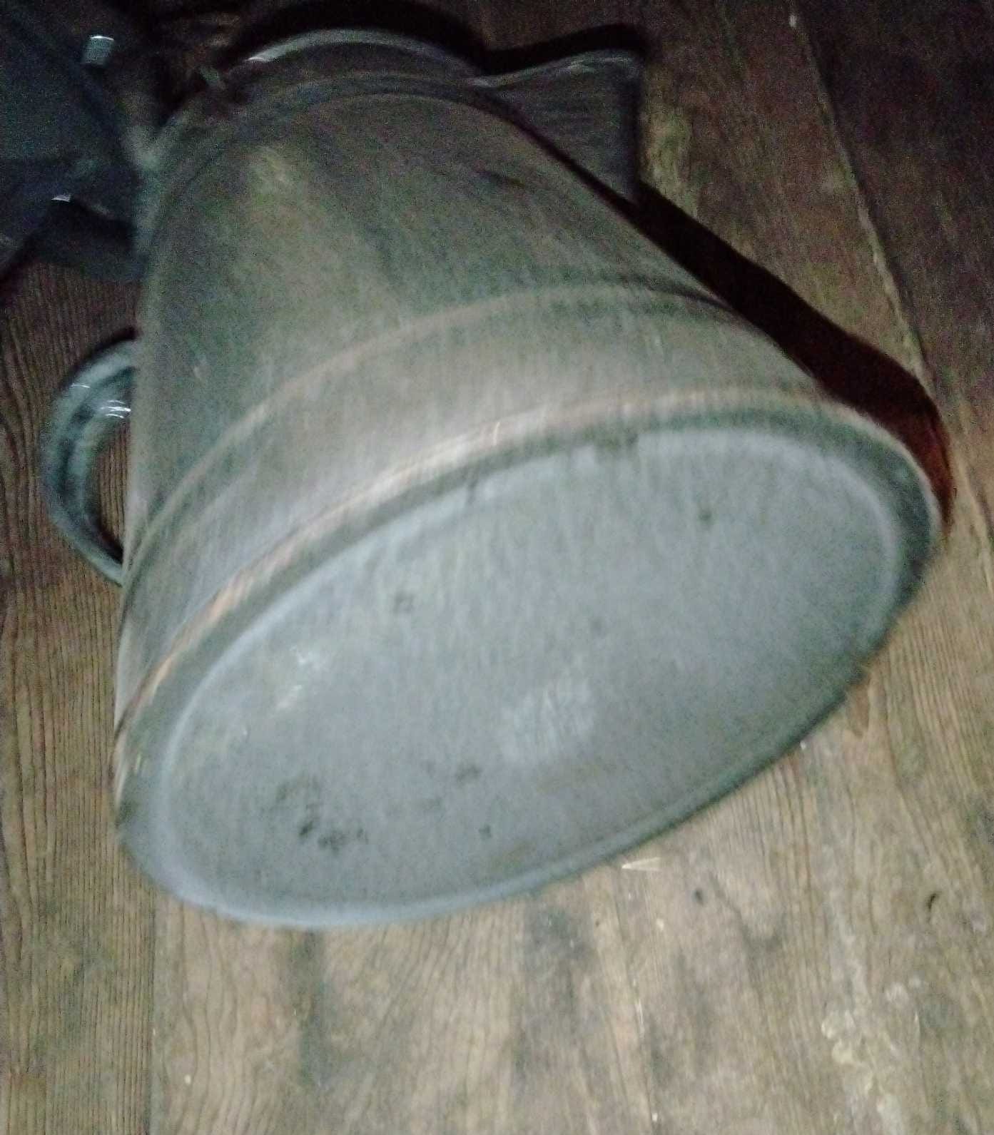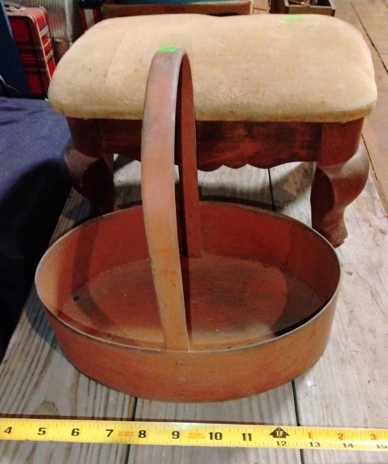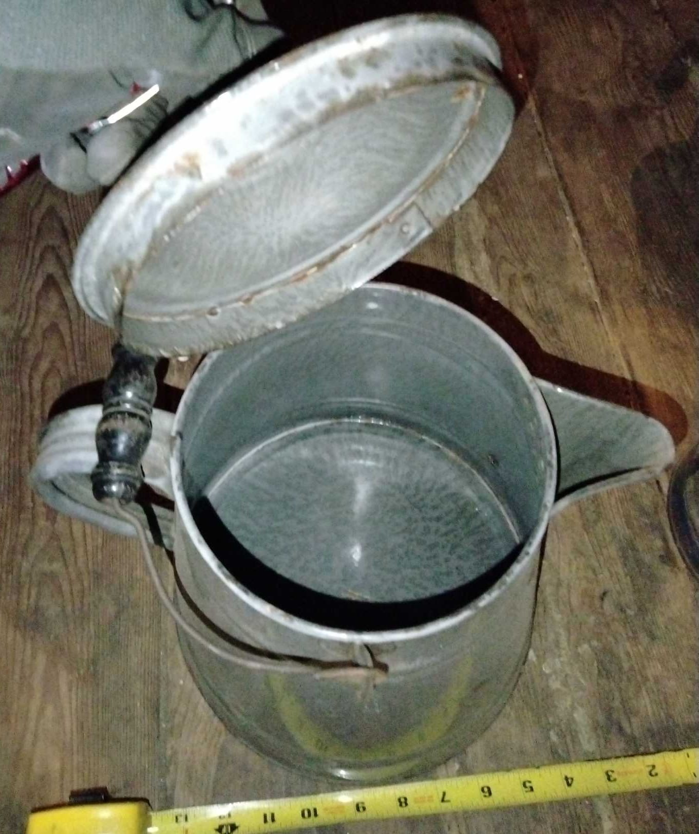 256 Wood bucket, metal lunch pail, trivet, granite pot, miscellaneous