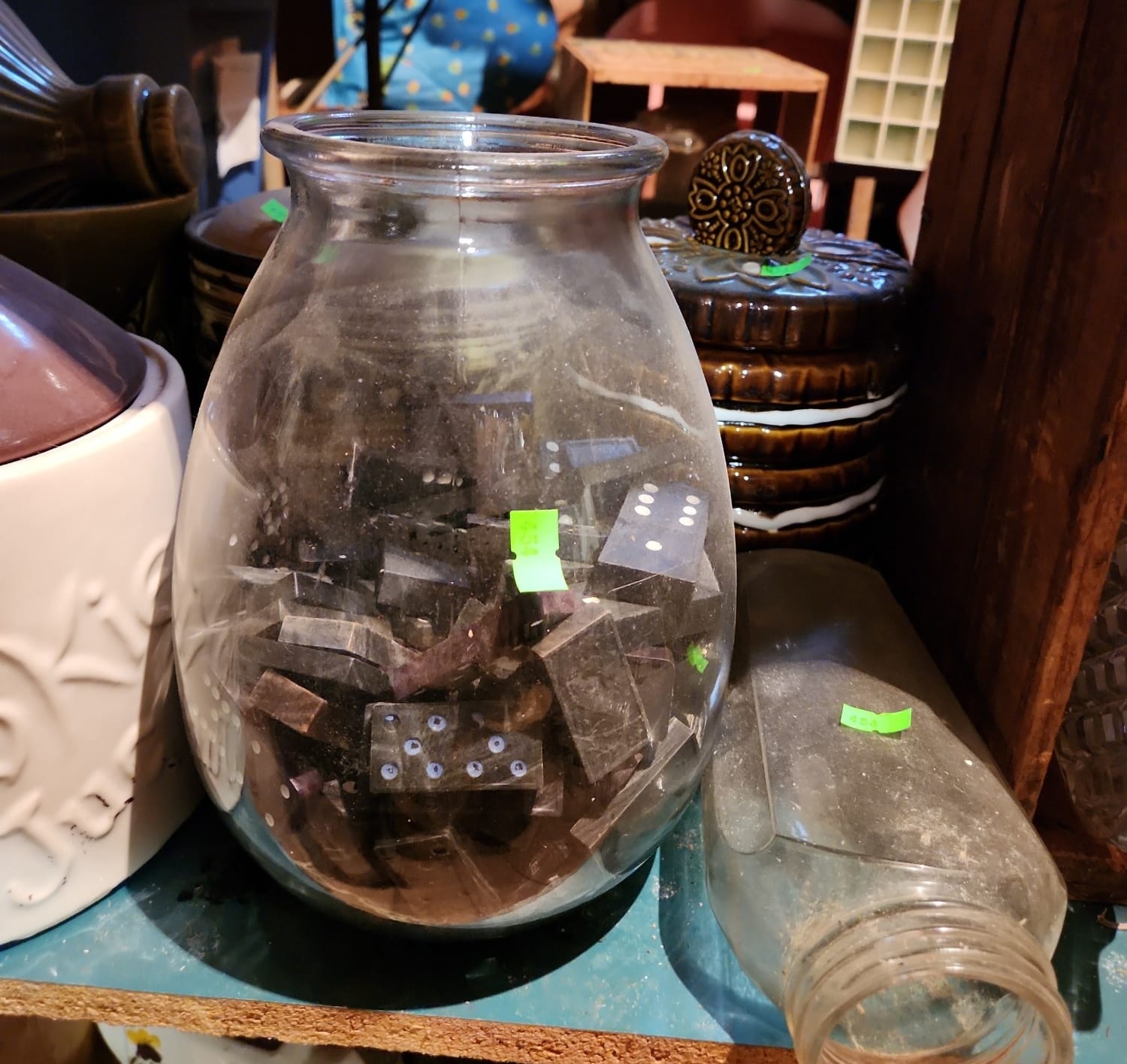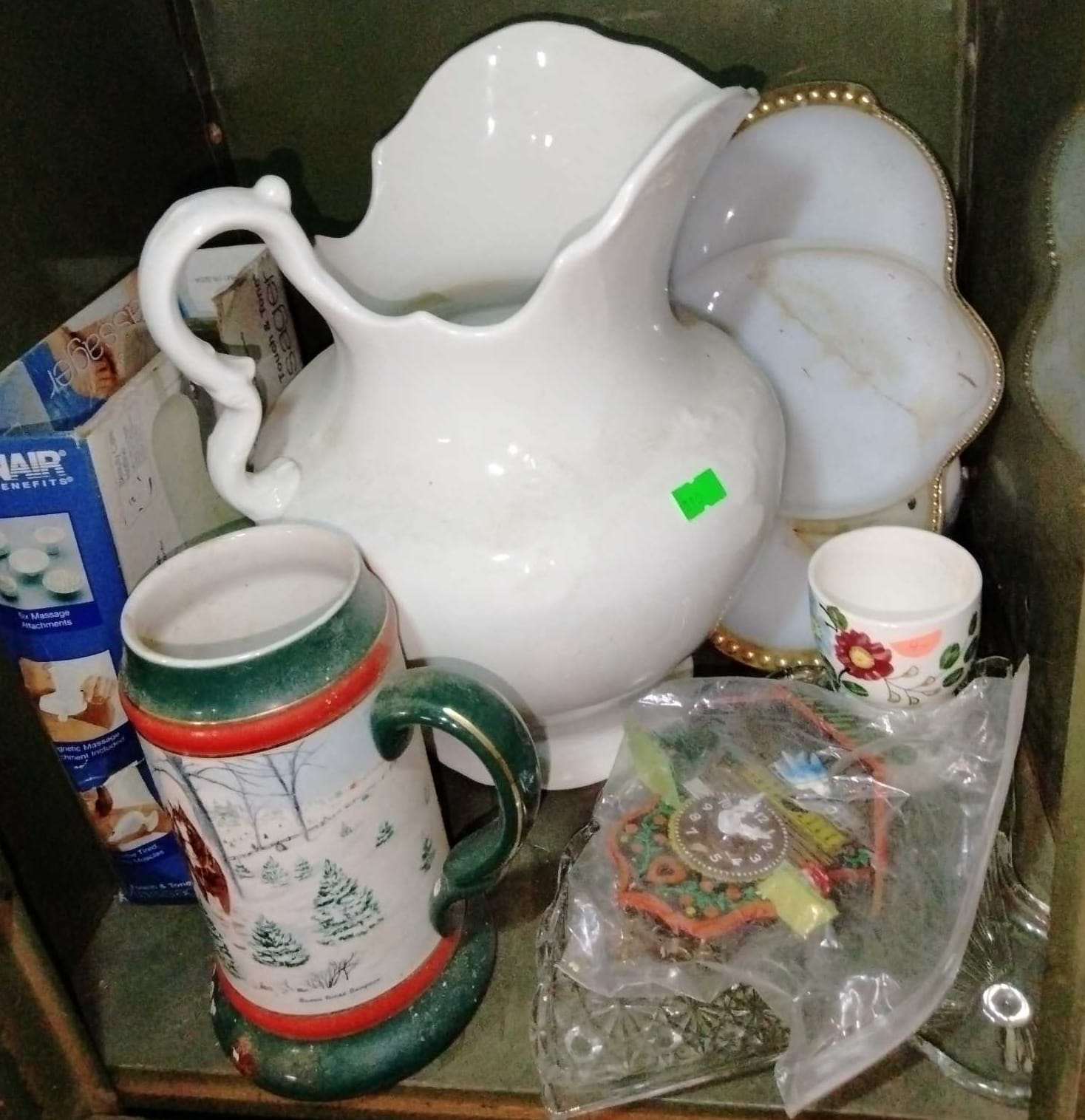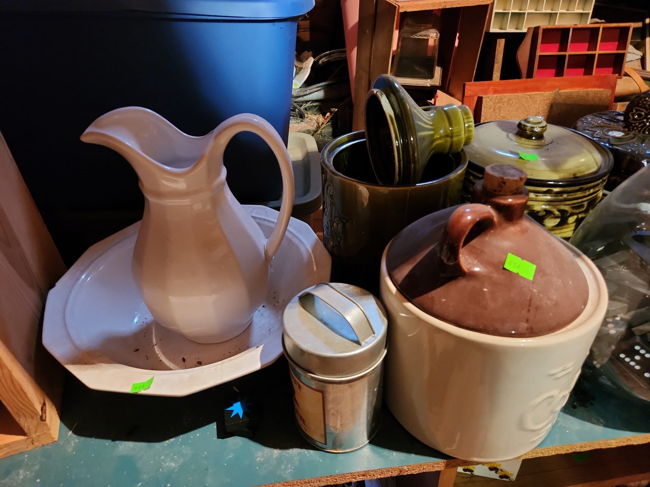 454 Pitcher and bowl, cookie jars, dominoes, bear cookie jar - repaired