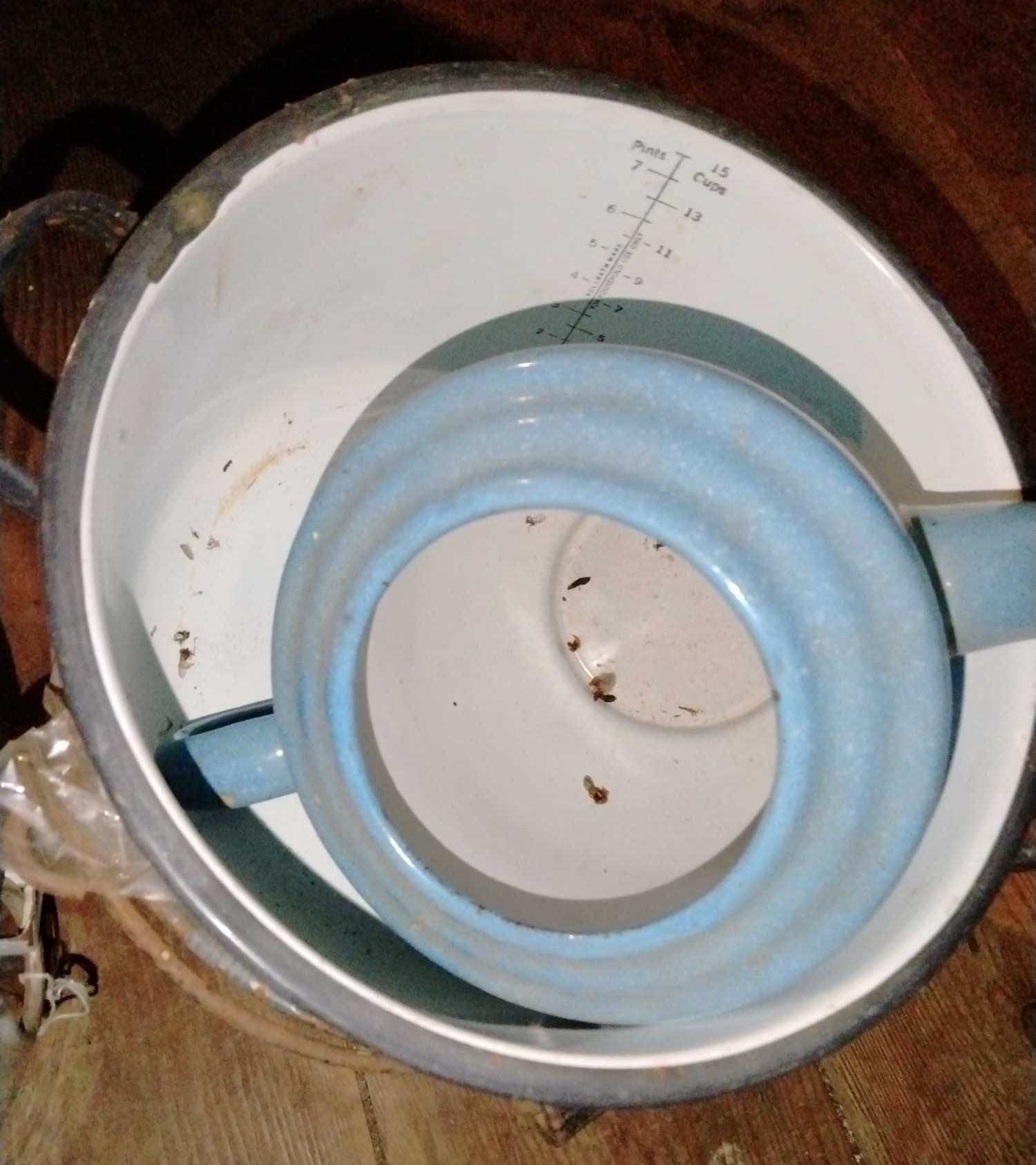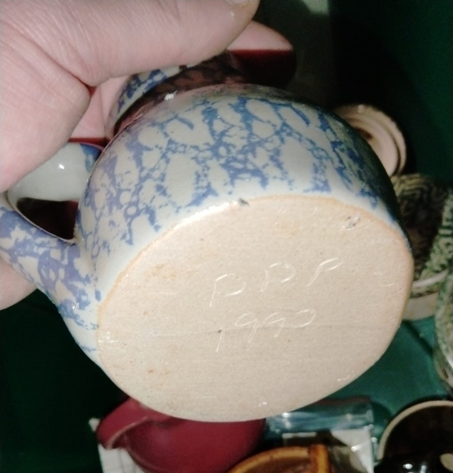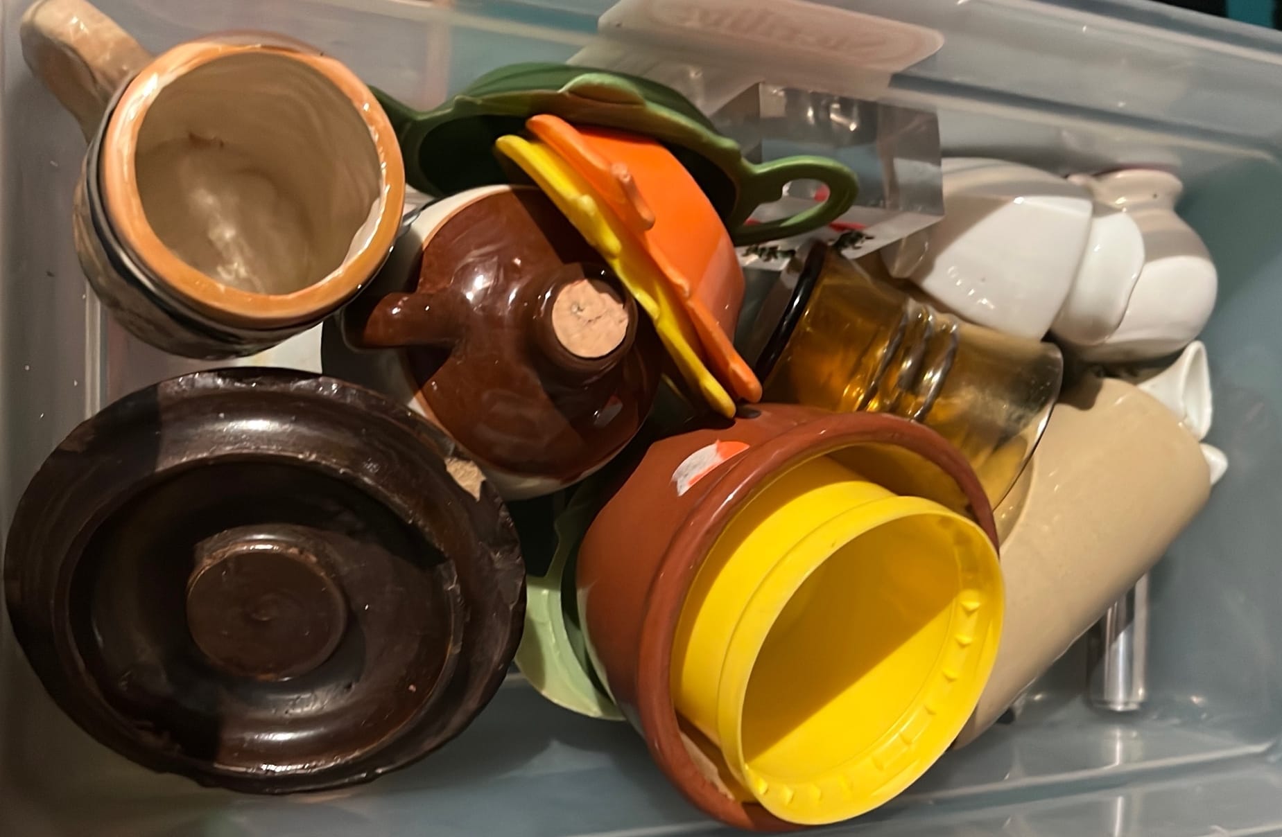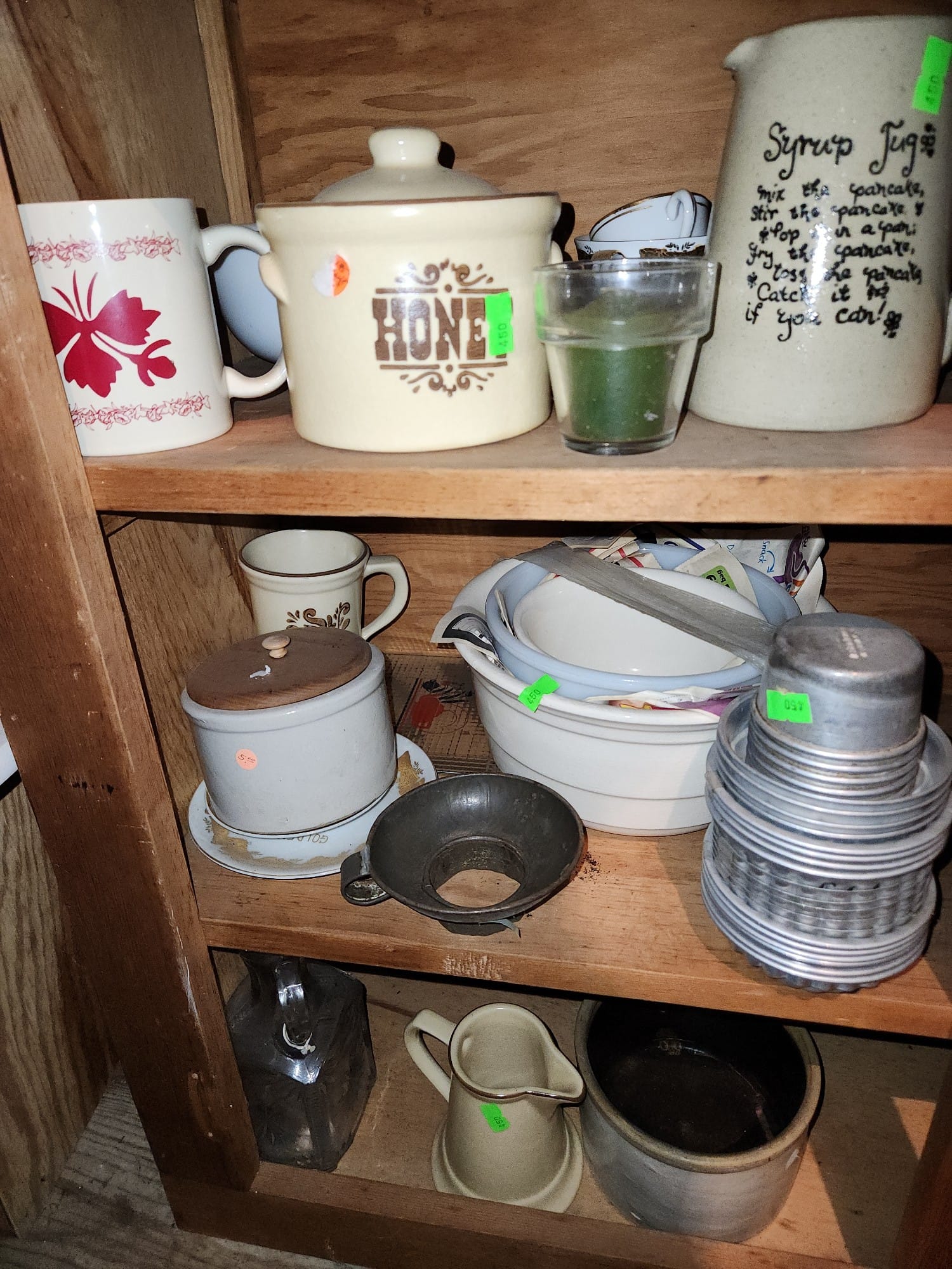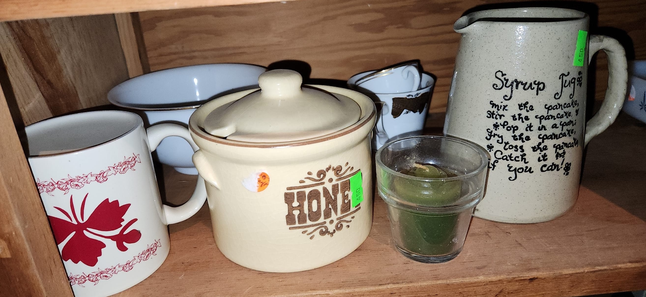 450 Pfaltzgraff honey pot, creamer, mug, Avon bowl, bottle, syrup jug, porcelain cups, mixing bowls, aluminum cups, crock, miscellaneous