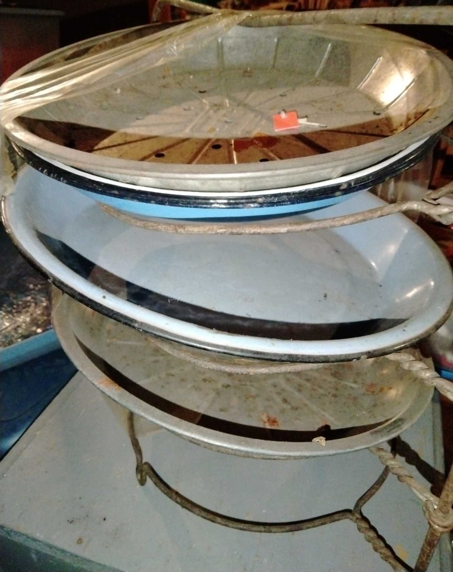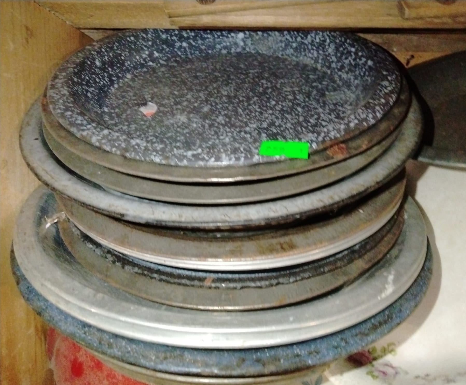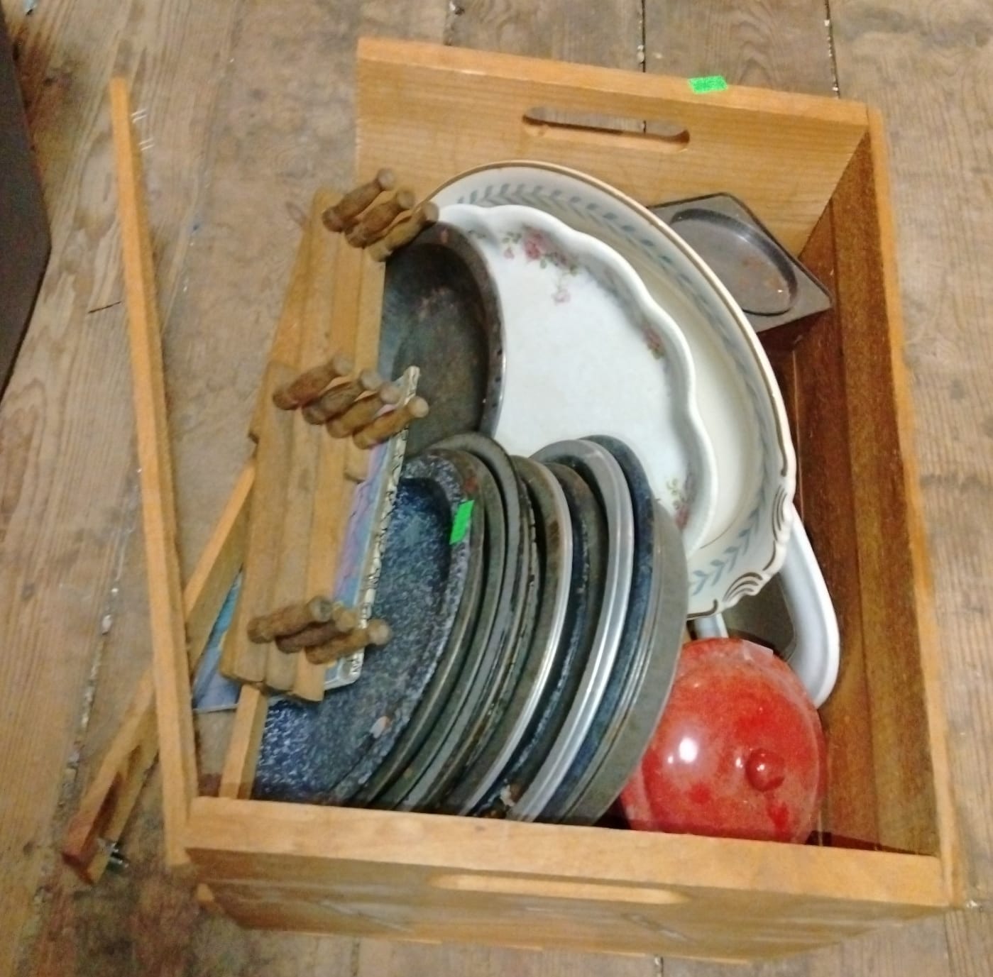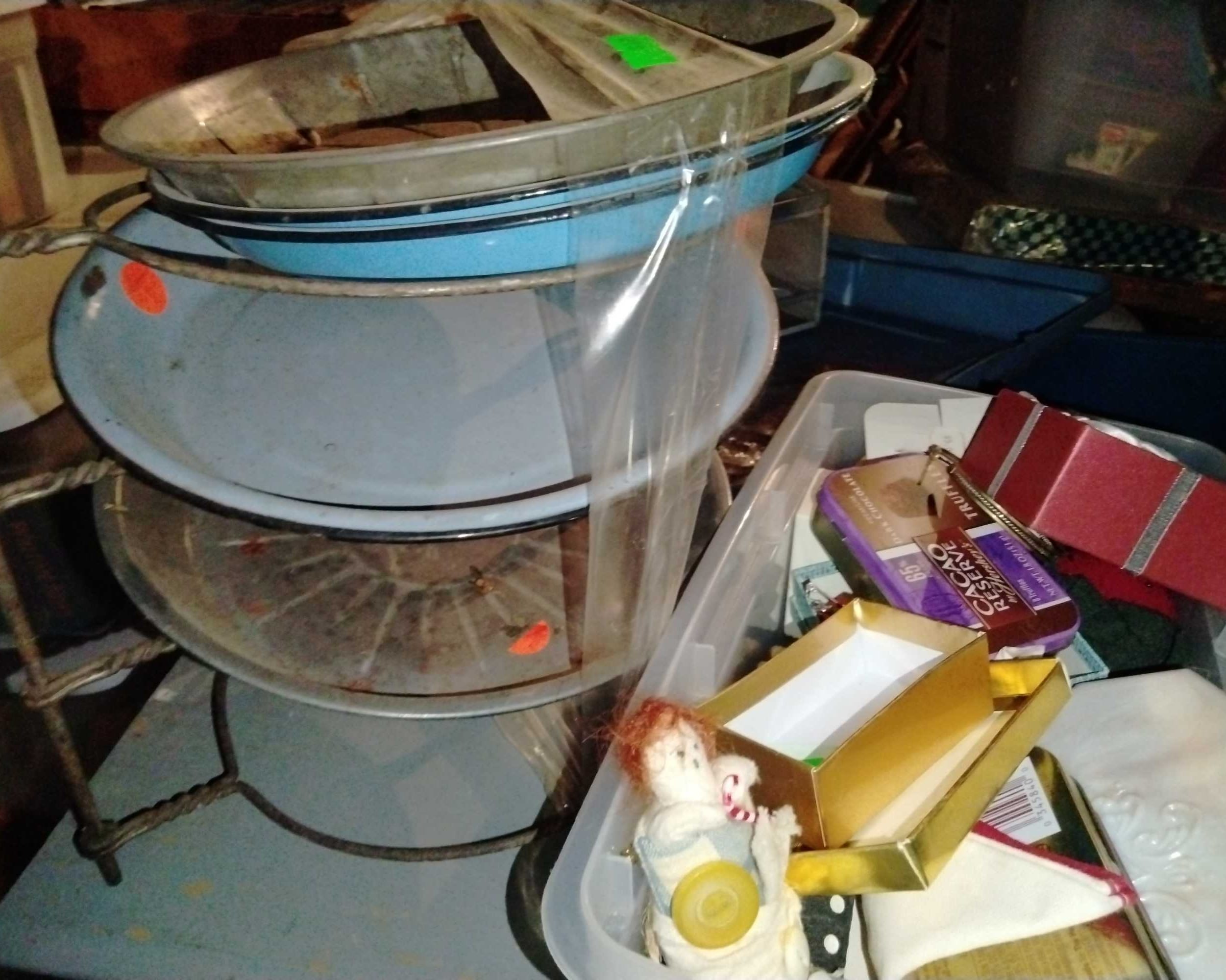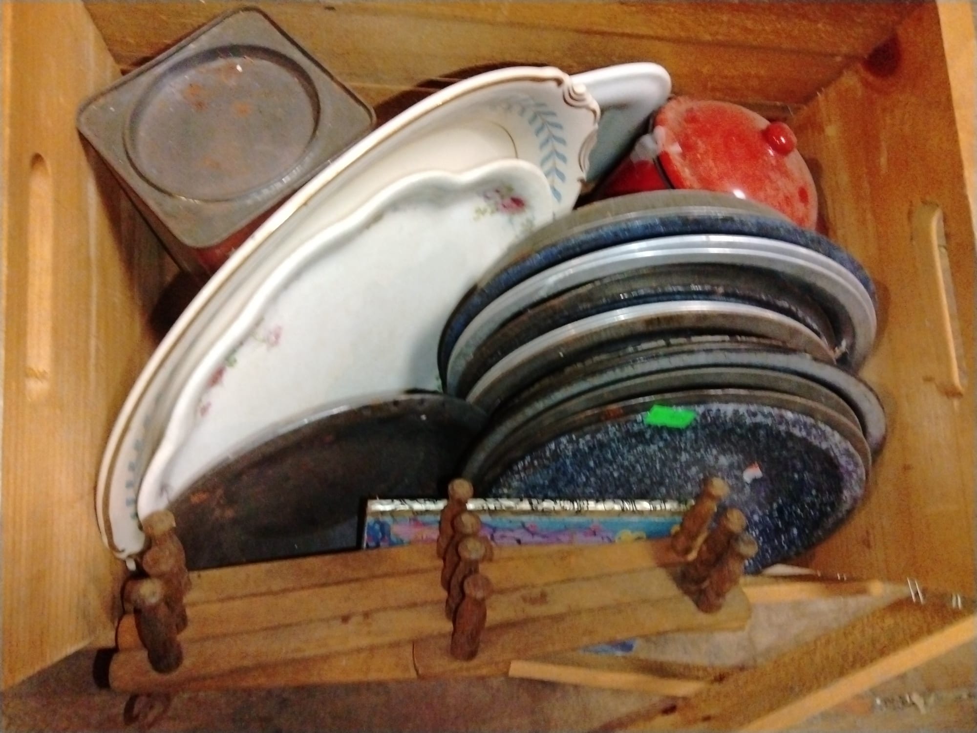 259 Pie pans, serving plates, hanging rack, tin, enamel canister, frame, wood crate - broken