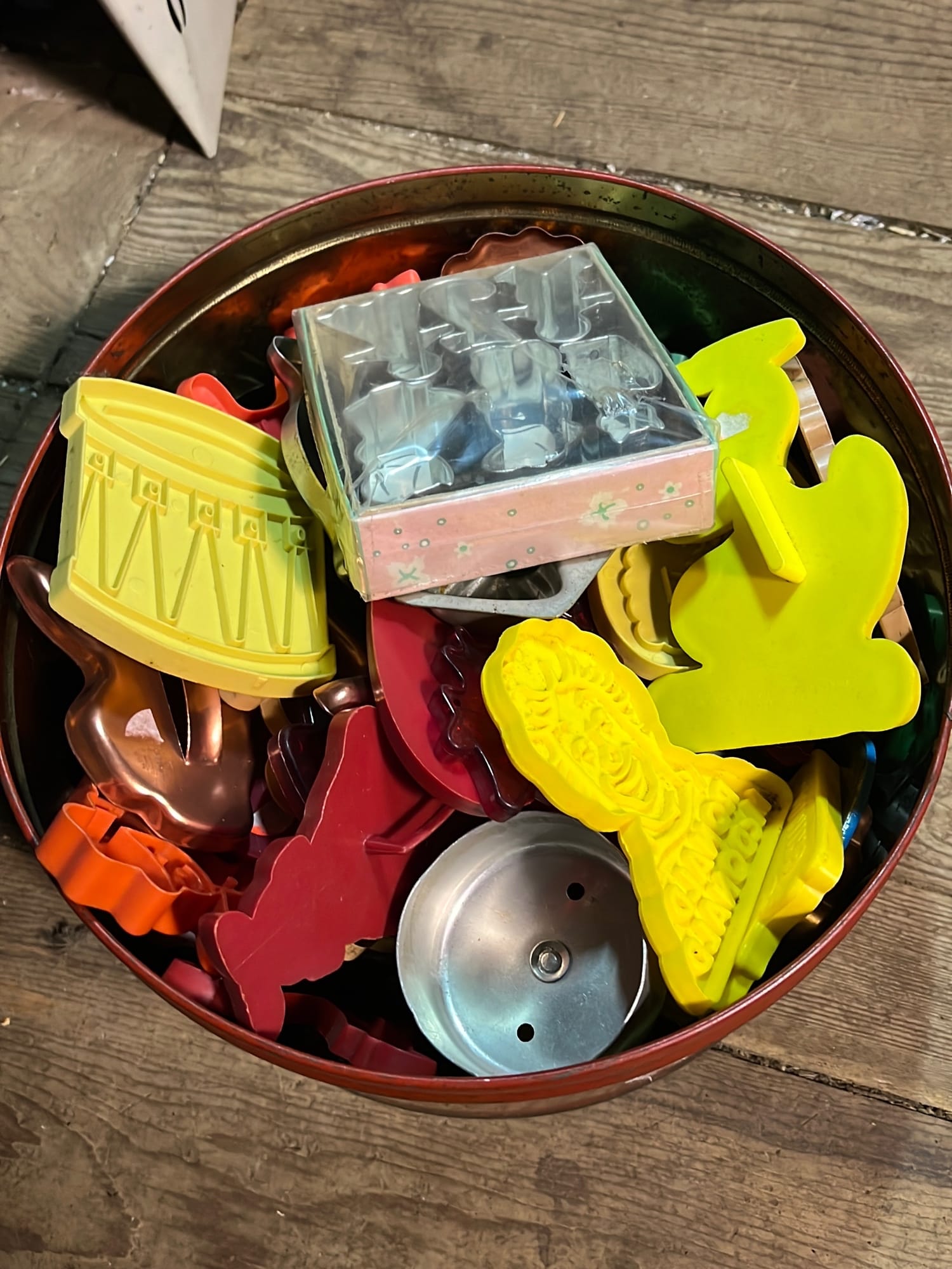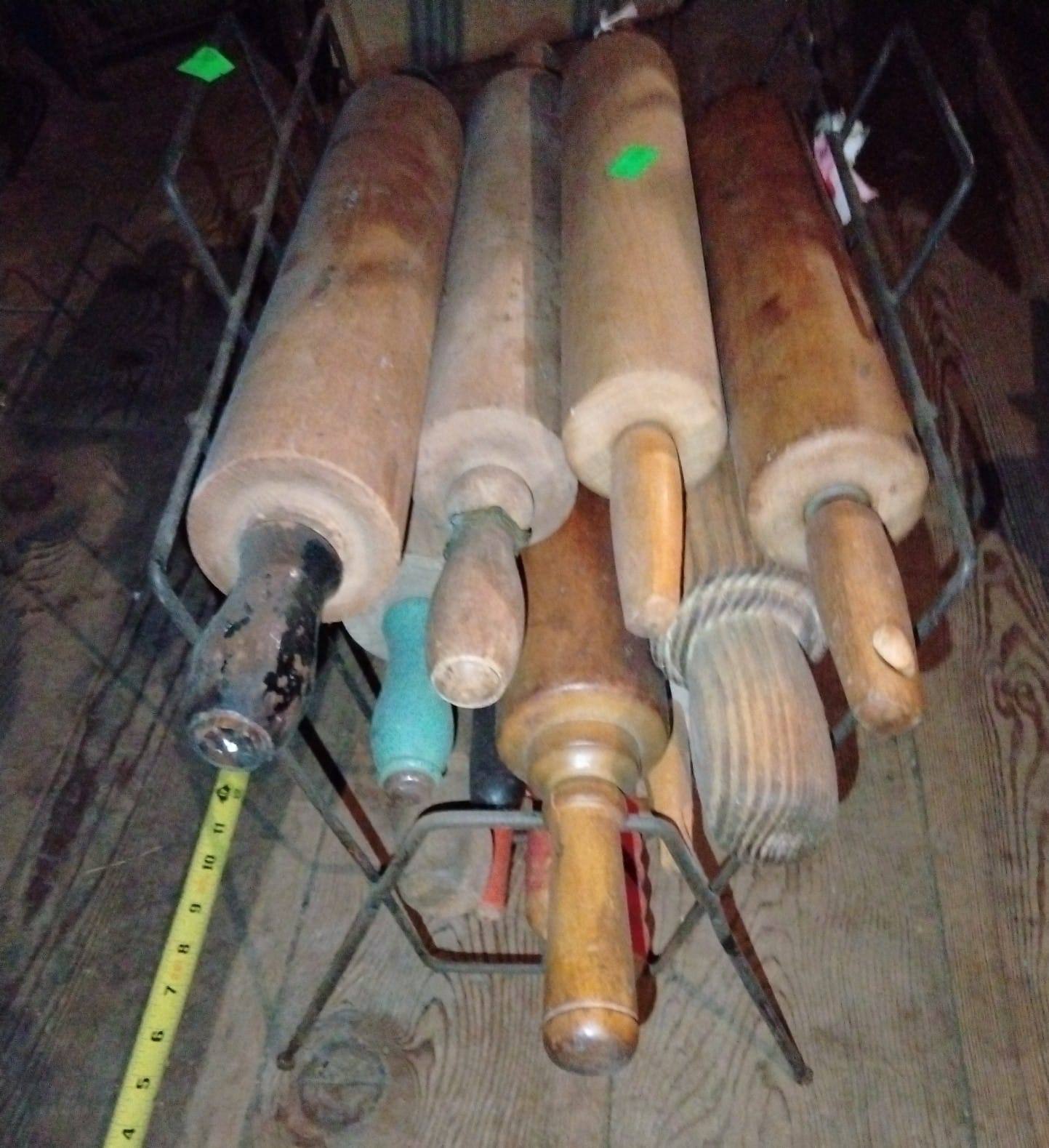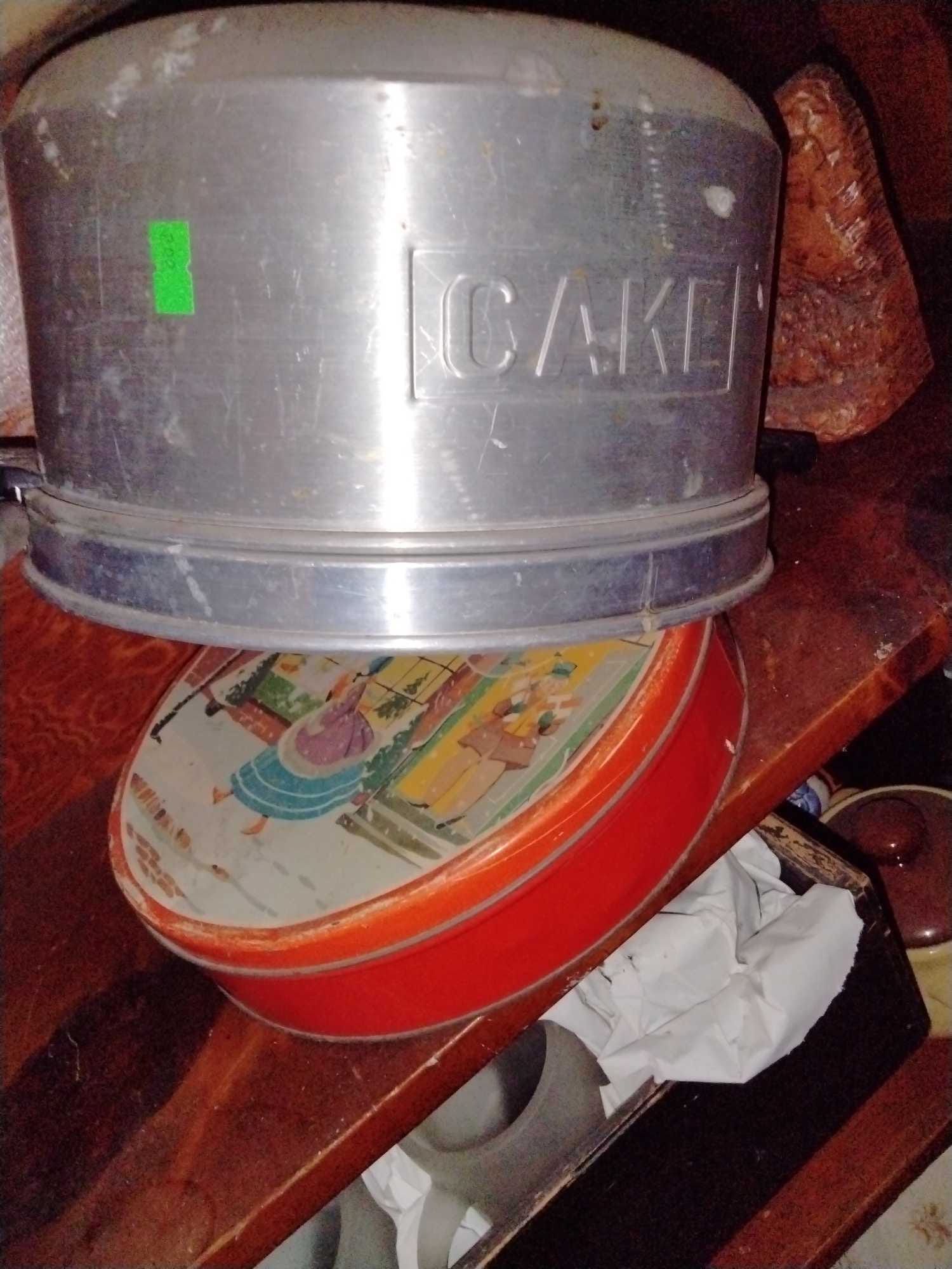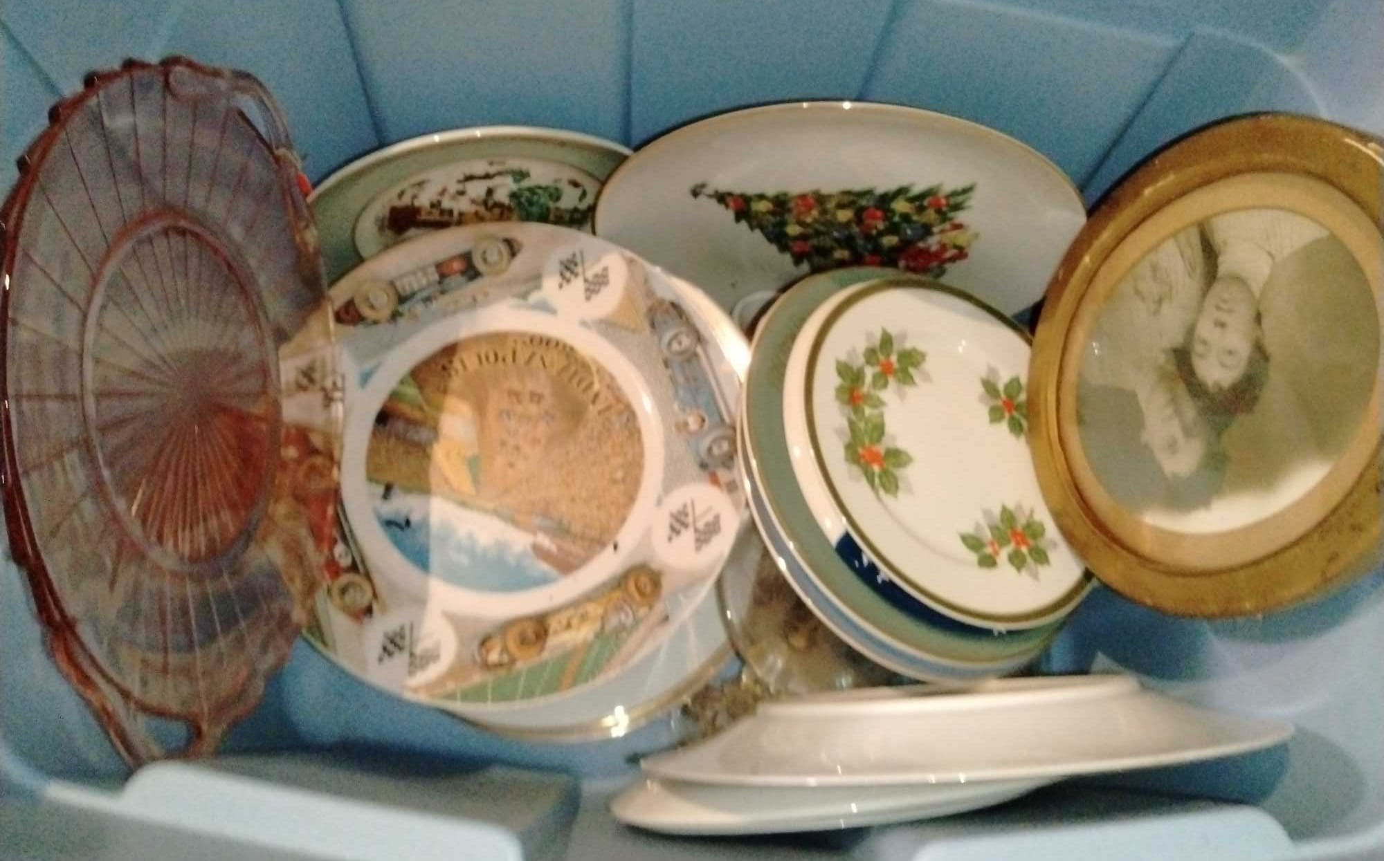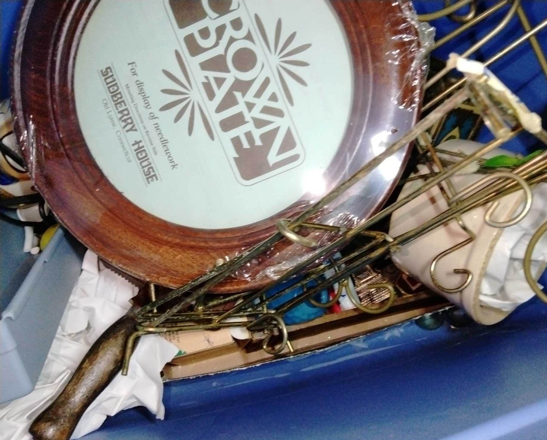 259 Pie pans, serving plates, hanging rack, tin, enamel canister, frame, wood crate - broken