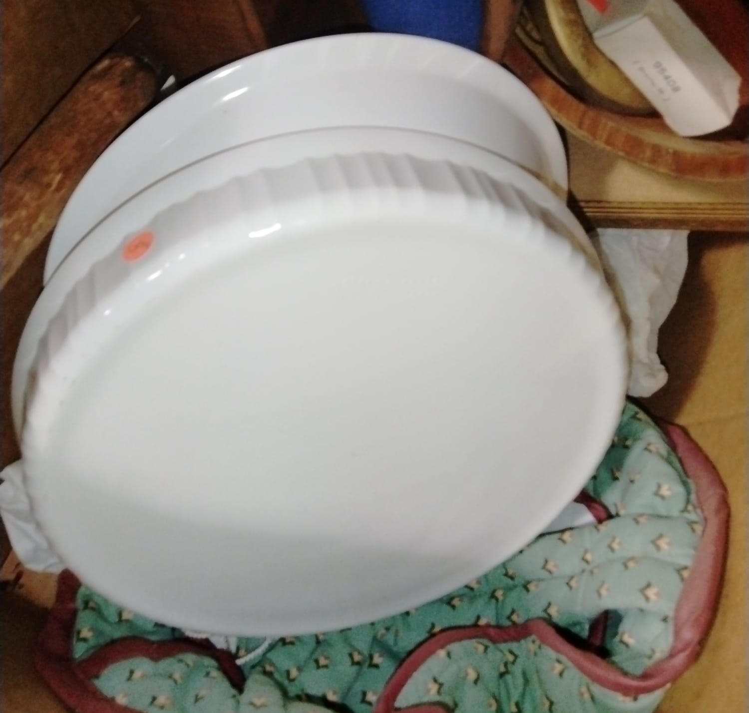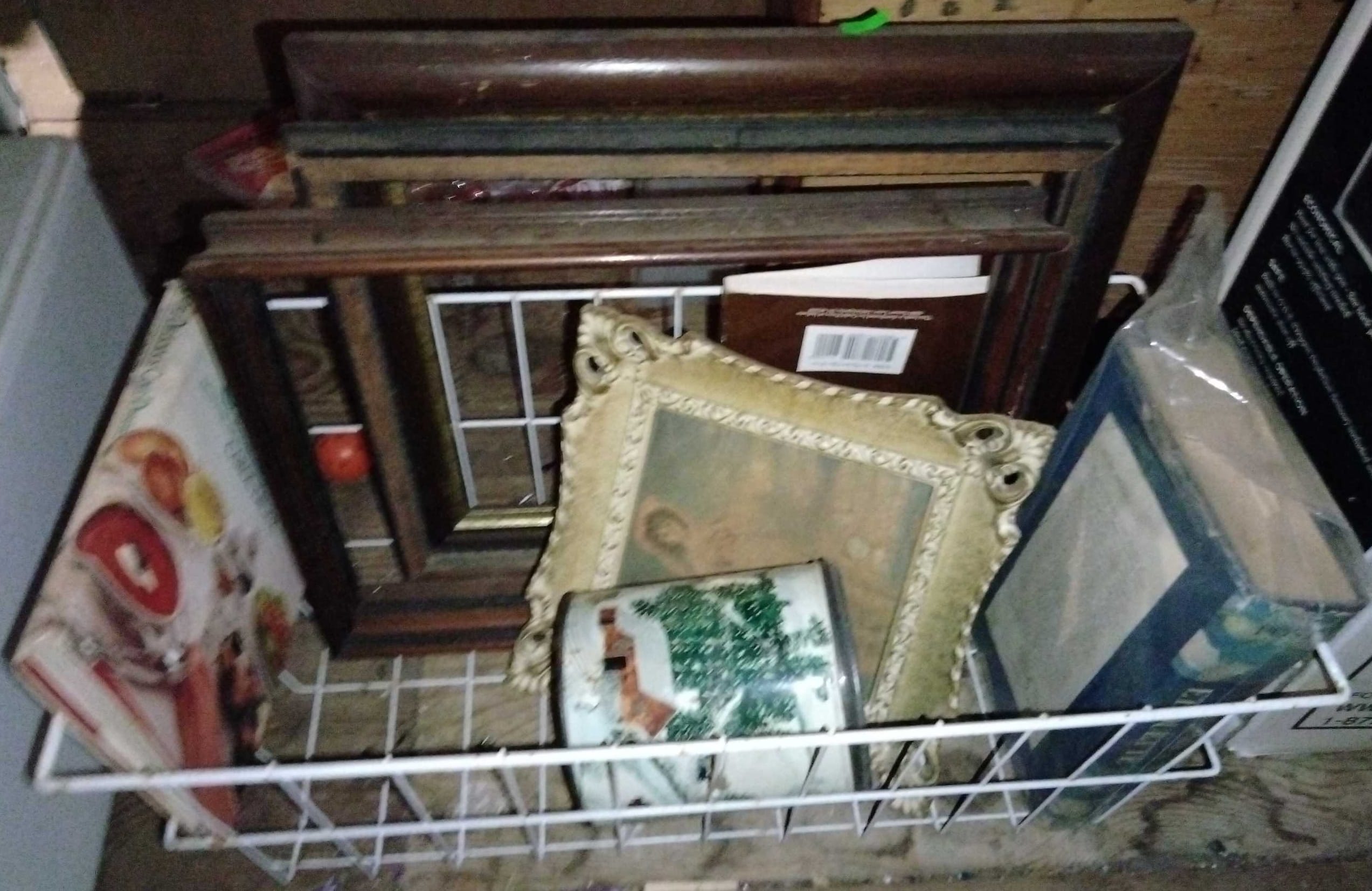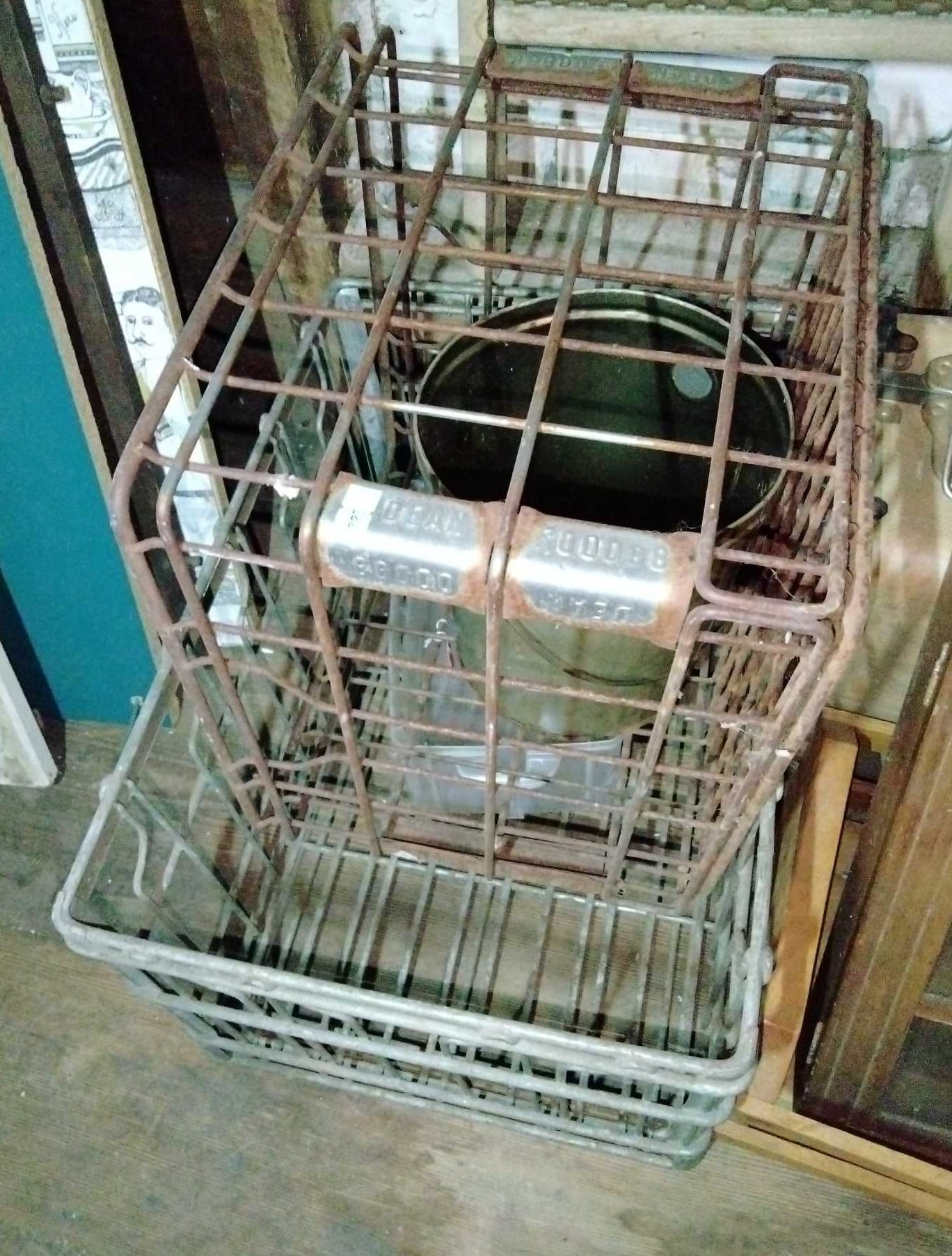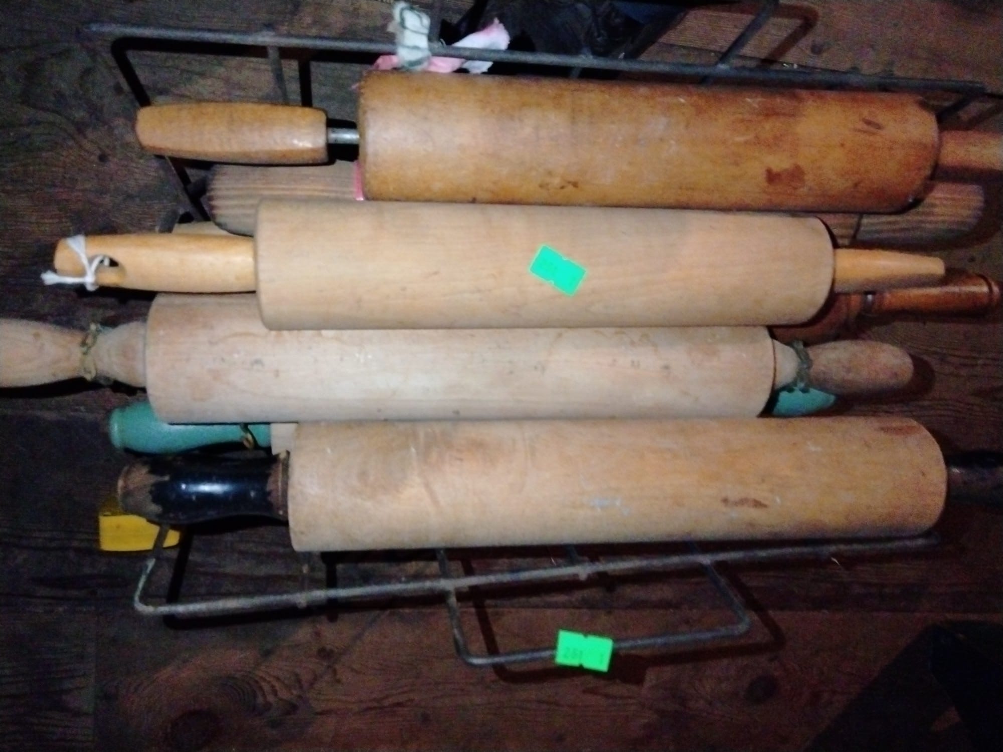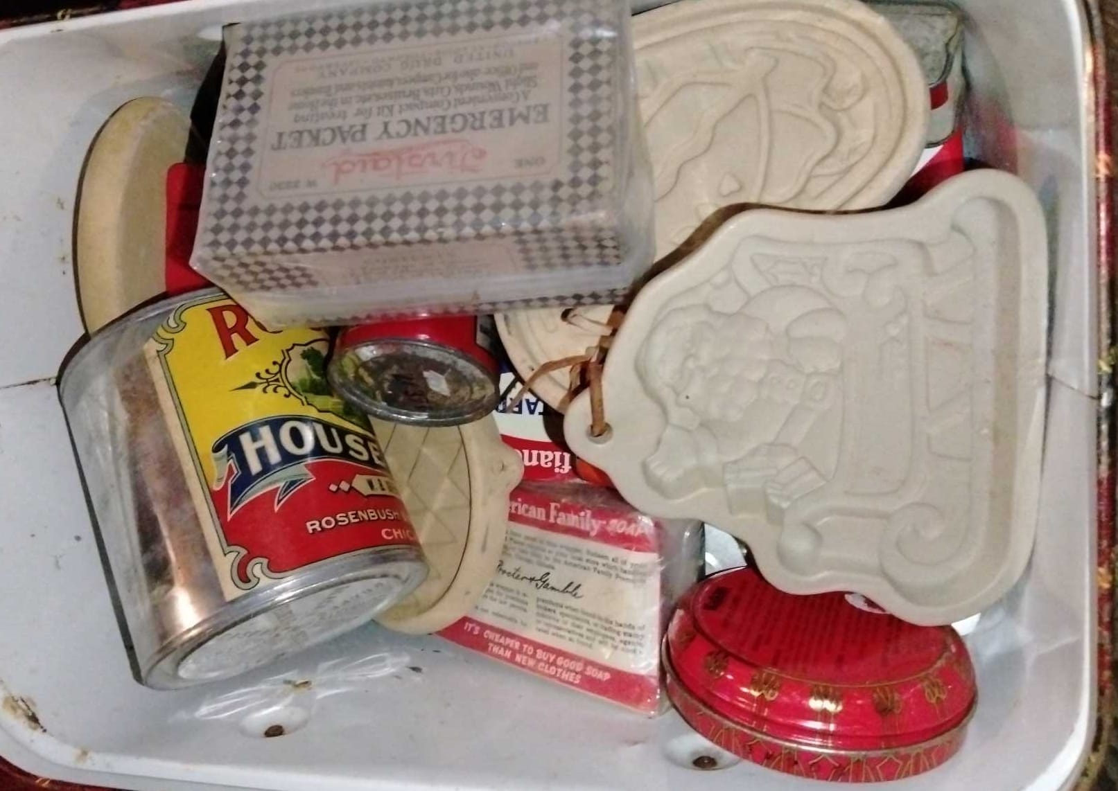 259 Pie pans, serving plates, hanging rack, tin, enamel canister, frame, wood crate - broken