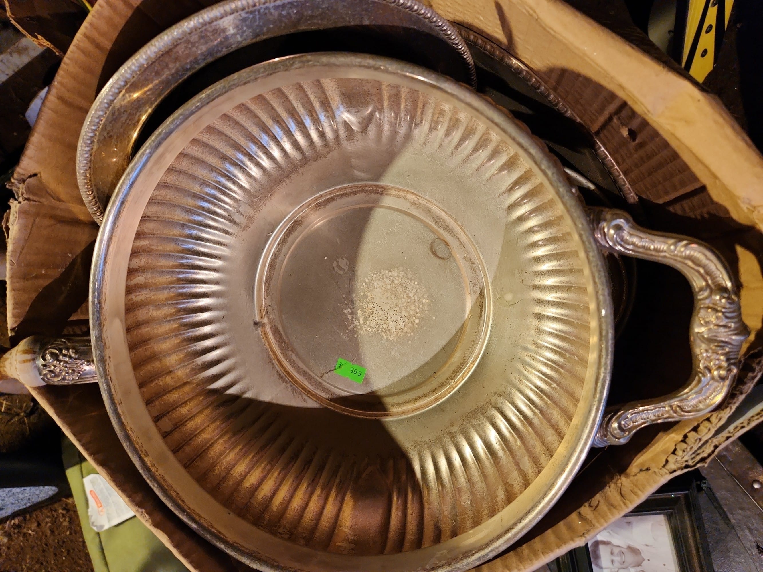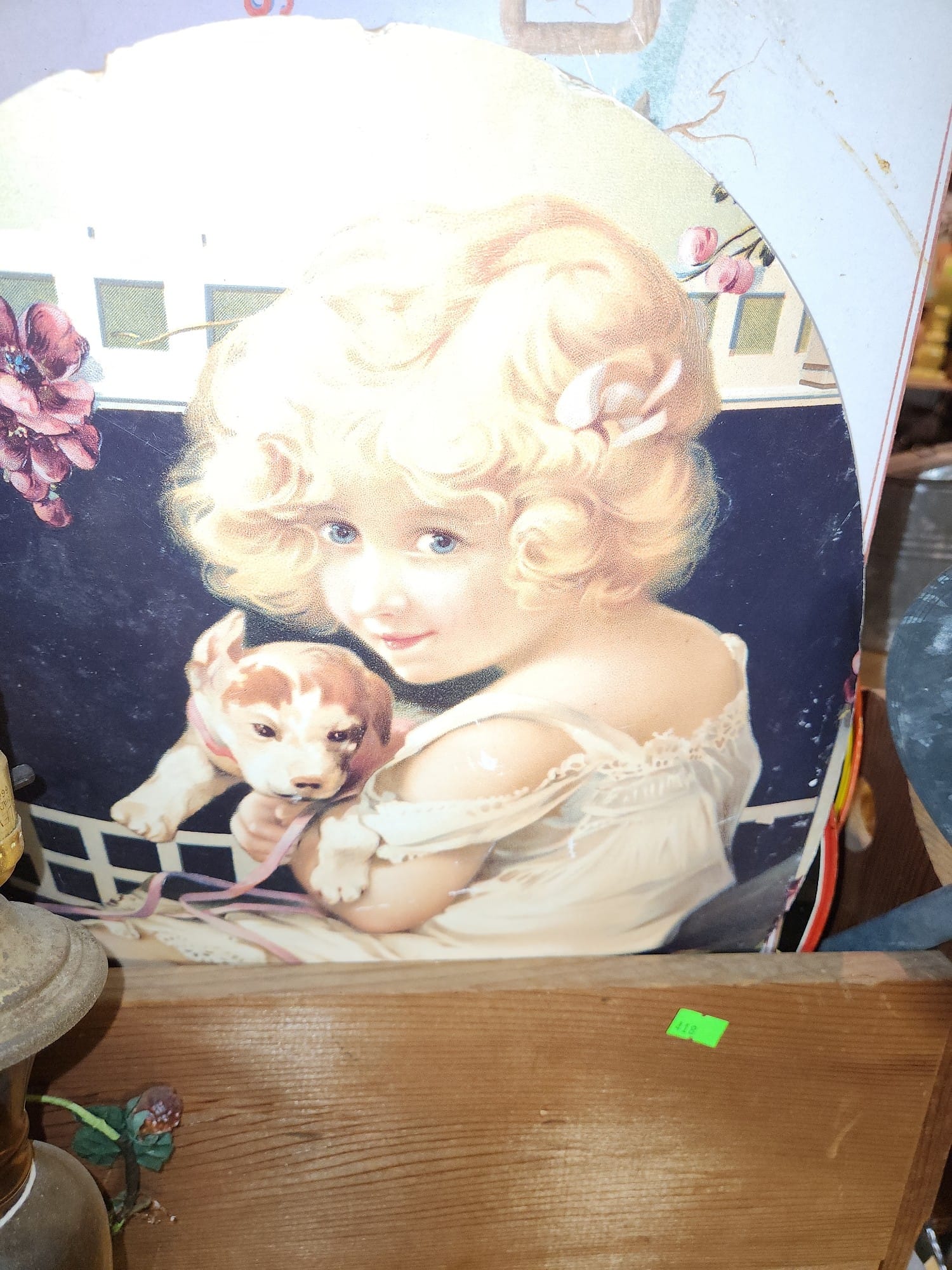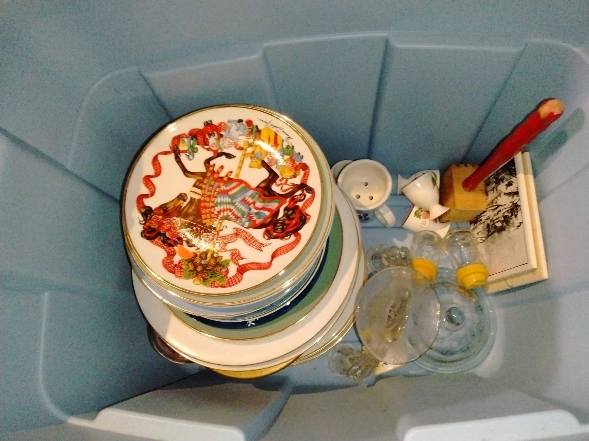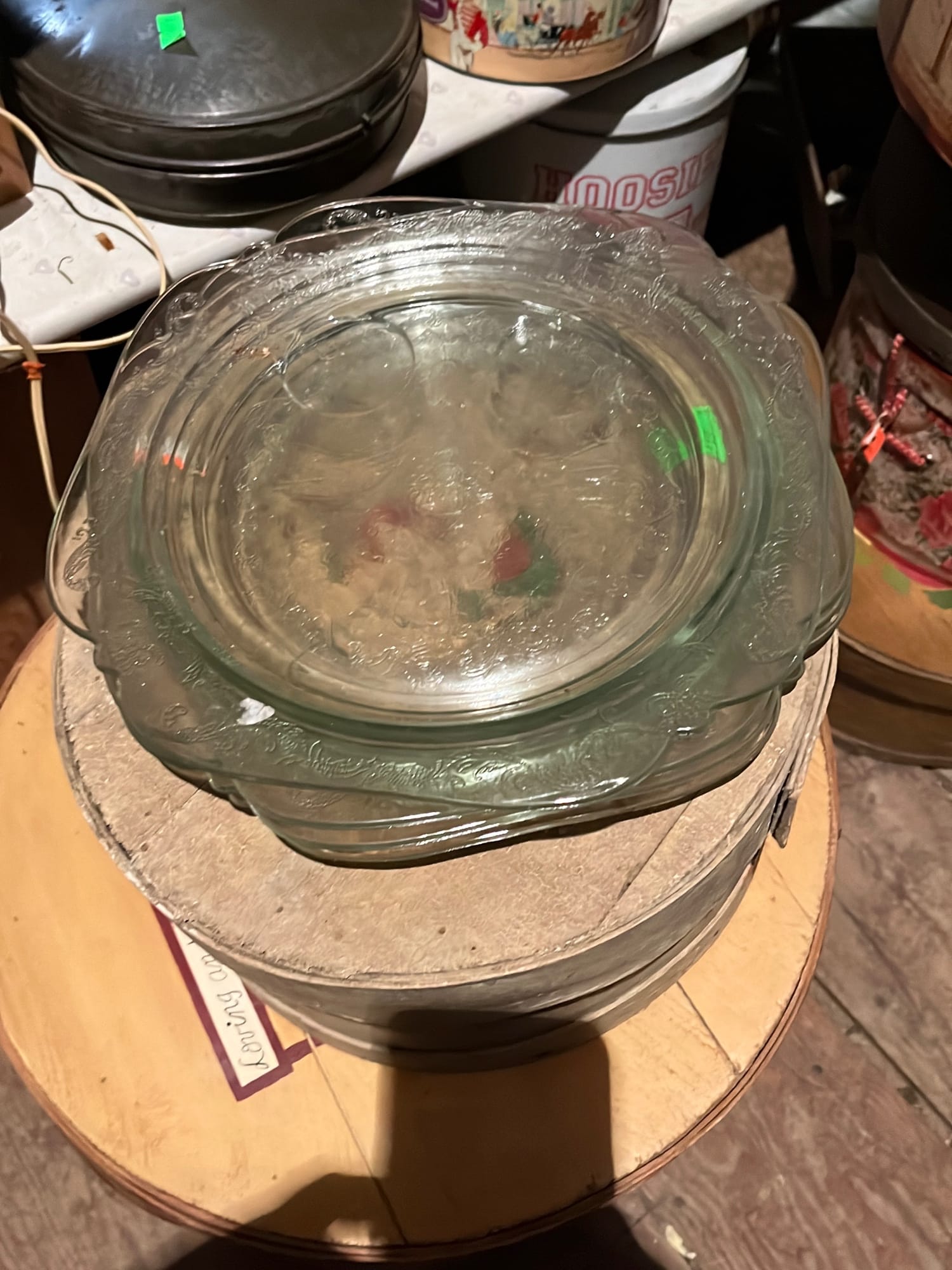 259 Pie pans, serving plates, hanging rack, tin, enamel canister, frame, wood crate - broken