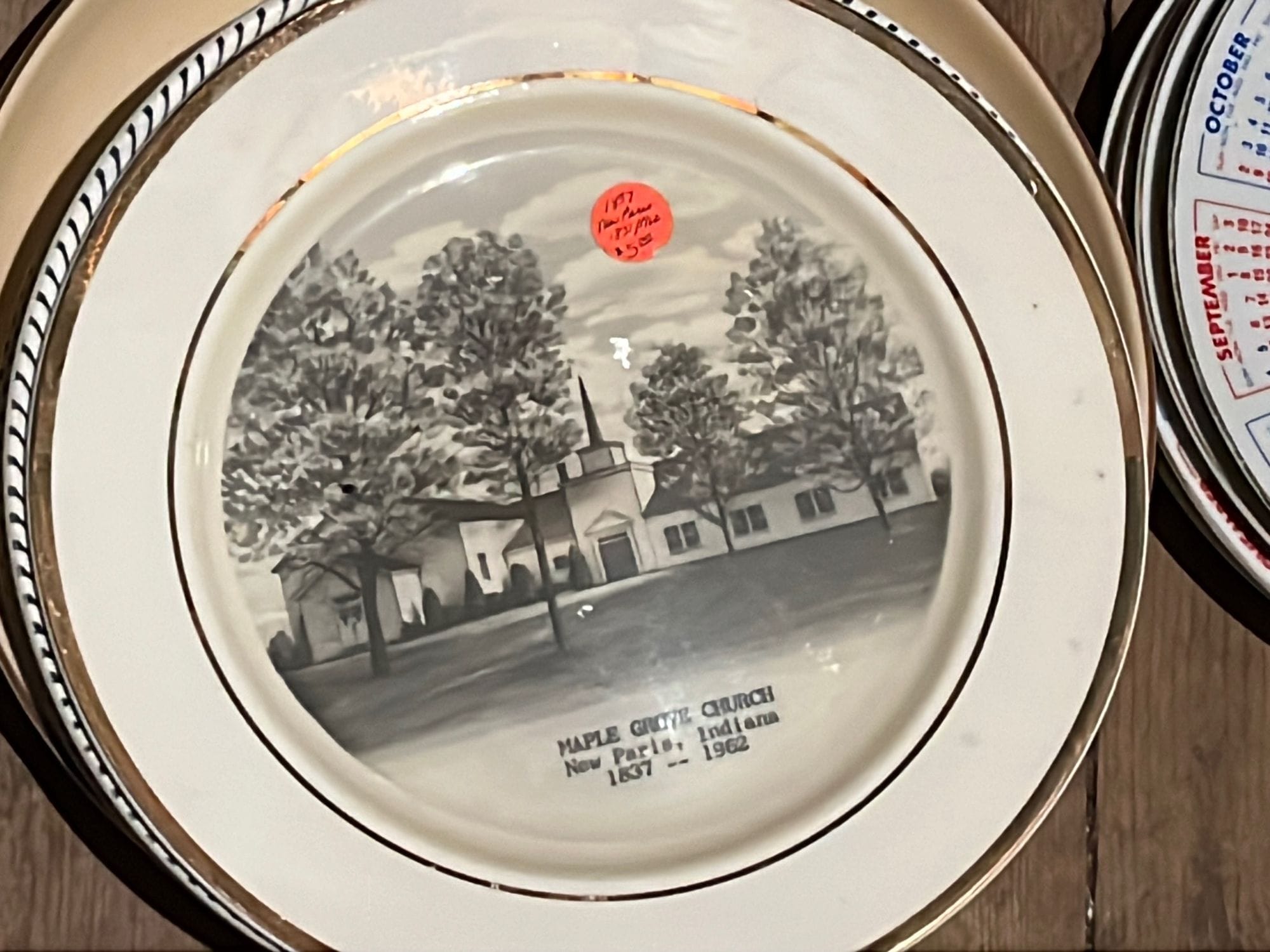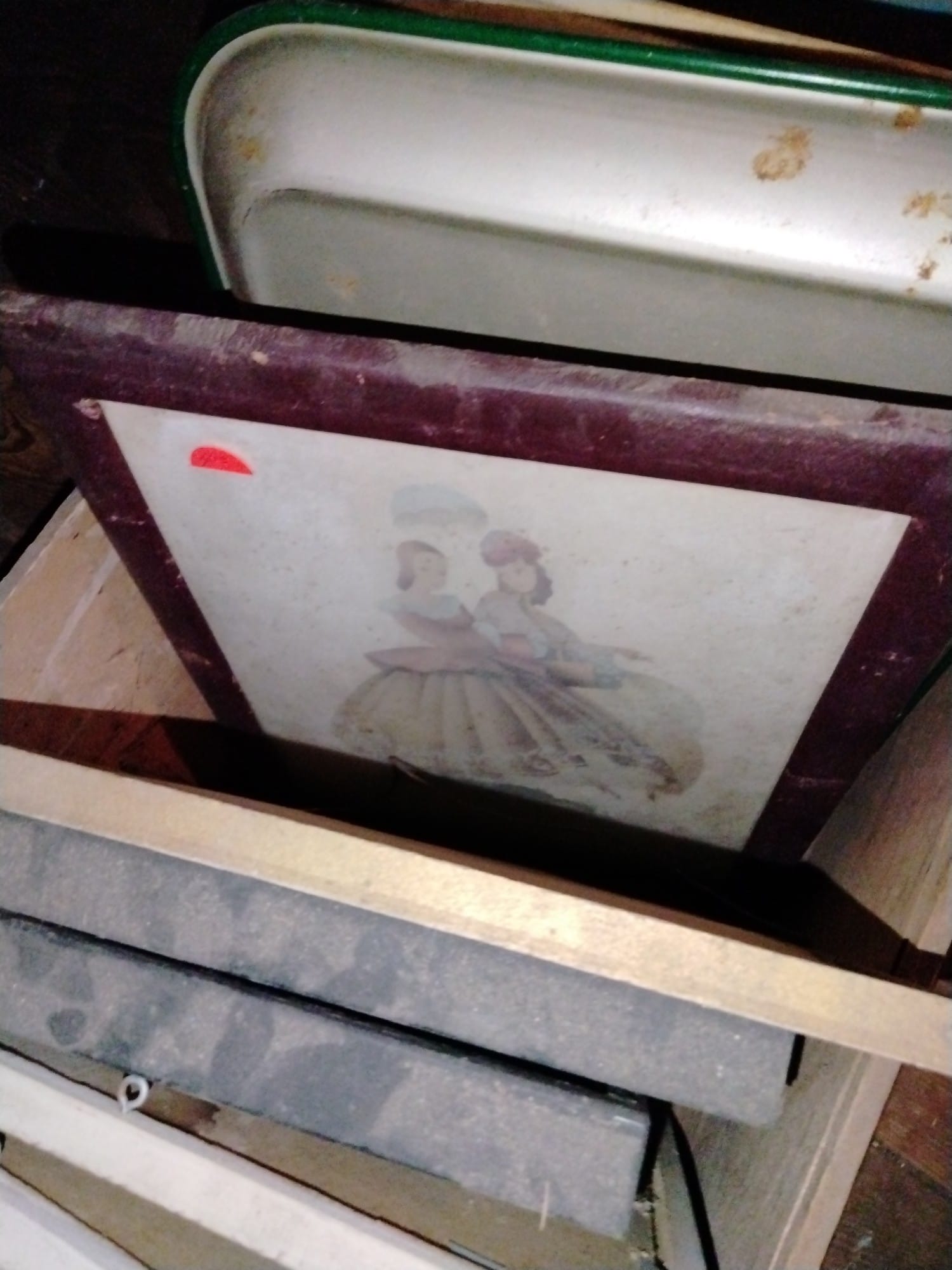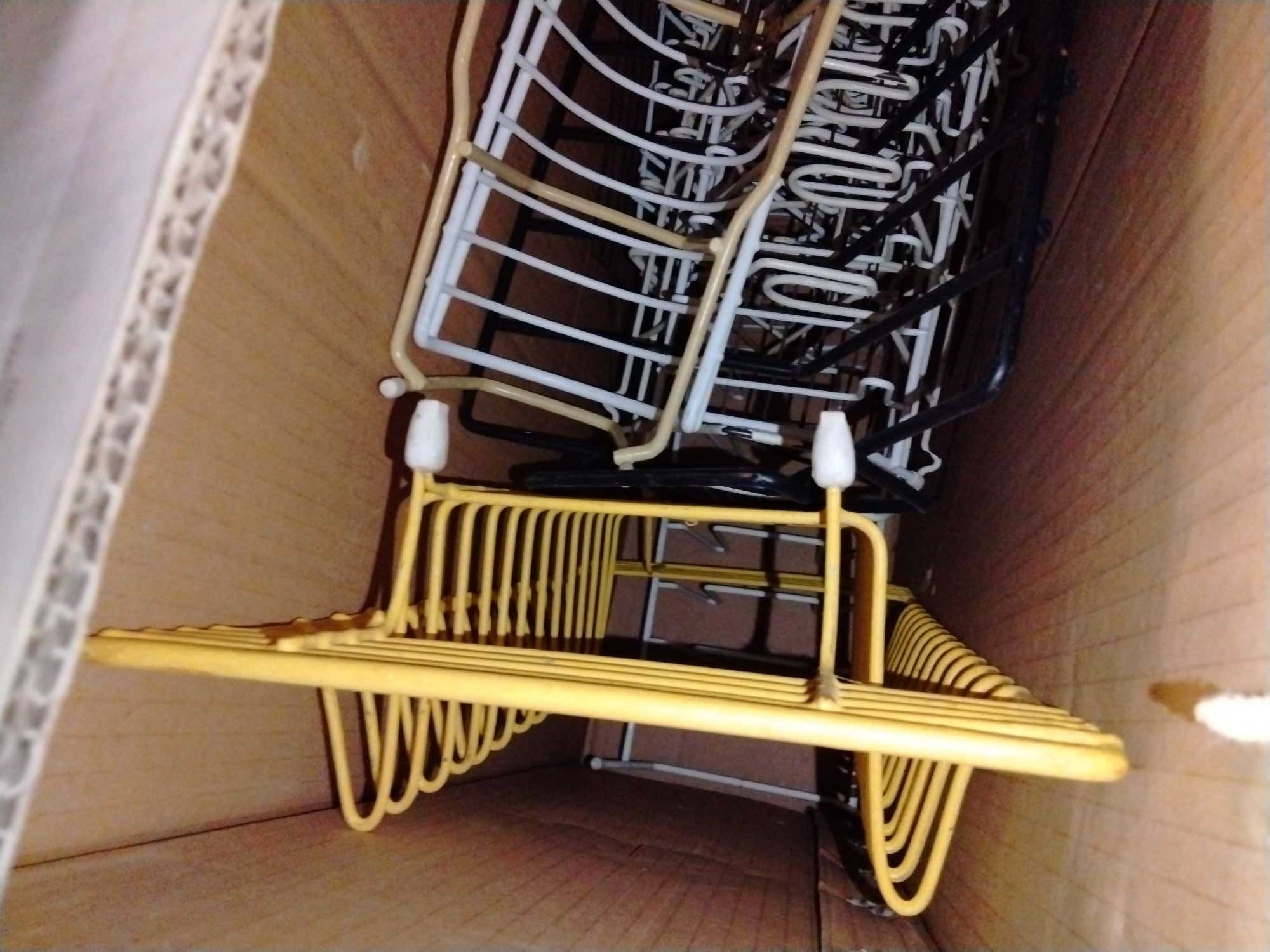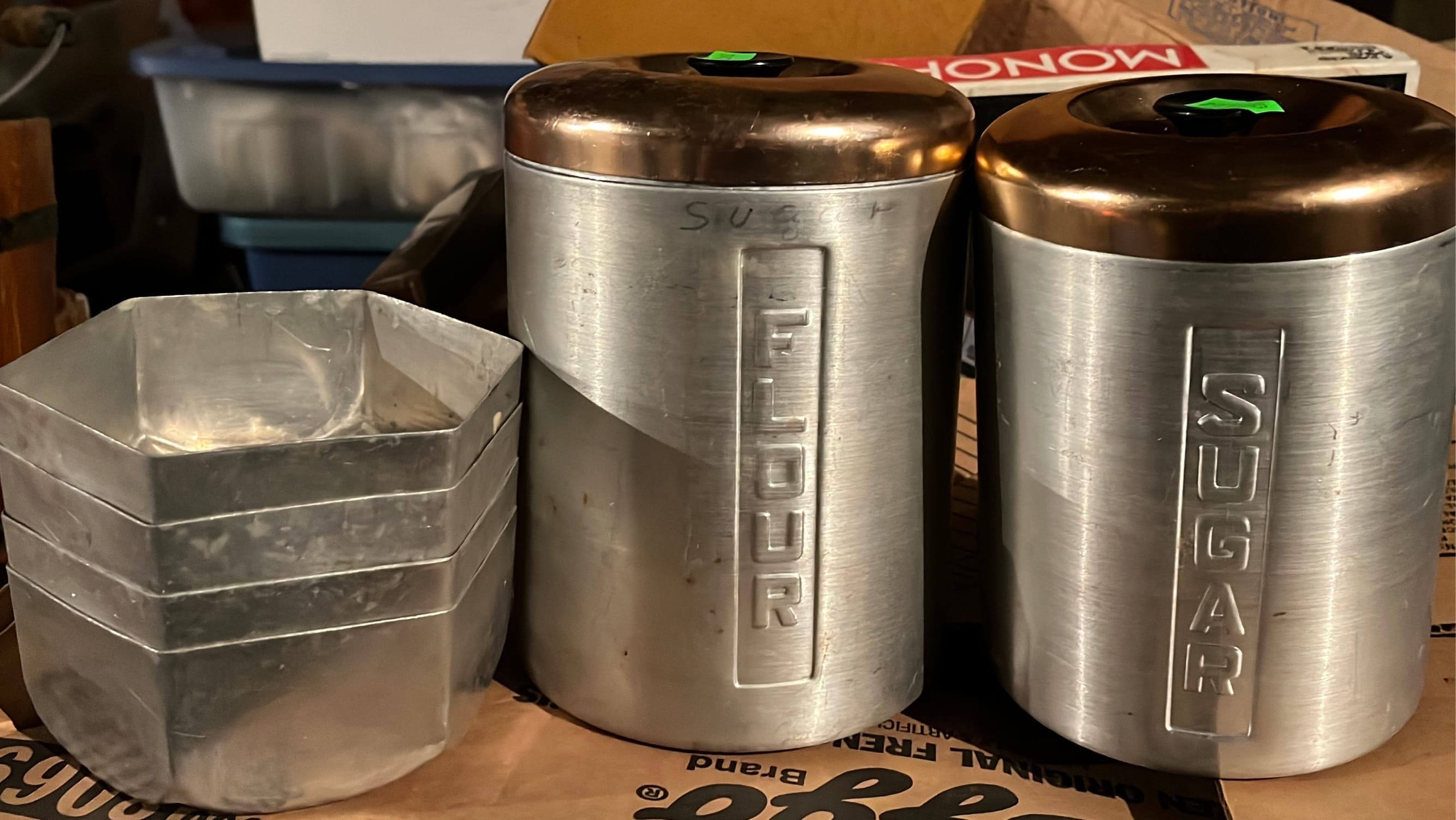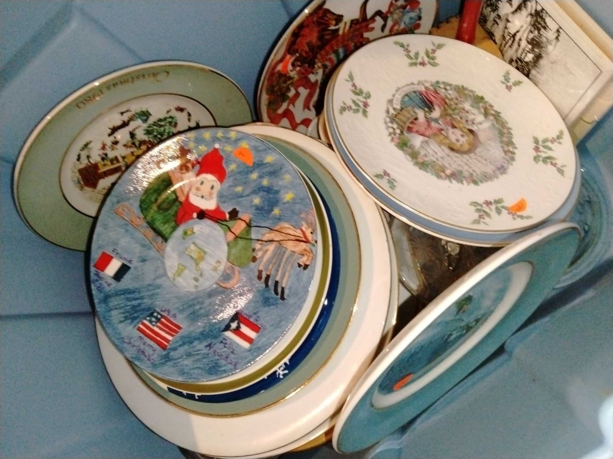 259 Pie pans, serving plates, hanging rack, tin, enamel canister, frame, wood crate - broken
