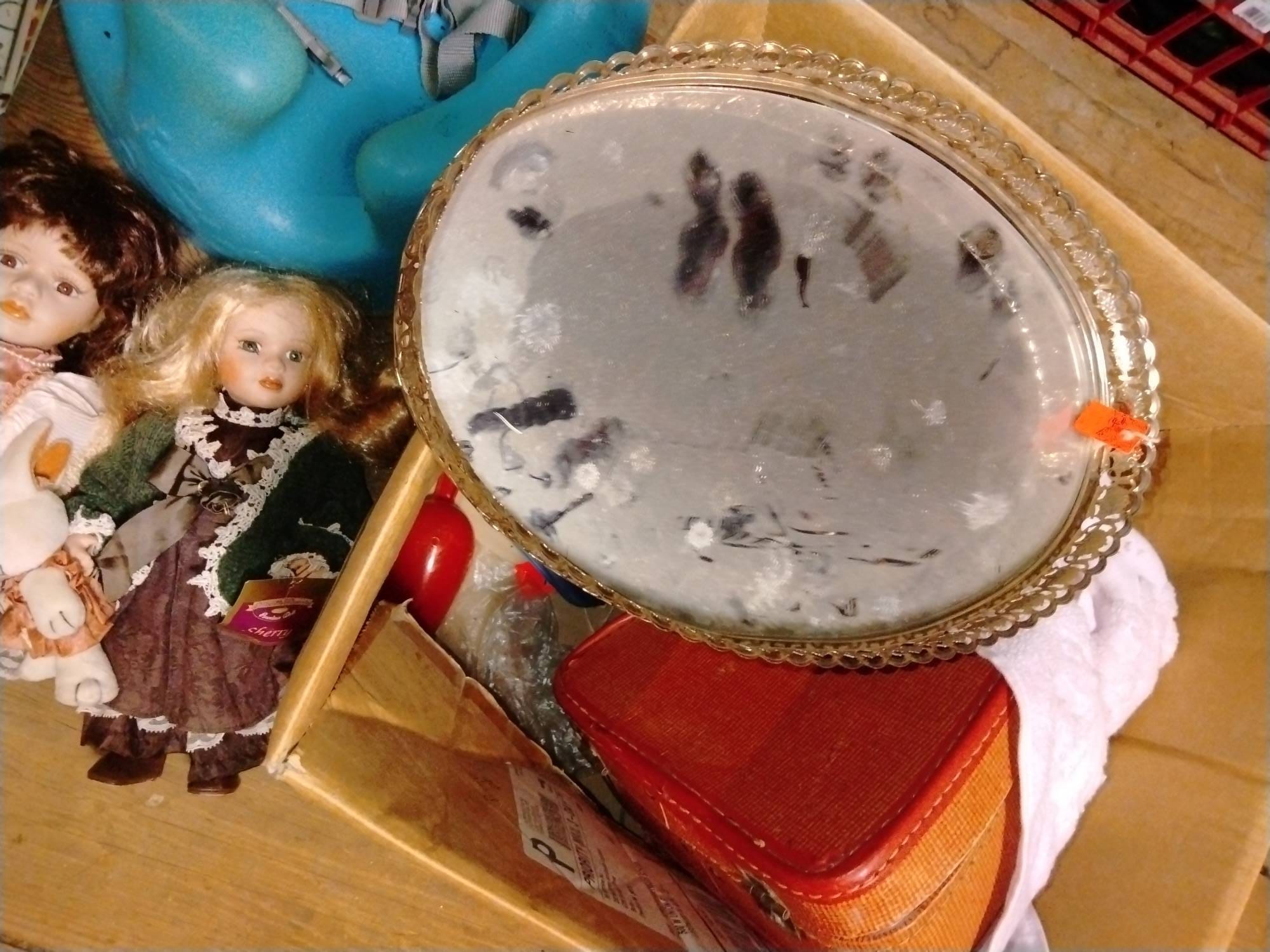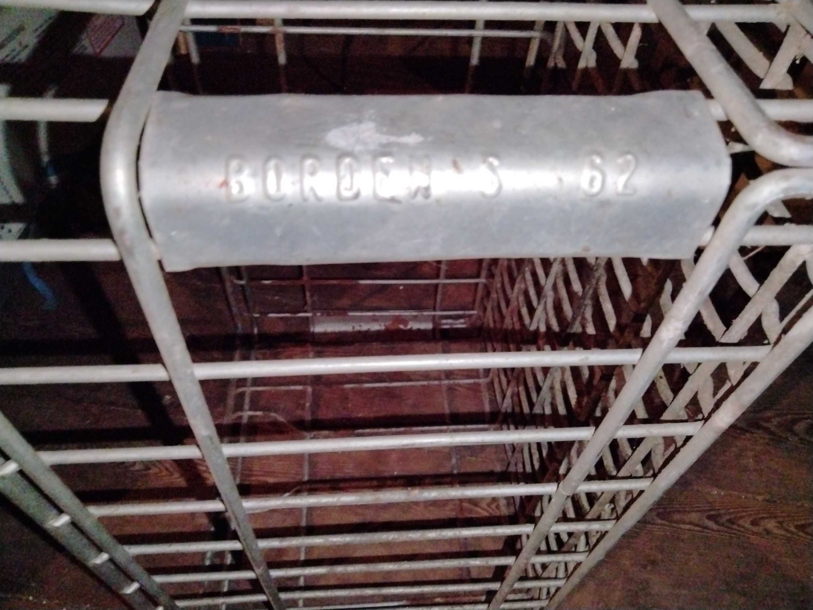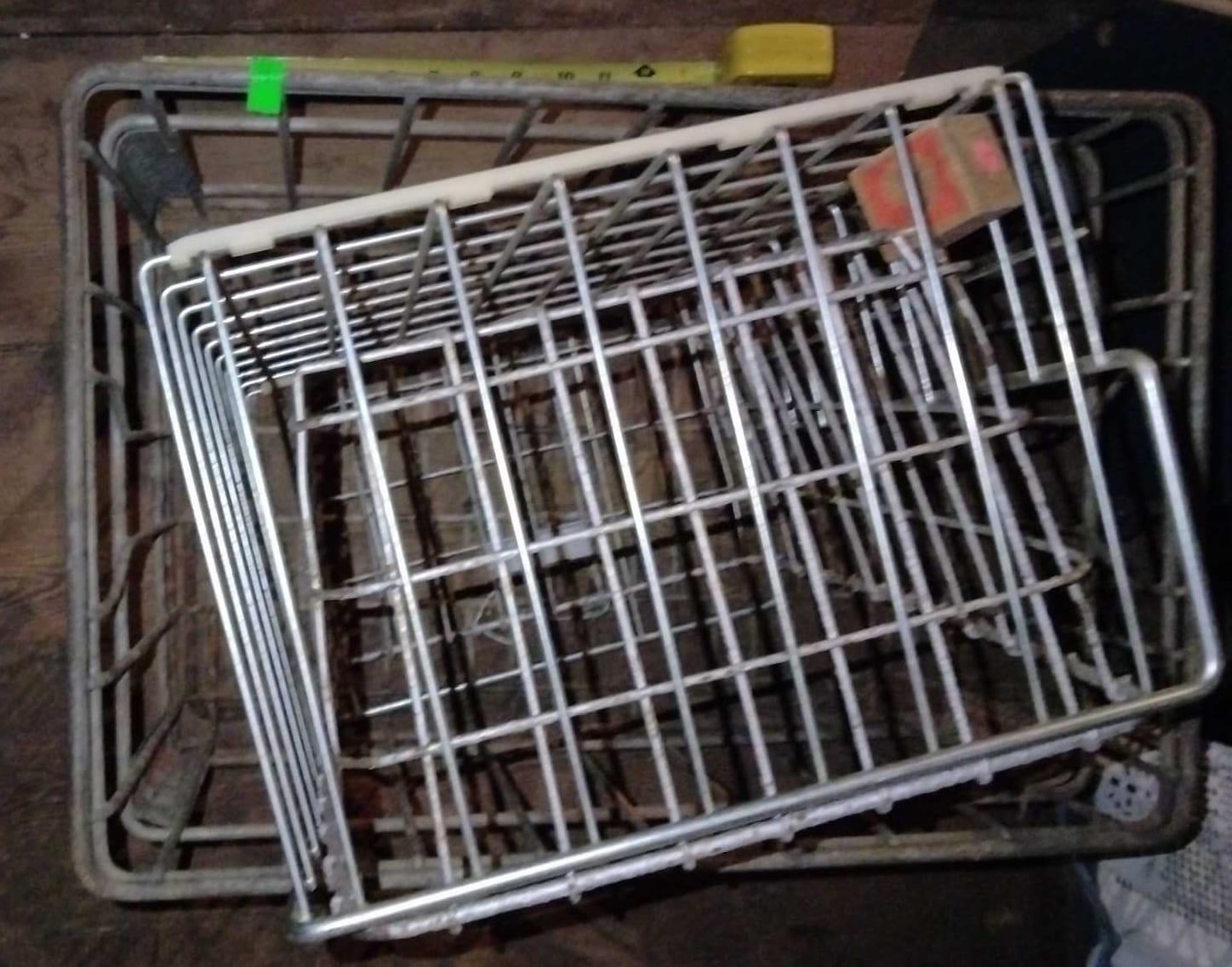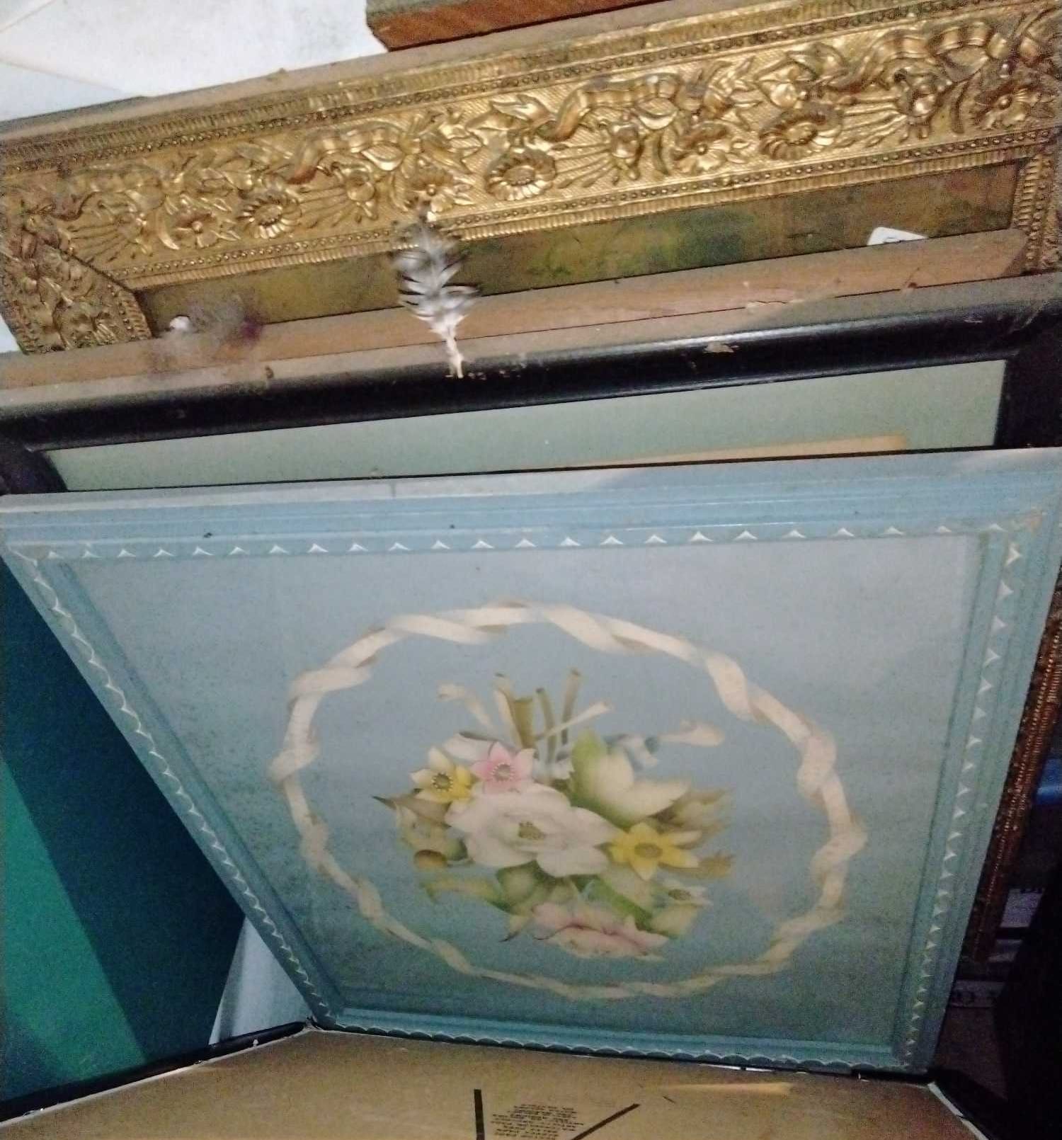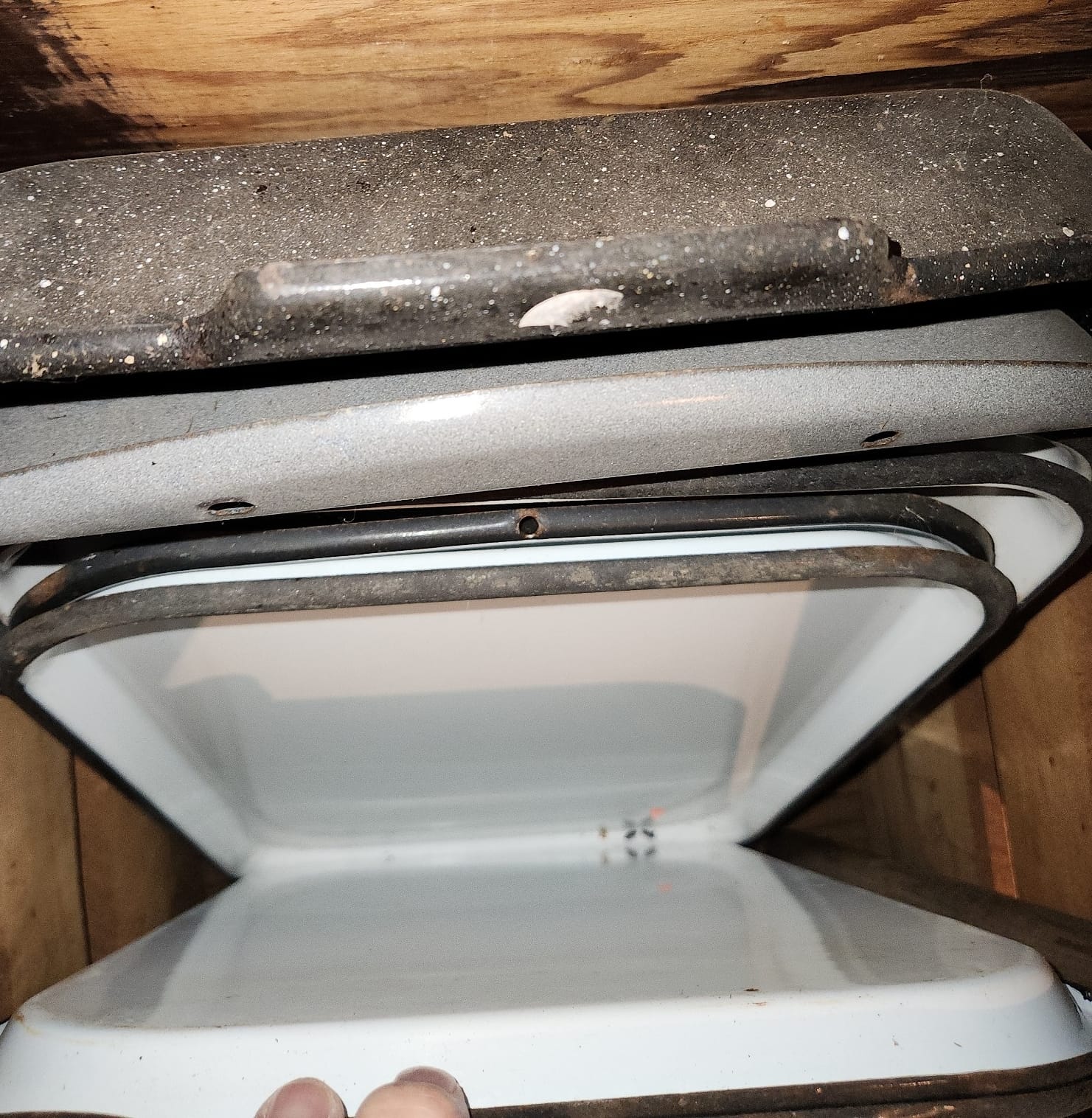 259 Pie pans, serving plates, hanging rack, tin, enamel canister, frame, wood crate - broken