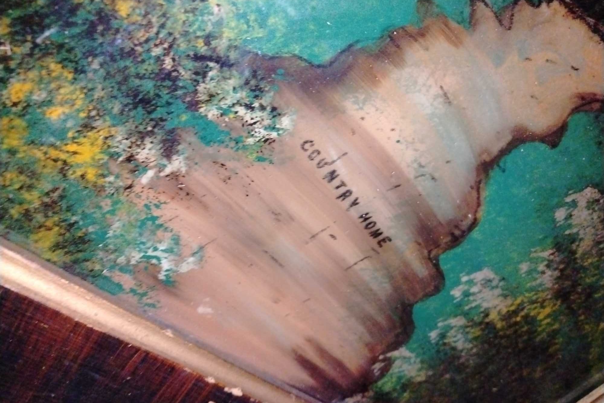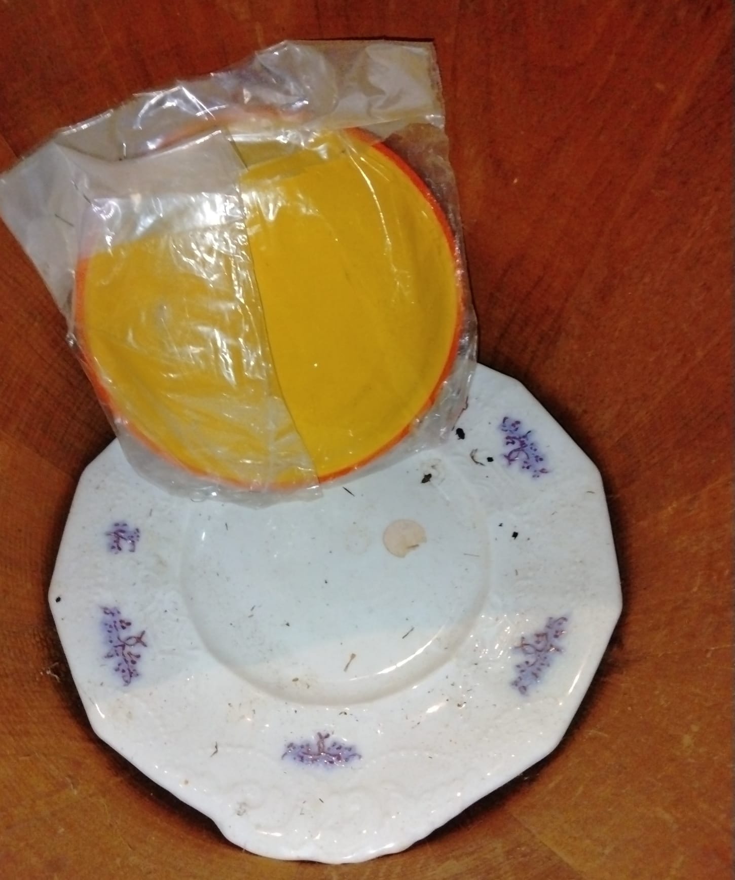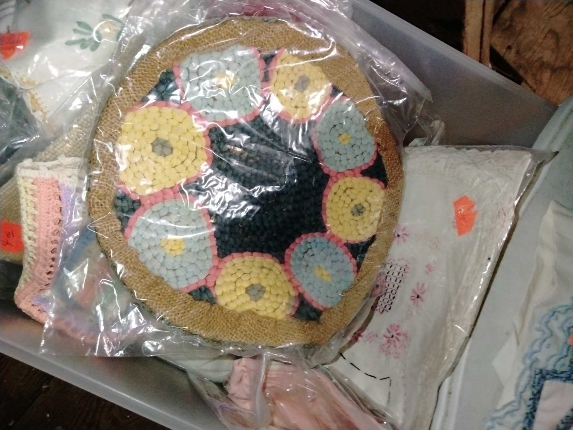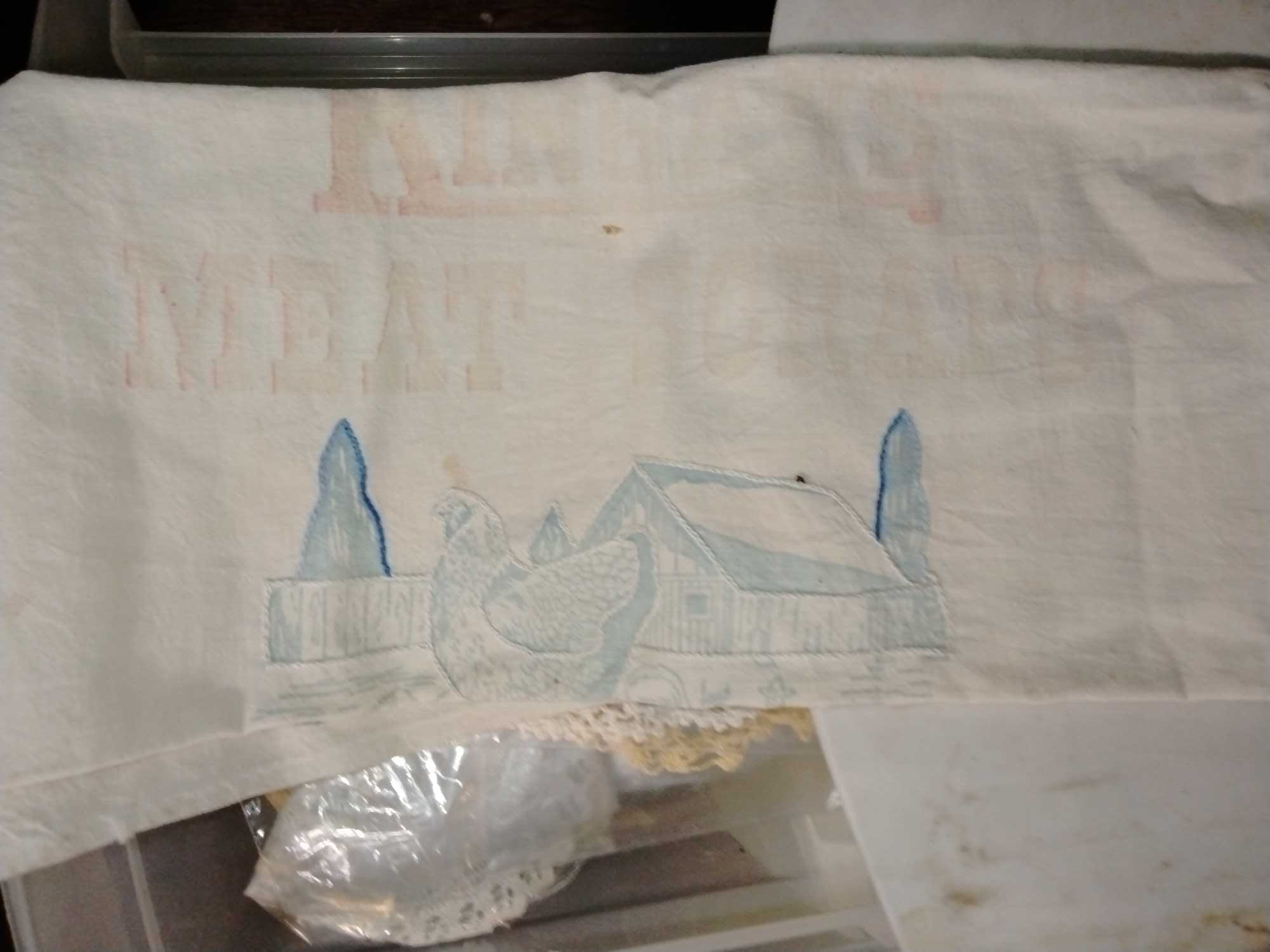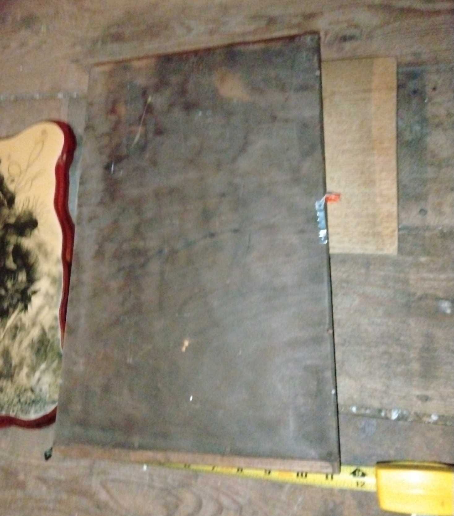 259 Pie pans, serving plates, hanging rack, tin, enamel canister, frame, wood crate - broken