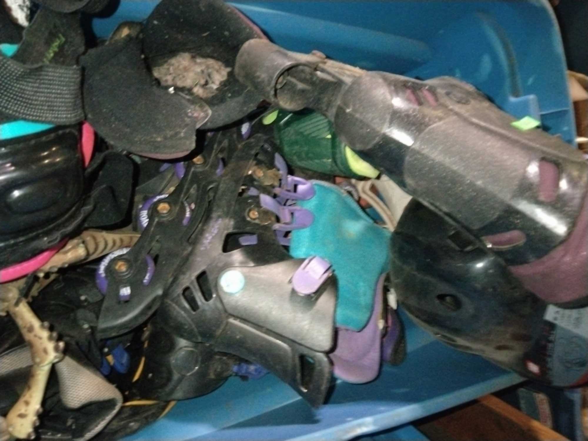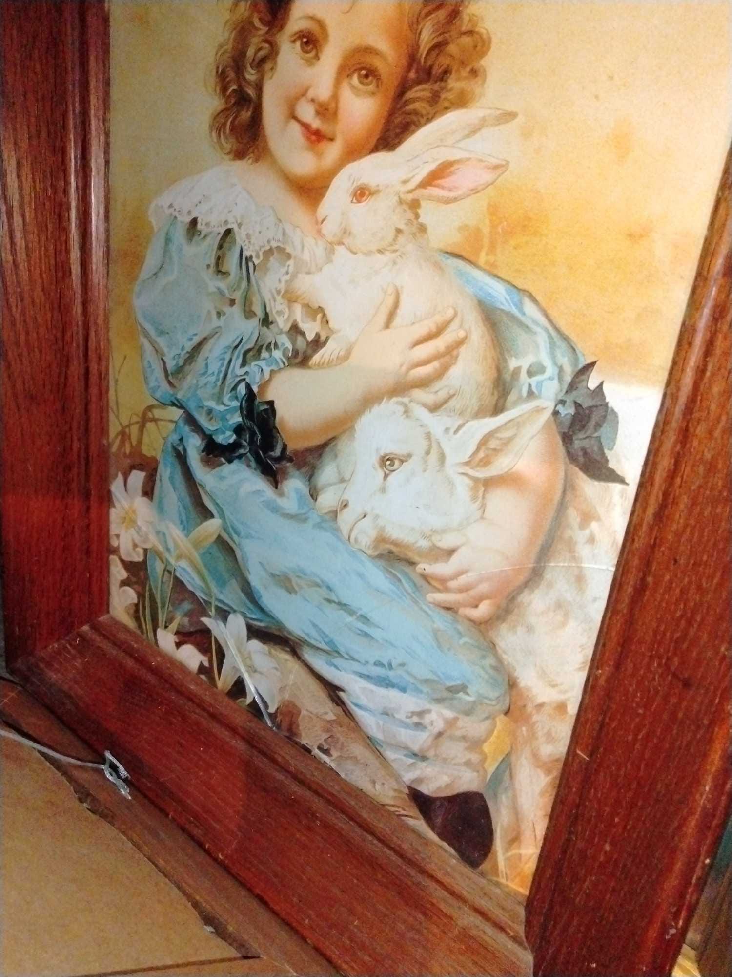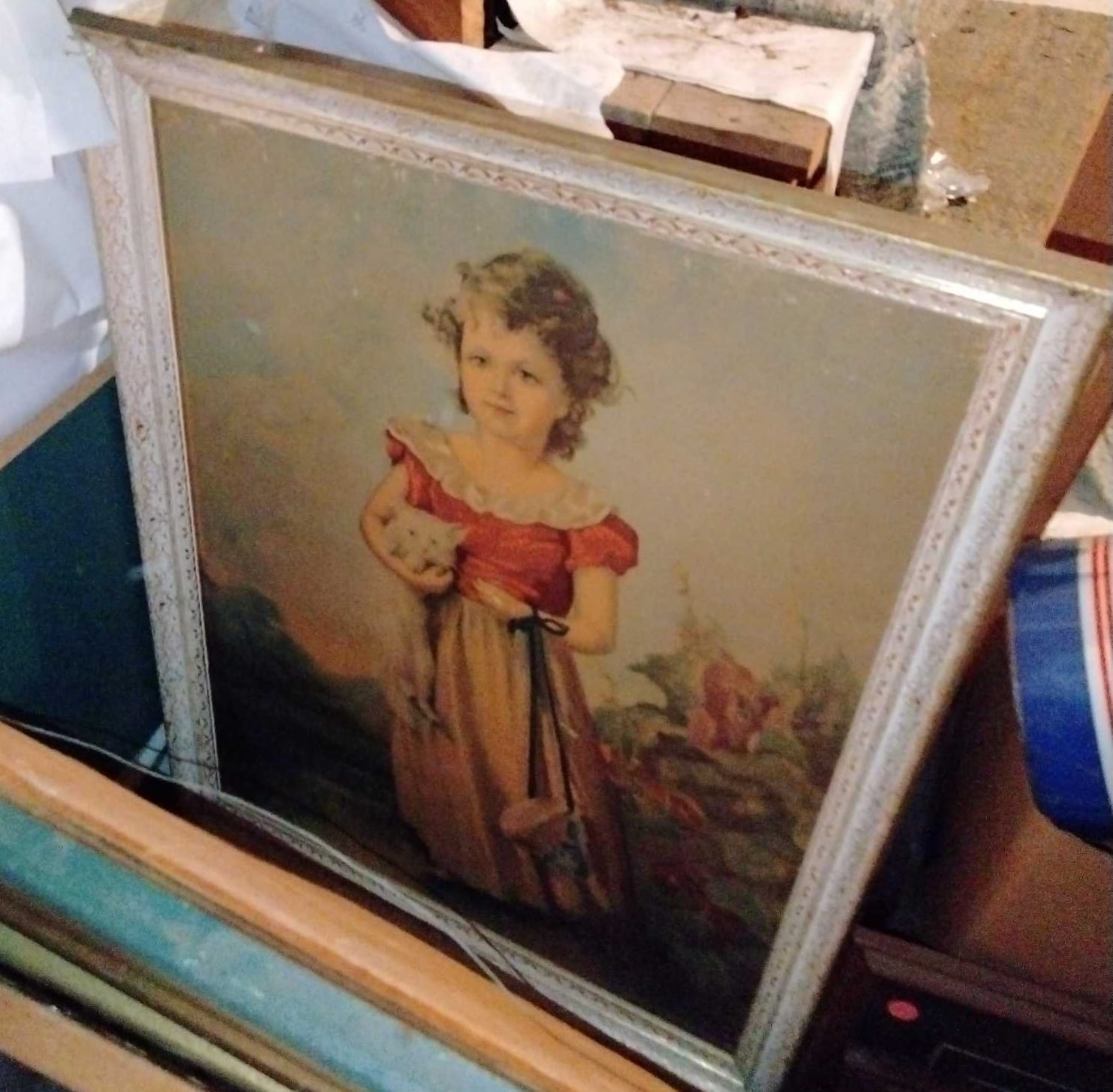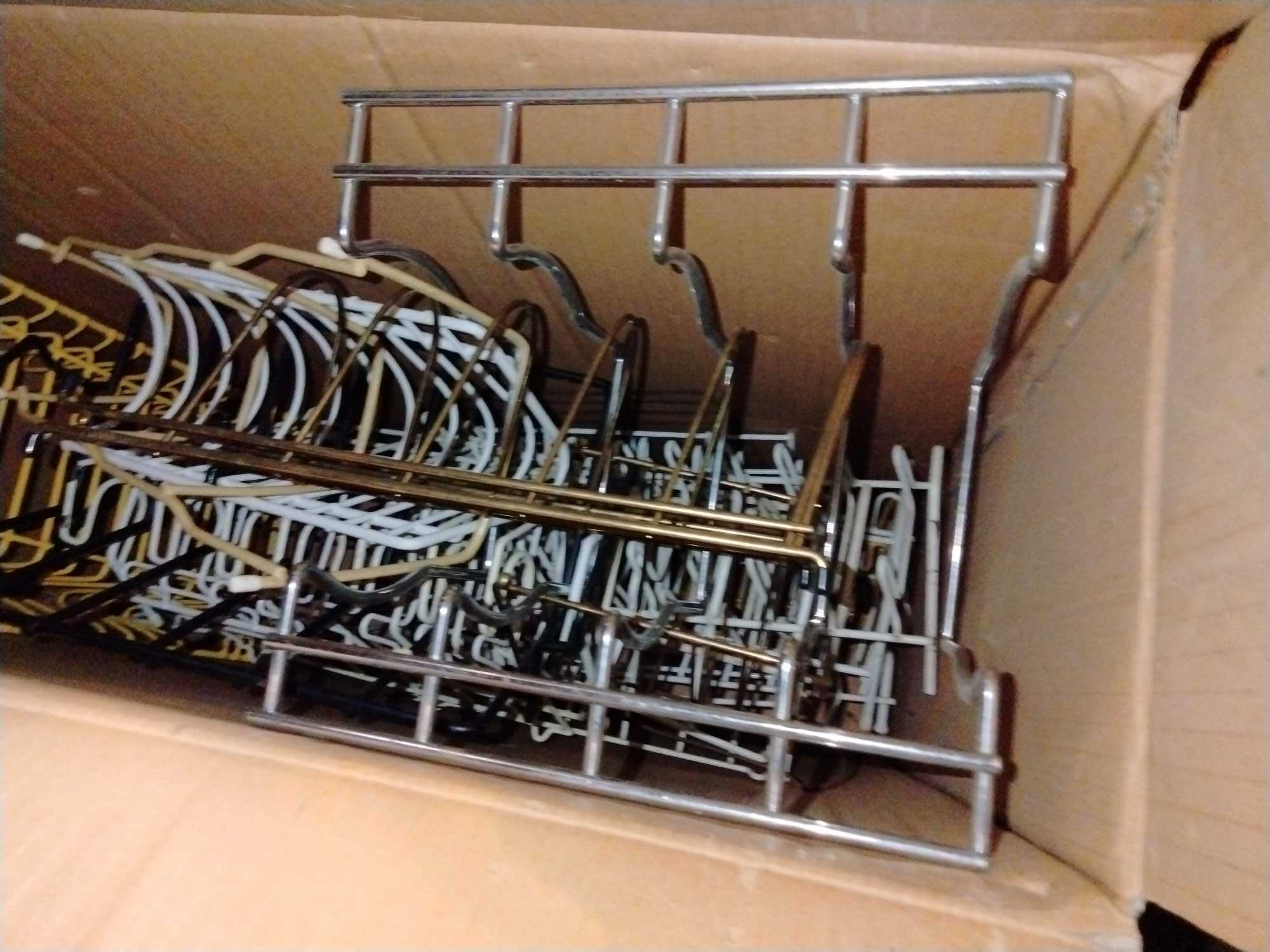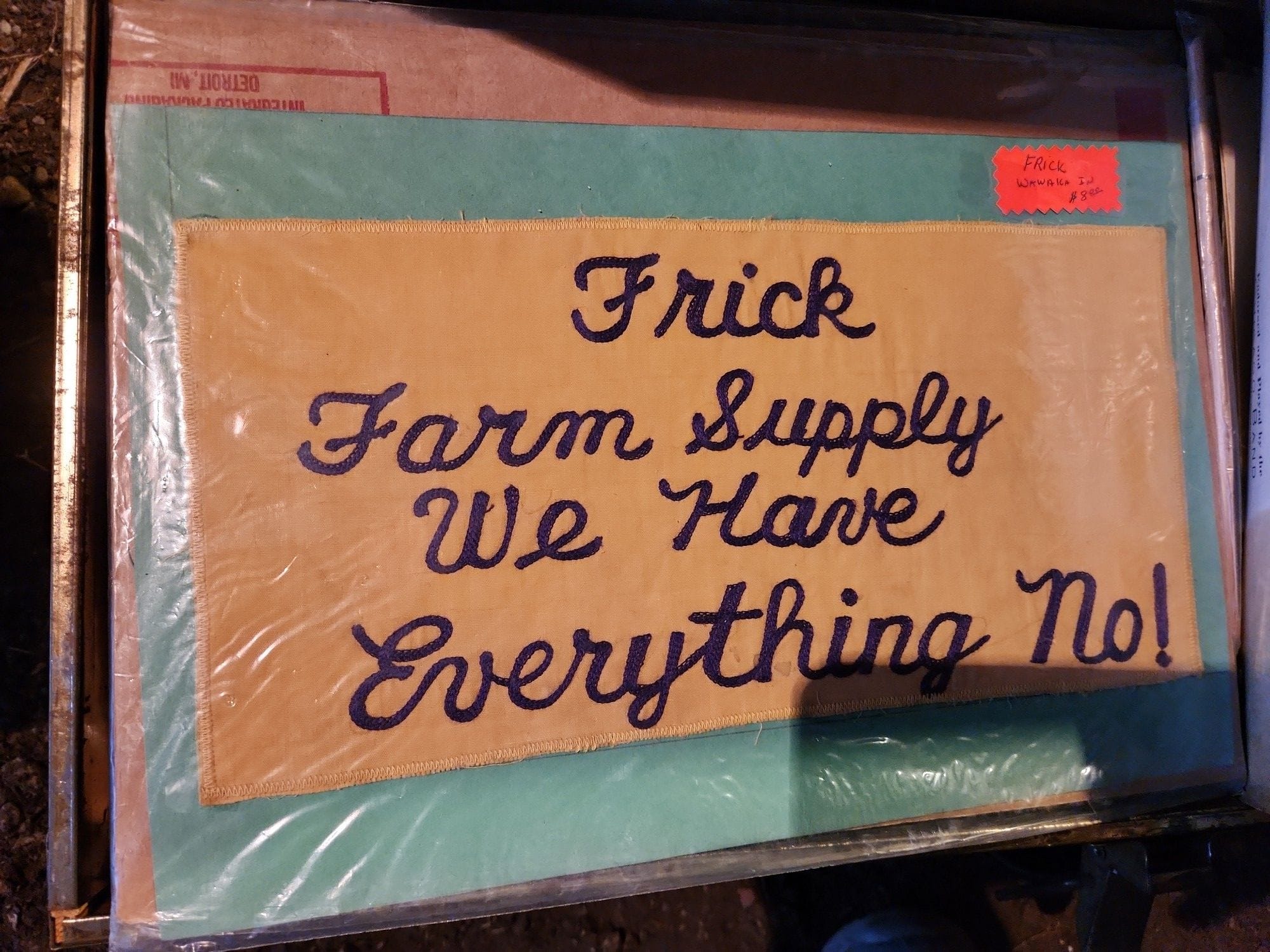 259 Pie pans, serving plates, hanging rack, tin, enamel canister, frame, wood crate - broken
