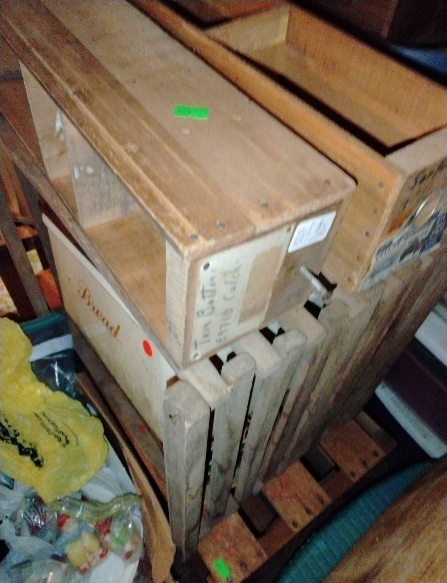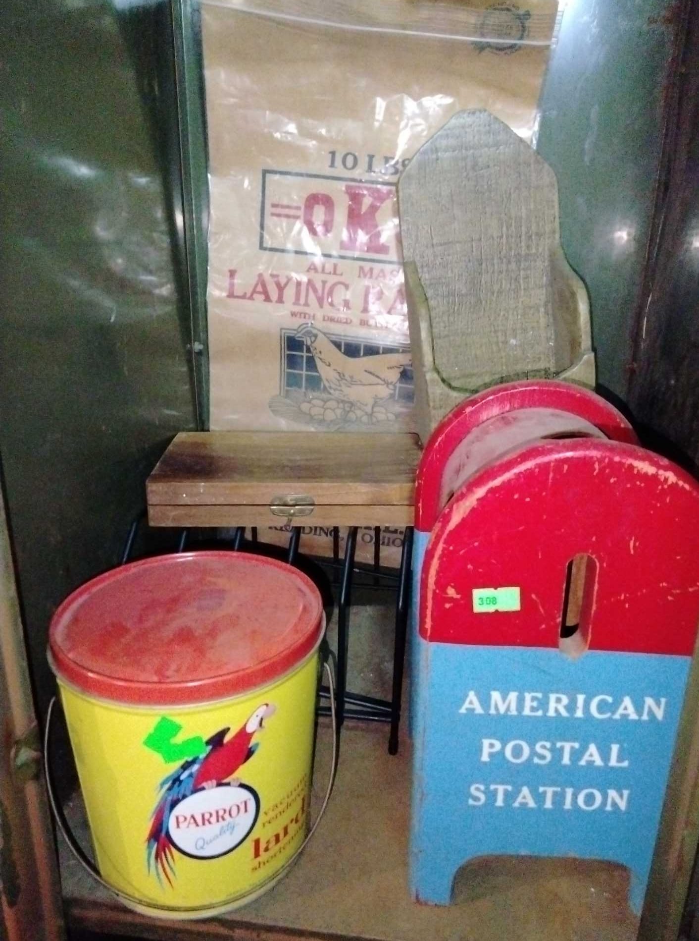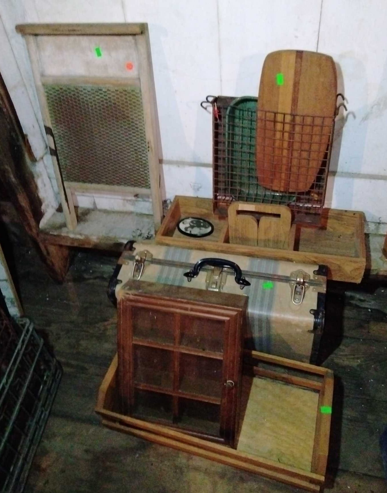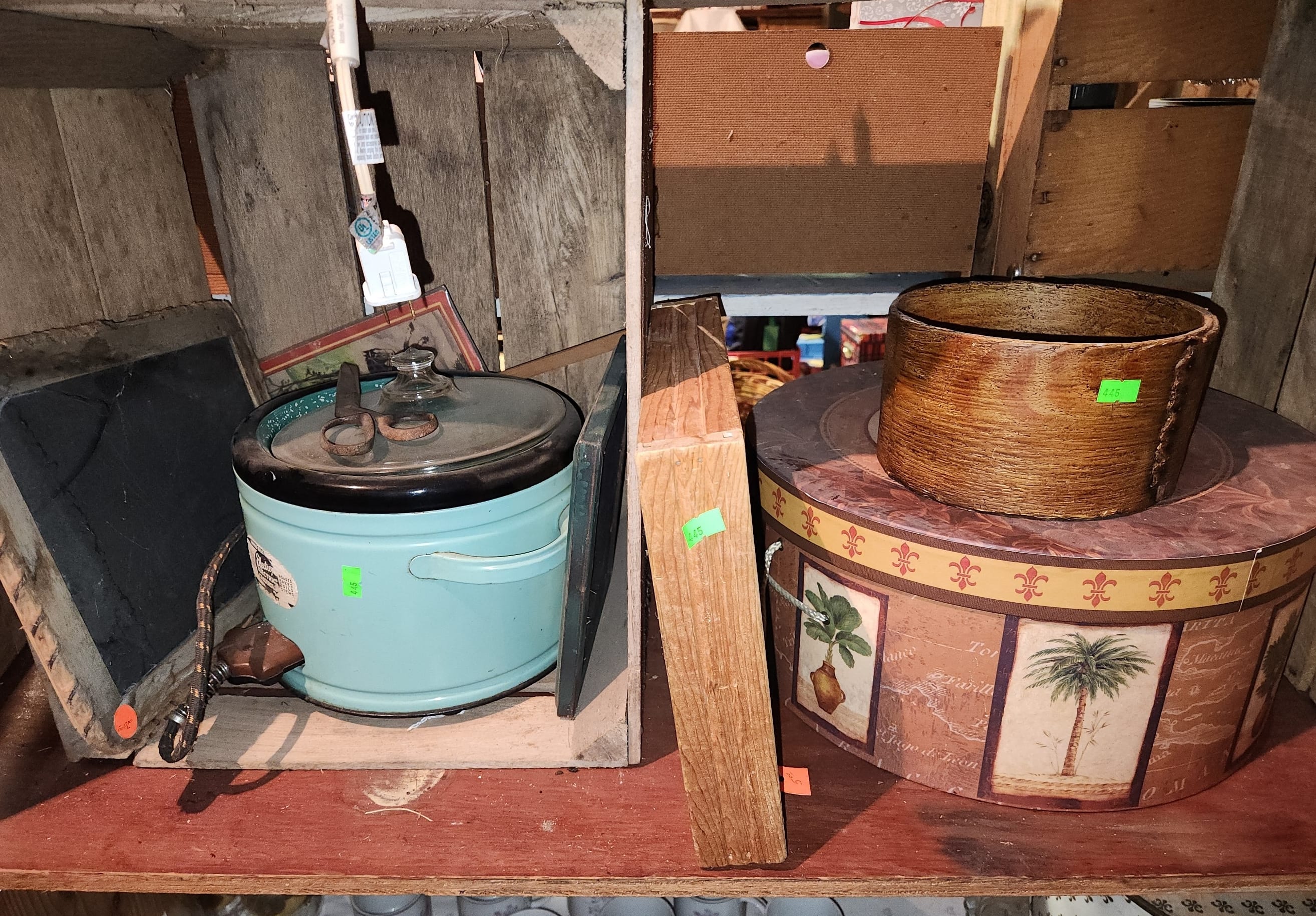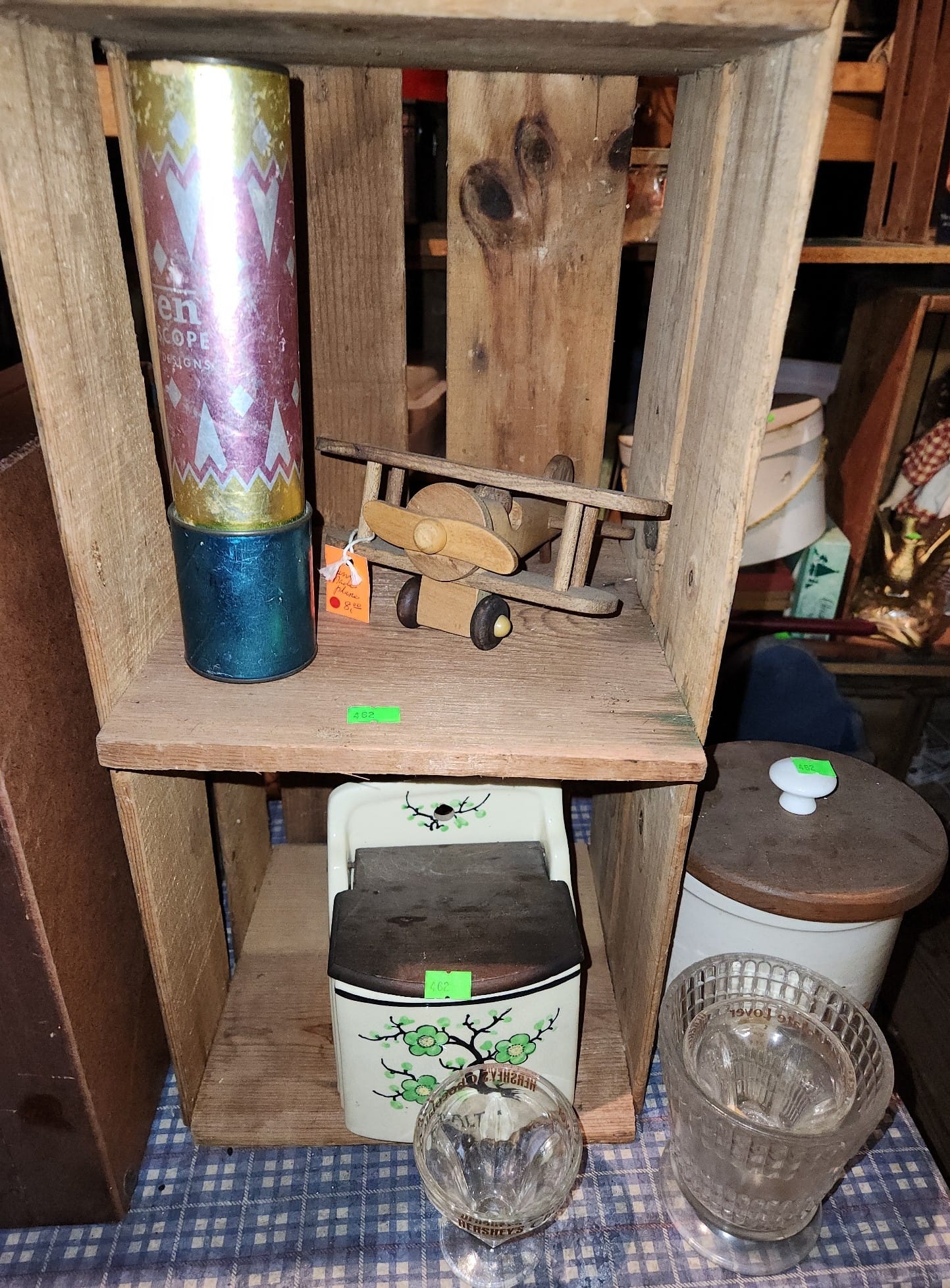 489 Checkerboard, shadow boxes, wood crate, popcorn popper, cheese box