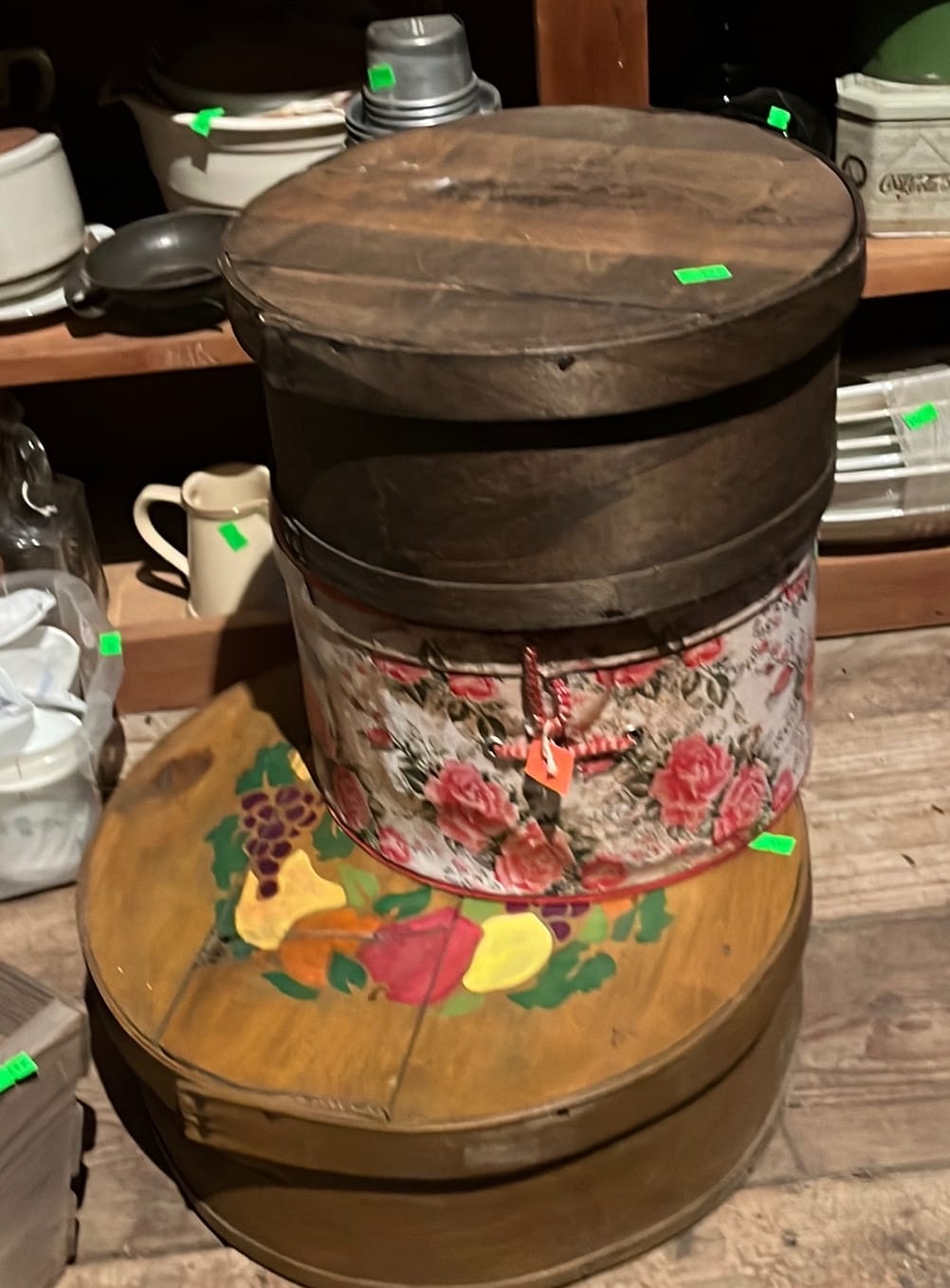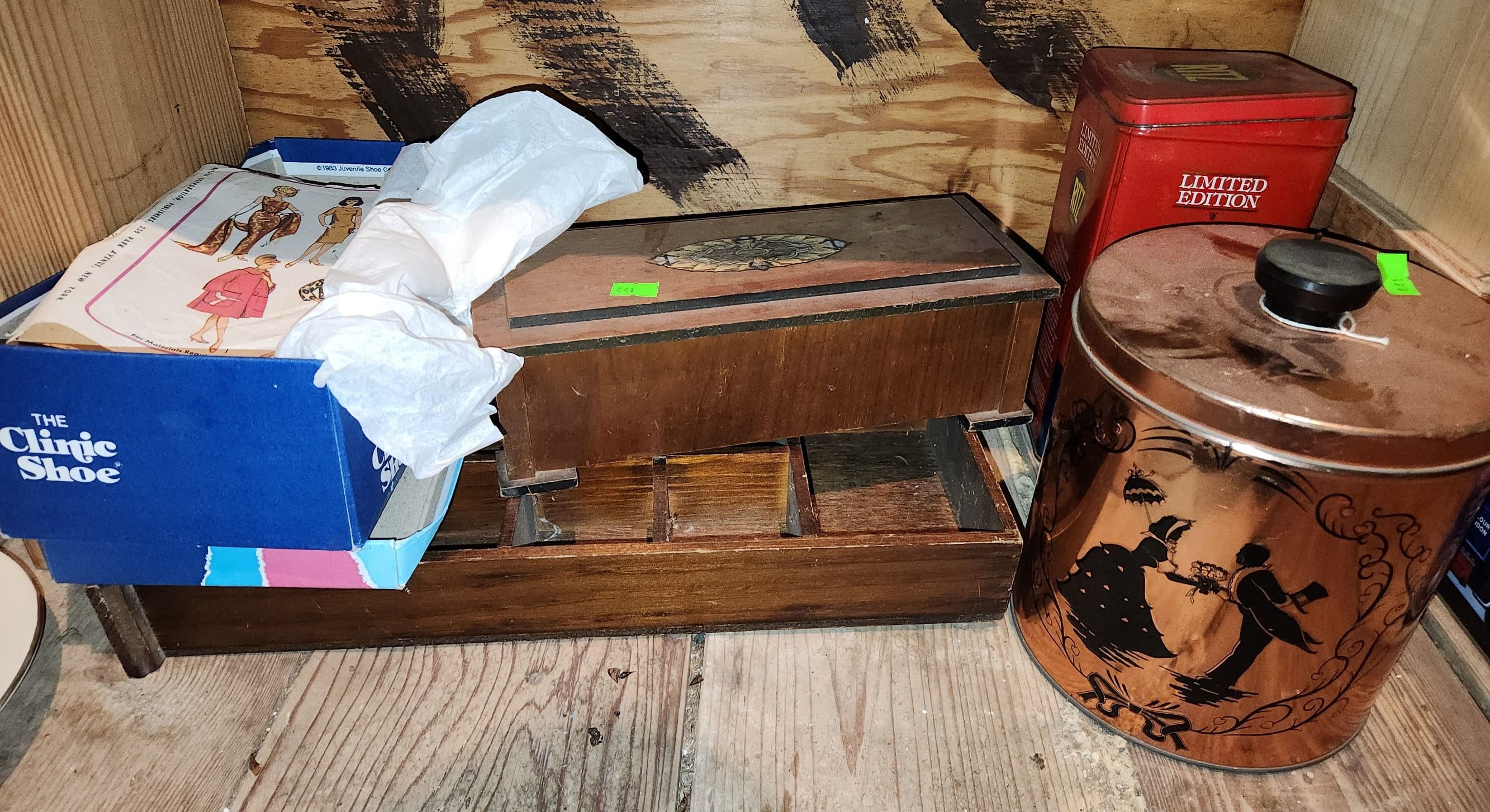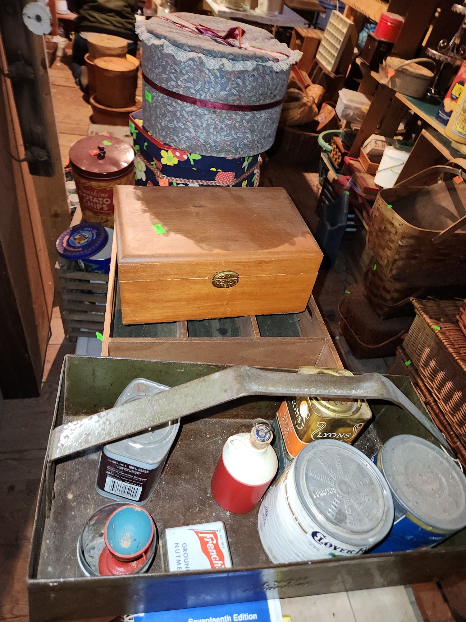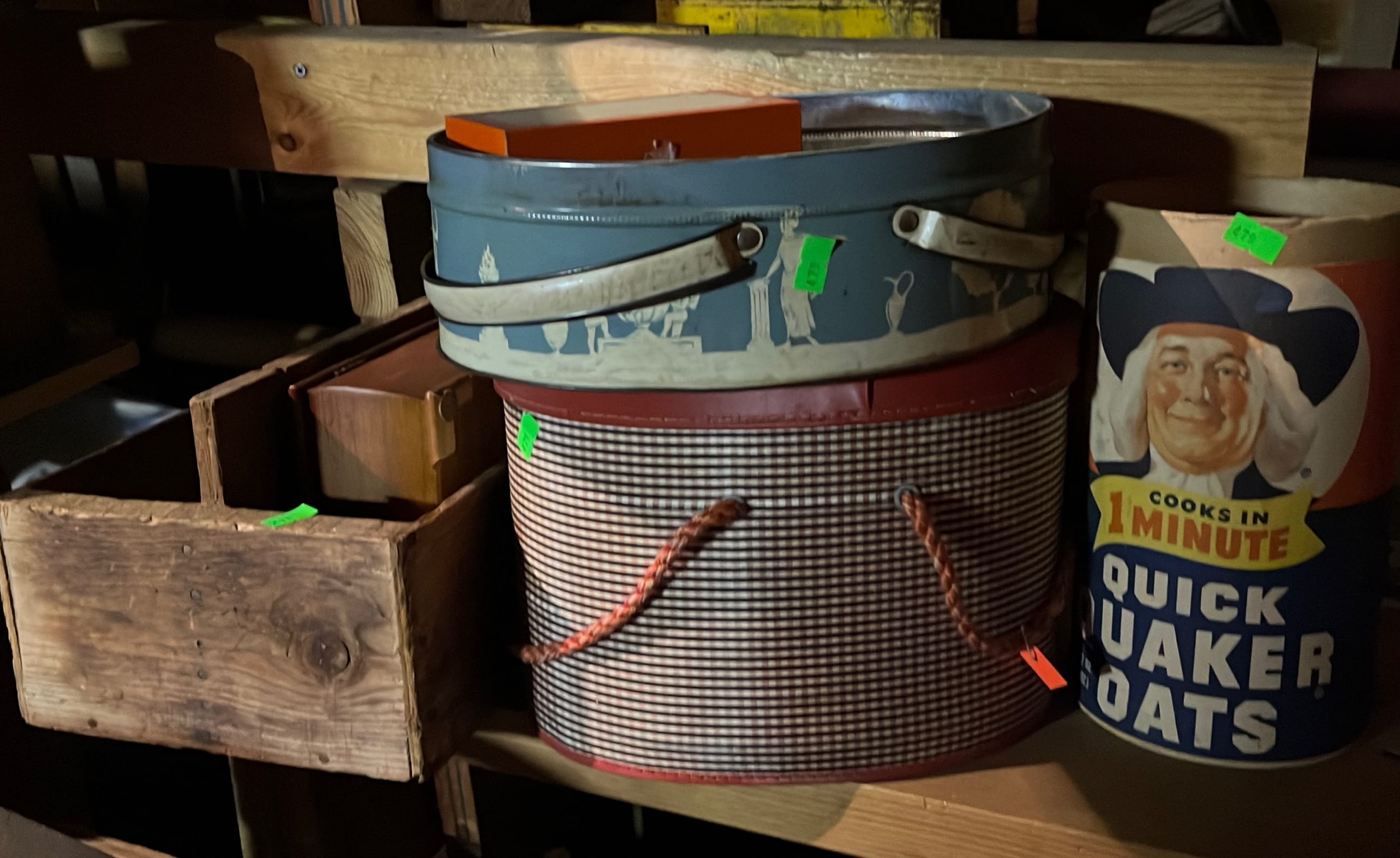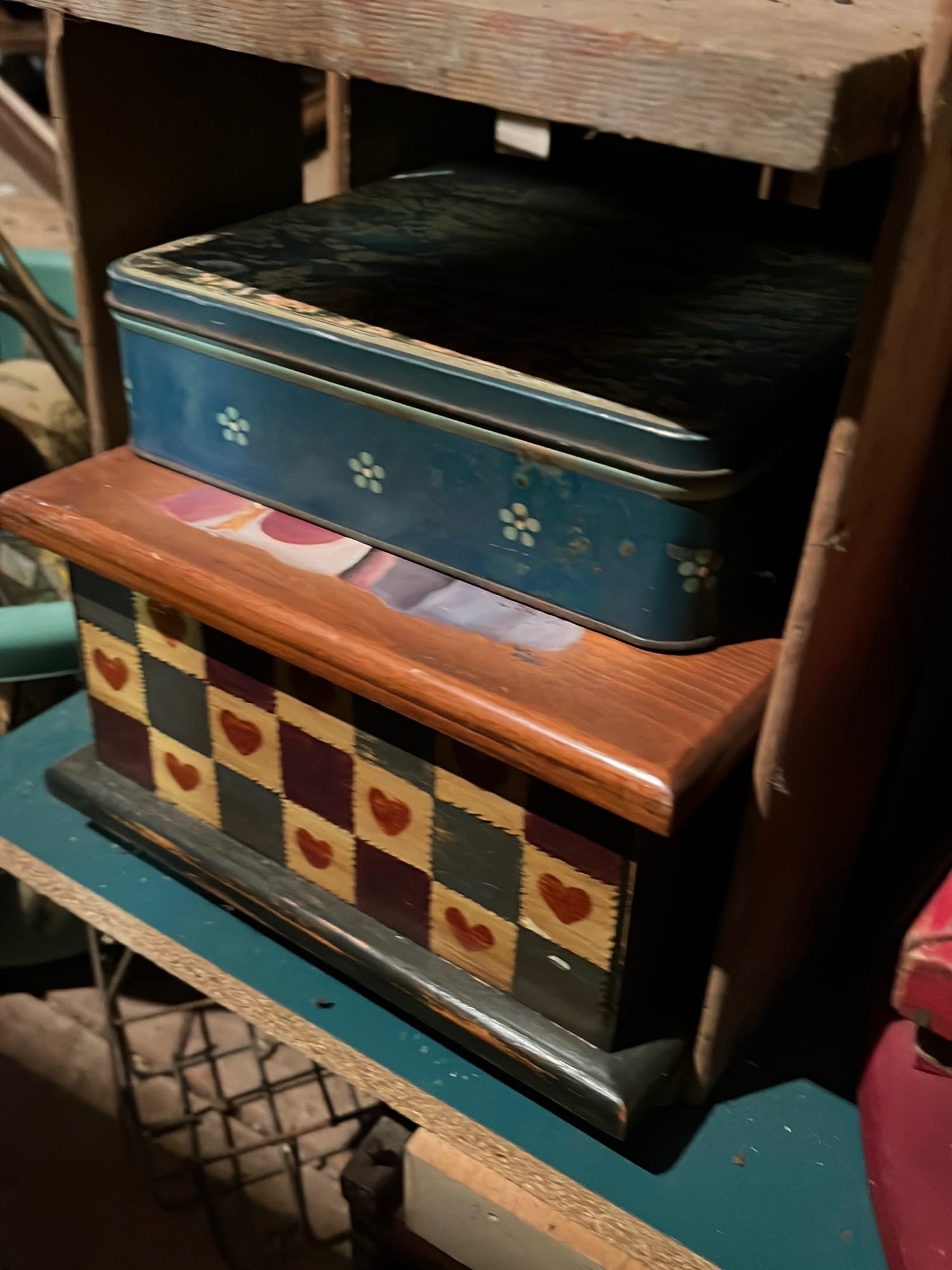 489 Checkerboard, shadow boxes, wood crate, popcorn popper, cheese box