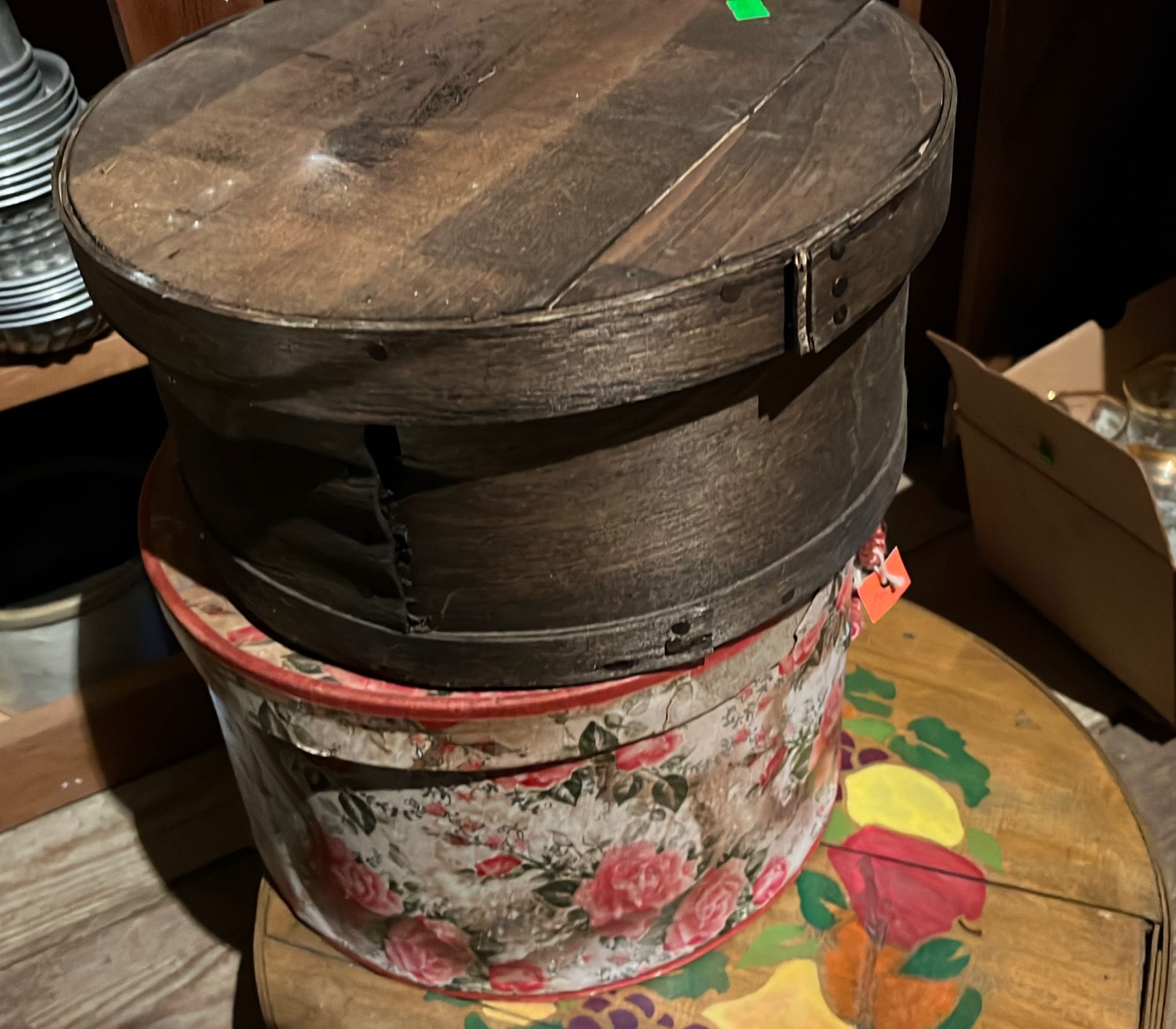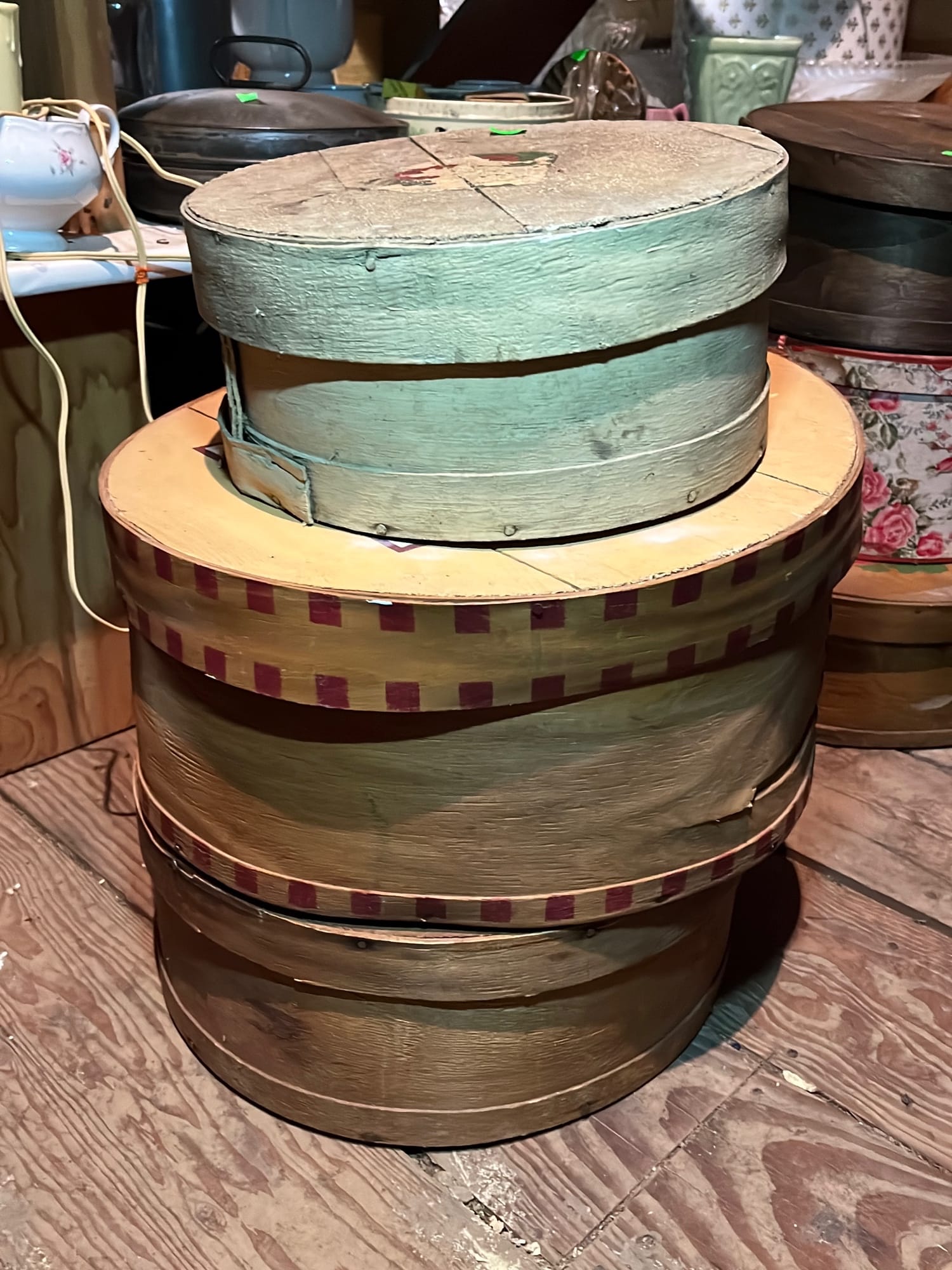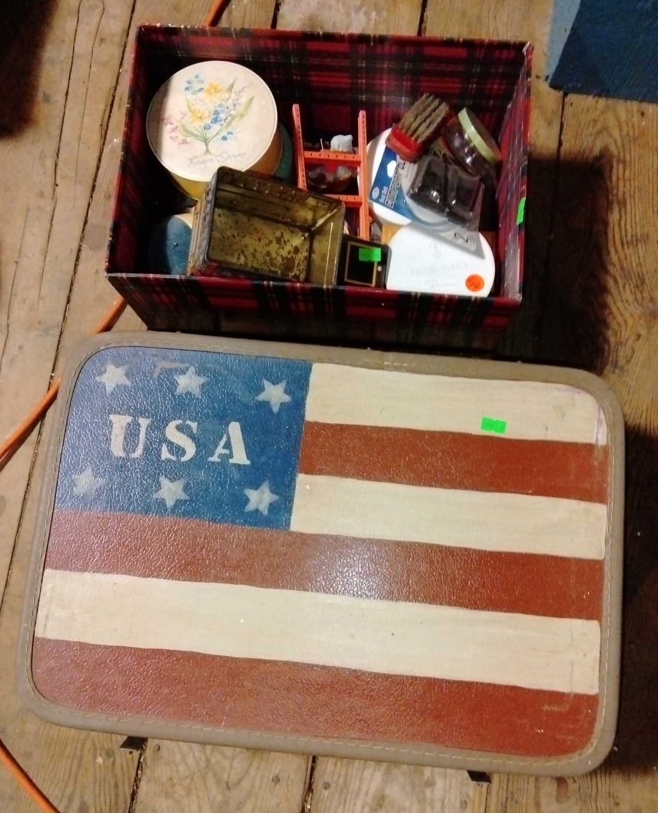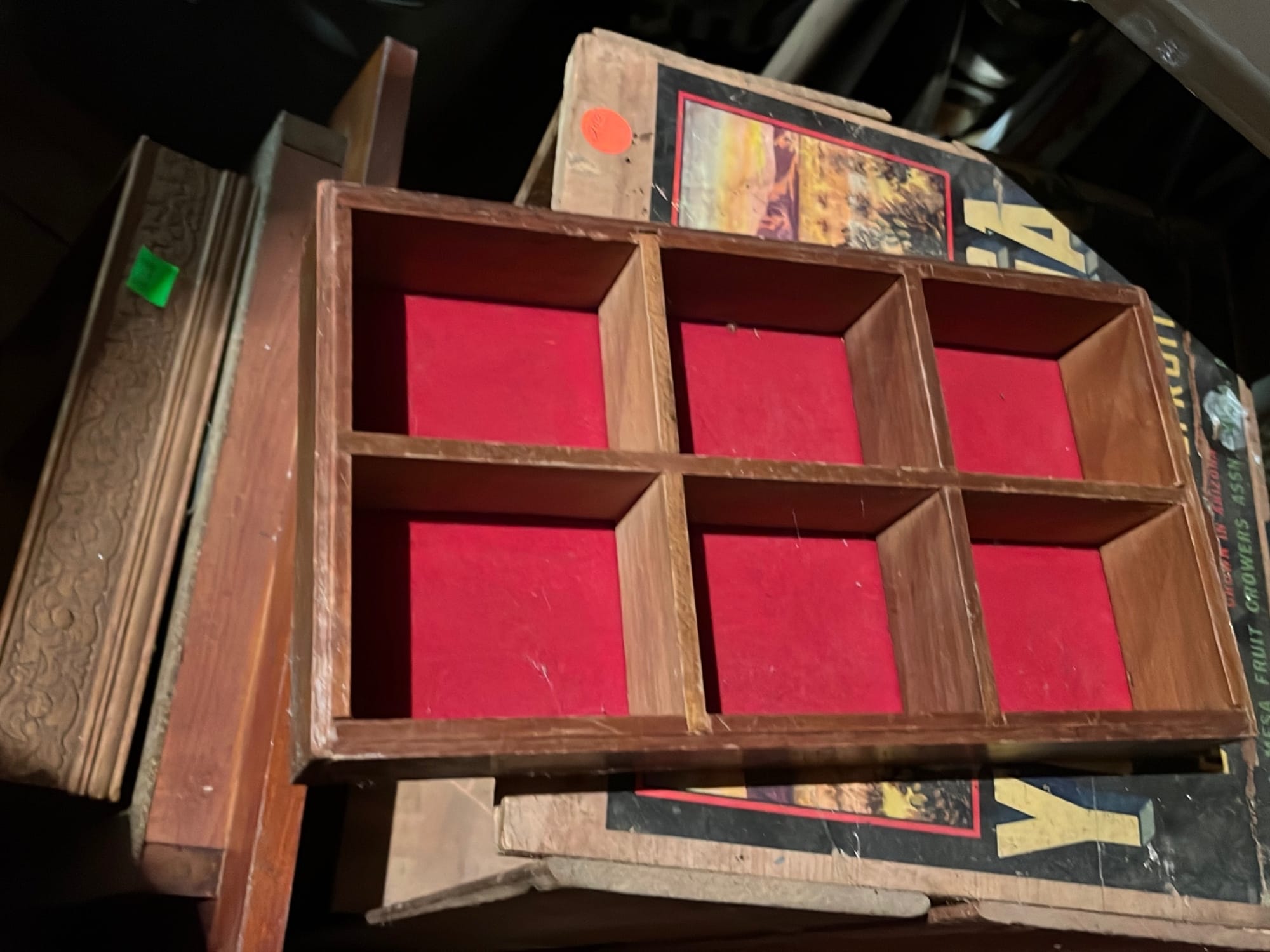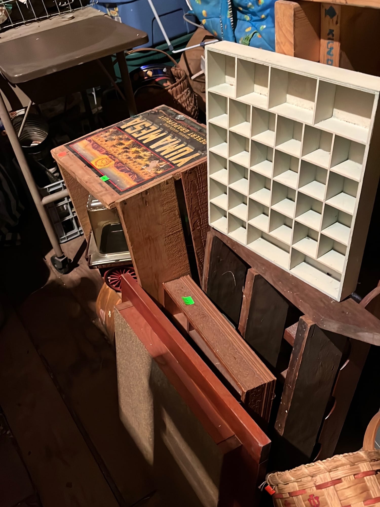 489 Checkerboard, shadow boxes, wood crate, popcorn popper, cheese box
