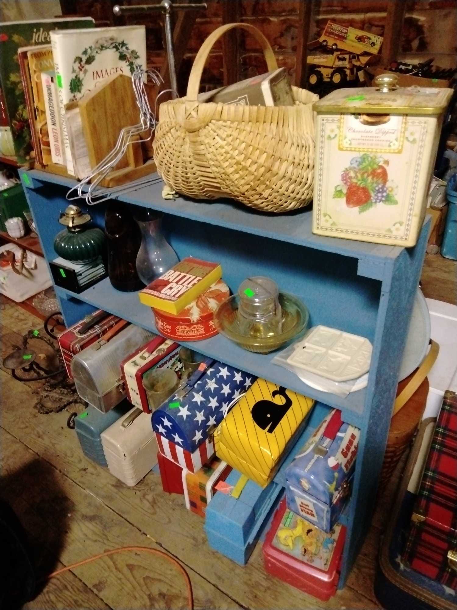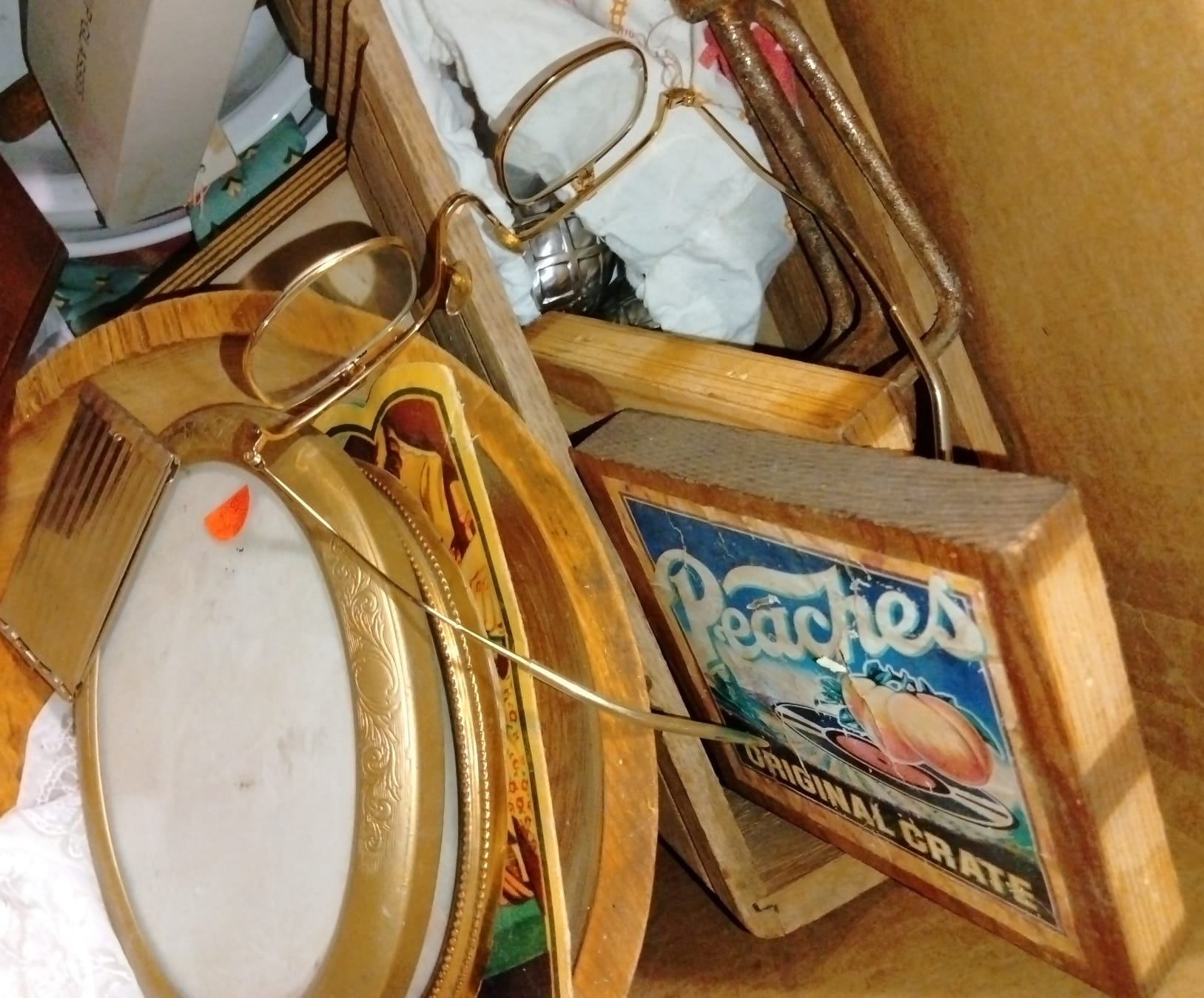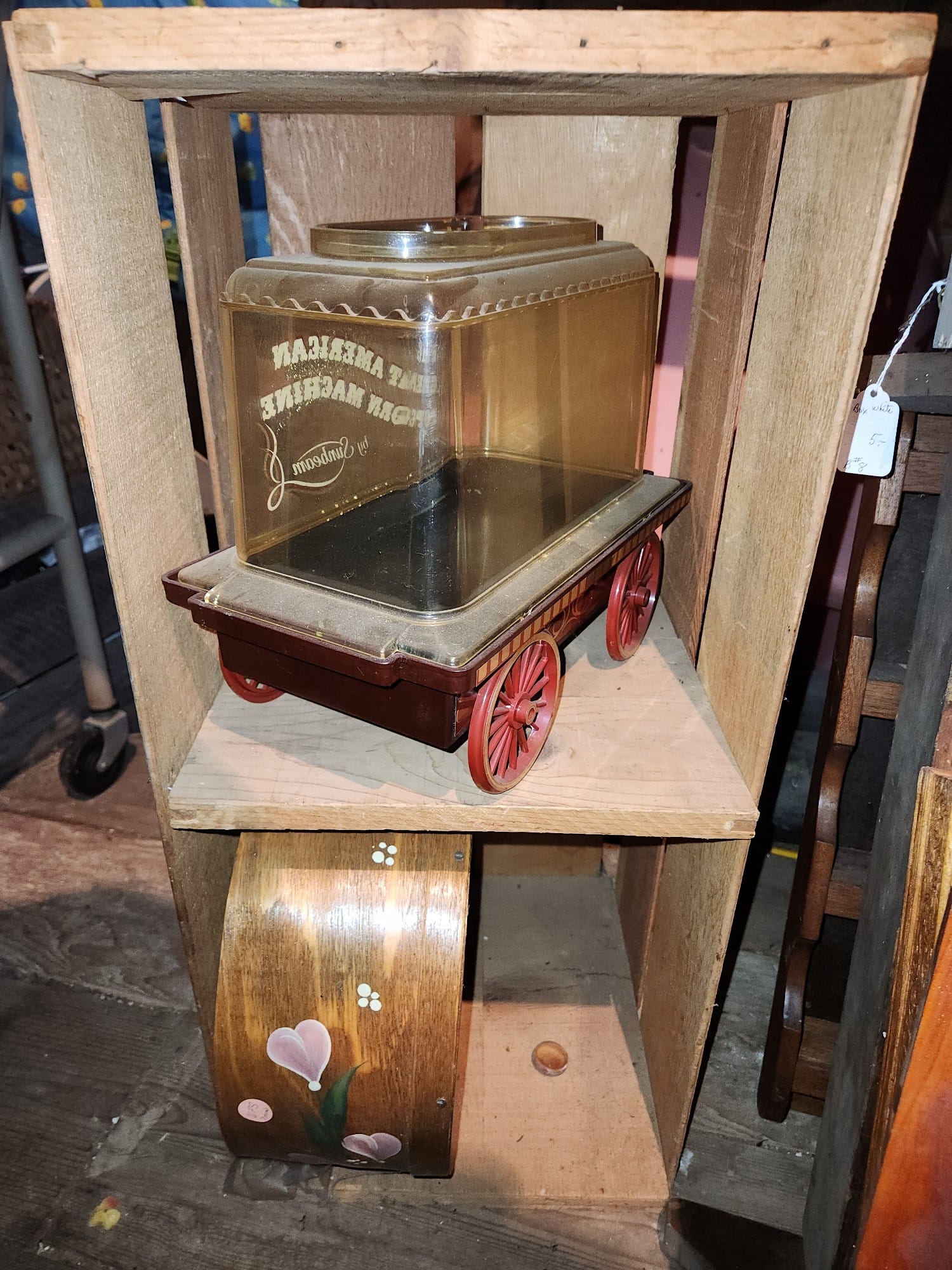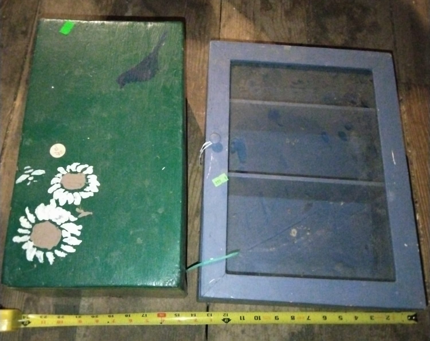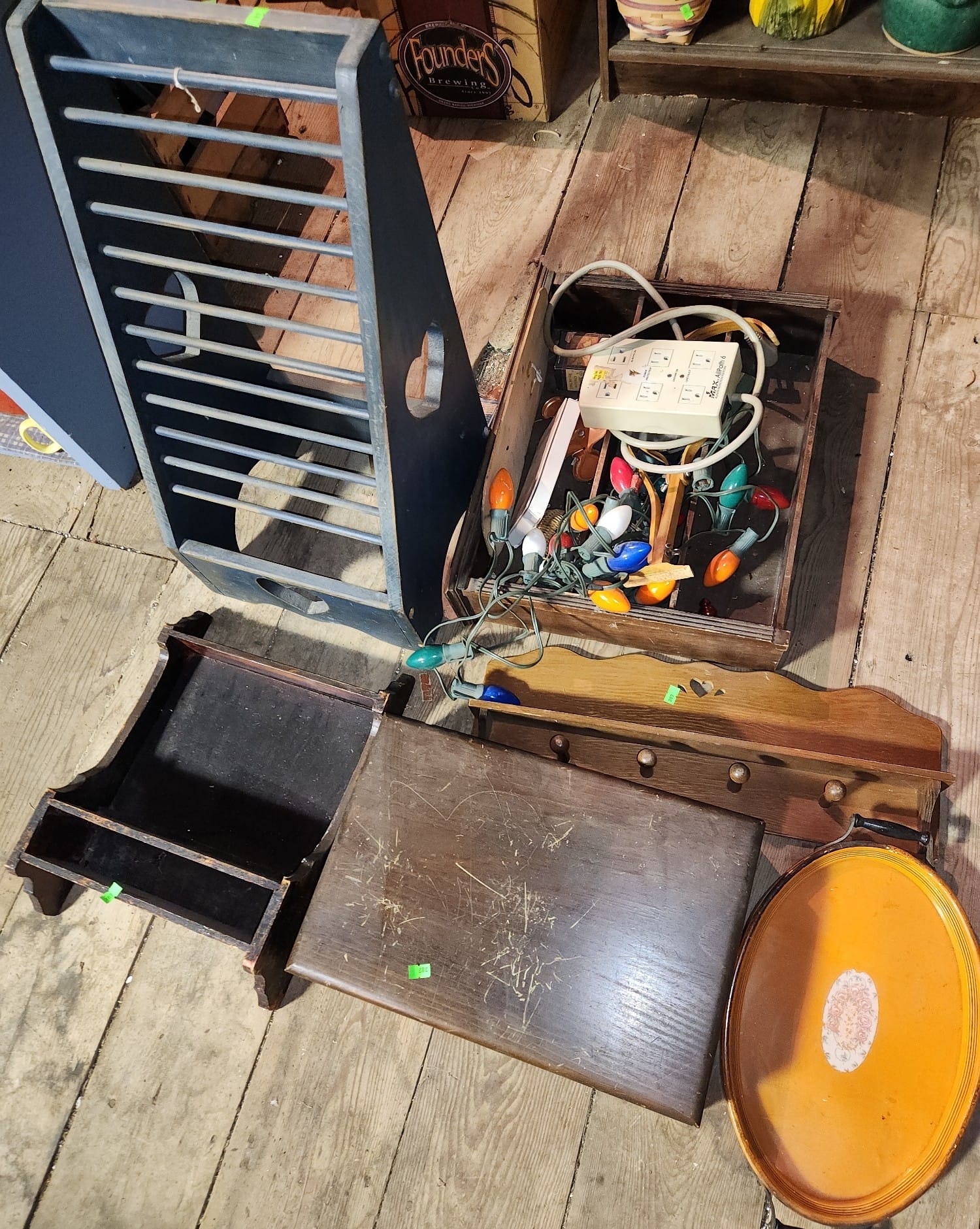 489 Checkerboard, shadow boxes, wood crate, popcorn popper, cheese box