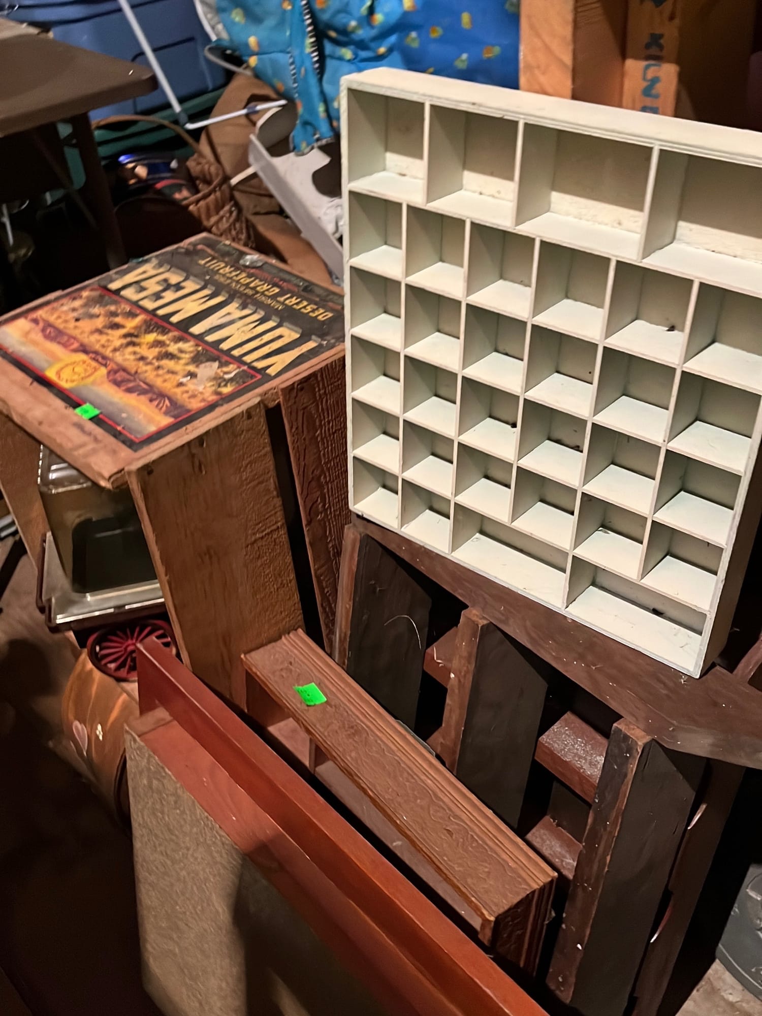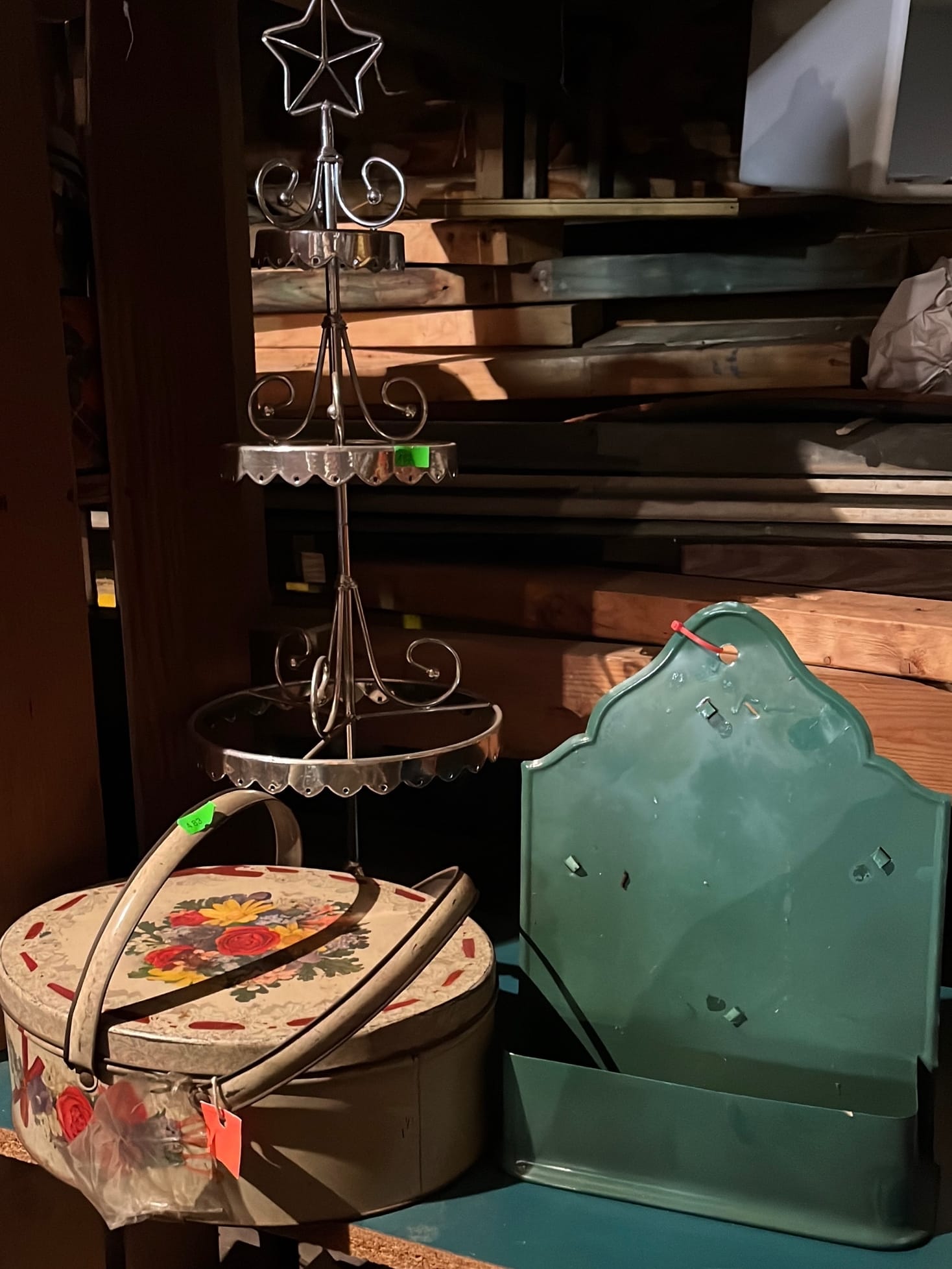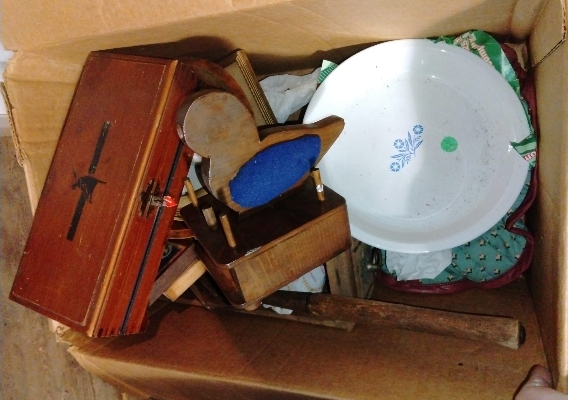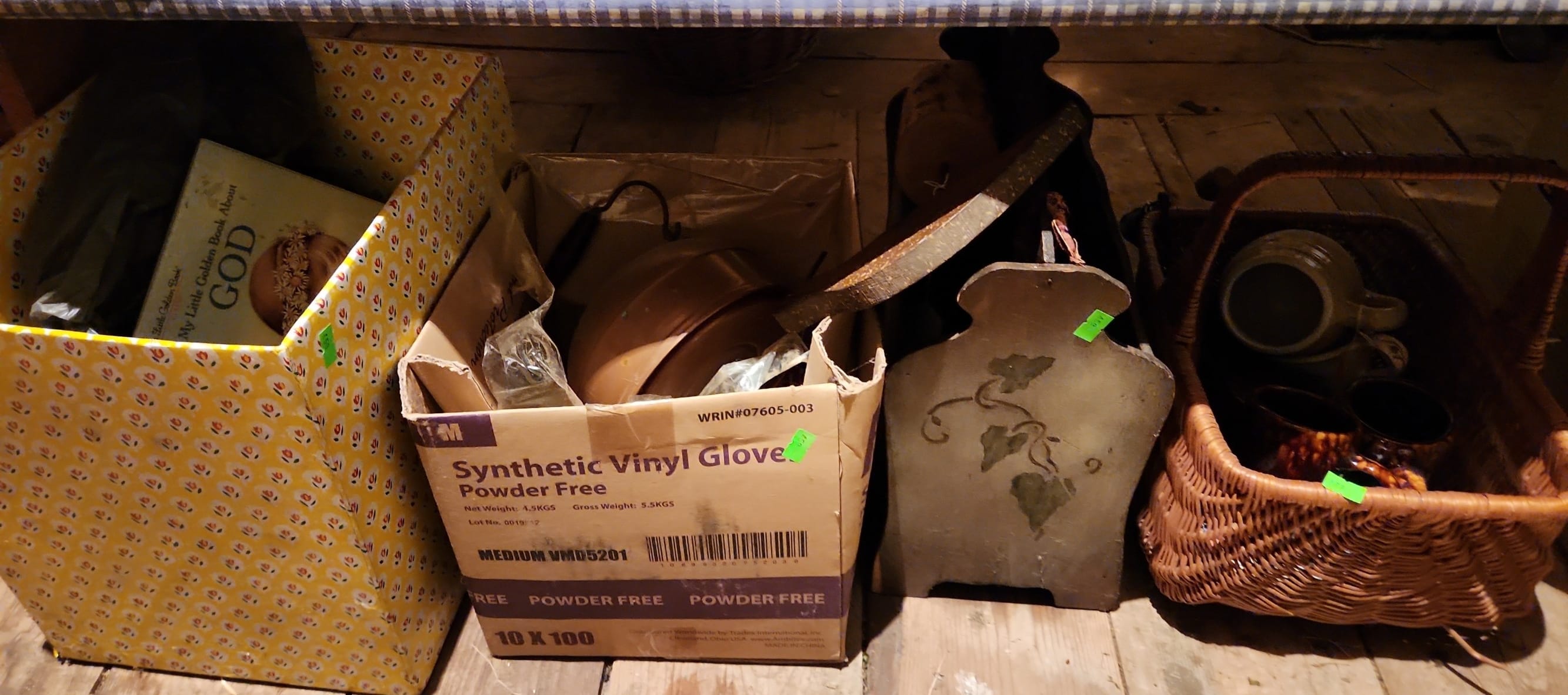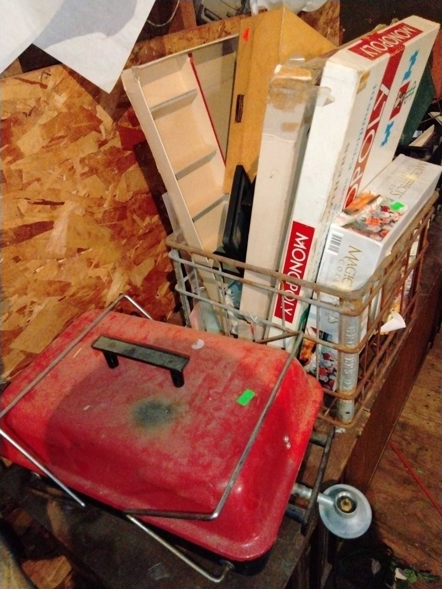 489 Checkerboard, shadow boxes, wood crate, popcorn popper, cheese box