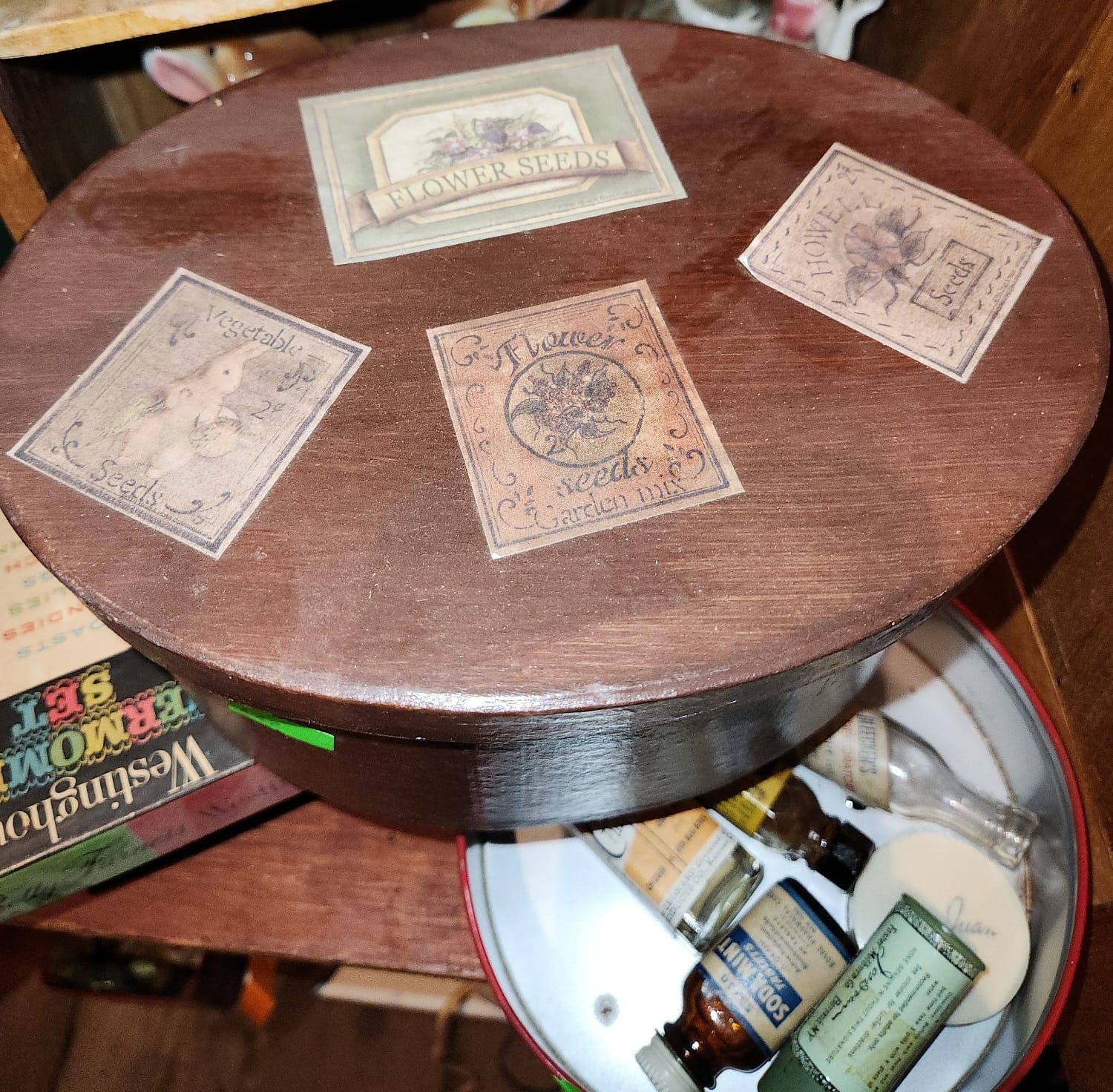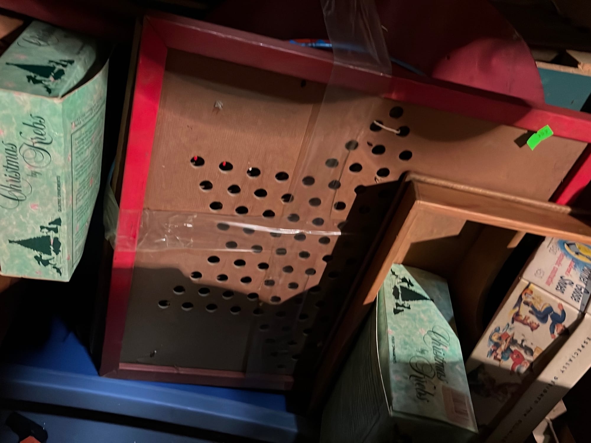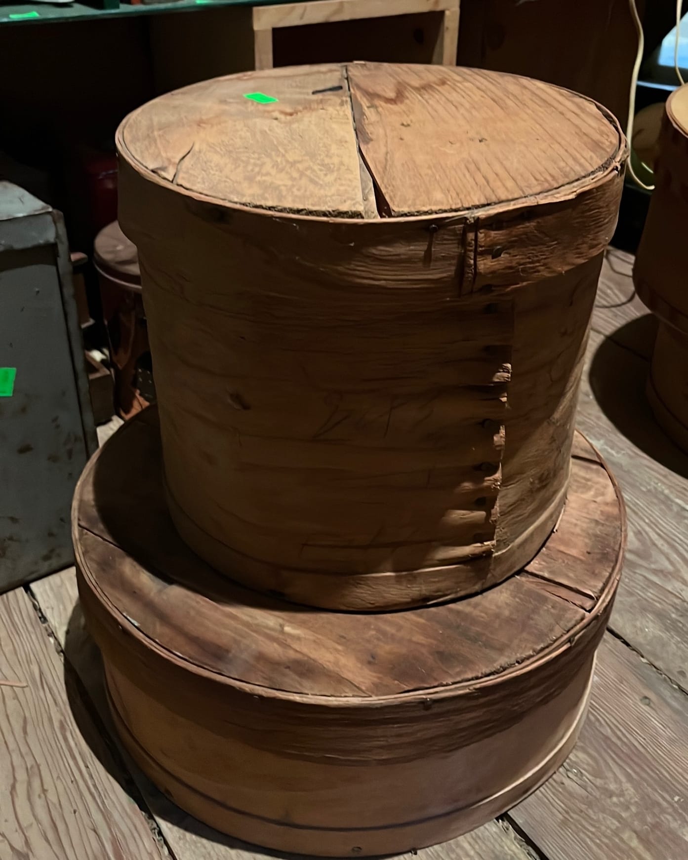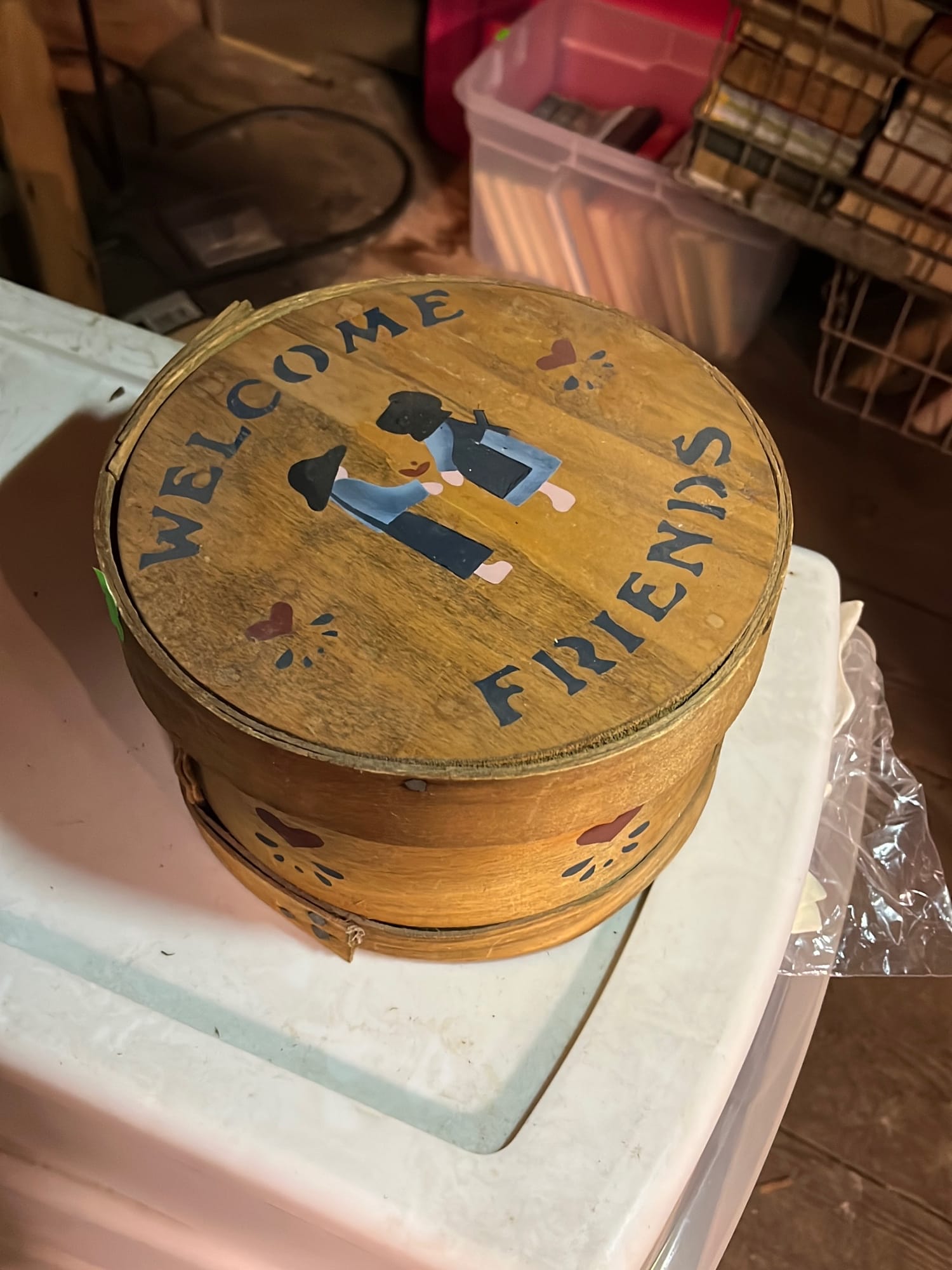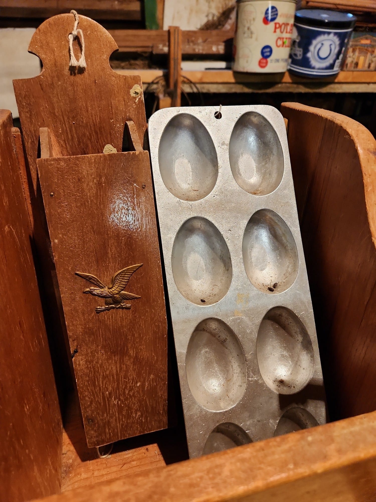 489 Checkerboard, shadow boxes, wood crate, popcorn popper, cheese box