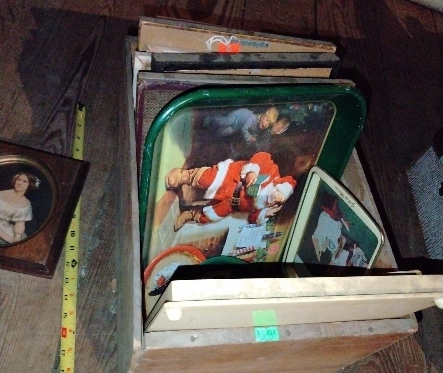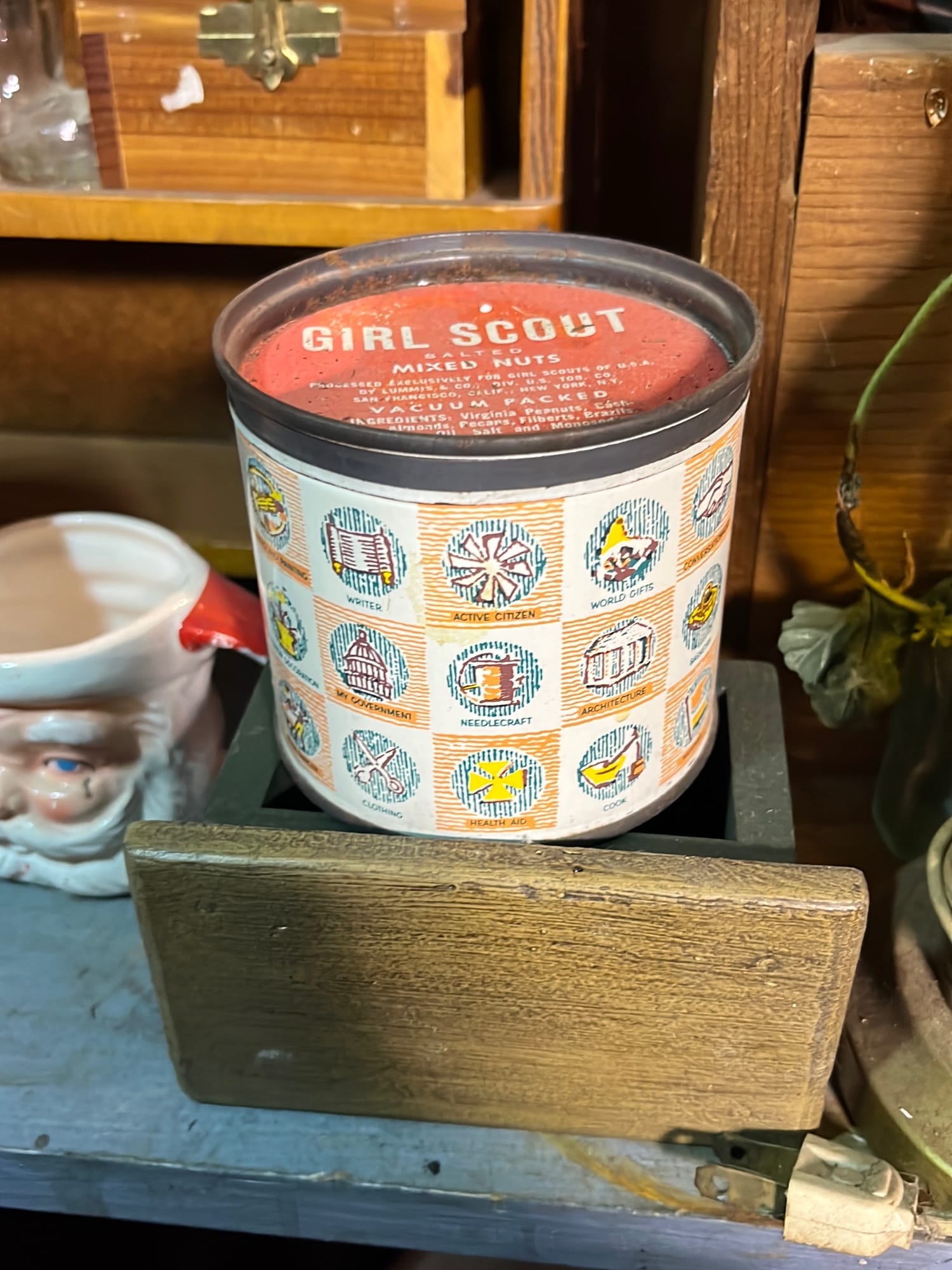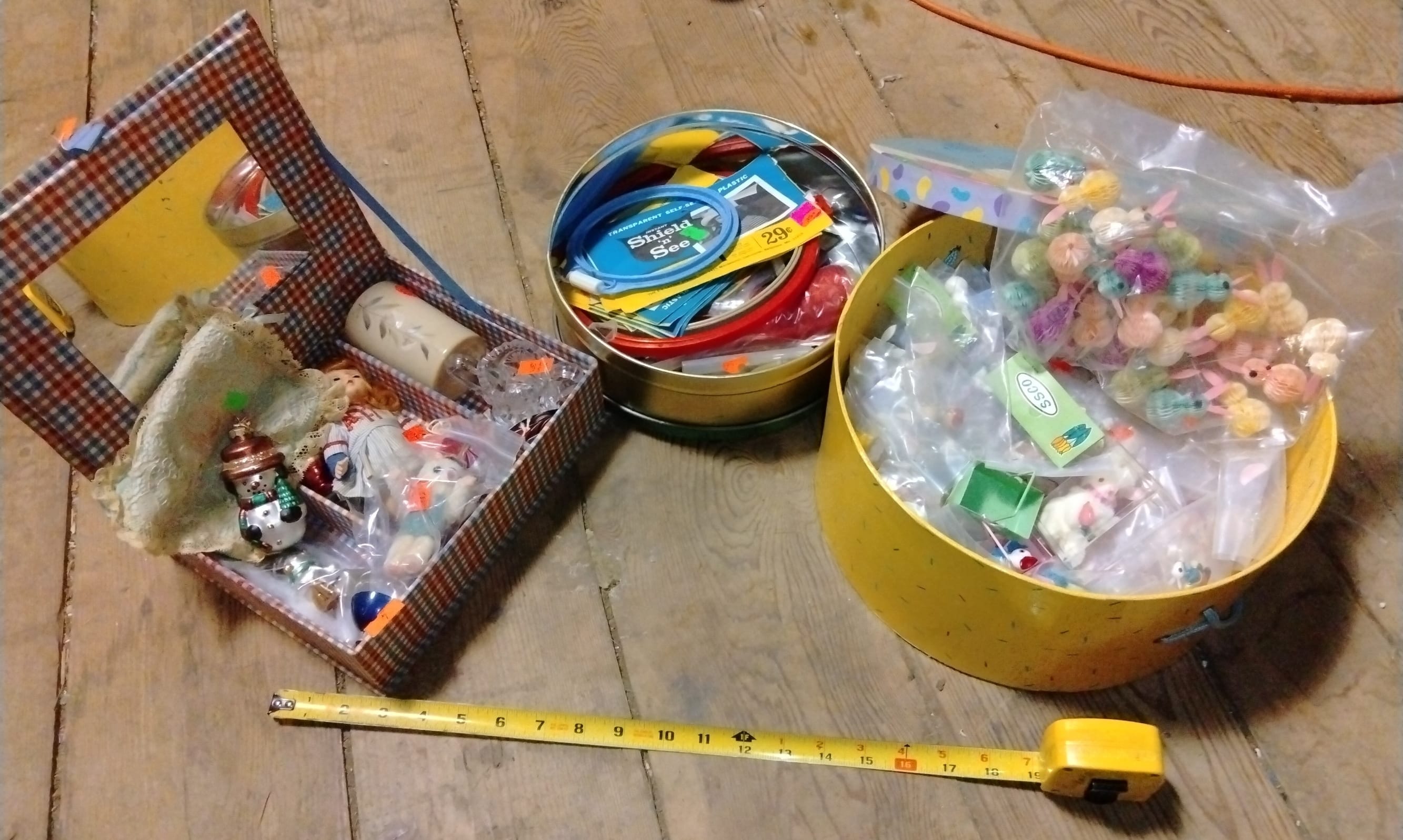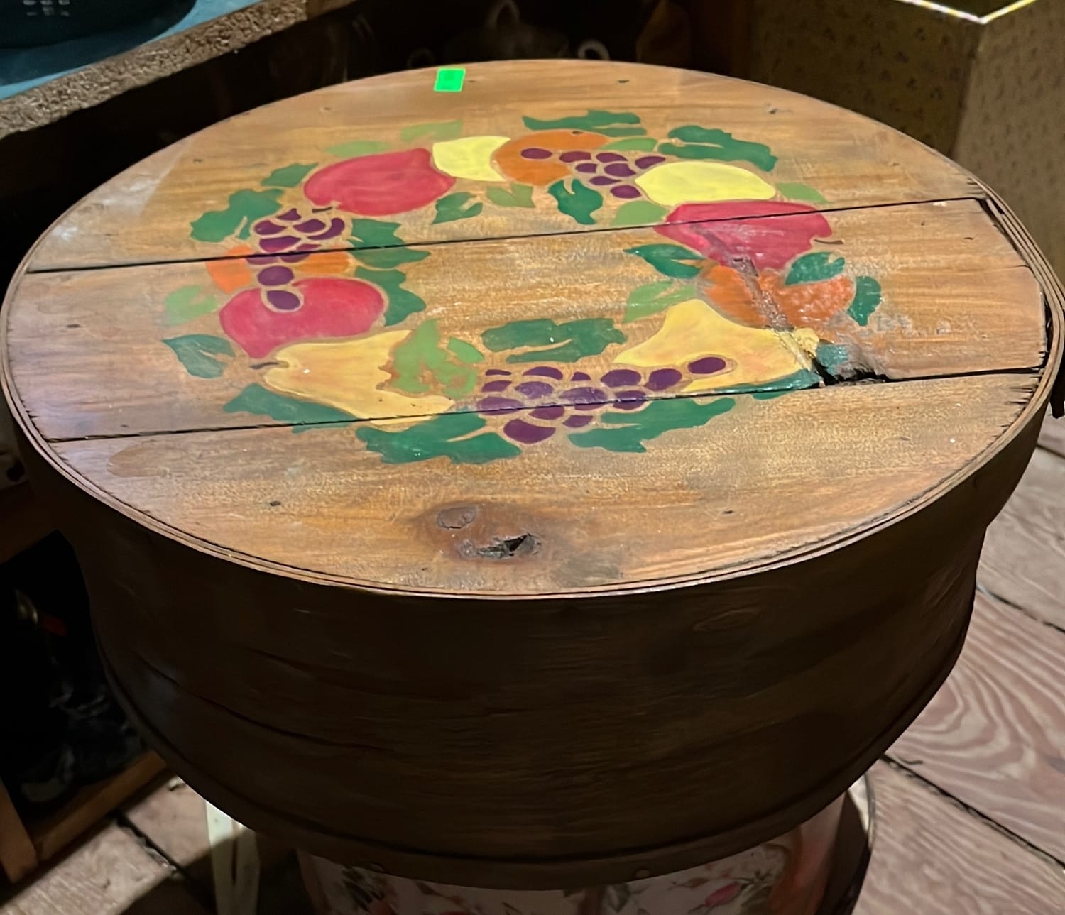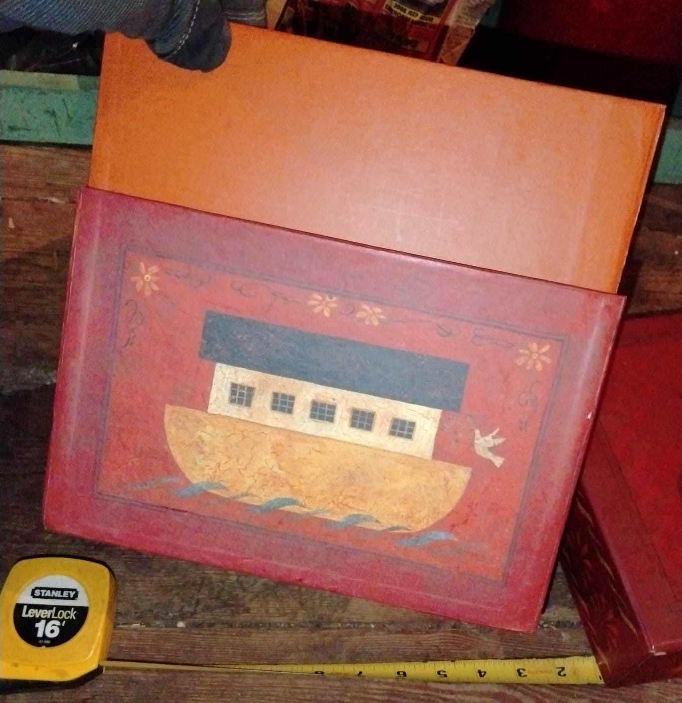 489 Checkerboard, shadow boxes, wood crate, popcorn popper, cheese box