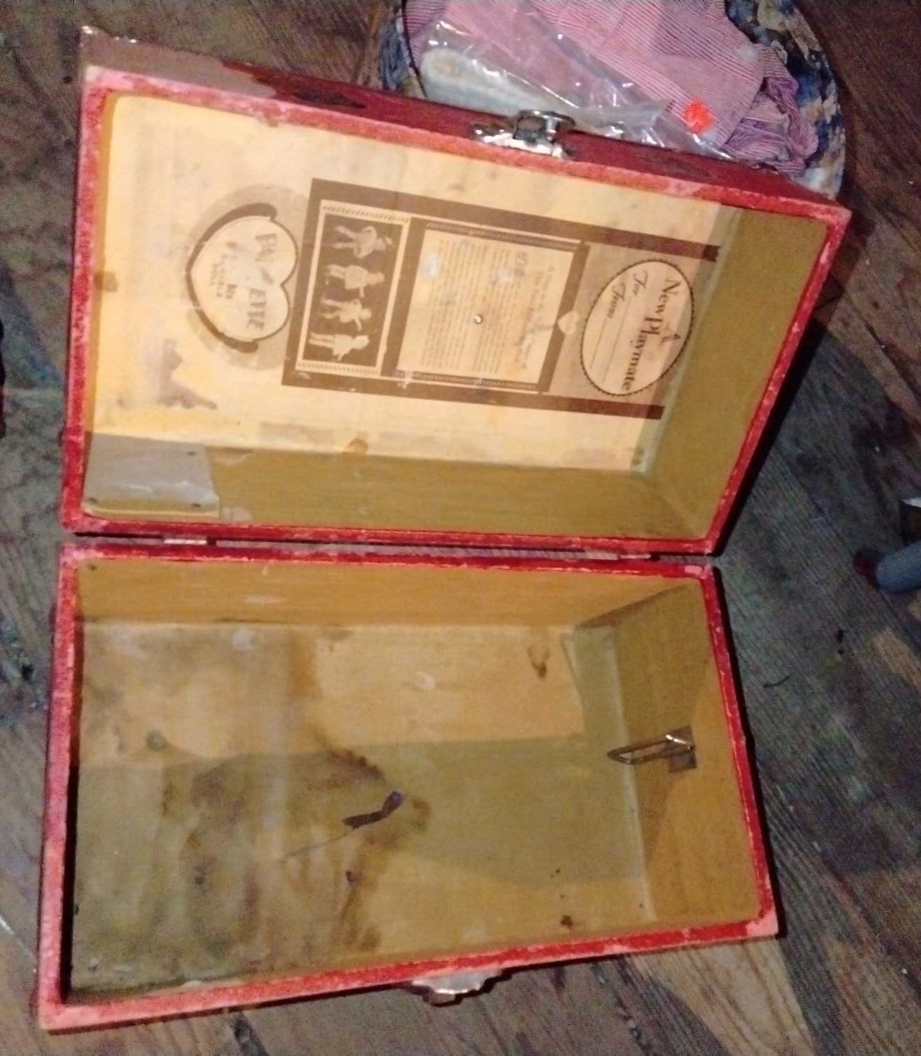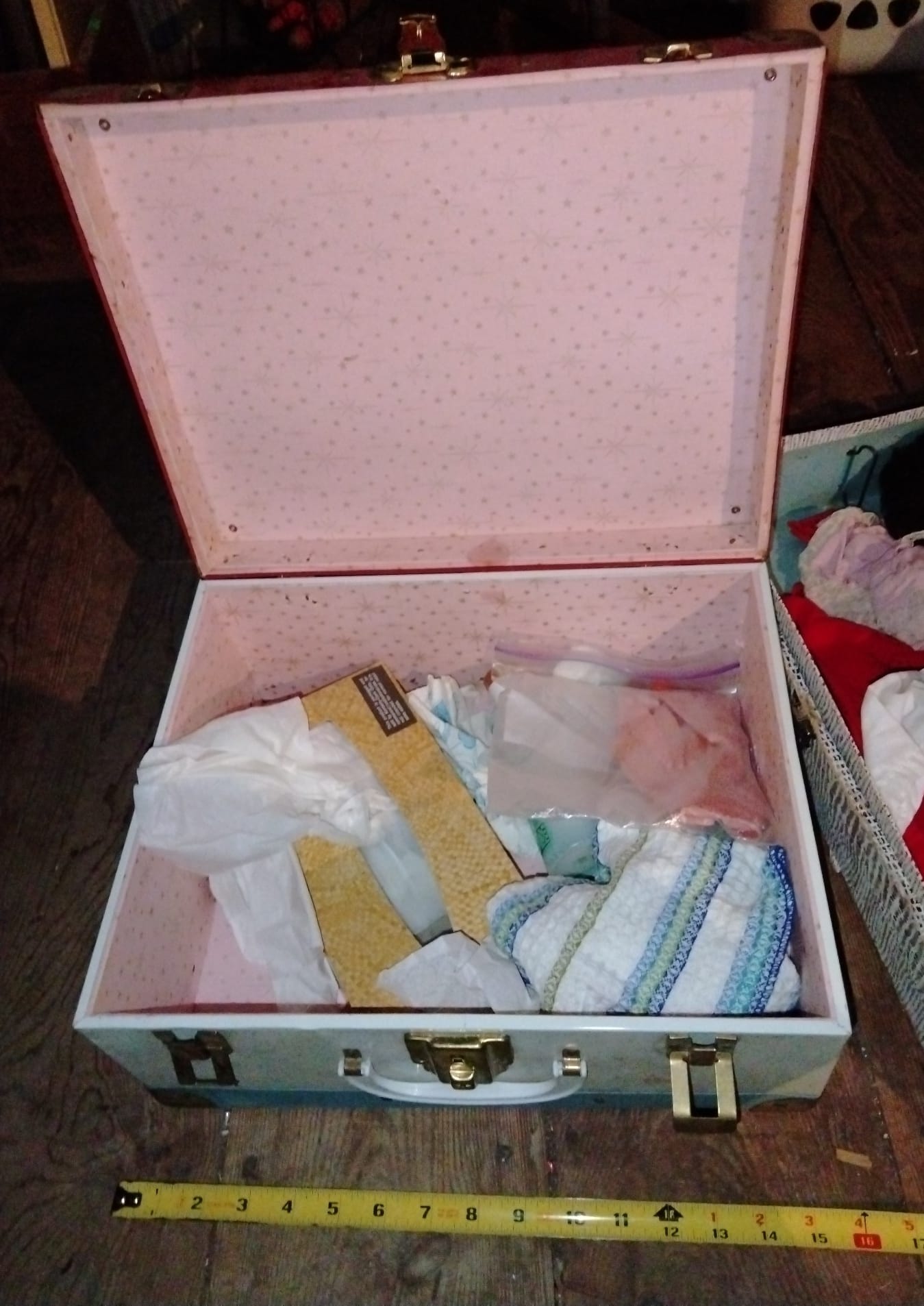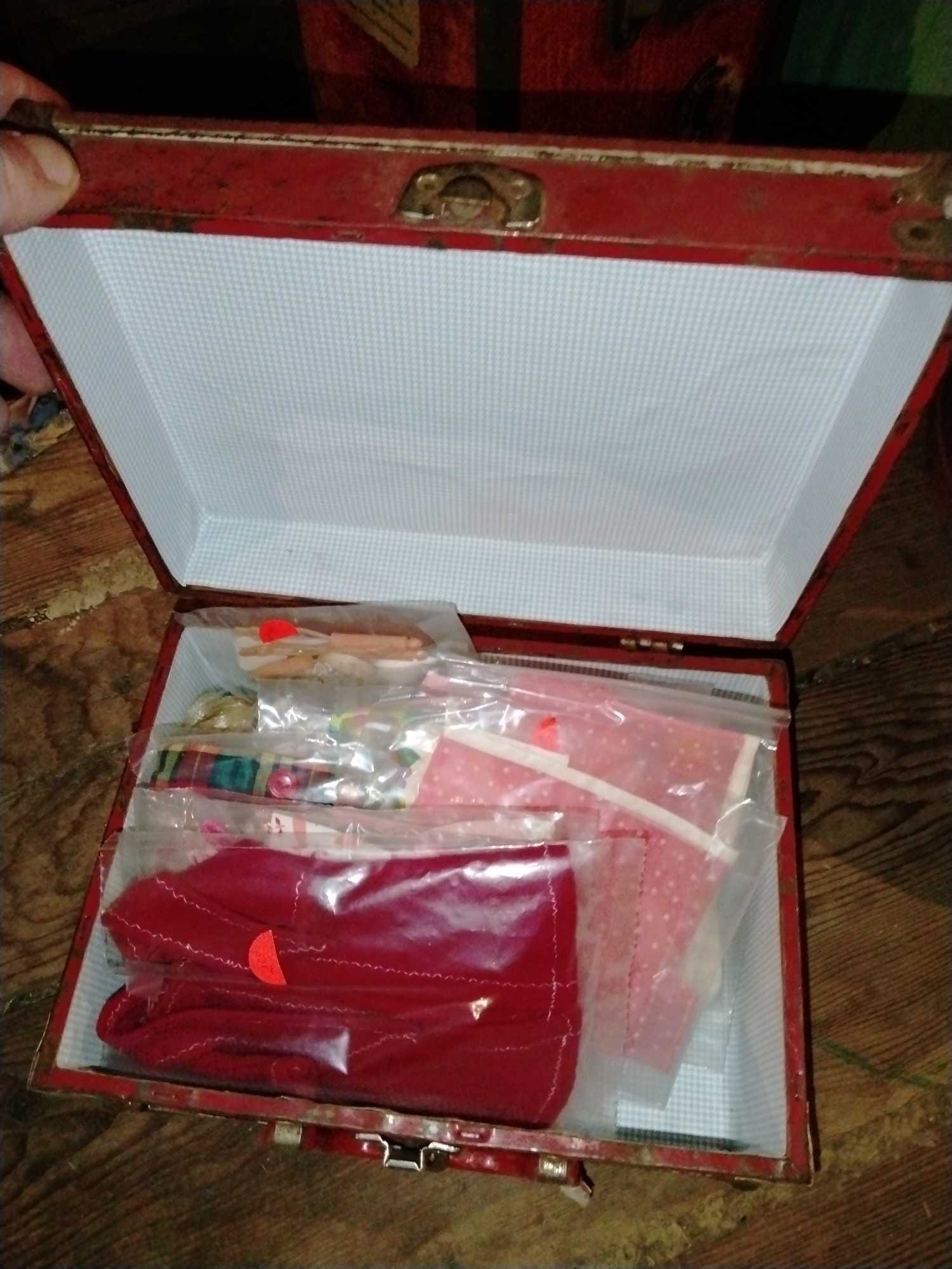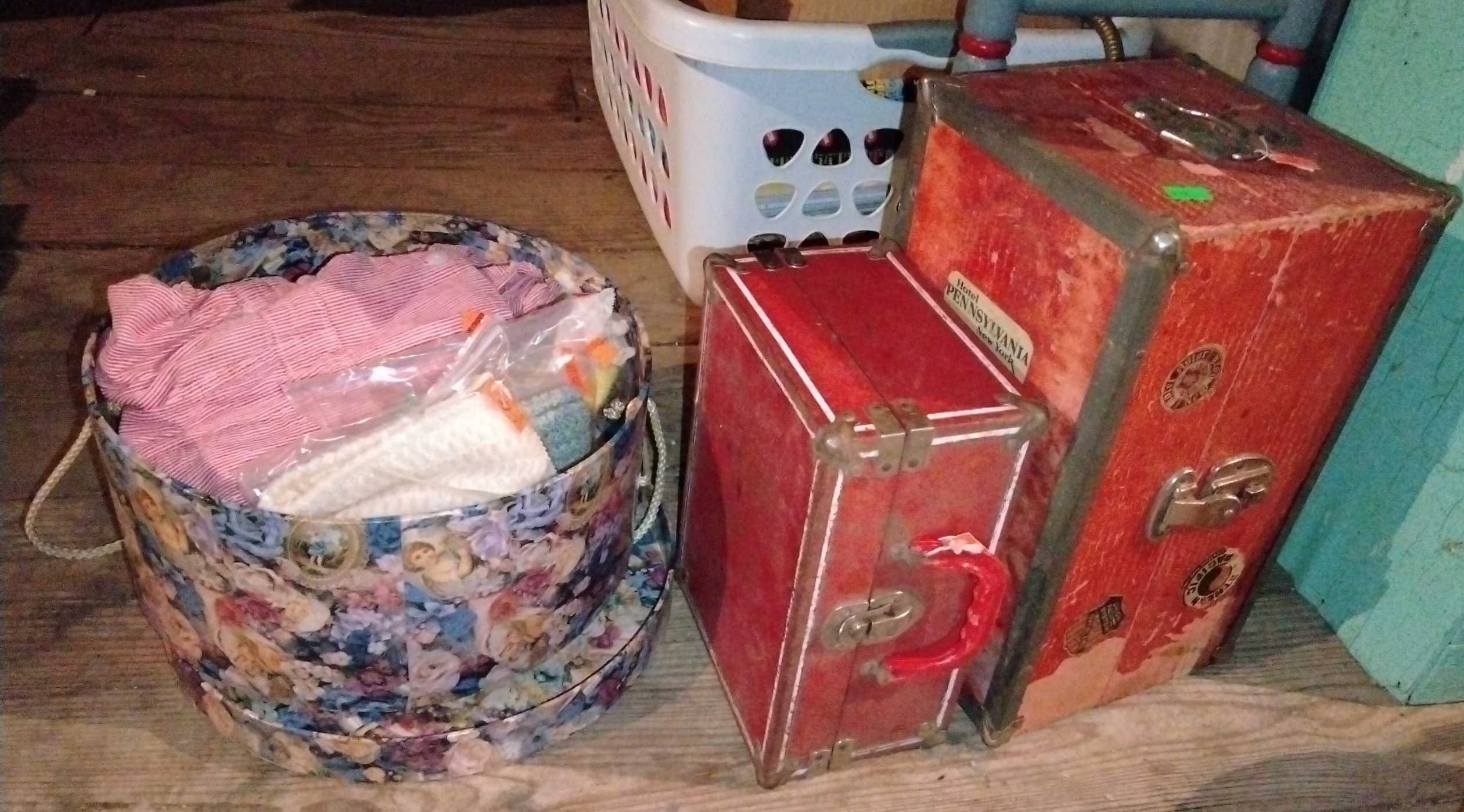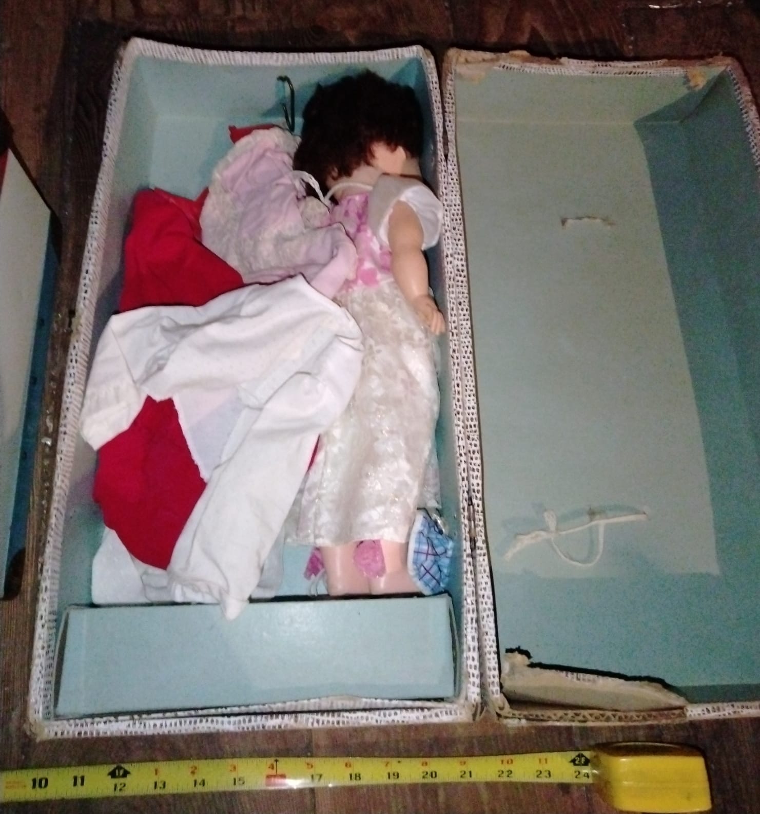 218 Wood doll case, hat box with baby clothes and case with doll clothes