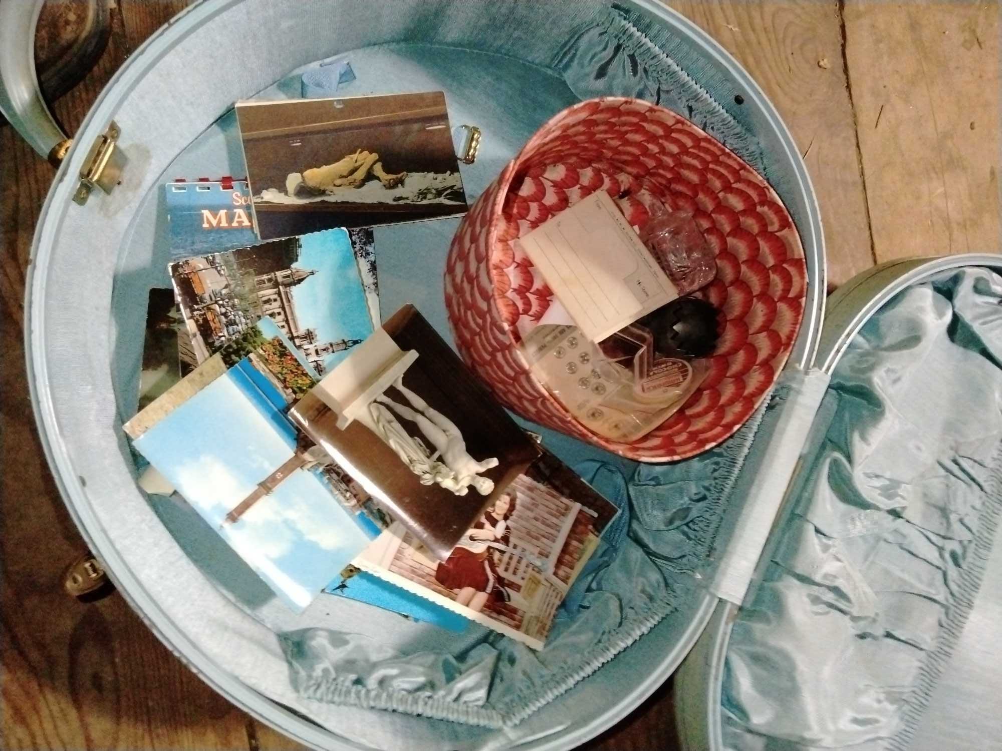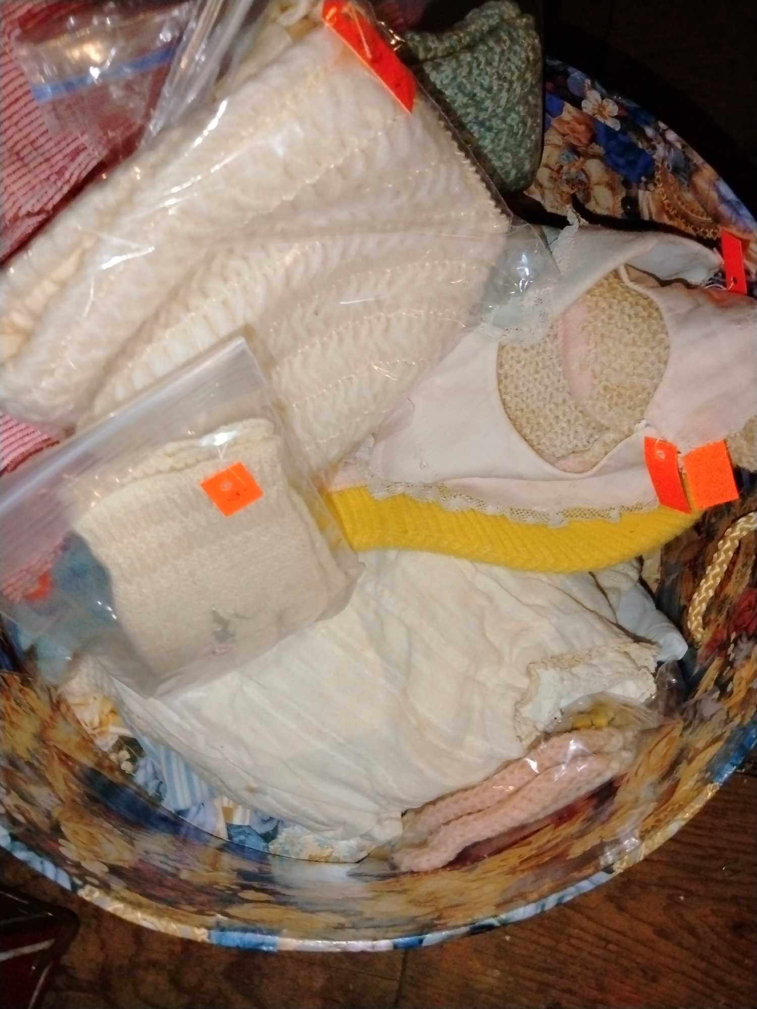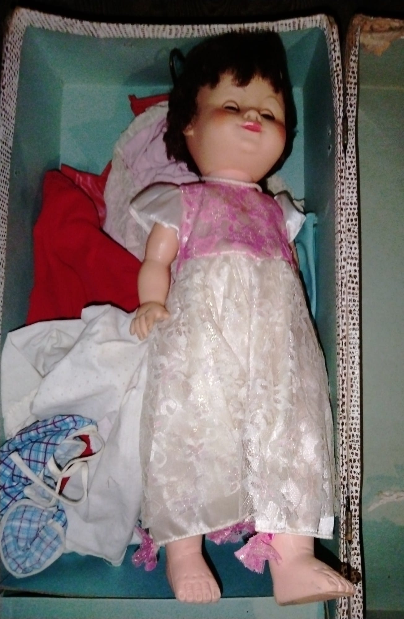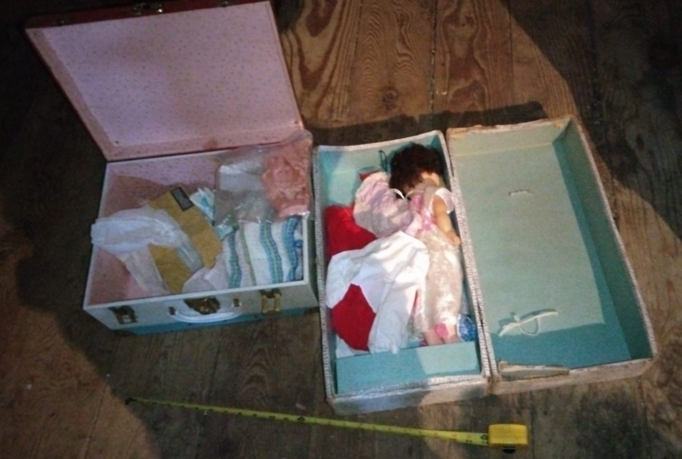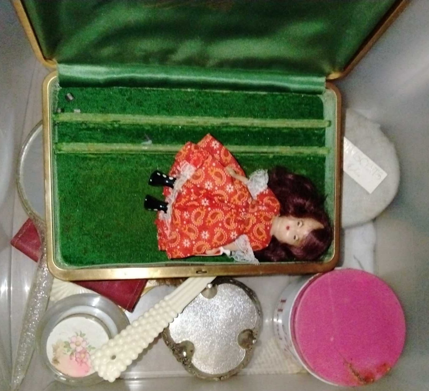 218 Wood doll case, hat box with baby clothes and case with doll clothes