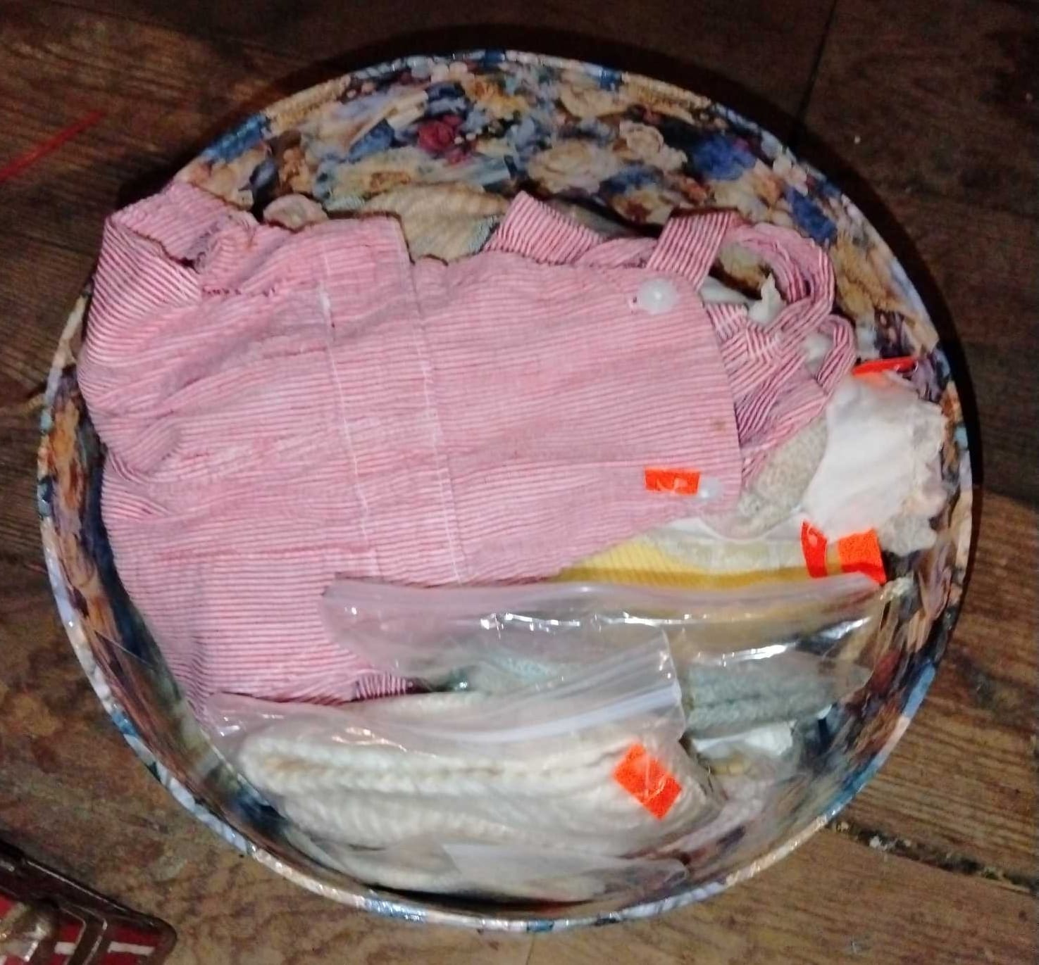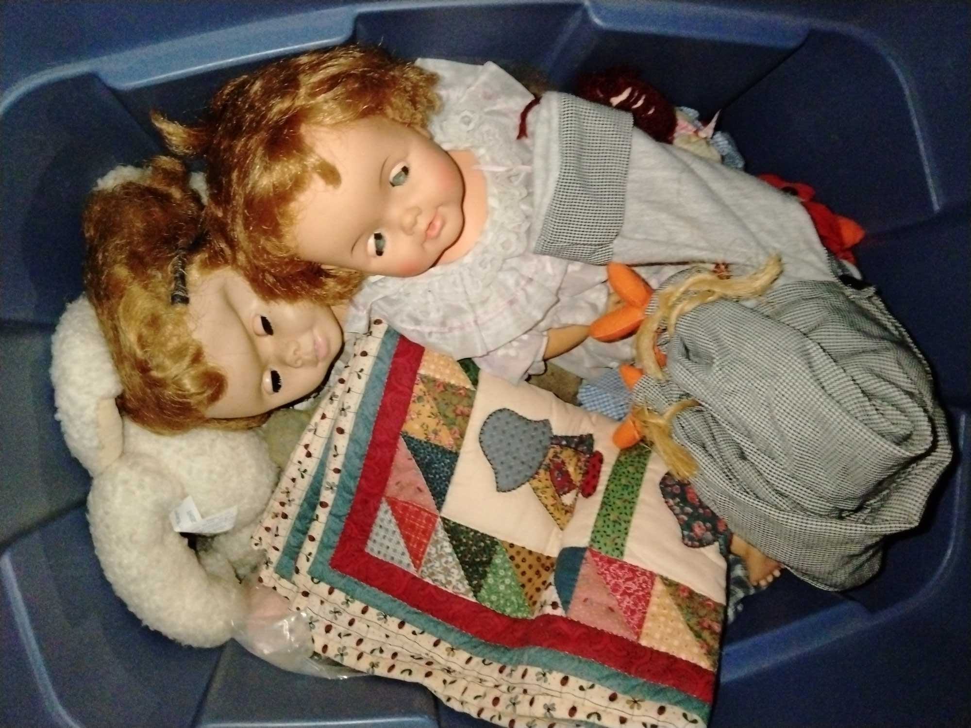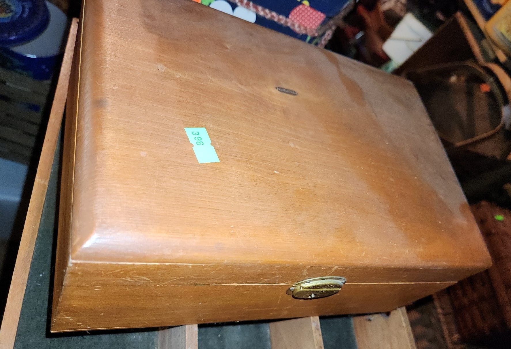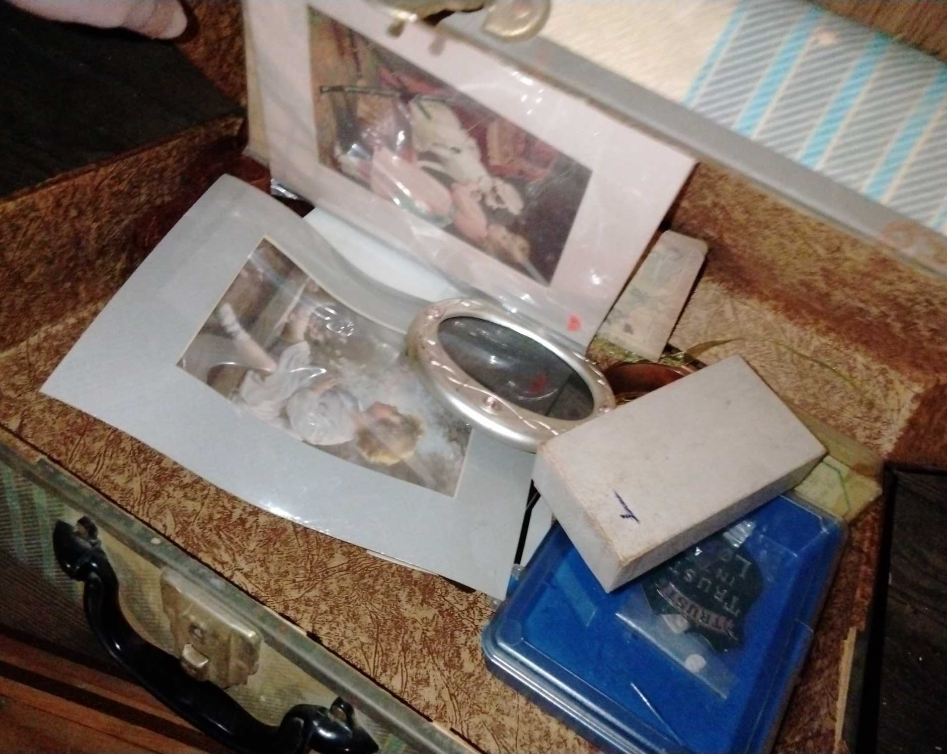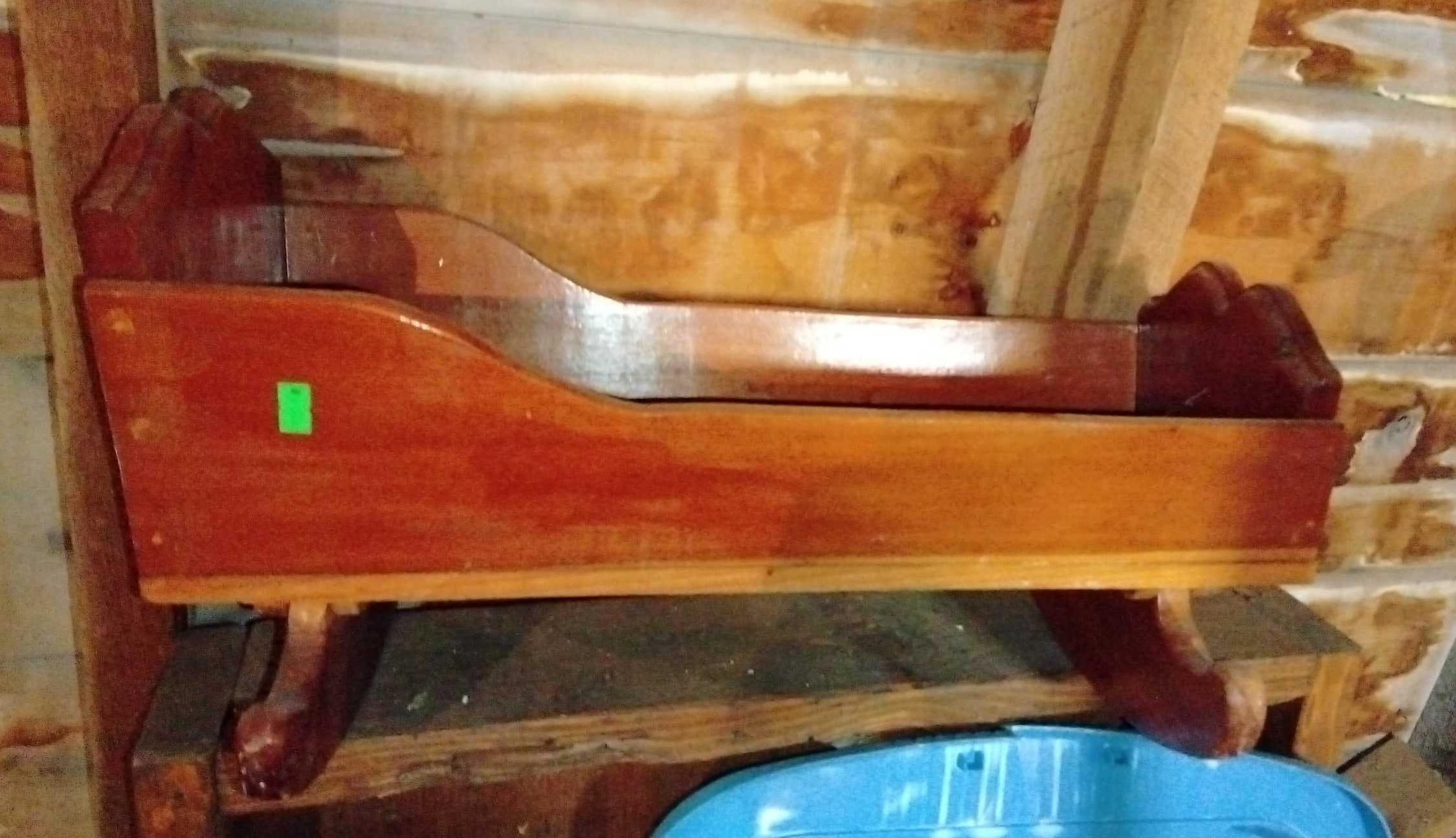 218 Wood doll case, hat box with baby clothes and case with doll clothes