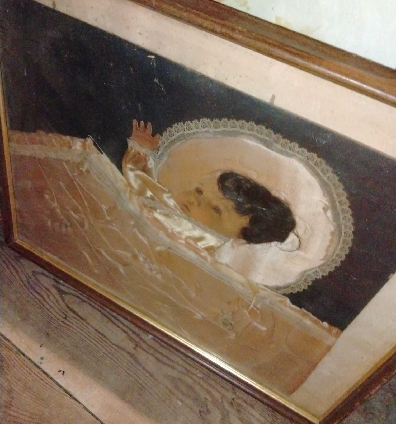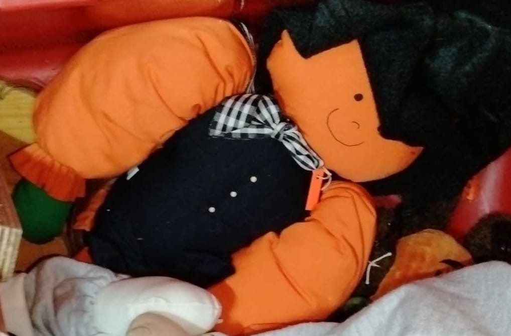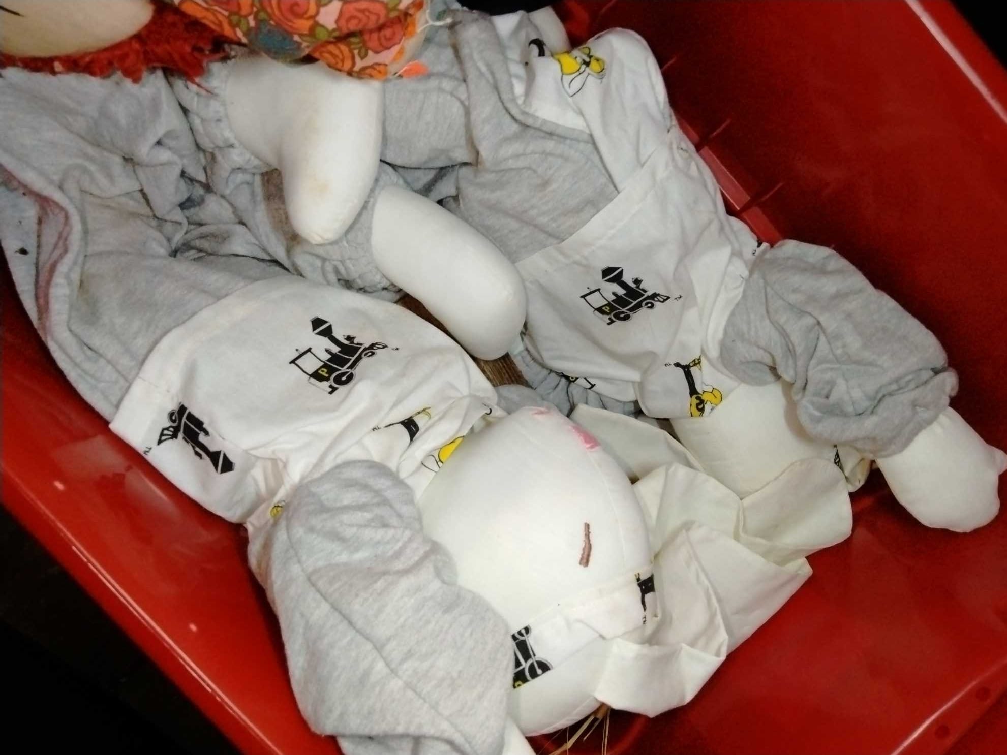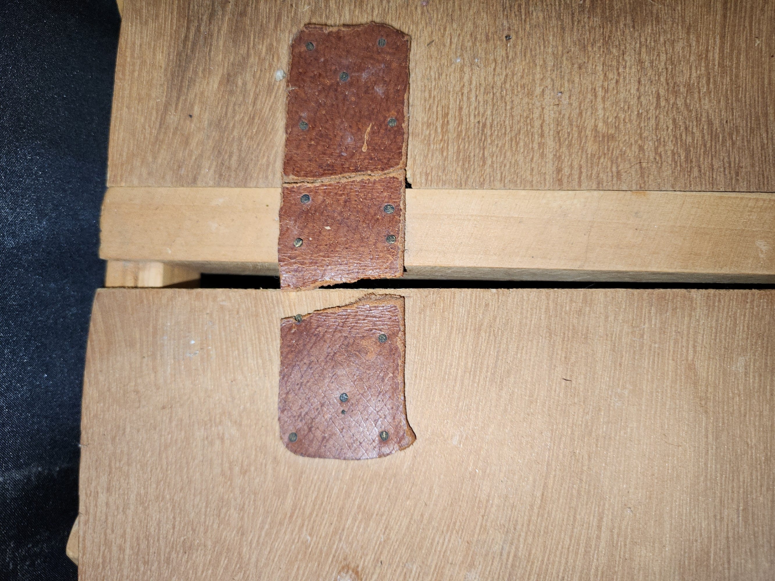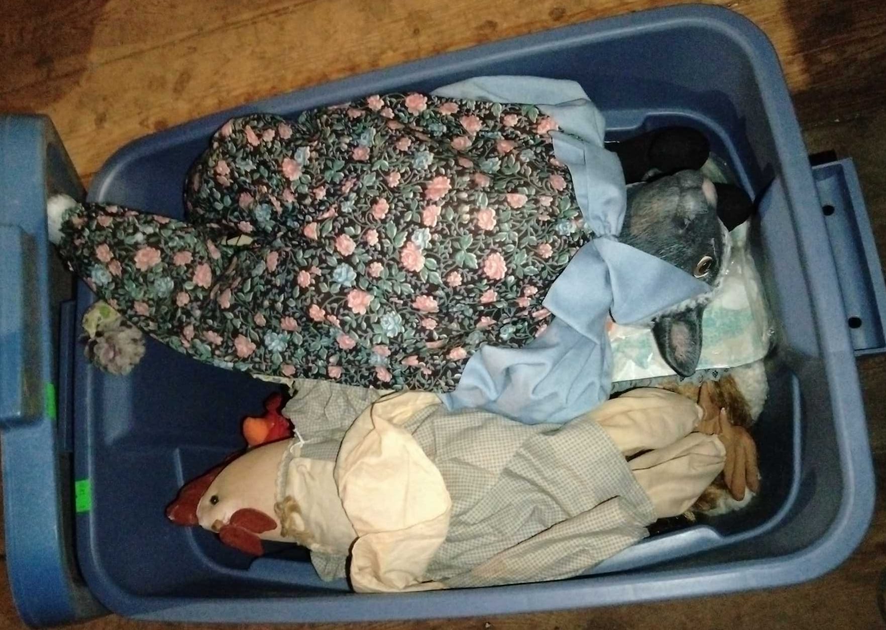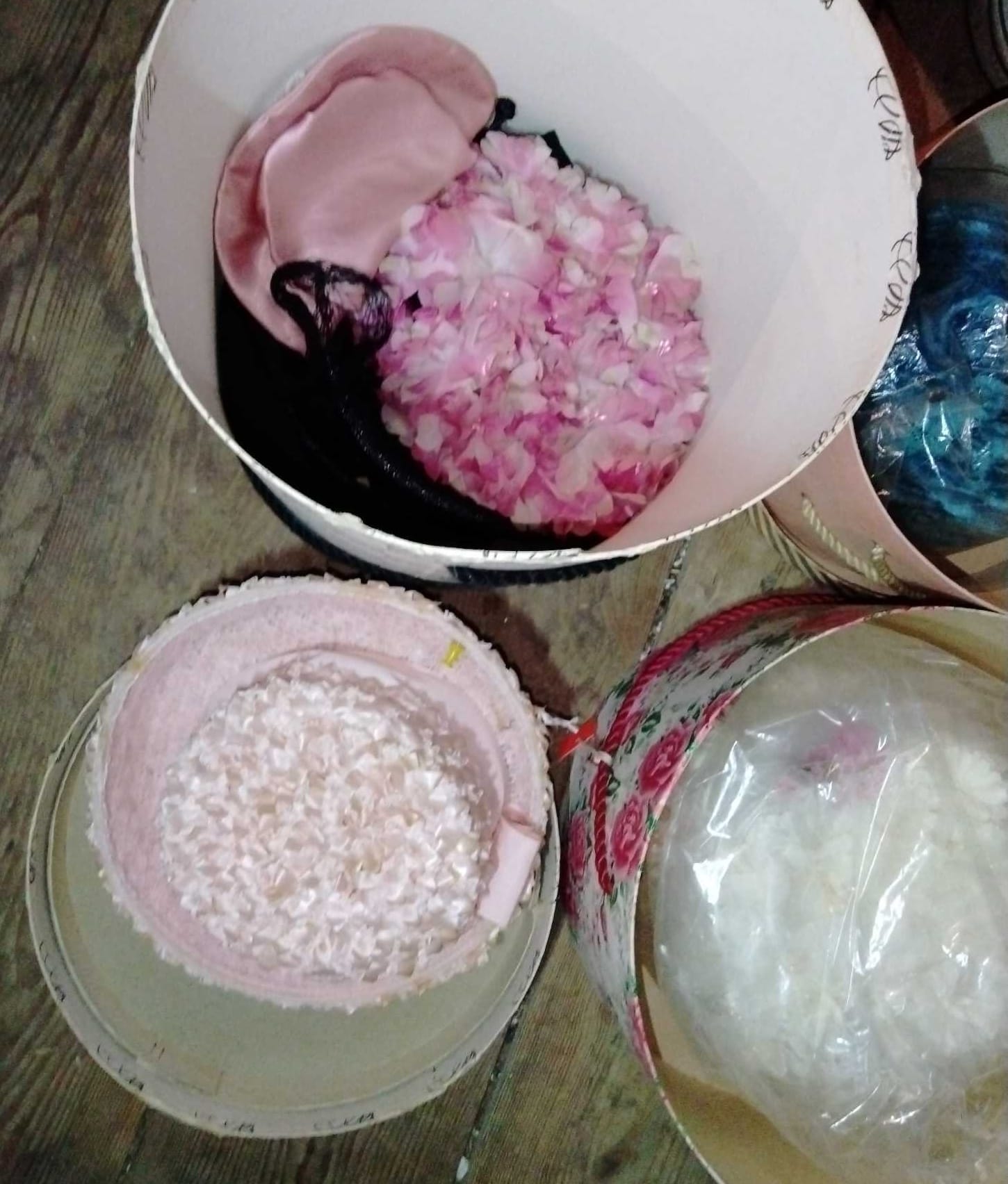 218 Wood doll case, hat box with baby clothes and case with doll clothes