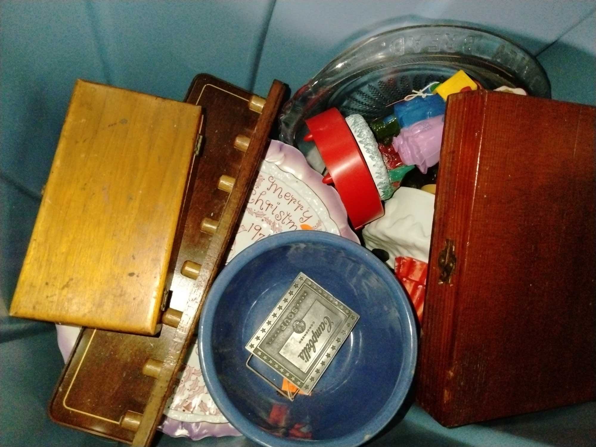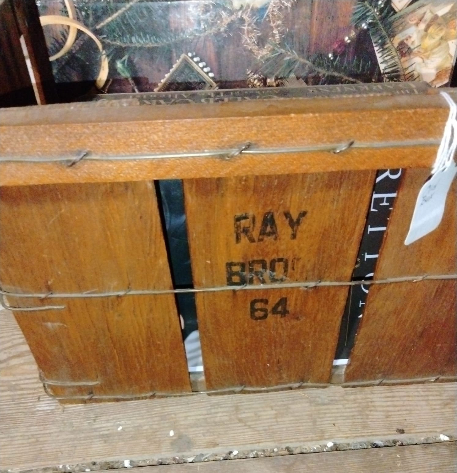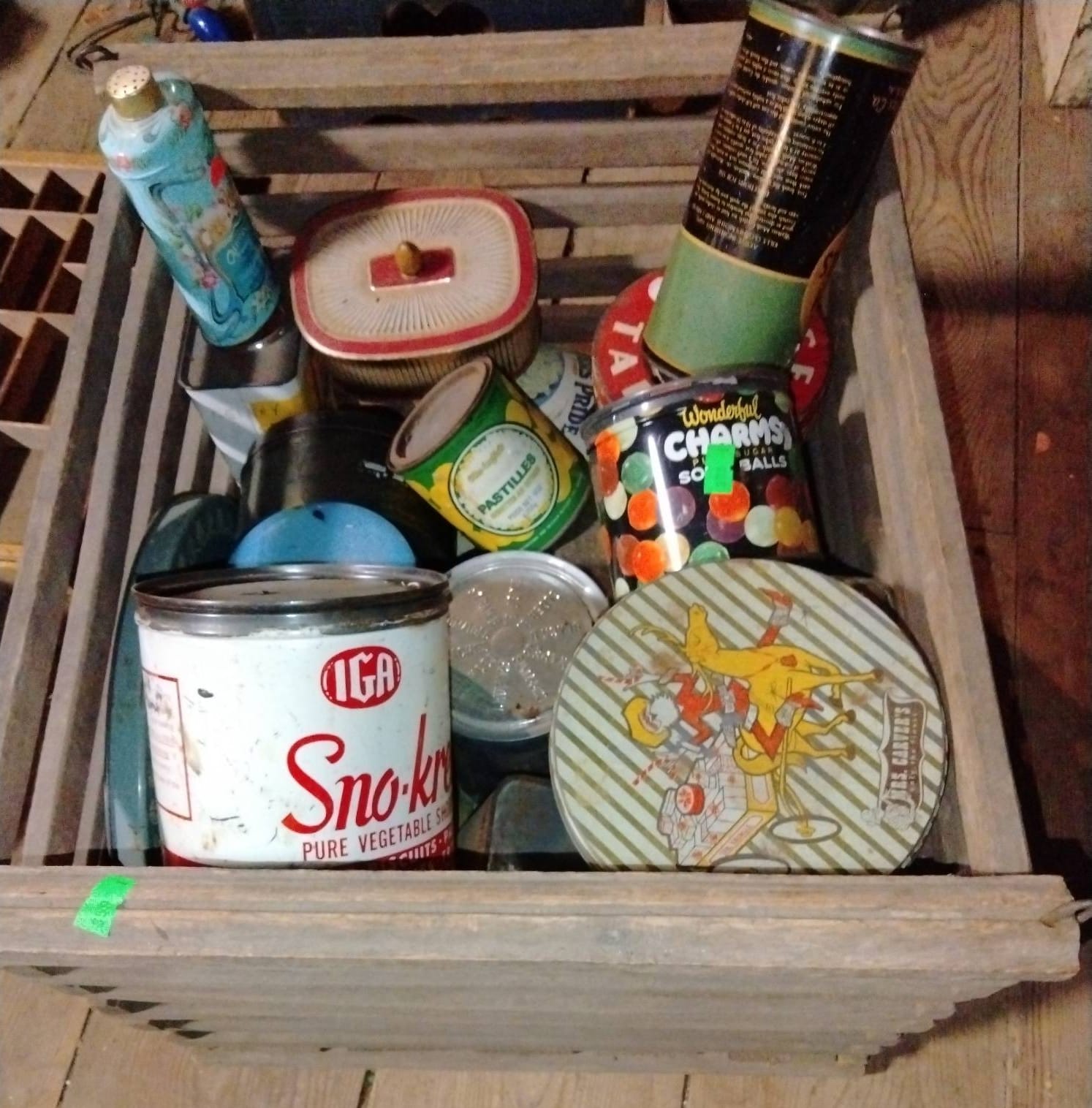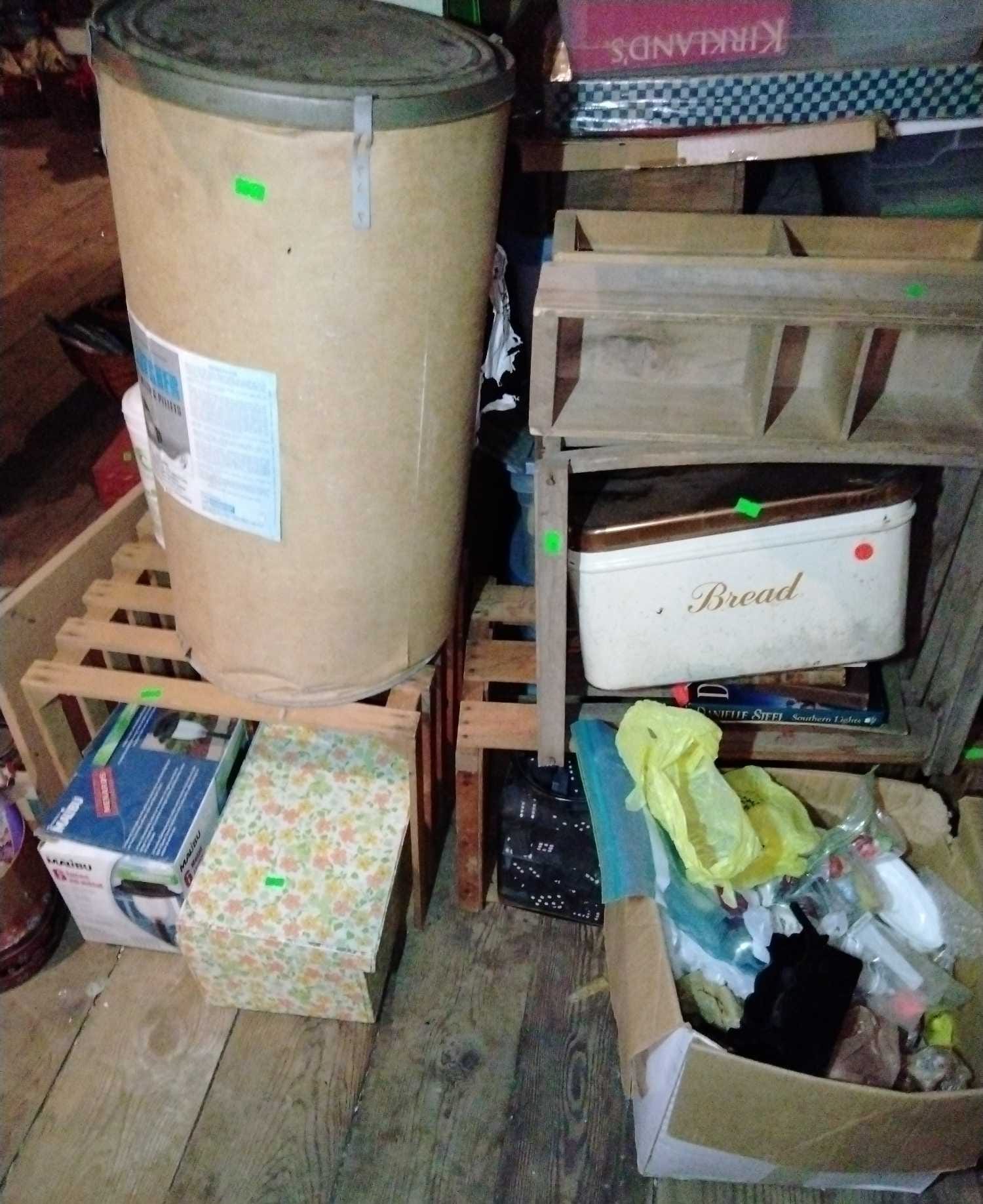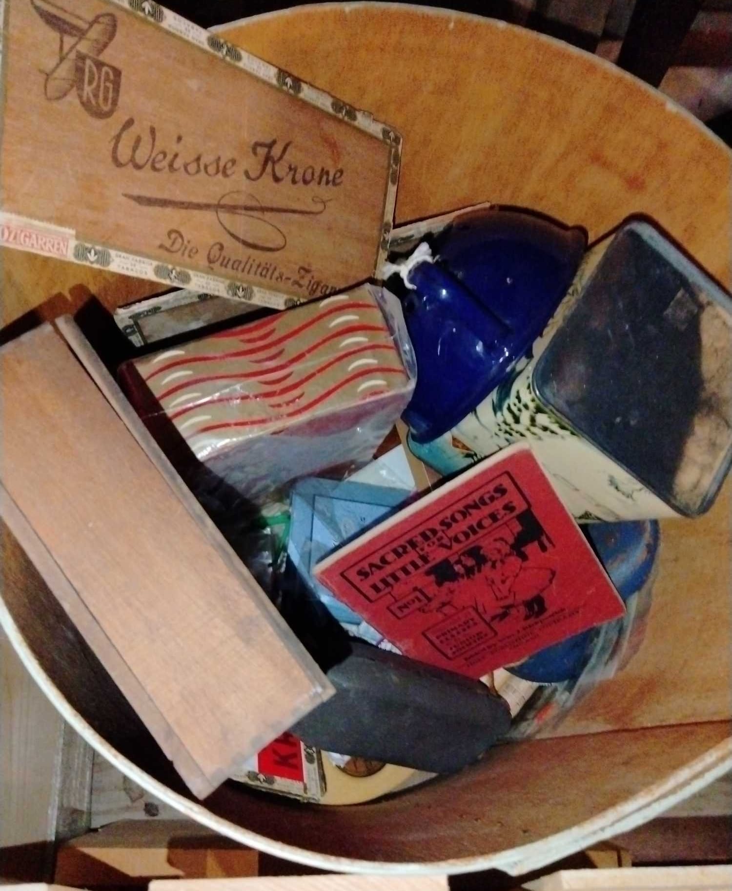 204 Wood crates, metal bread box, dominoes, books, cardboard barrel, metal lights